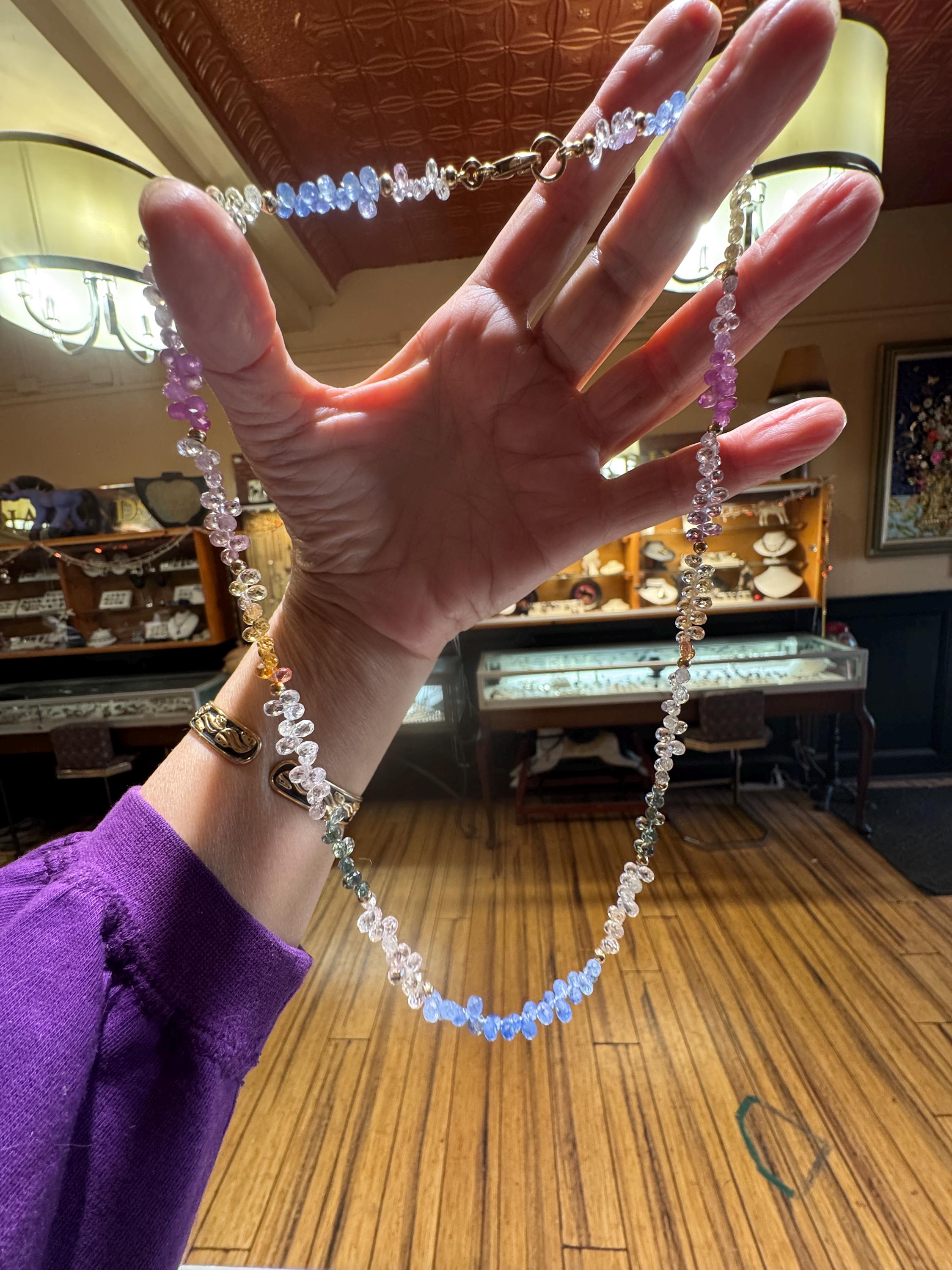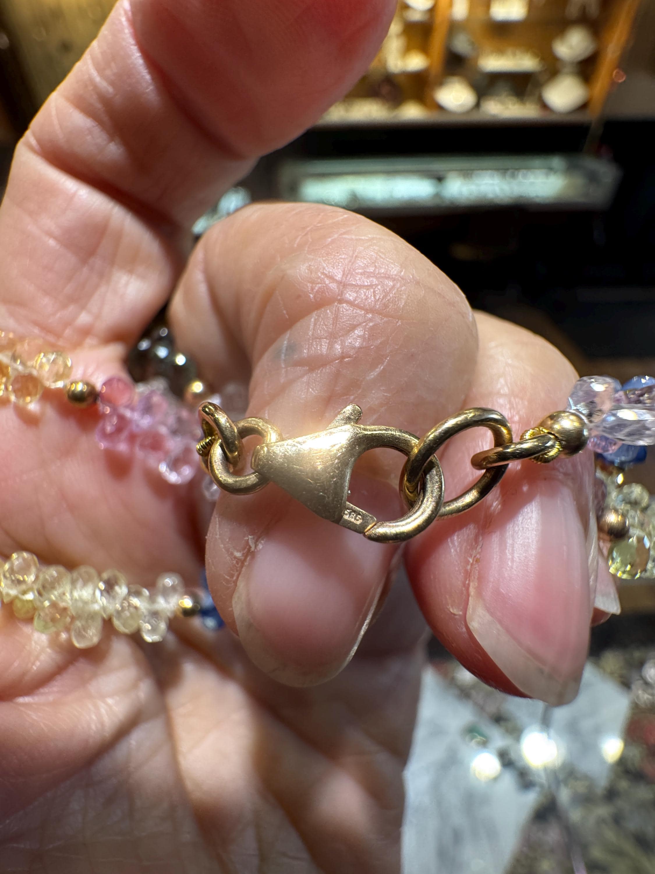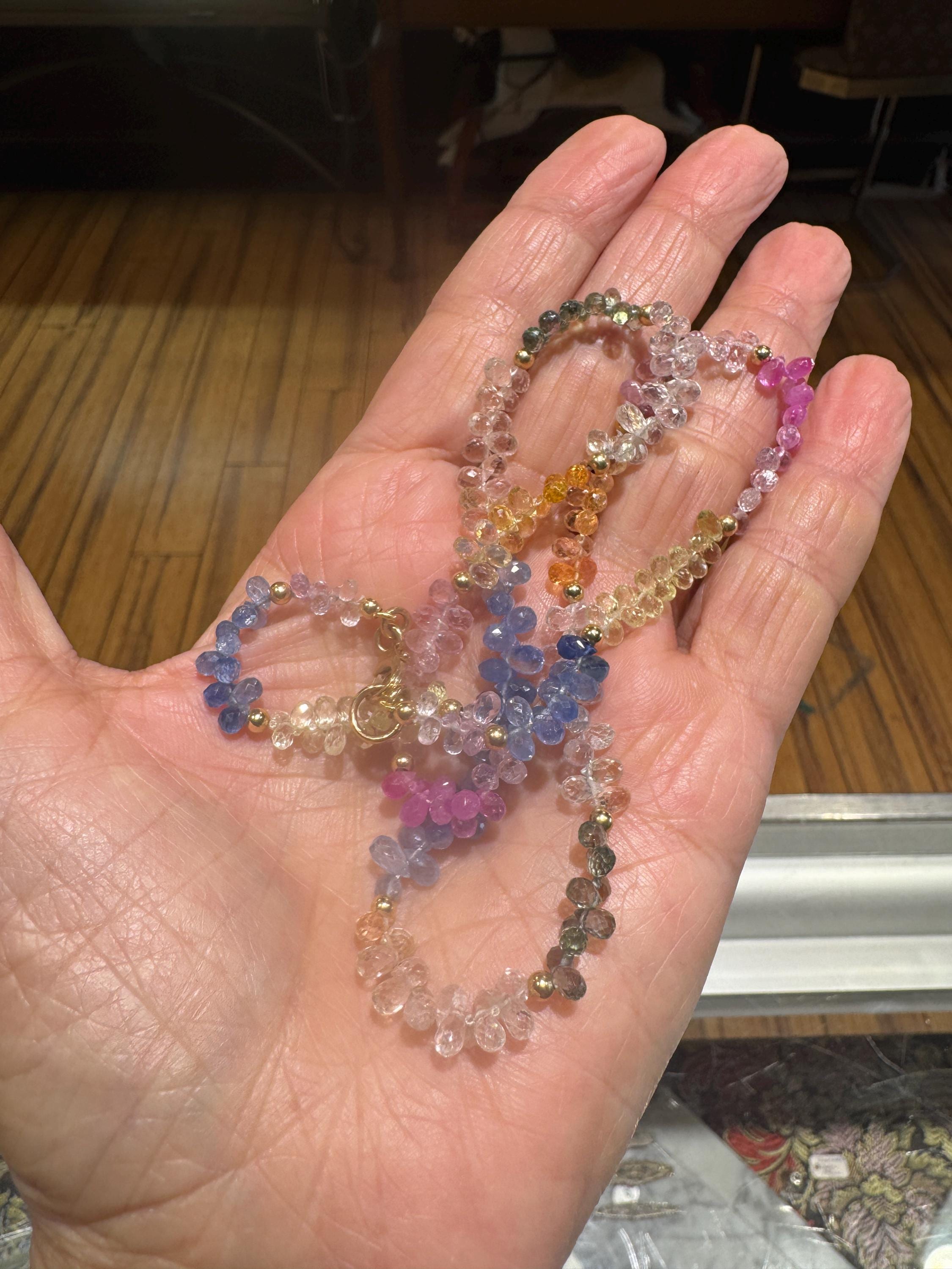 19 inches of wearable rainbow!! This multicolored sapphire necklace boasts 93.5 carats of micro faceted briolette beads! Catch this rainbow and that pot of gold may not be far away! 14K yellow gold beads accentuate each color group and a 14K yellow gold lobster clasp will hold it secure. This is a new necklace, handcrafted by us!