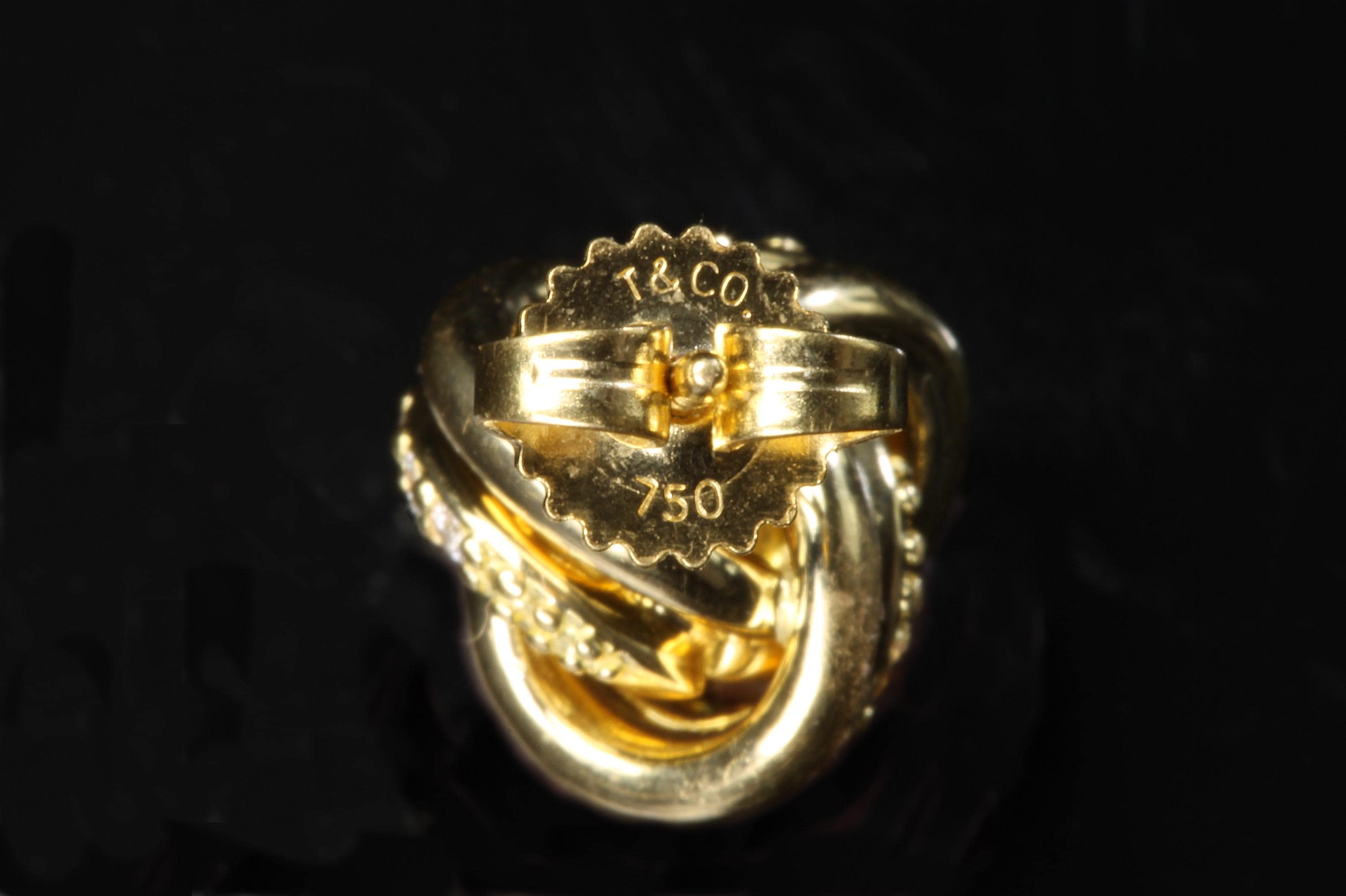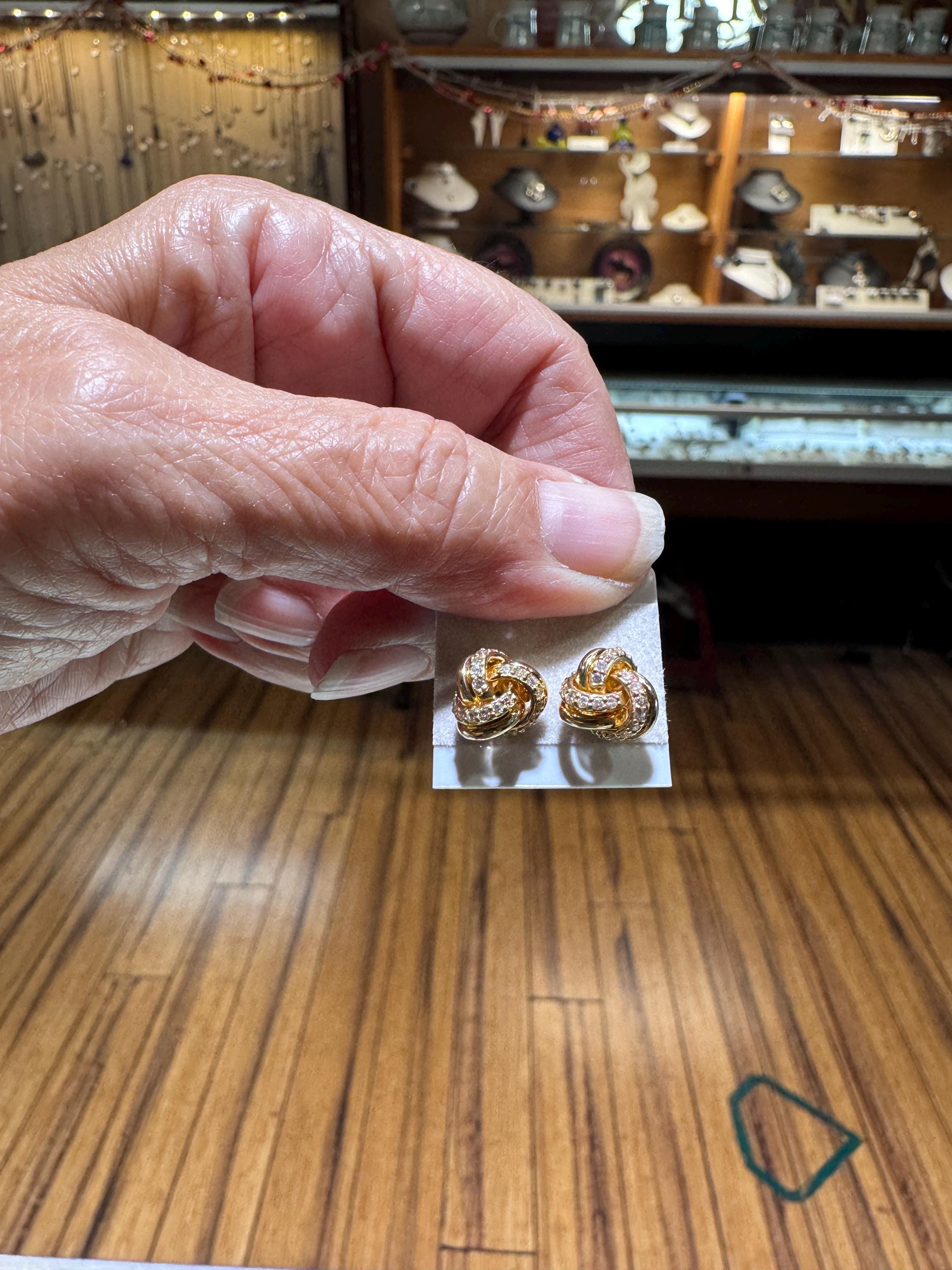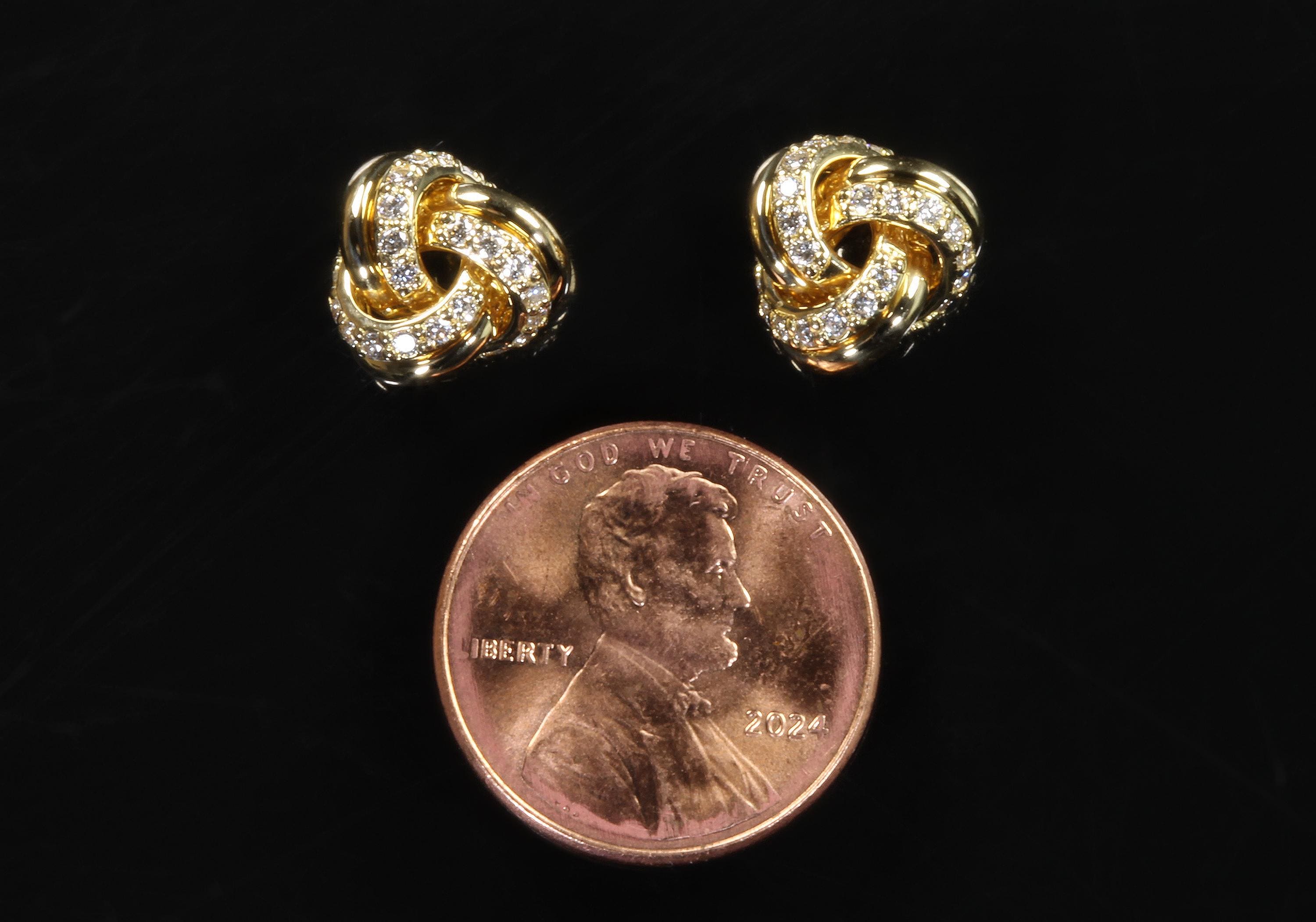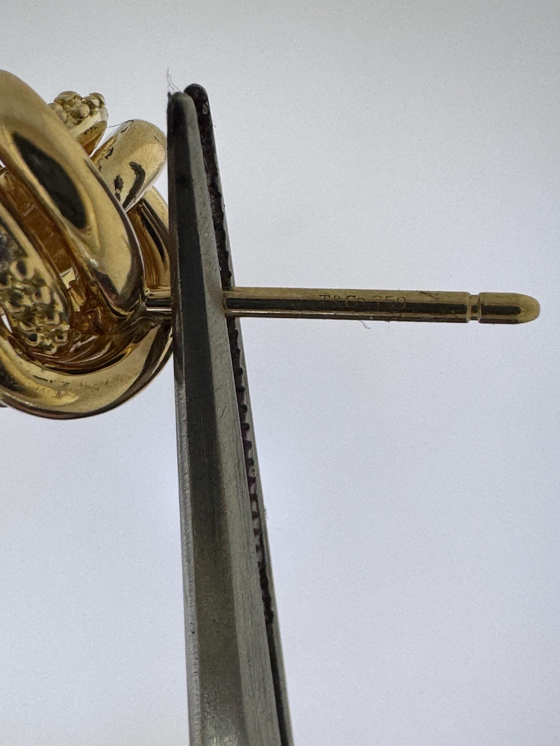 Fabulous pair of vintage Tiffany & Co 18K yellow gold and diamond love knot stud earrings. Approximately .12 ctw of sparkling diamonds make these studs shine from across the room! These are vintage and preowned earrings sold as is in great ready to wear condition. The T&C 750 hallmarks can be seen on the post and push backs. These earrings measure 10mm and weigh 4.4 dwt or 6.8 grams.