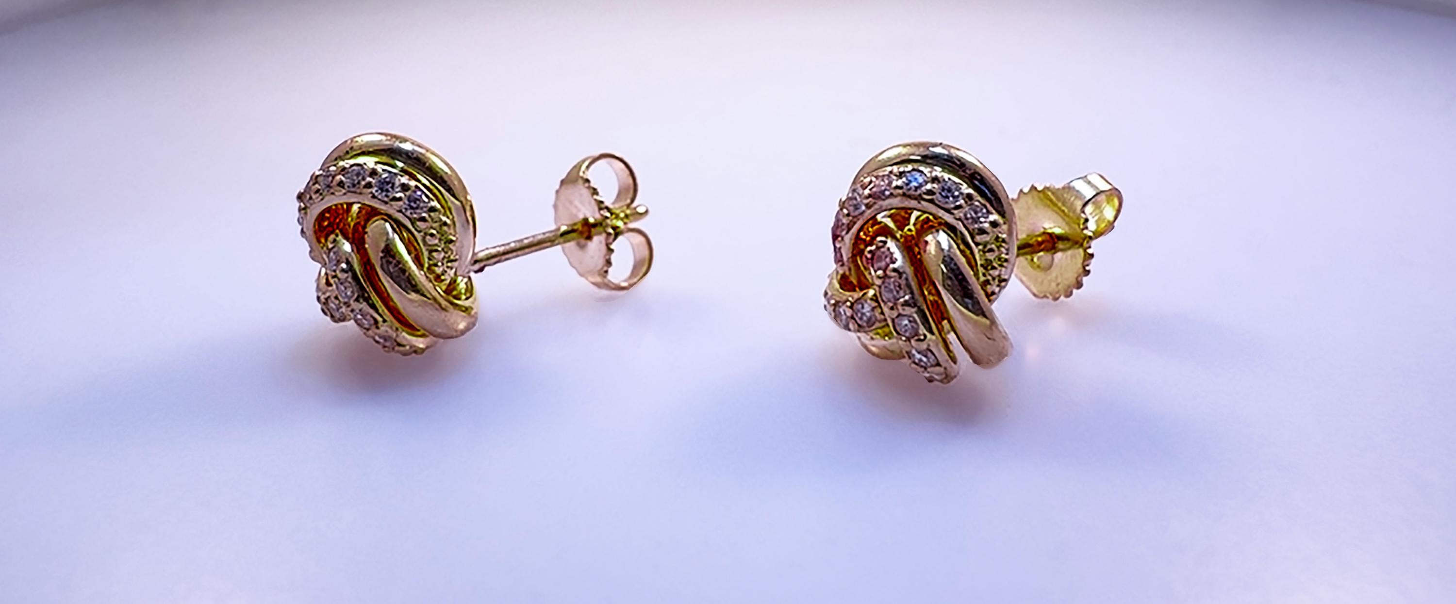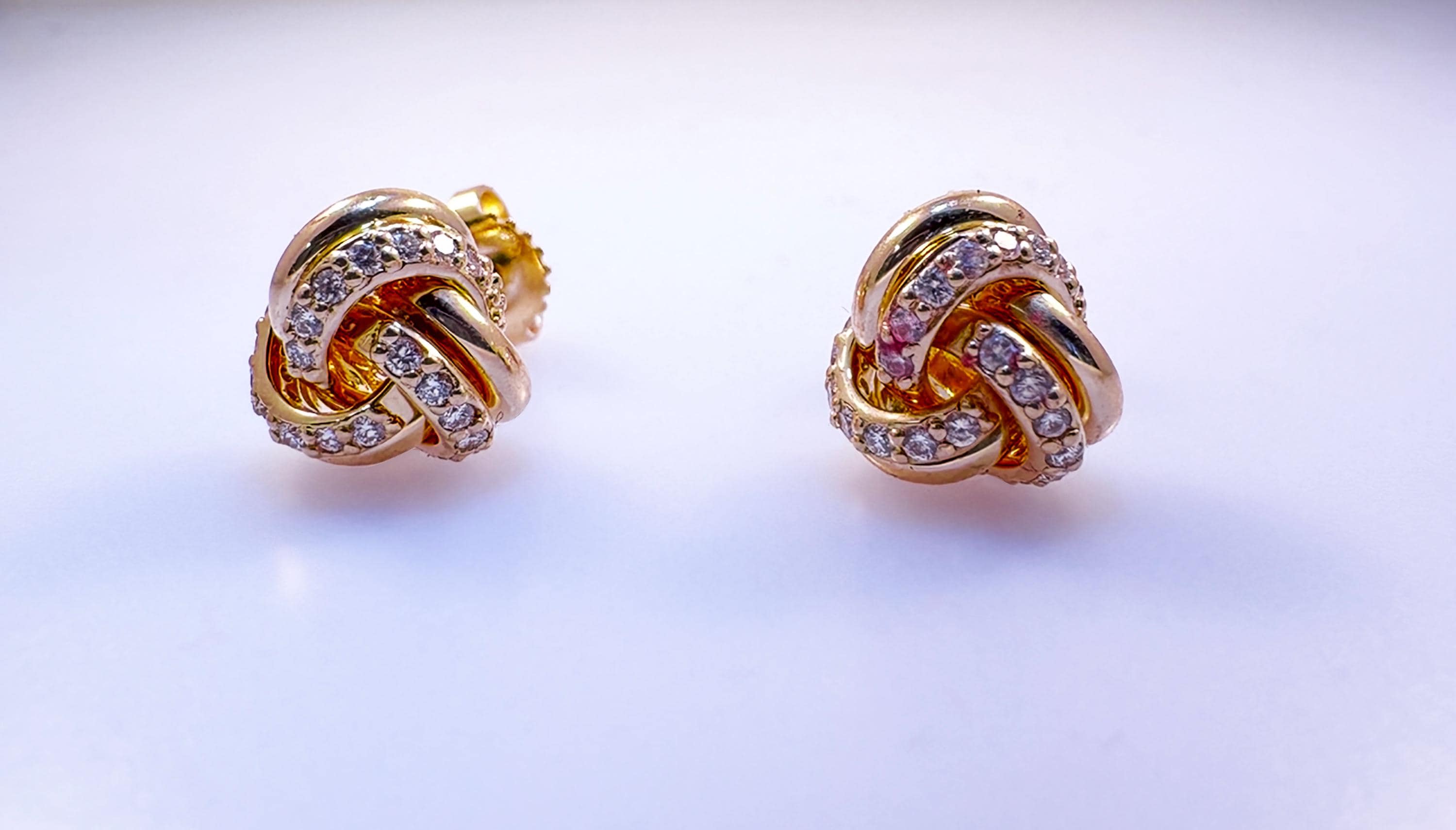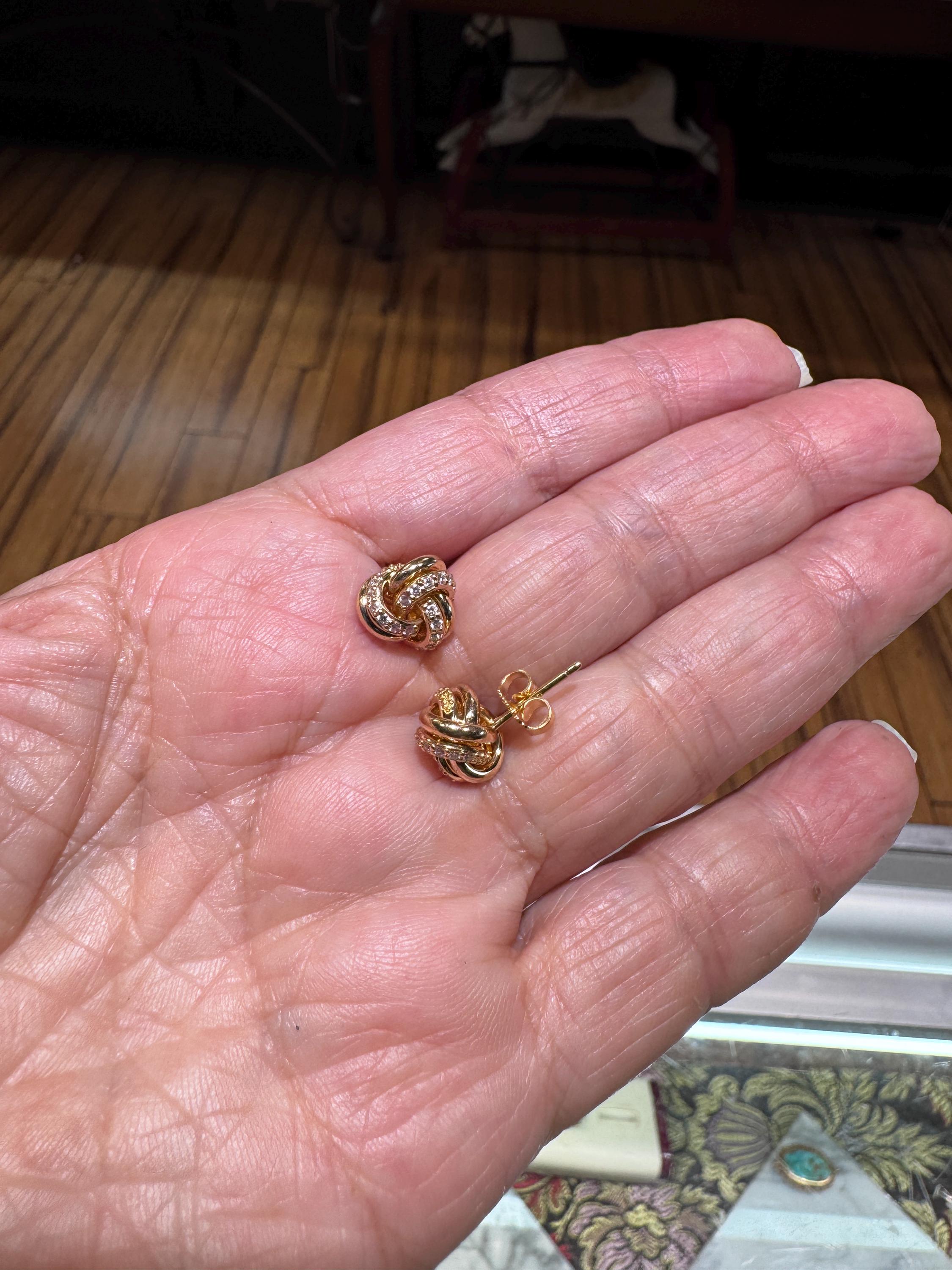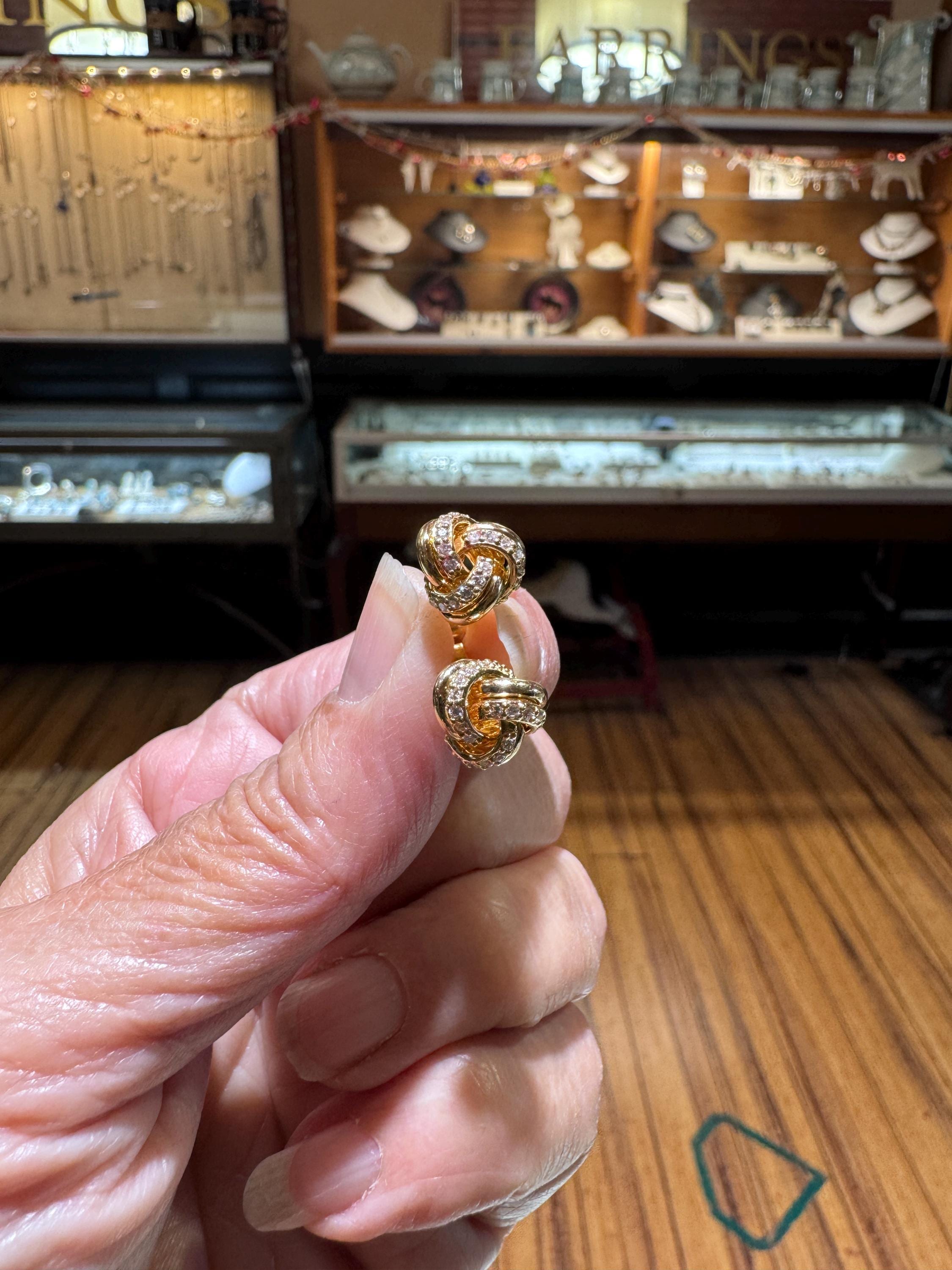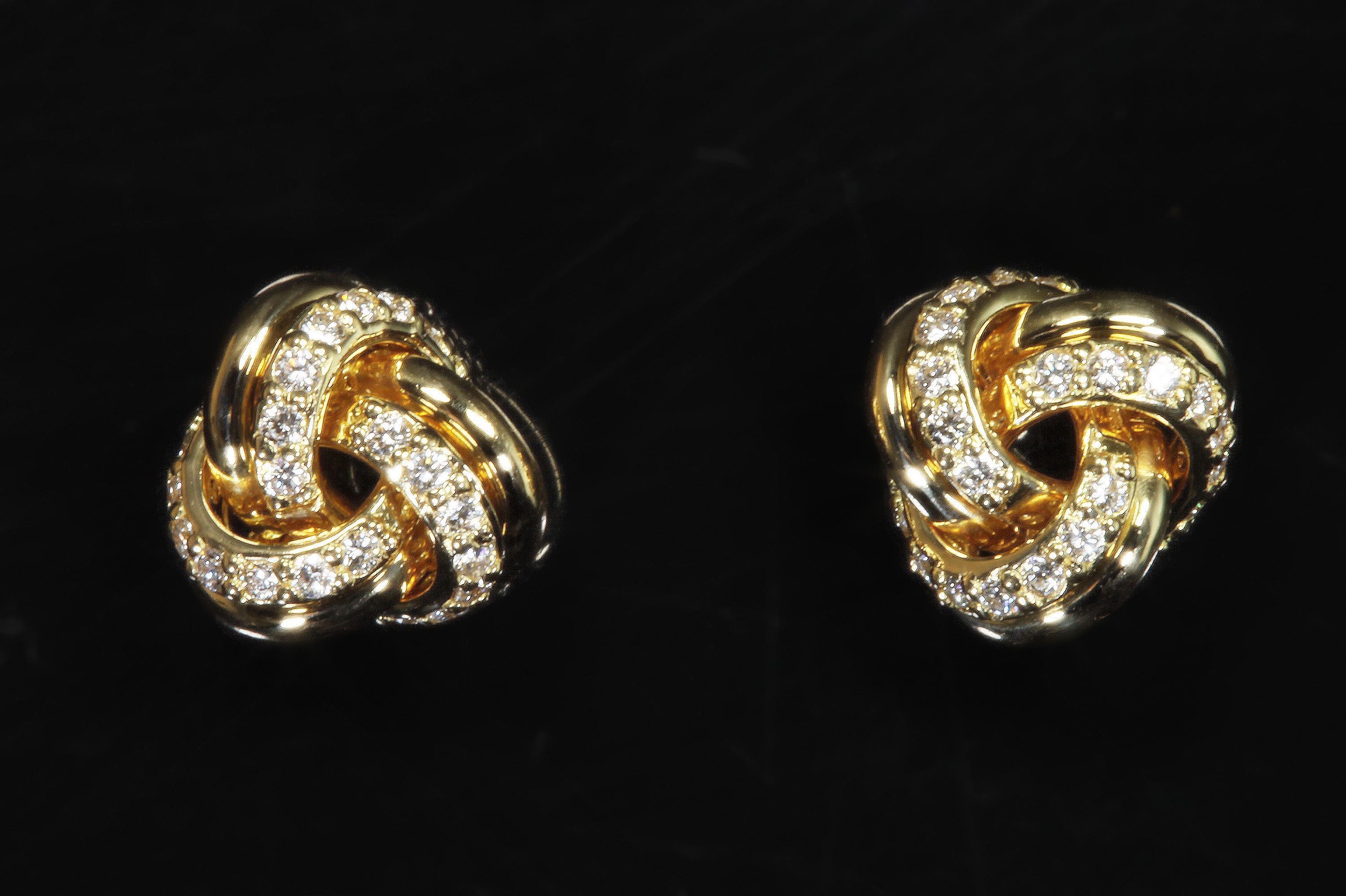 Fabulous pair of vintage Tiffany & Co 18K yellow gold and diamond love knot stud earrings. Approximately .12 ctw of sparkling diamonds make these studs shine from across the room! These are vintage and preowned earrings sold as is in great ready to wear condition. The T&C 750 hallmarks can be seen on the post and push backs. These earrings measure 10mm and weigh 4.4 dwt or 6.8 grams.