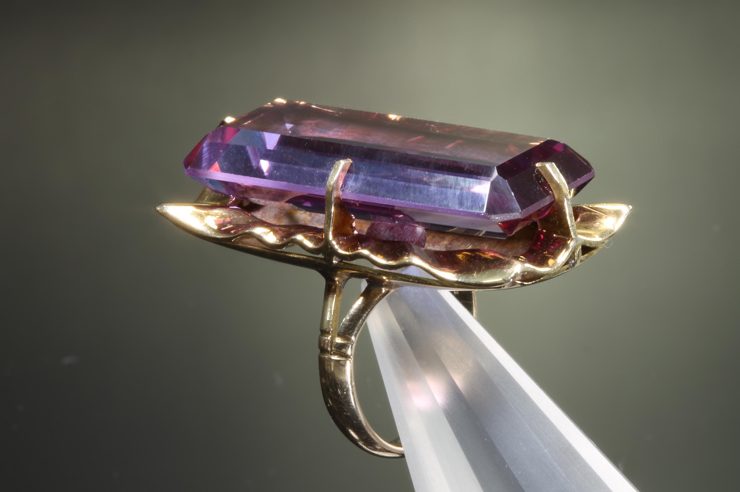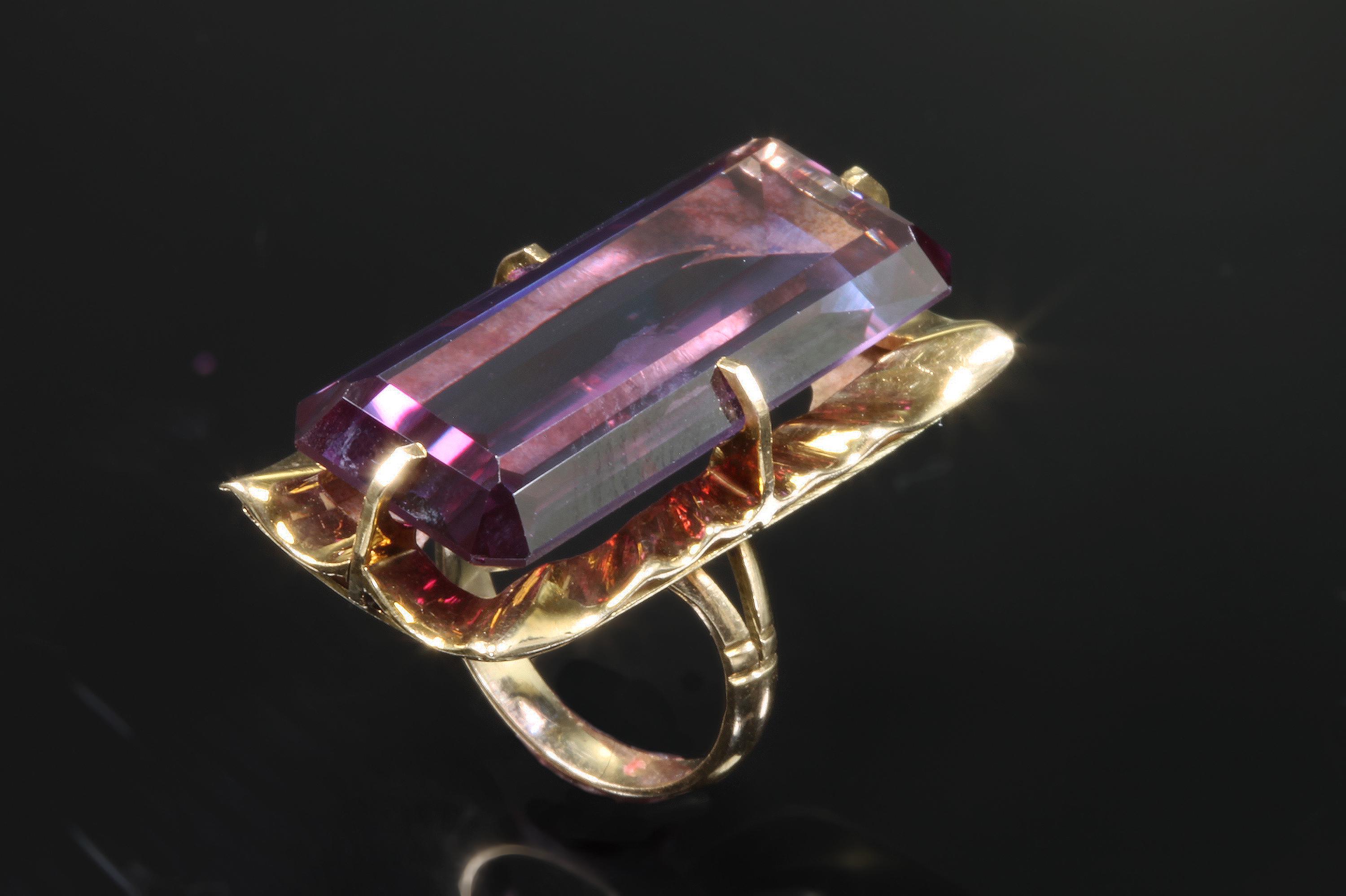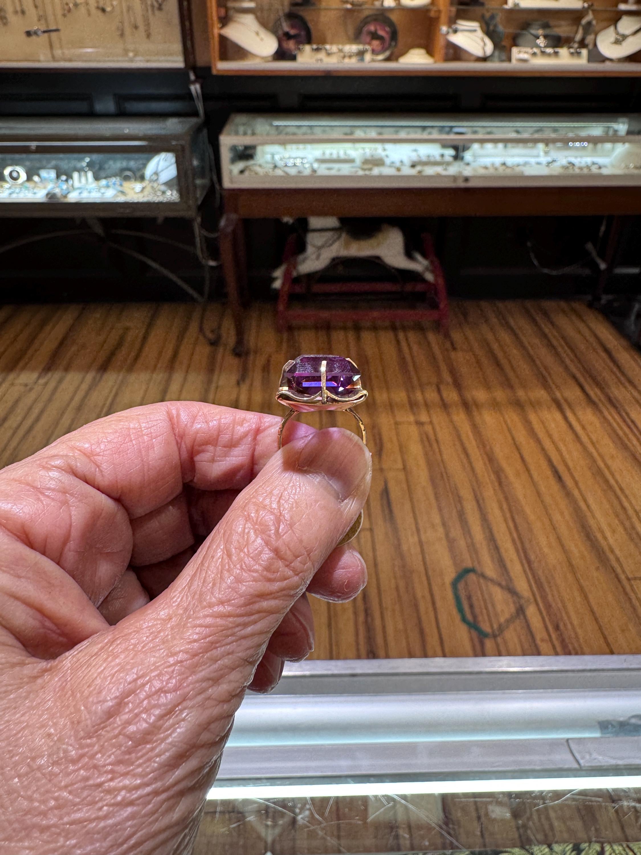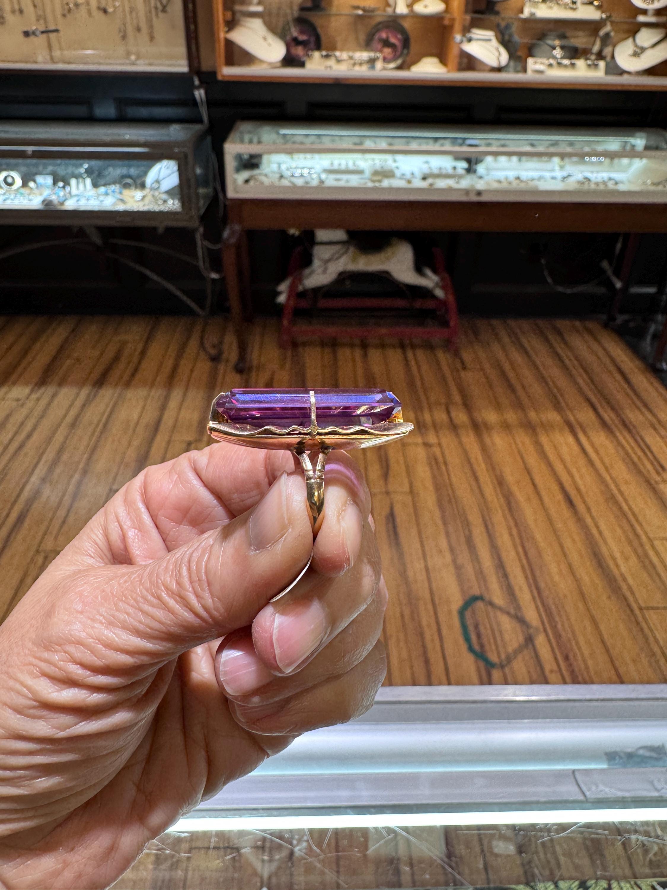 Ready for bold?!? This 32mm x 13mm synthetic purple sapphire is ready to make any porphyrophile gasp!! That’s a purple lover! This 14K yellow gold ring sure gives off some swanky vibes! Currently a size 5.25 we will size this ring up to a size 7 free of charge. If you need this ring to be larger than a size 7 please contact us before ordering. This is a vintage and pre owned ring, sold as is in great ready to turn heads condition!