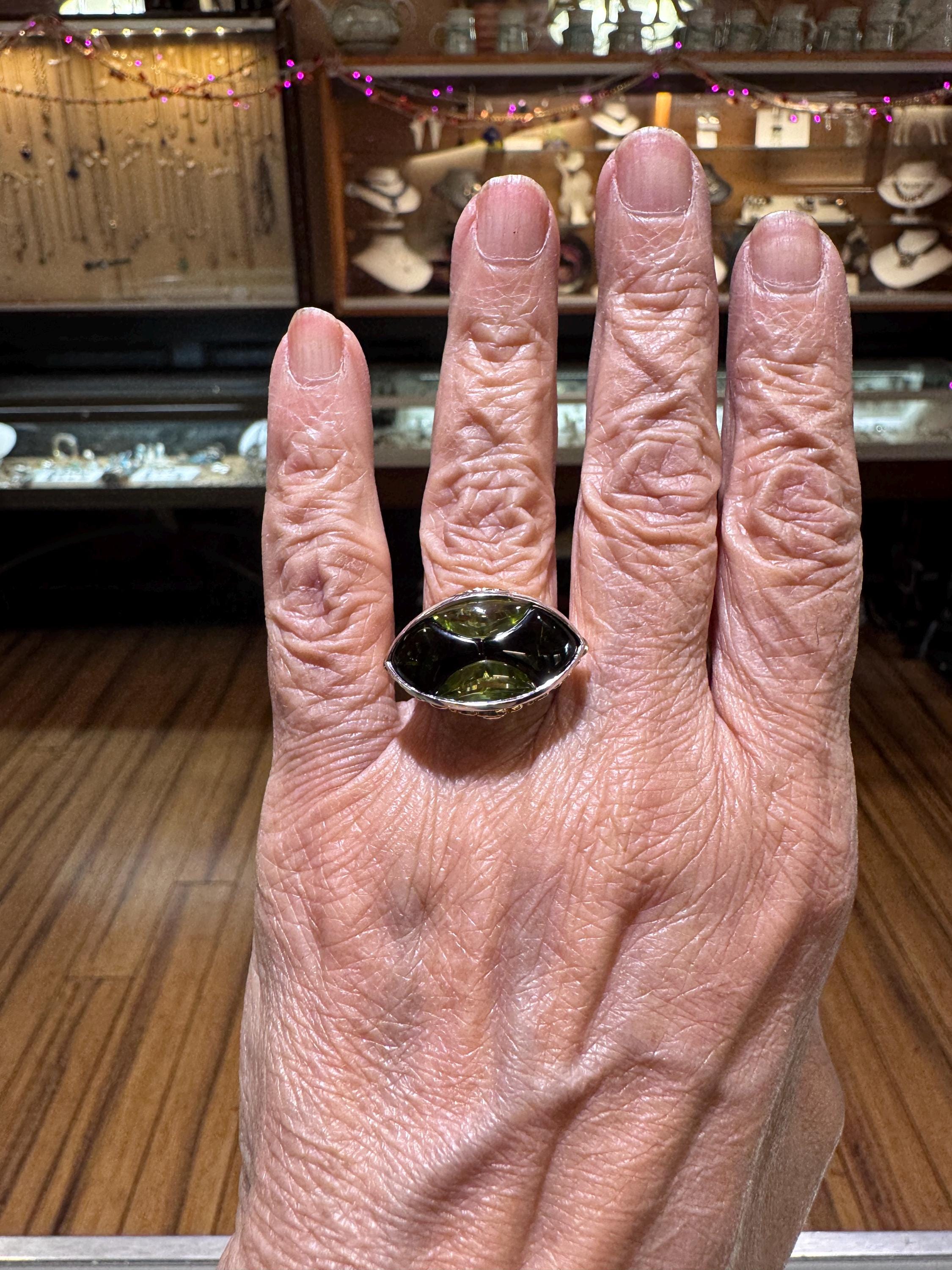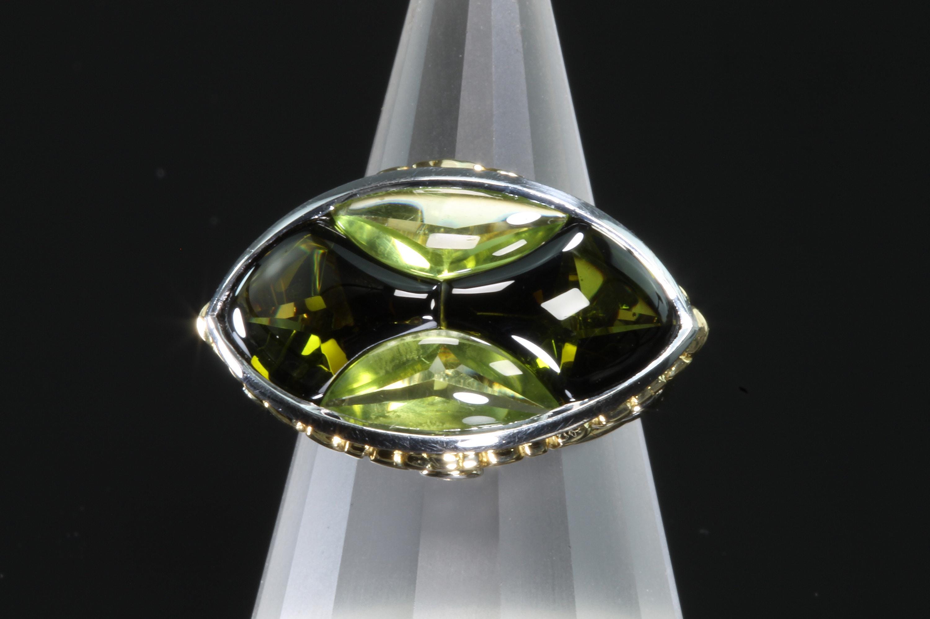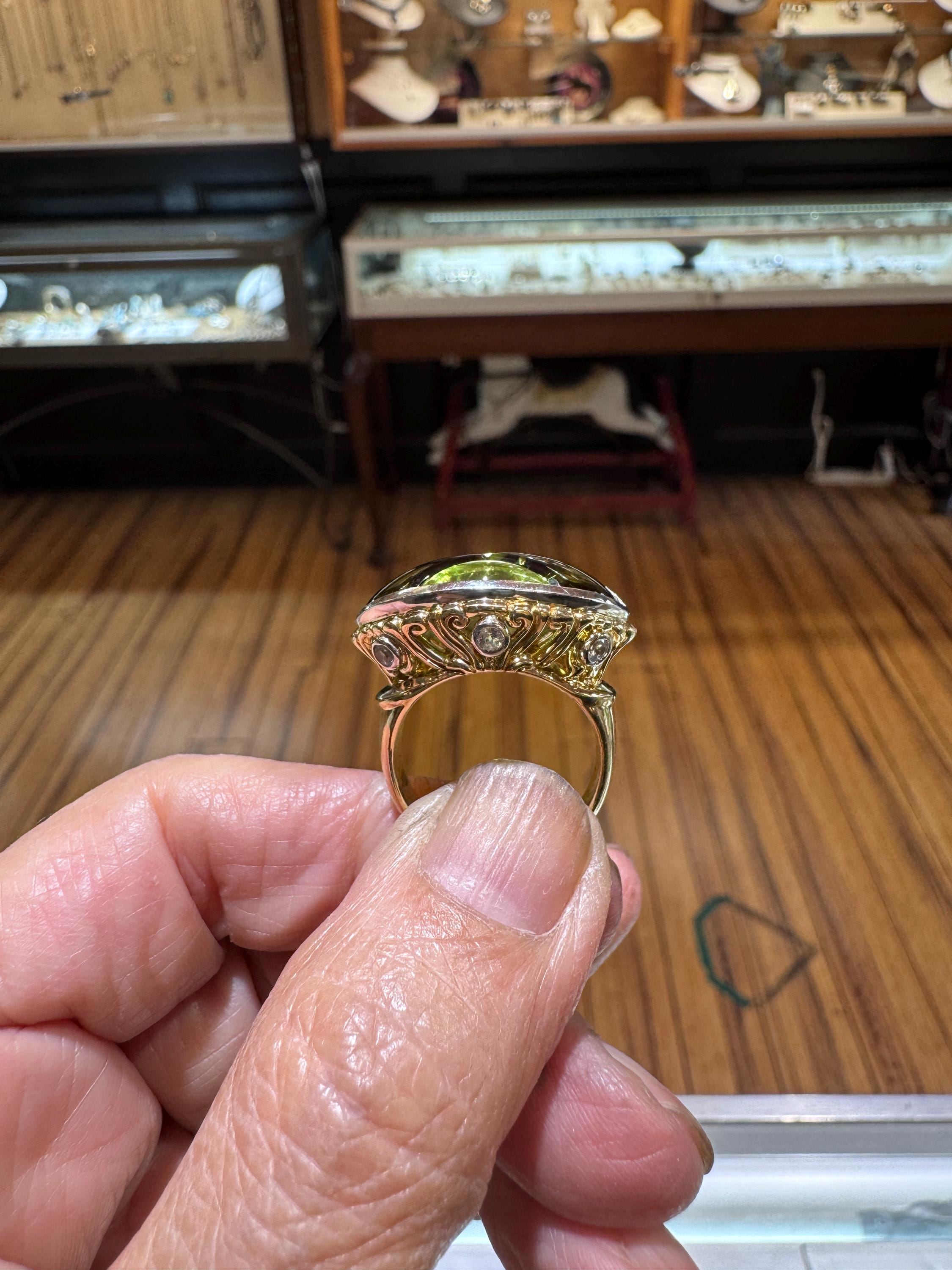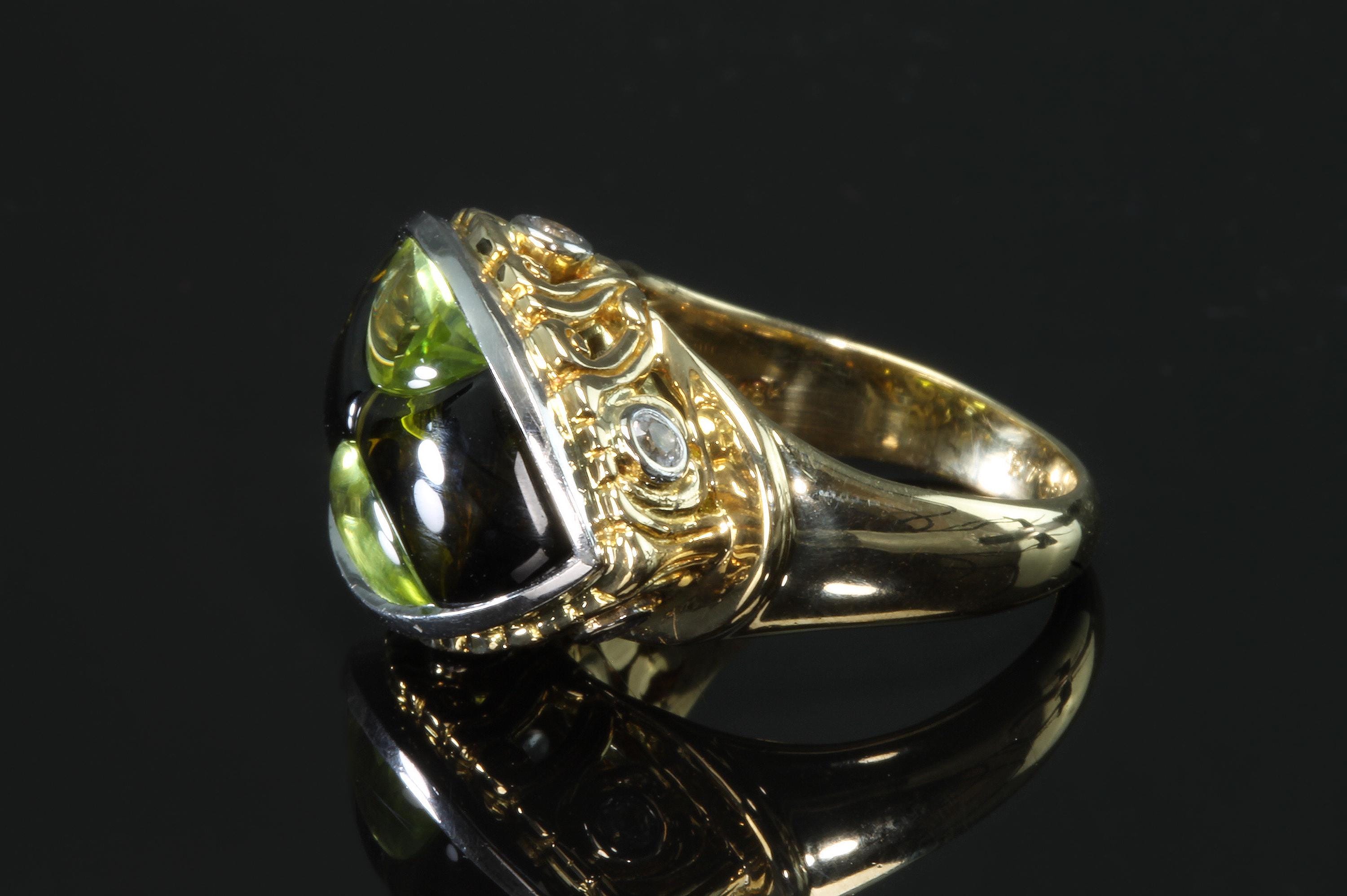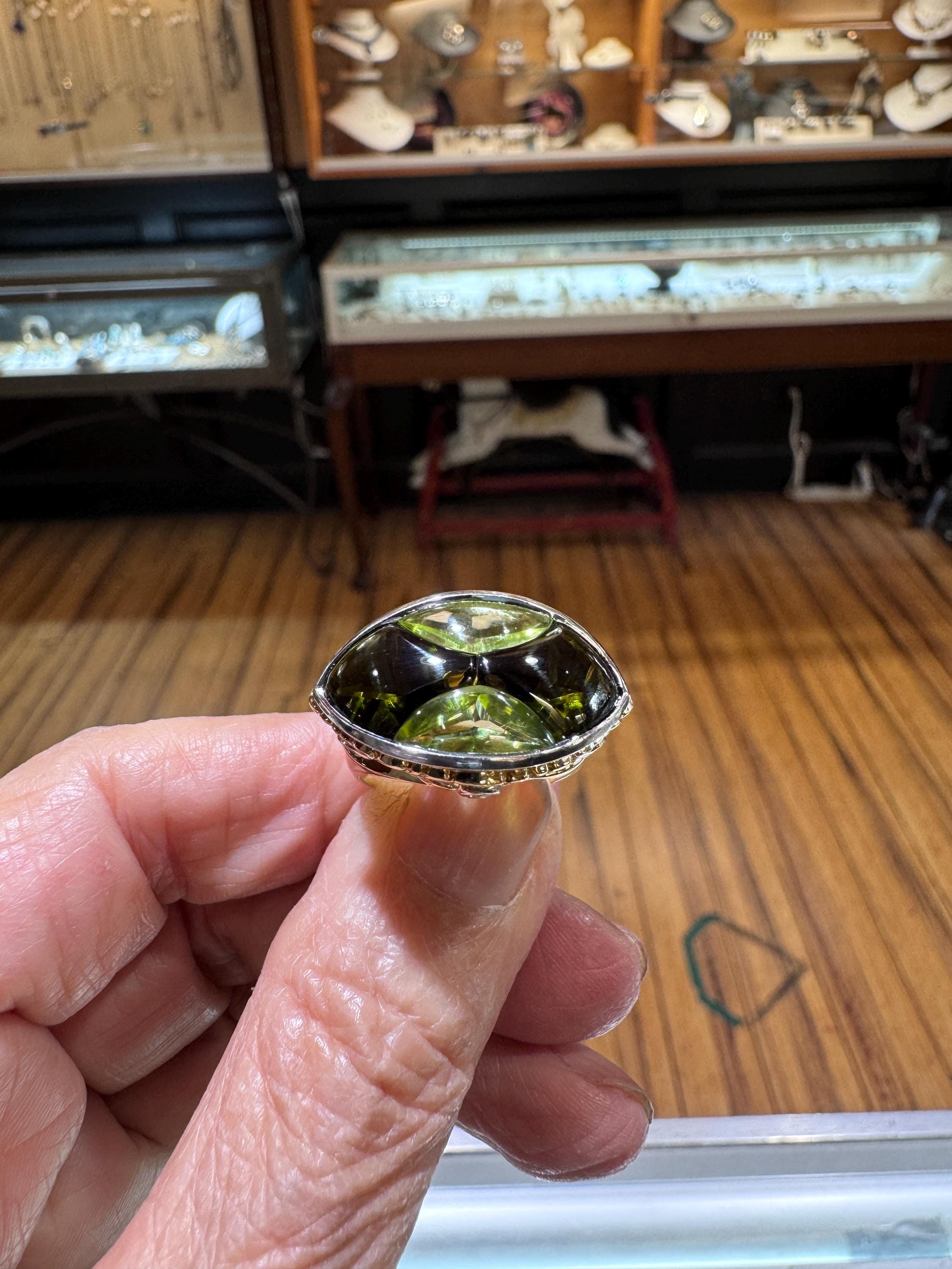 A rather unique ring! Size 7.25 only! This 18K yellow gold ring has a lovely airline with six 2mm diamonds but its top has some interestingly cut stones! Two 11mmx 5mm peridot marquis cabochons are nestled into two 12mm x 9 mm green tourmaline spear shaped cabochons.... Very different!!! There is a registration number: R70744 inscribed on the bottom of the shank but no jewelers hallmark. If you recognize the jeweler who made this please let us know. It was a wonderful estate find!