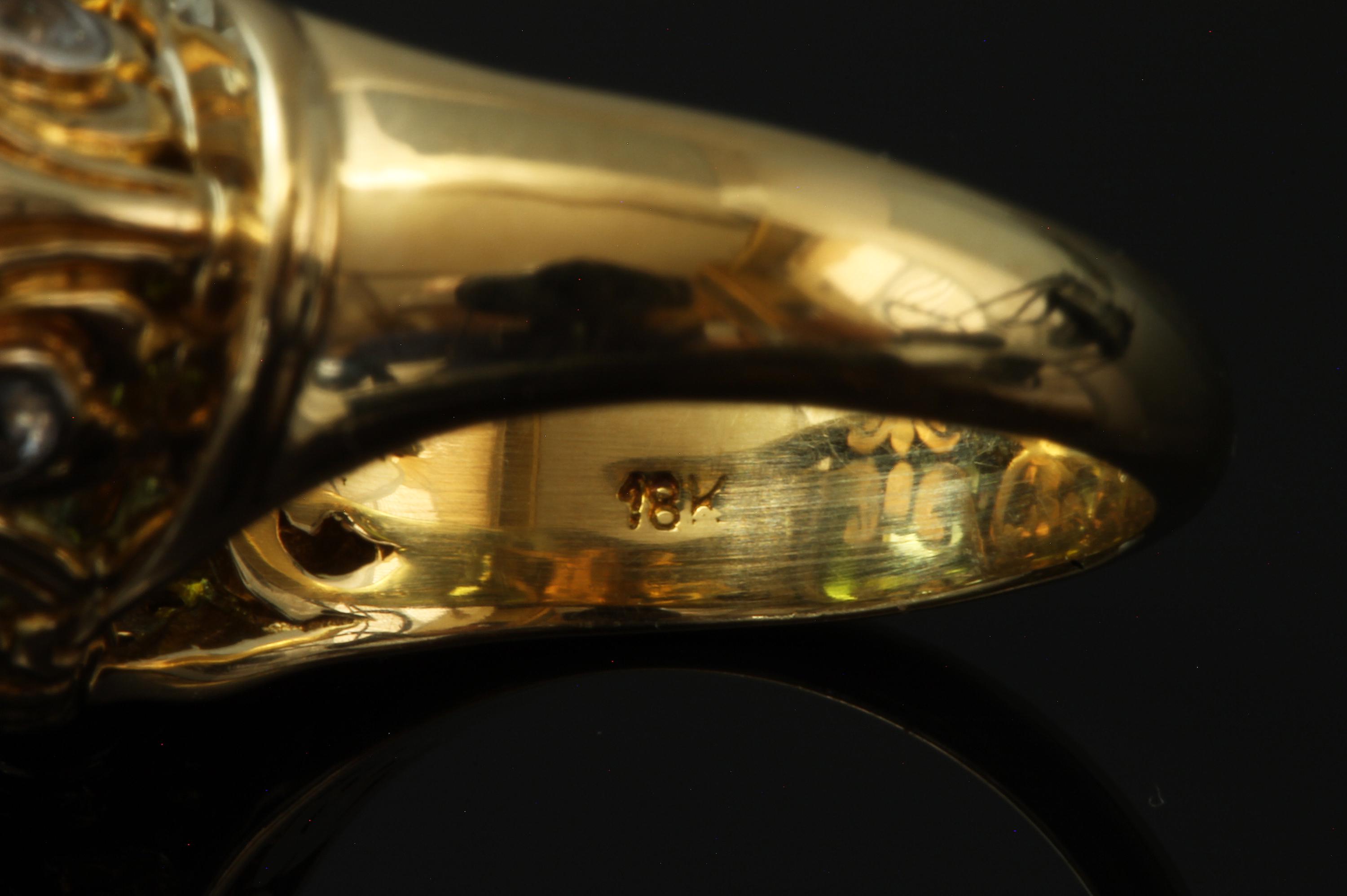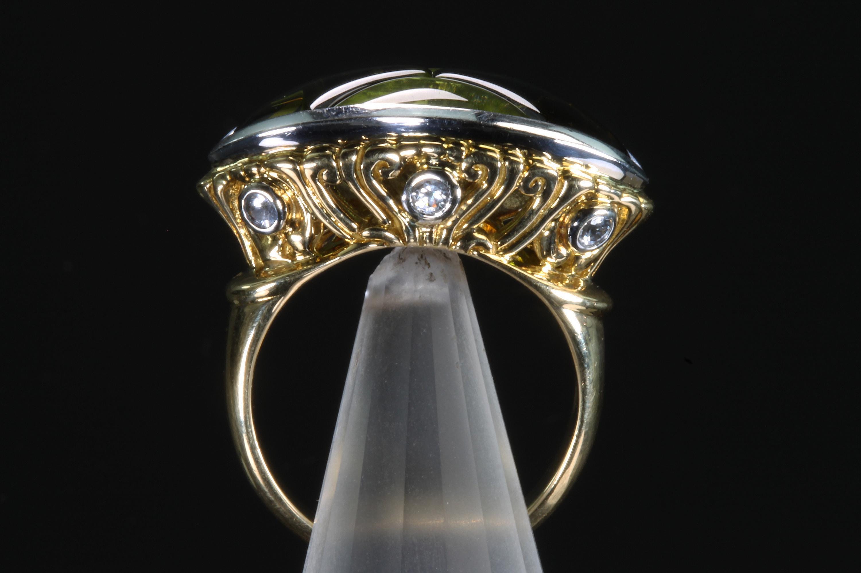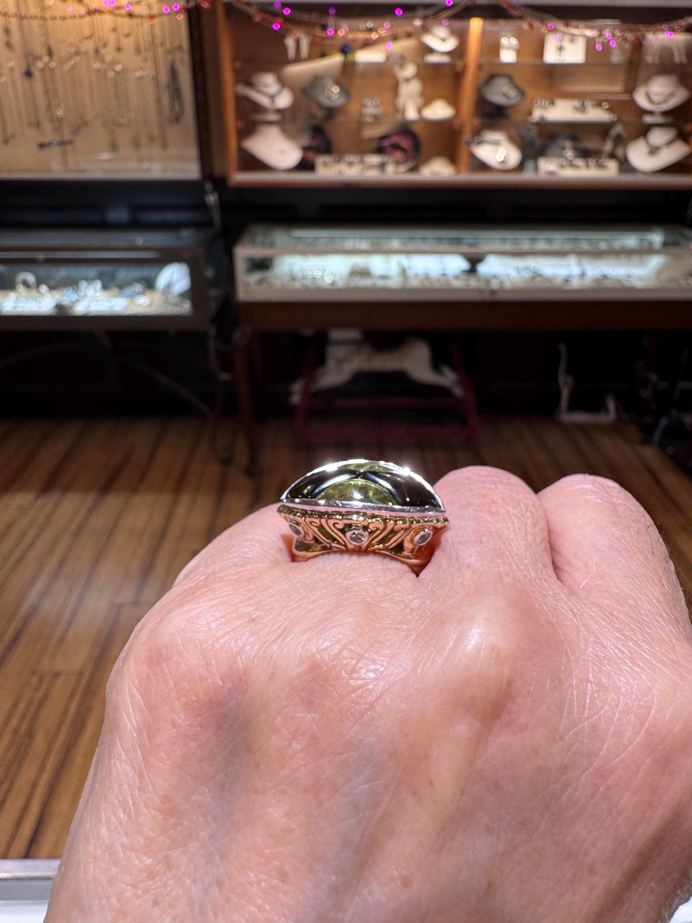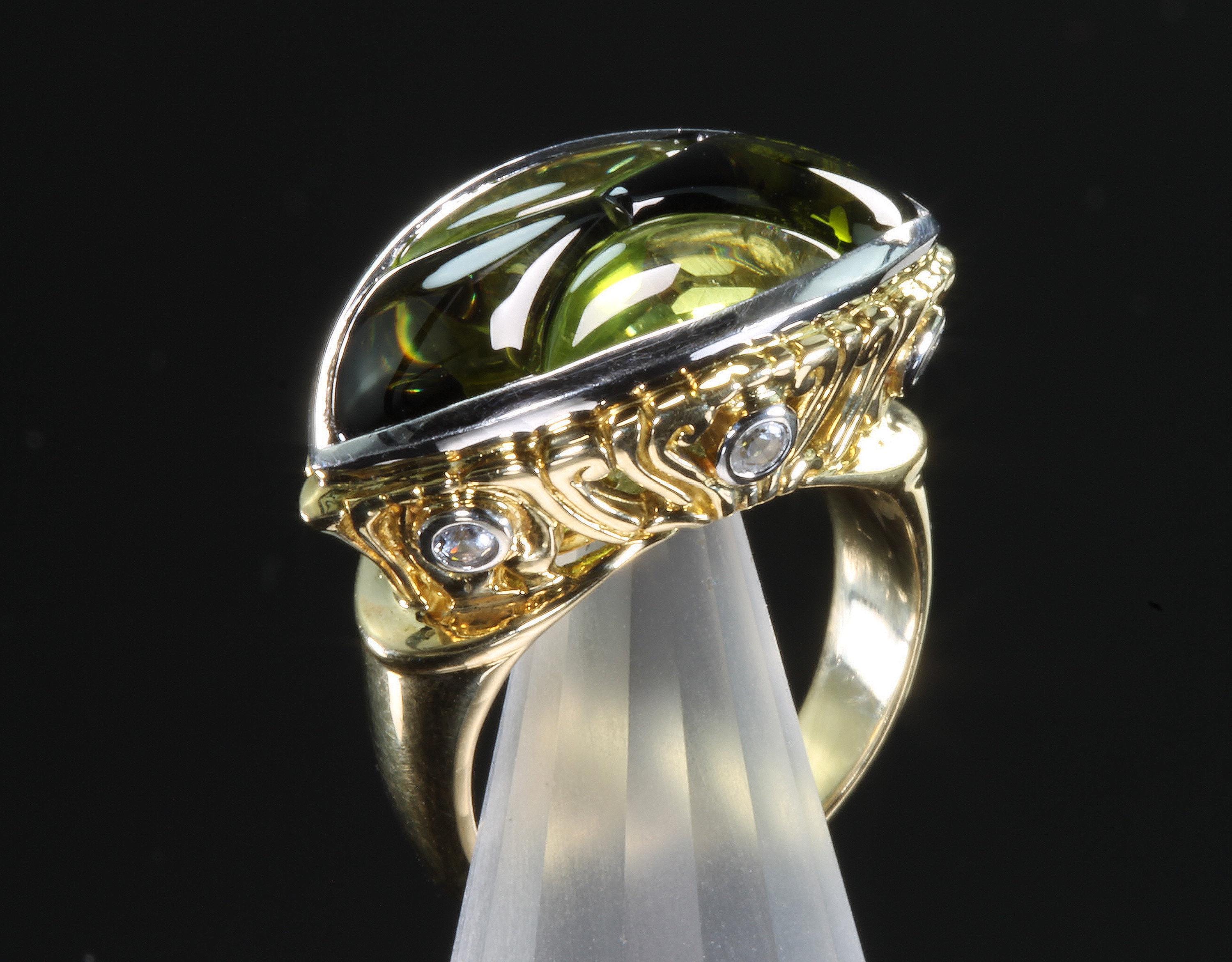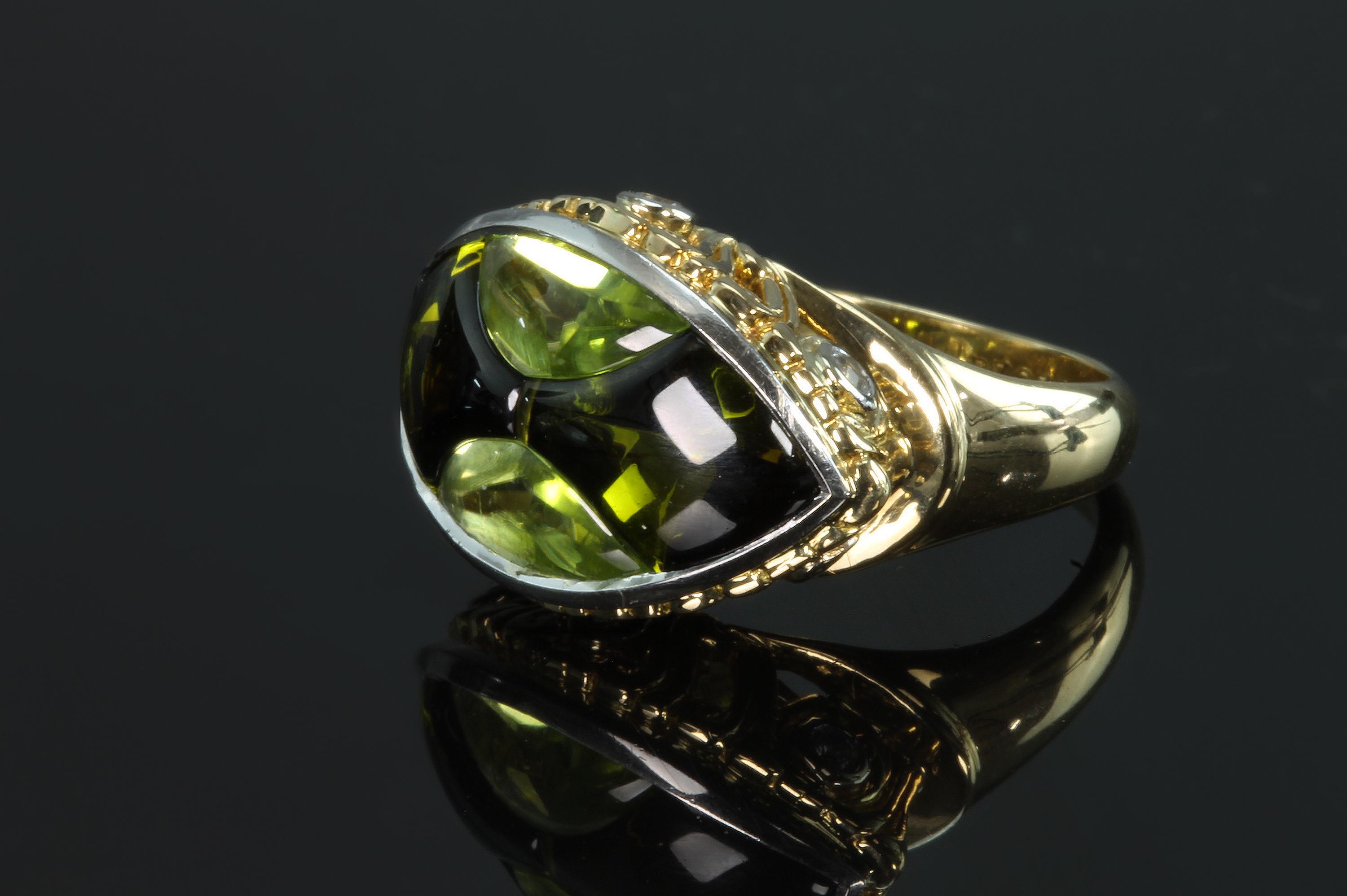 A rather unique ring! Size 7.25 only! This 18K yellow gold ring has a lovely airline with six 2mm diamonds but its top has some interestingly cut stones! Two 11mmx 5mm peridot marquis cabochons are nestled into two 12mm x 9 mm green tourmaline spear shaped cabochons.... Very different!!! There is a registration number: R70744 inscribed on the bottom of the shank but no jewelers hallmark. If you recognize the jeweler who made this please let us know. It was a wonderful estate find!