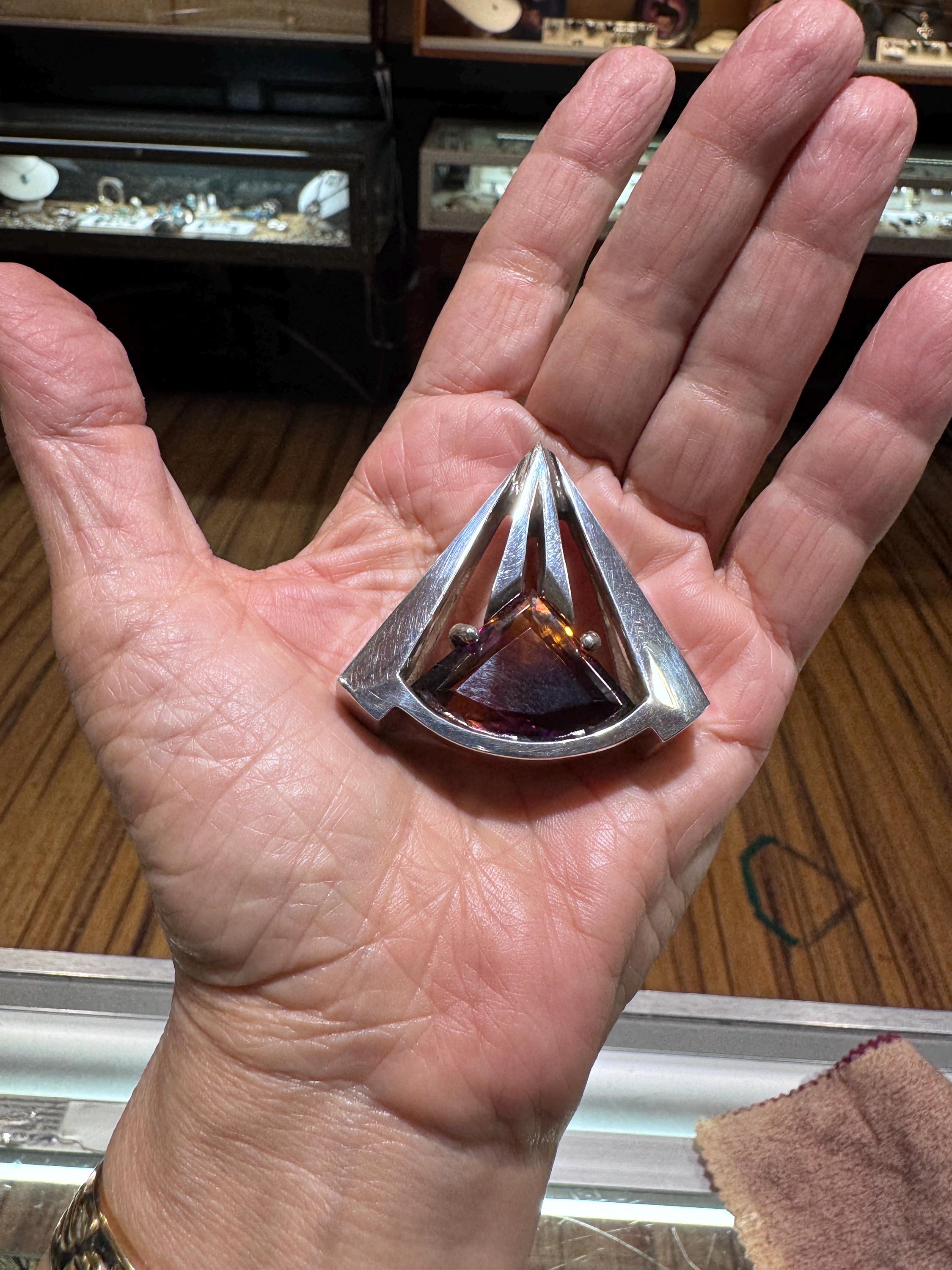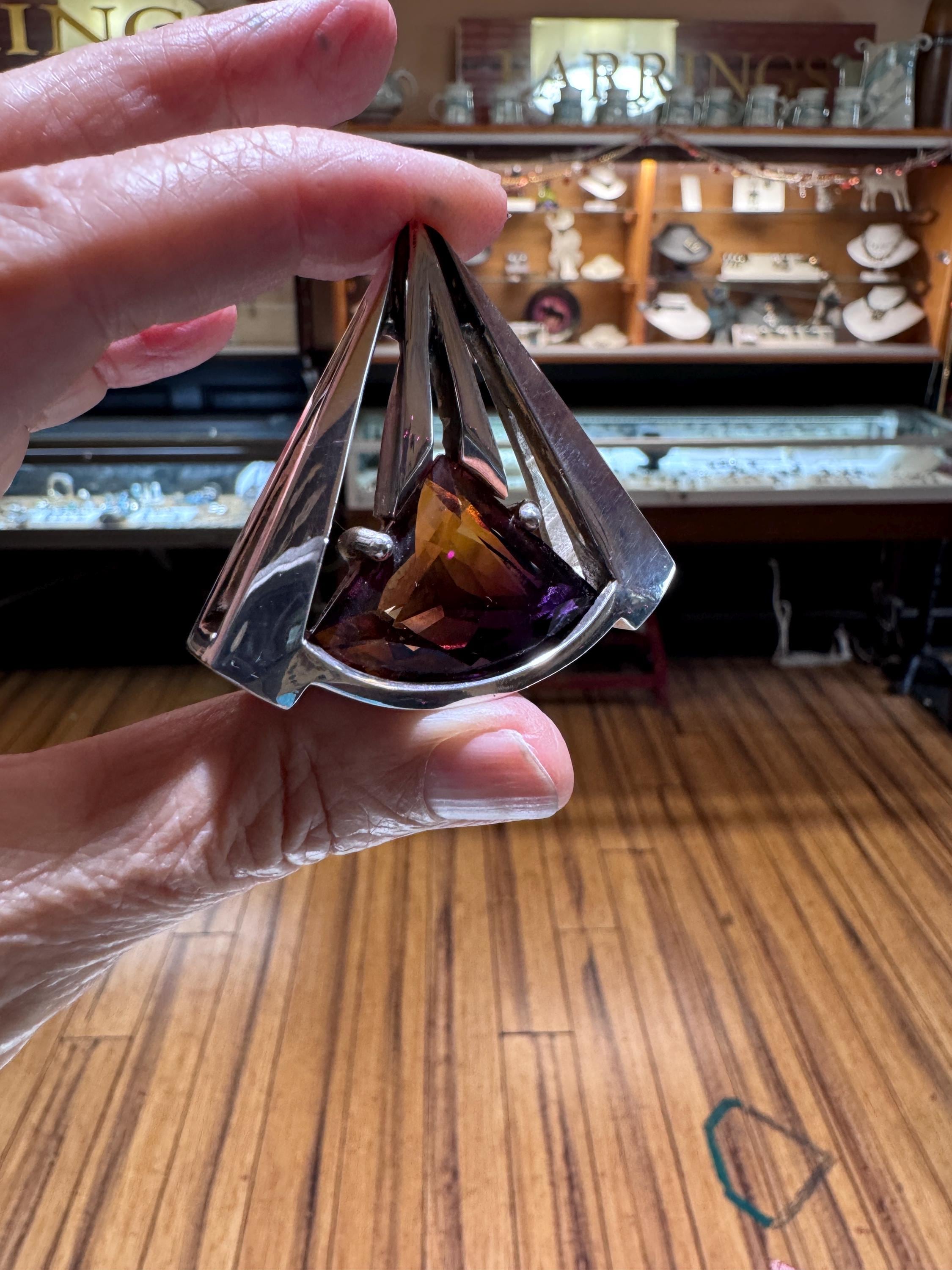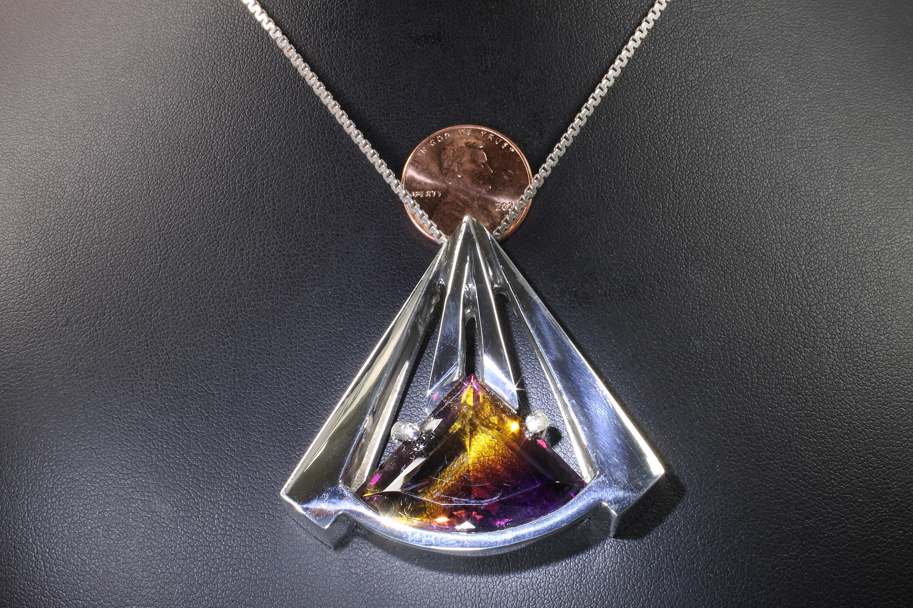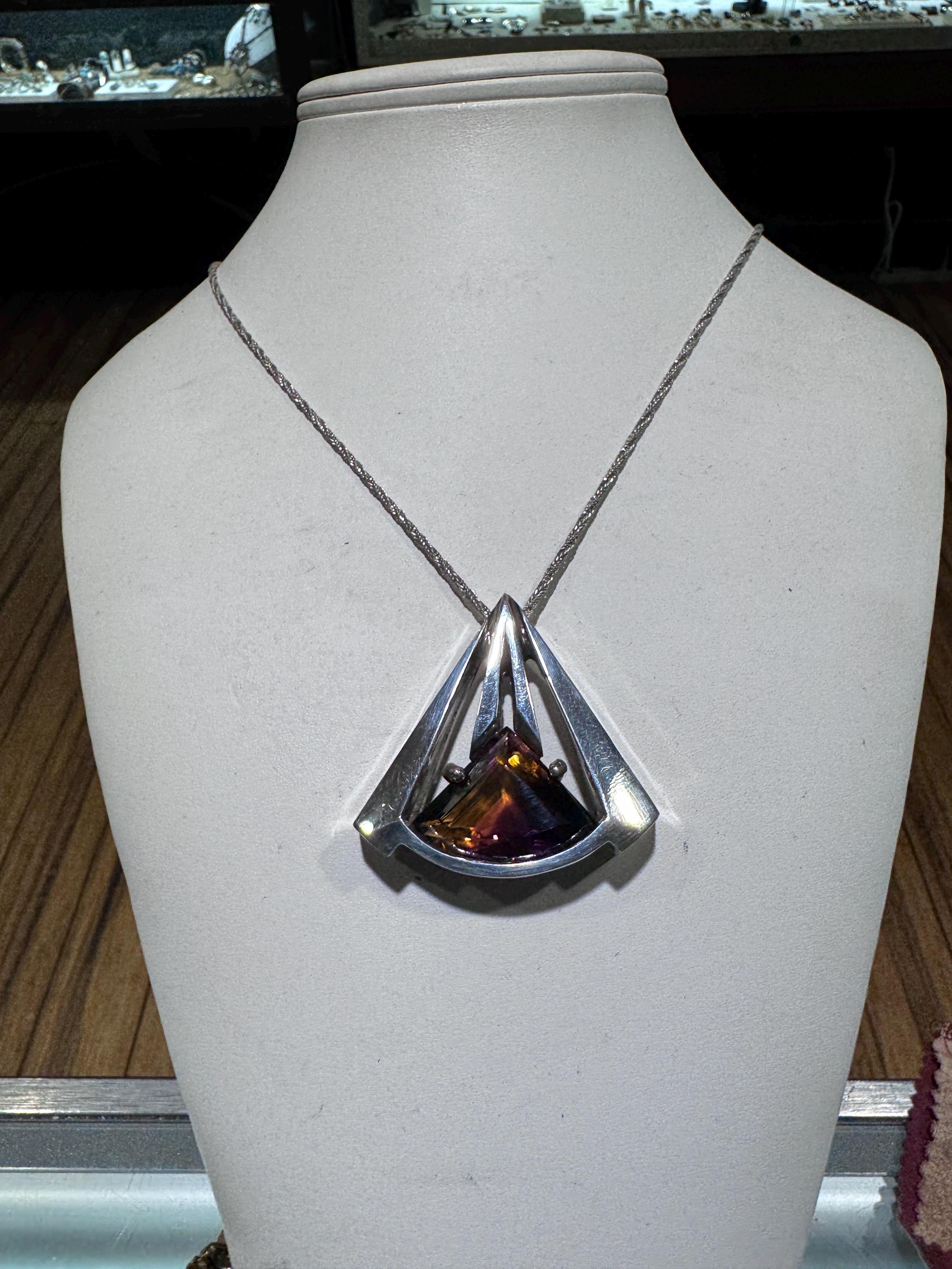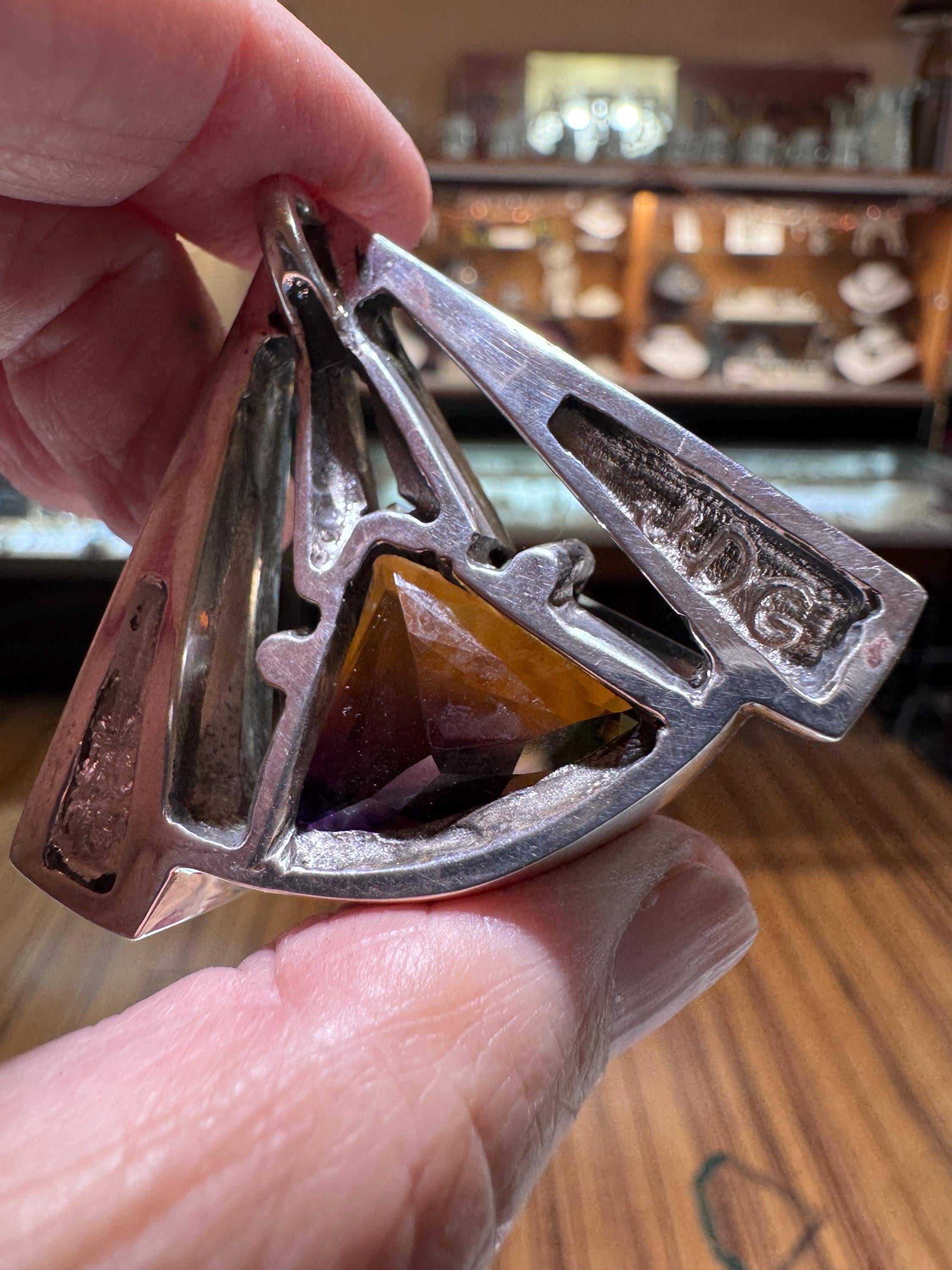 Amazing Ametrine and sterling silver pendant, handmade by John! Ametrine is a wonder of Nature; amethyst and citrine grow together to form this beautiful gemstone. This triangular example measures 29mm x 22mm, the pendant measures 2" x 1 7/8" and weighs in at a hefty 39.3 dwt or 61.11 grams or 2.15 ounces! Sold on sterling silver 22” rope chain for immediate wear. A rather galactic one of a kind piece of wearable art!