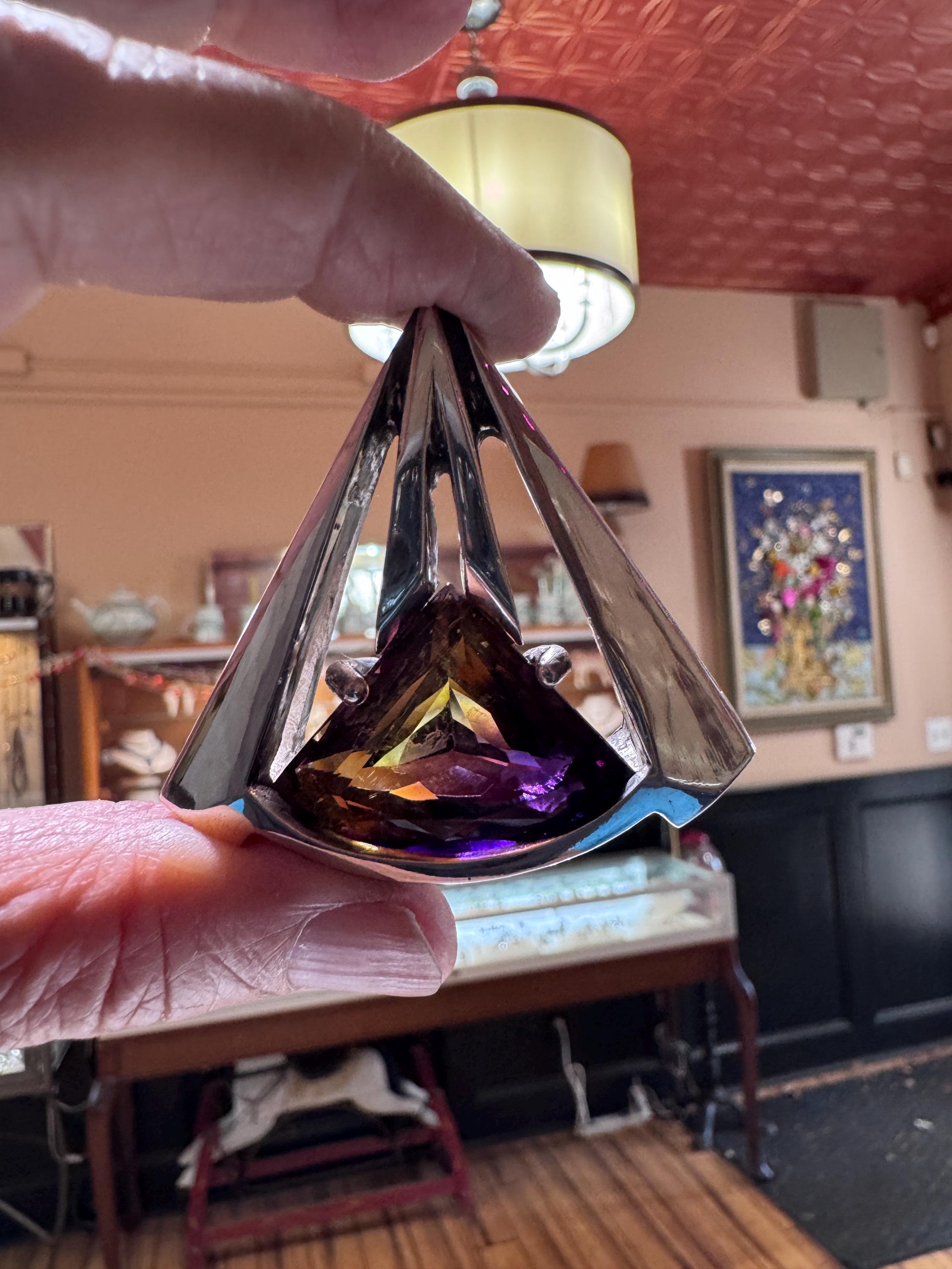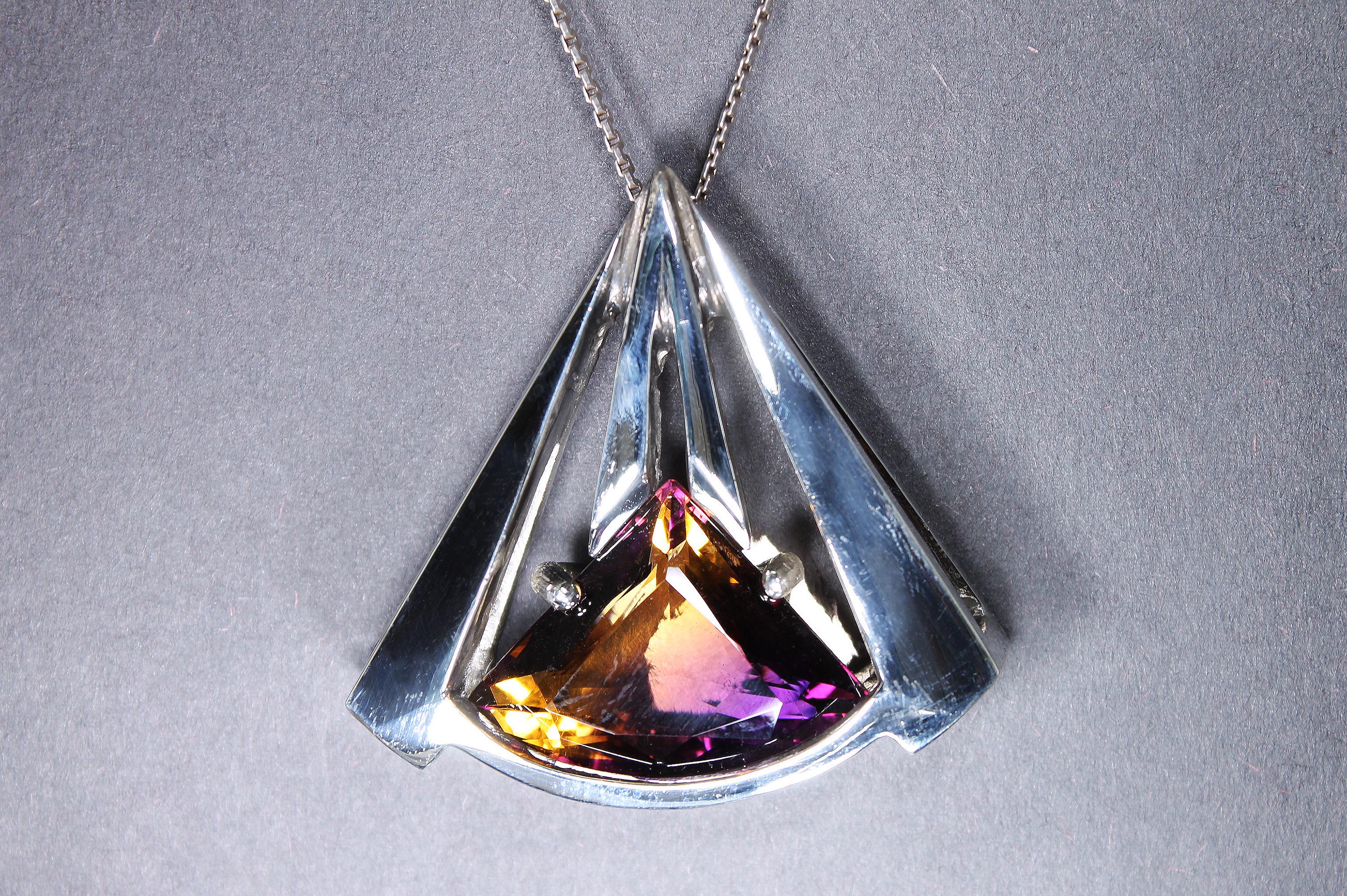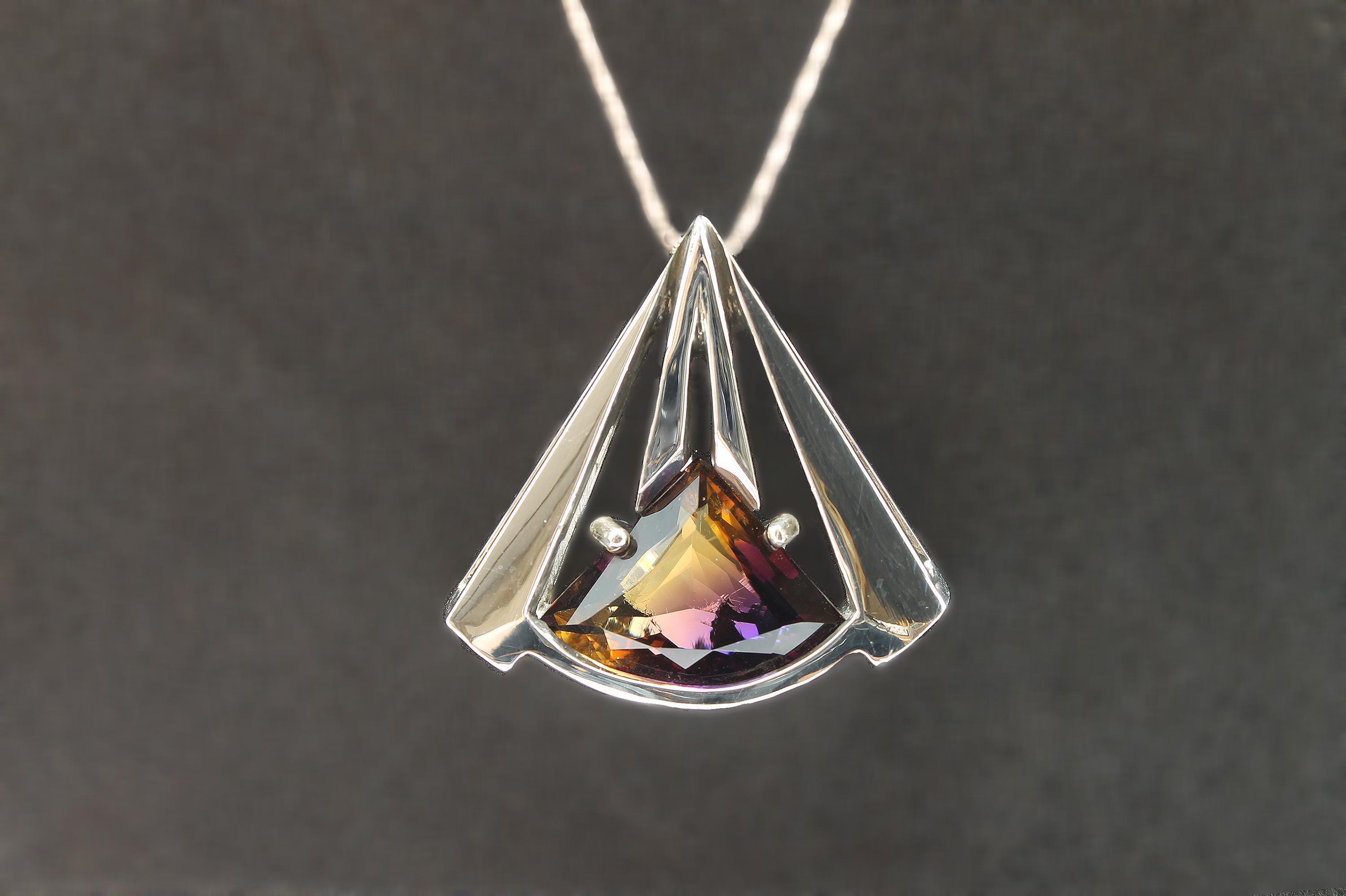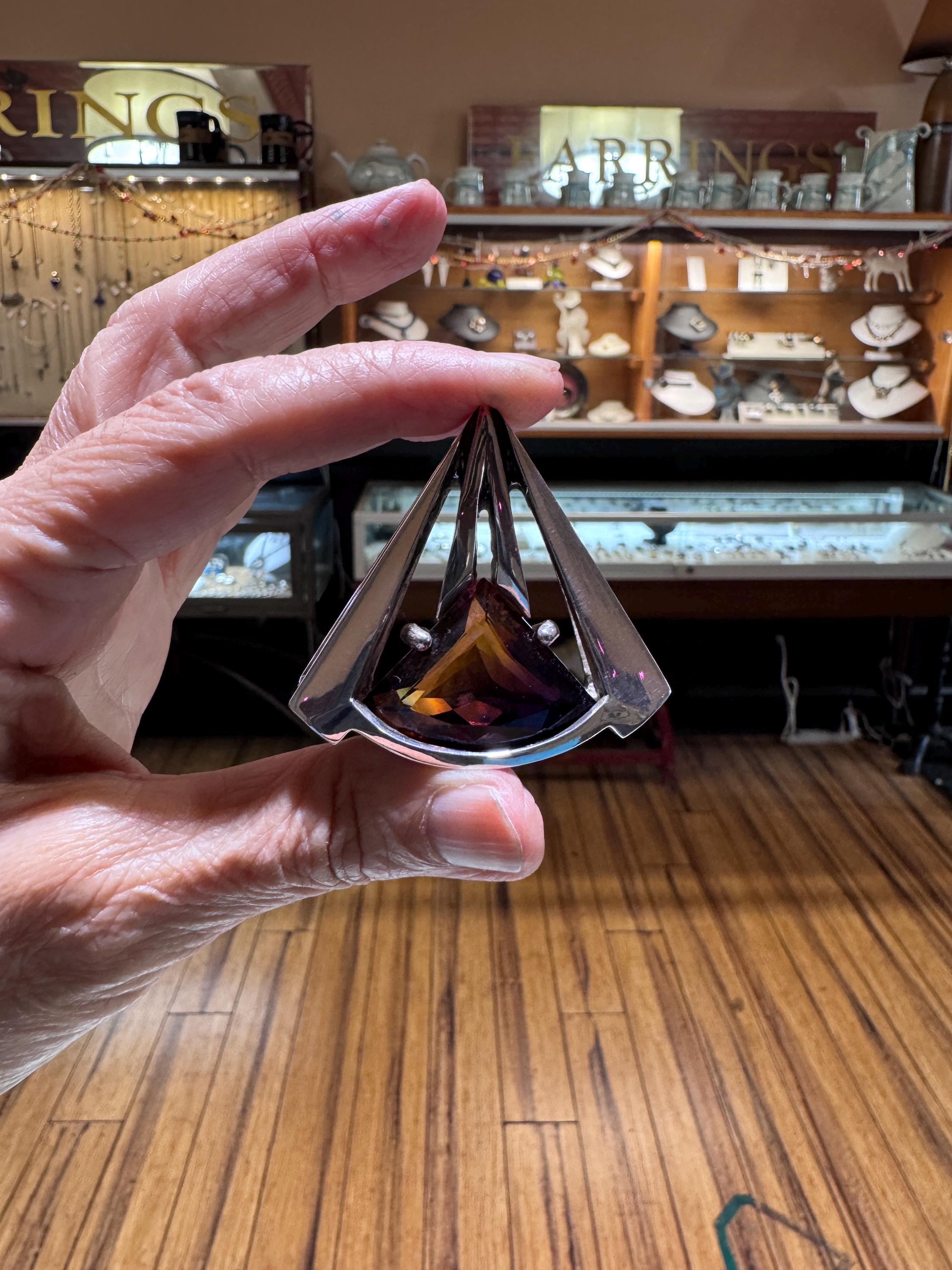 Amazing Ametrine and sterling silver pendant, handmade by John! Ametrine is a wonder of Nature; amethyst and citrine grow together to form this beautiful gemstone. This triangular example measures 29mm x 22mm, the pendant measures 2" x 1 7/8" and weighs in at a hefty 39.3 dwt or 61.11 grams or 2.15 ounces! Sold on sterling silver 22” rope chain for immediate wear. A rather galactic one of a kind piece of wearable art!