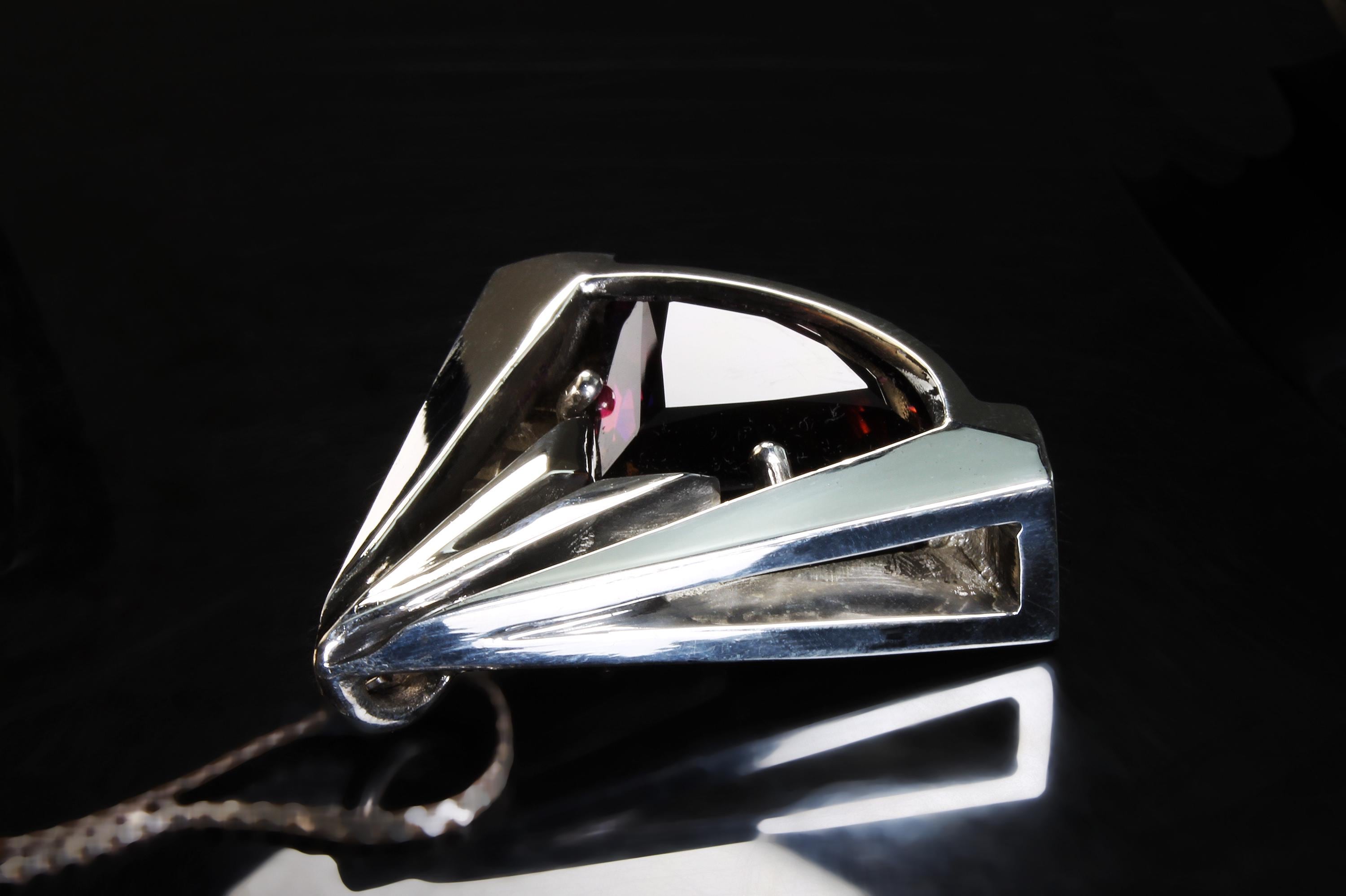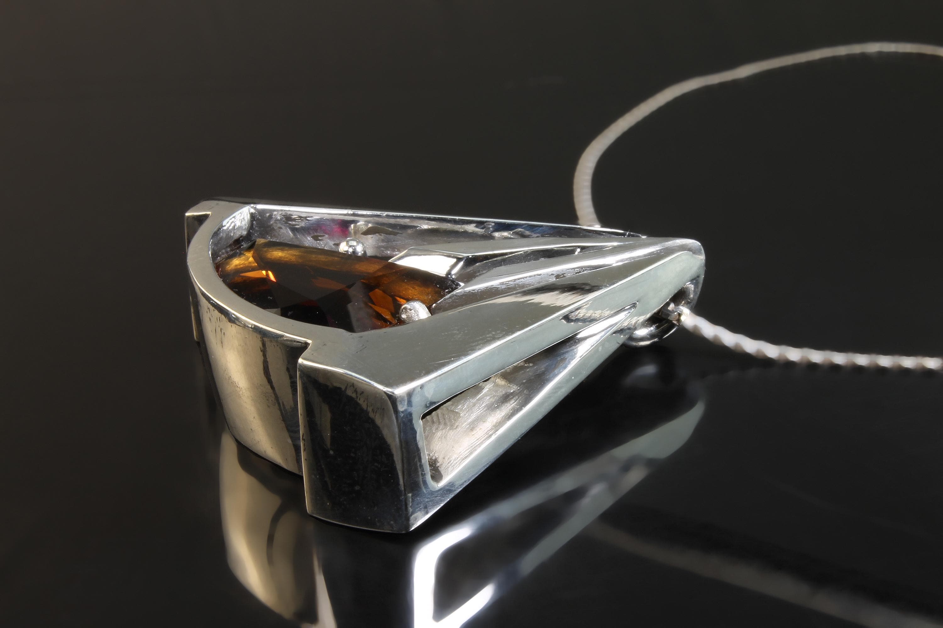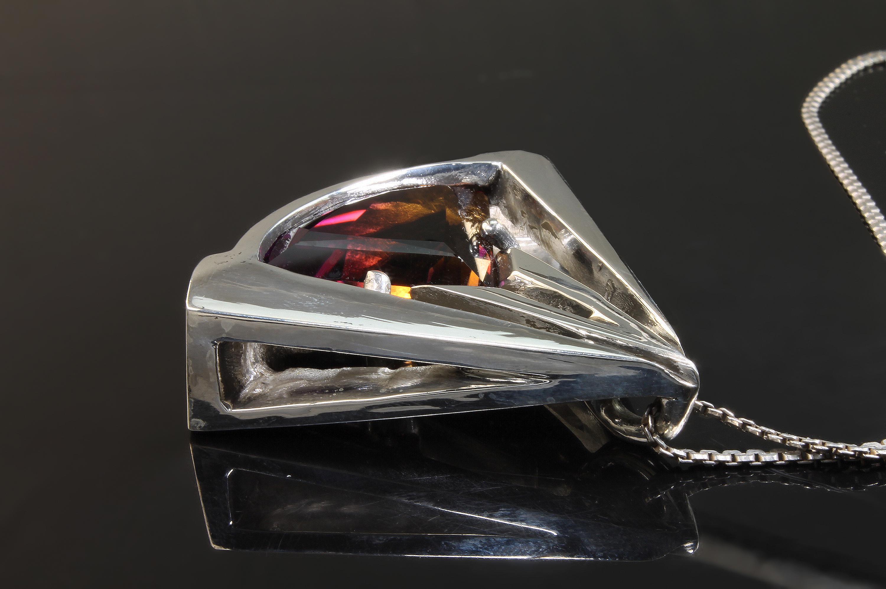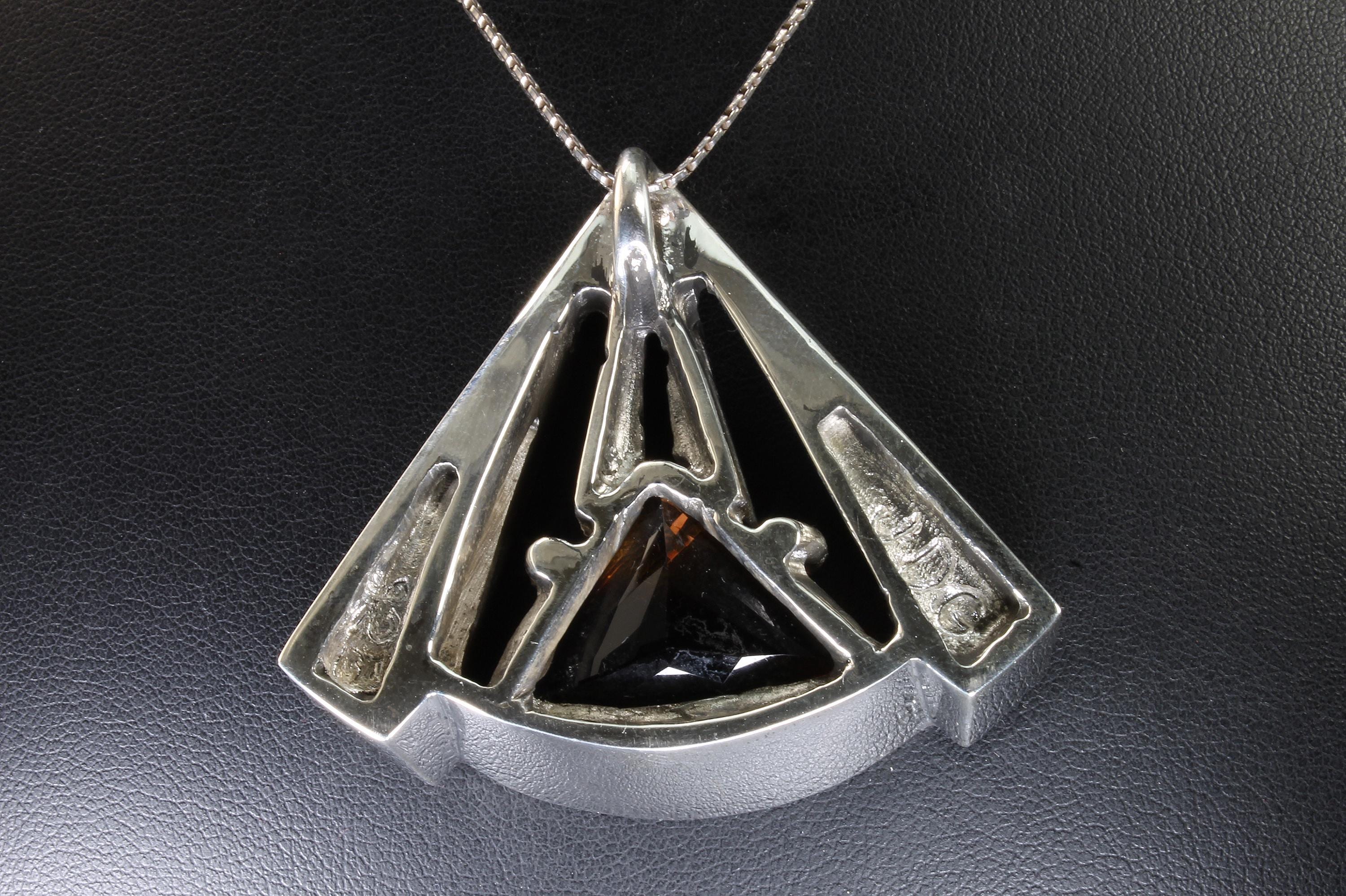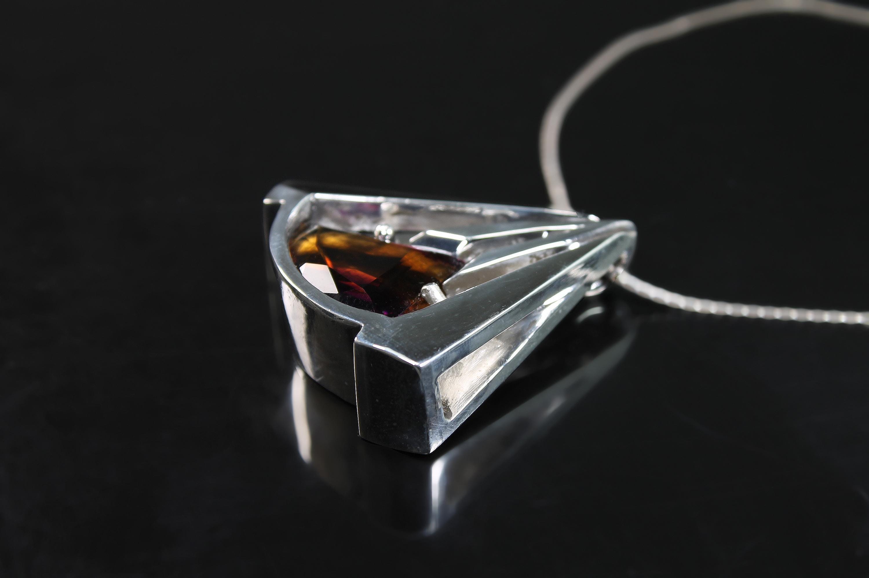 Amazing Ametrine and sterling silver pendant, handmade by John! Ametrine is a wonder of Nature; amethyst and citrine grow together to form this beautiful gemstone. This triangular example measures 29mm x 22mm, the pendant measures 2" x 1 7/8" and weighs in at a hefty 39.3 dwt or 61.11 grams or 2.15 ounces! Sold on sterling silver 22” rope chain for immediate wear. A rather galactic one of a kind piece of wearable art!