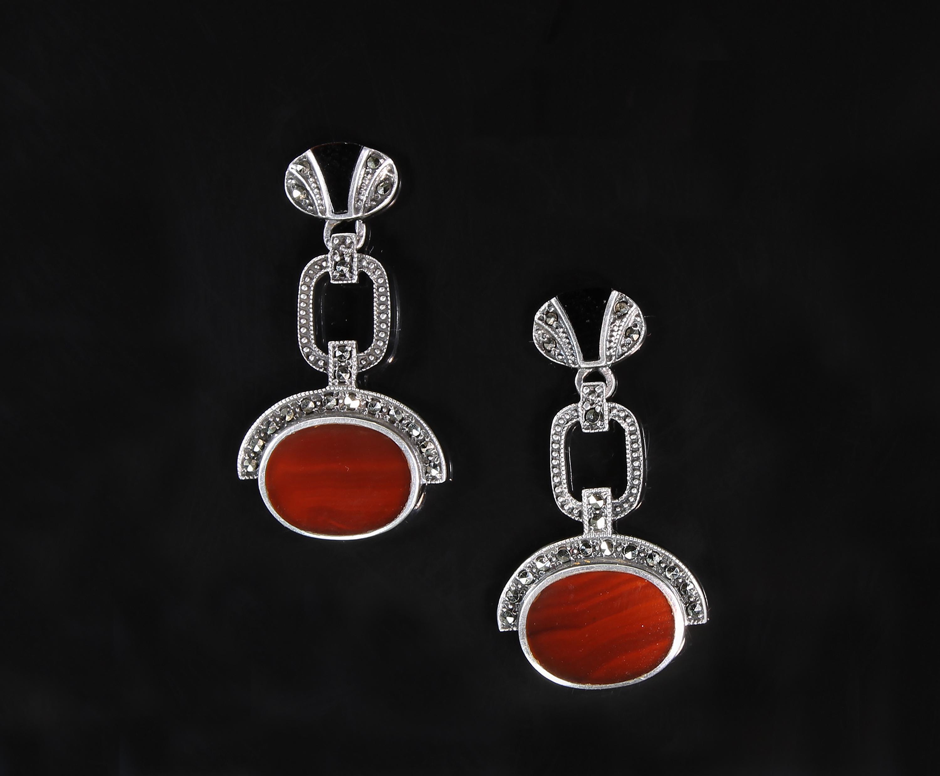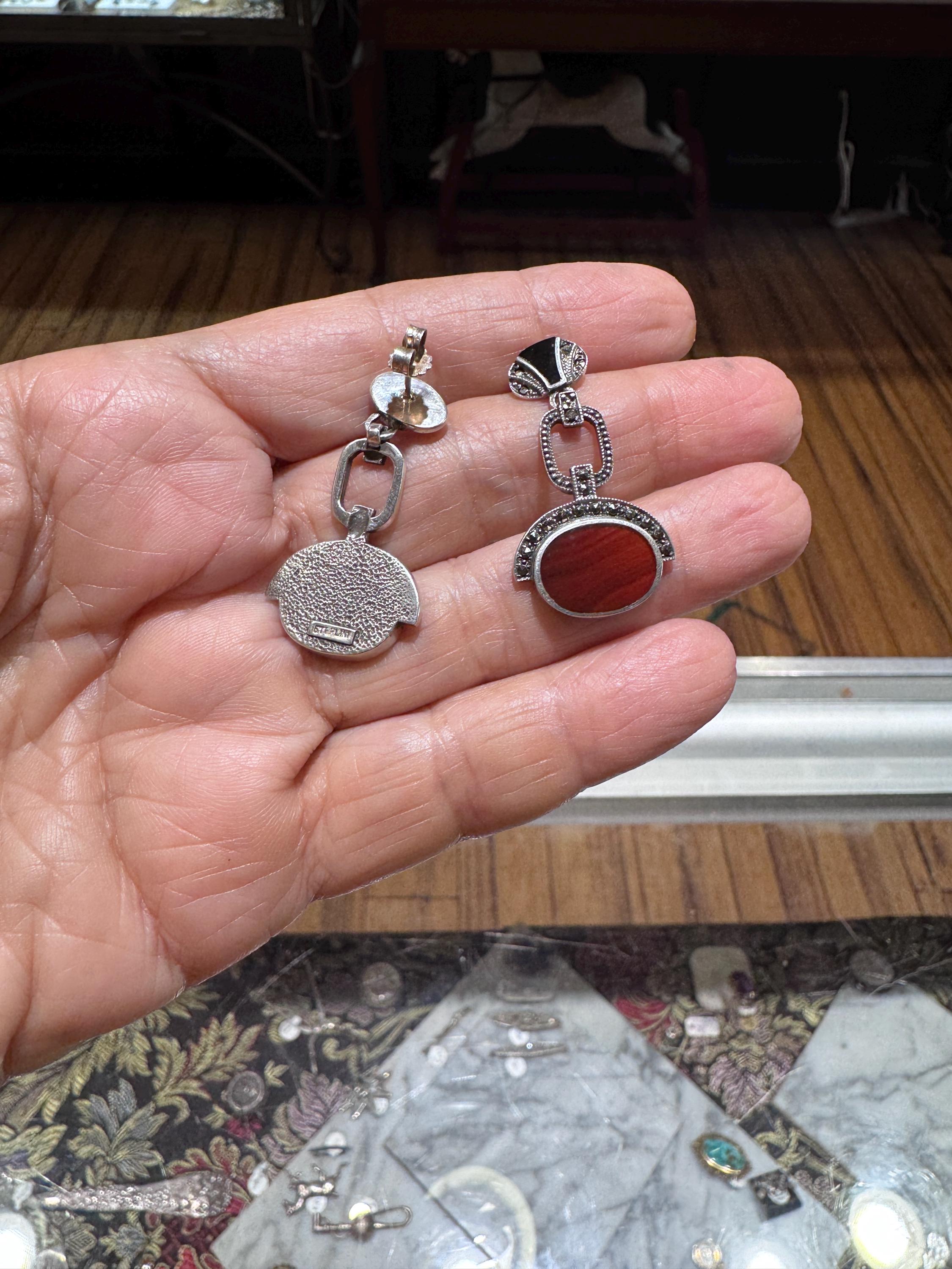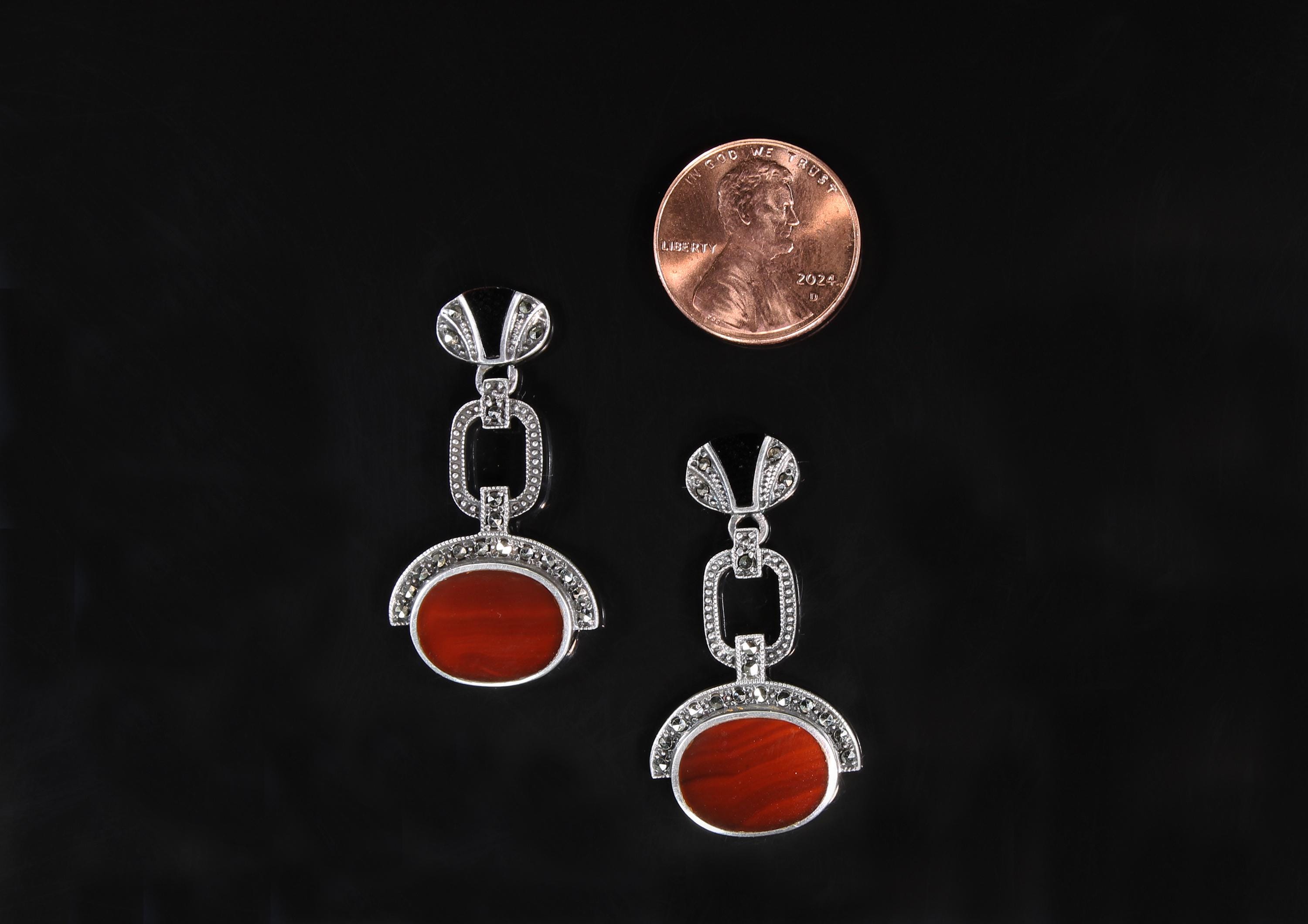 A great pair of Art Deco style sterling silver marcasite earrings! The red agate and black onyx make a fabulous fall fashion statement. Well made and nice weight too! These are vintage and pre owned earrings, sold as is in great ready to wear condition. These earrings measure 1 7/16" long and the red striped agate is 14mm x 10mm. Nice size and nice sparkle!
