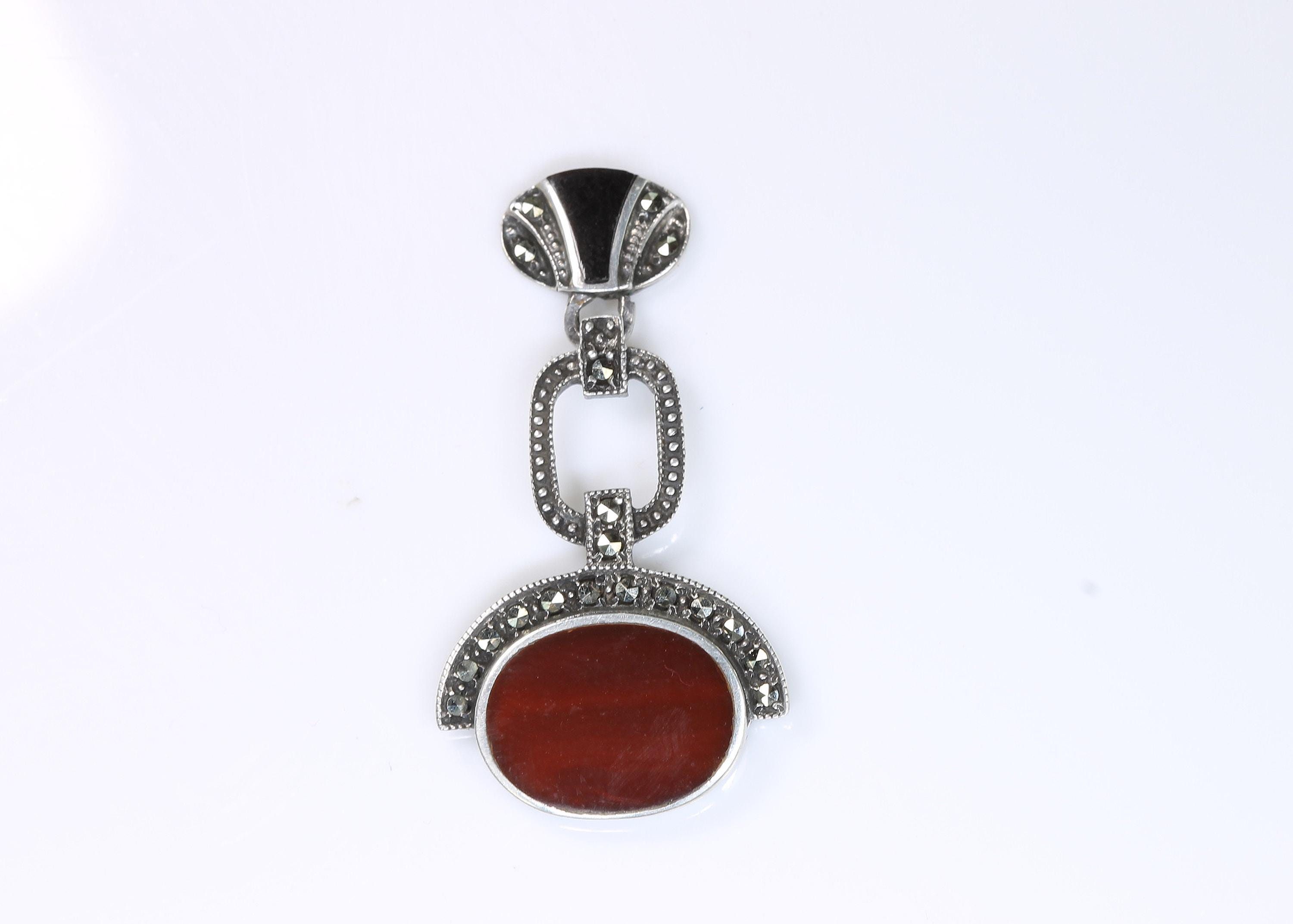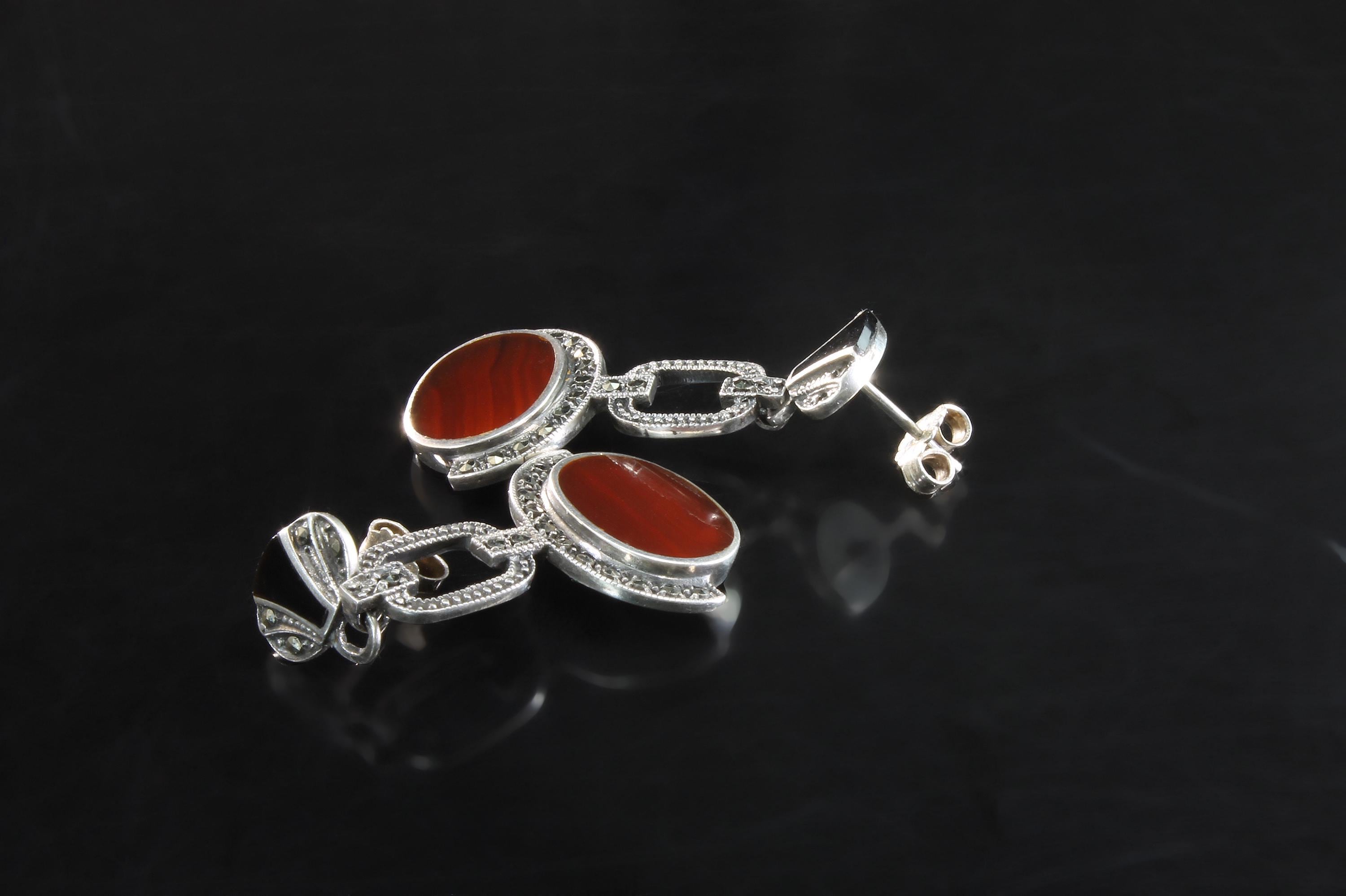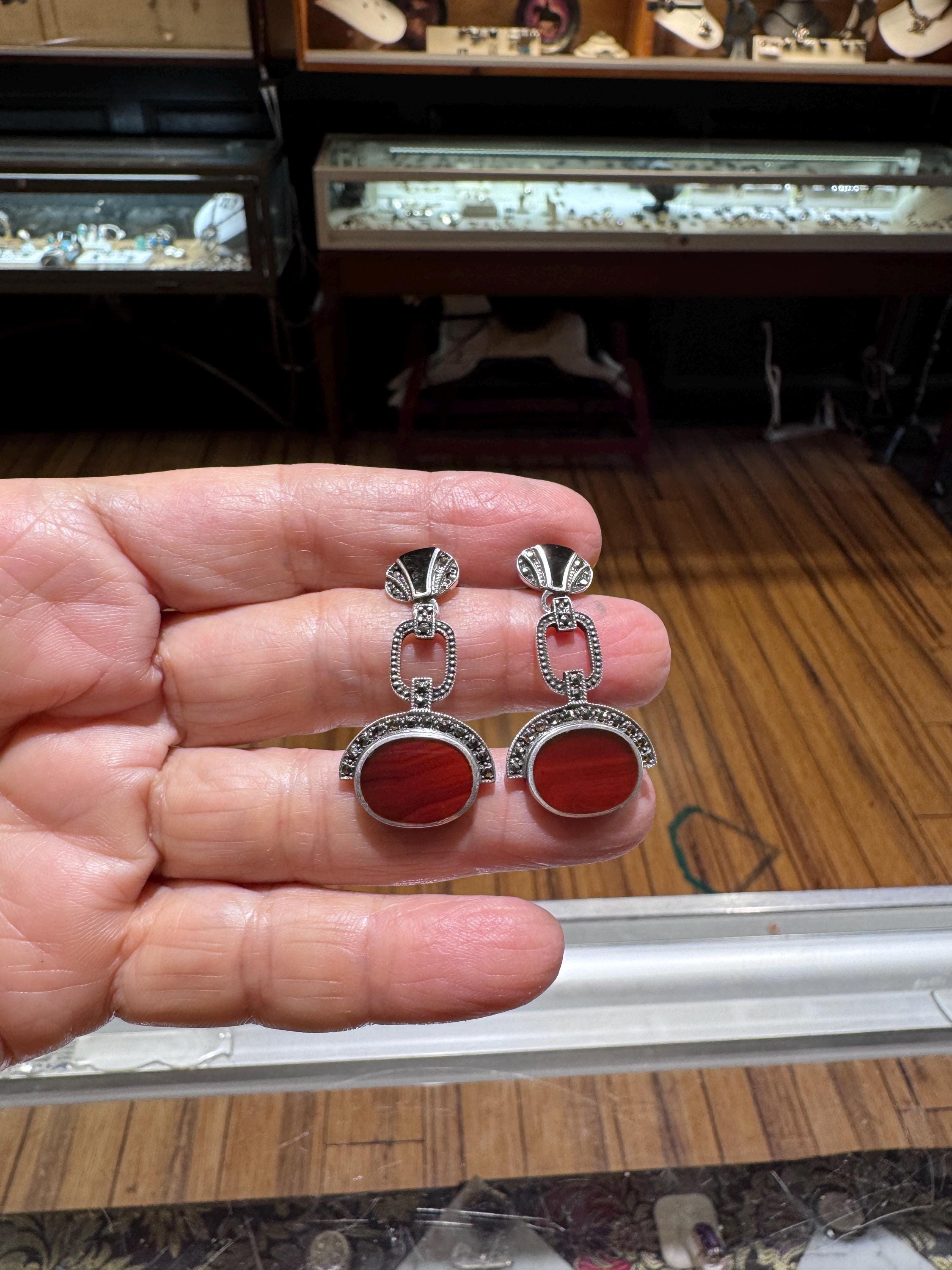 A great pair of Art Deco style sterling silver marcasite earrings! The red agate and black onyx make a fabulous fall fashion statement. Well made and nice weight too! These are vintage and pre owned earrings, sold as is in great ready to wear condition. These earrings measure 1 7/16" long and the red striped agate is 14mm x 10mm. Nice size and nice sparkle!
