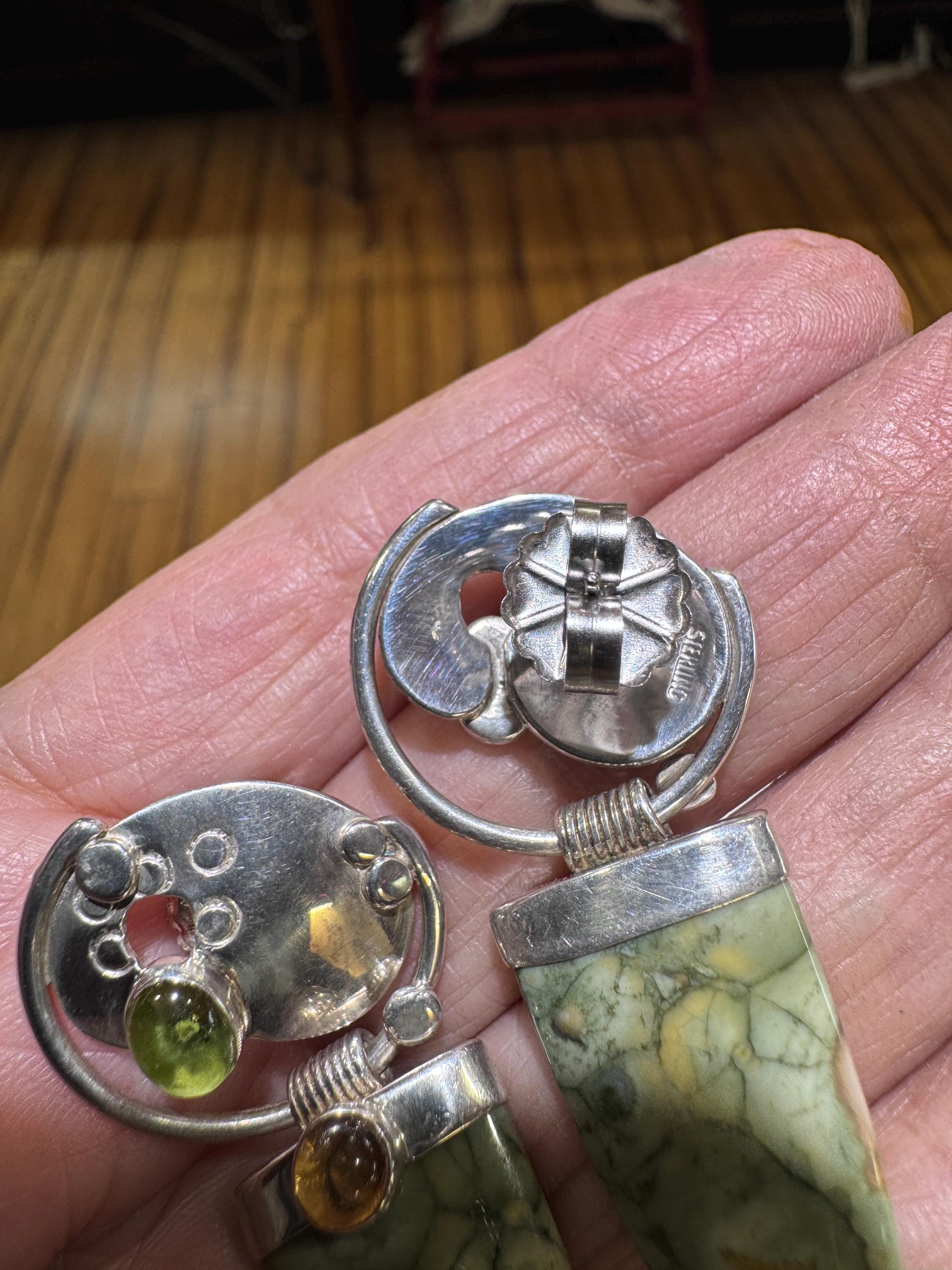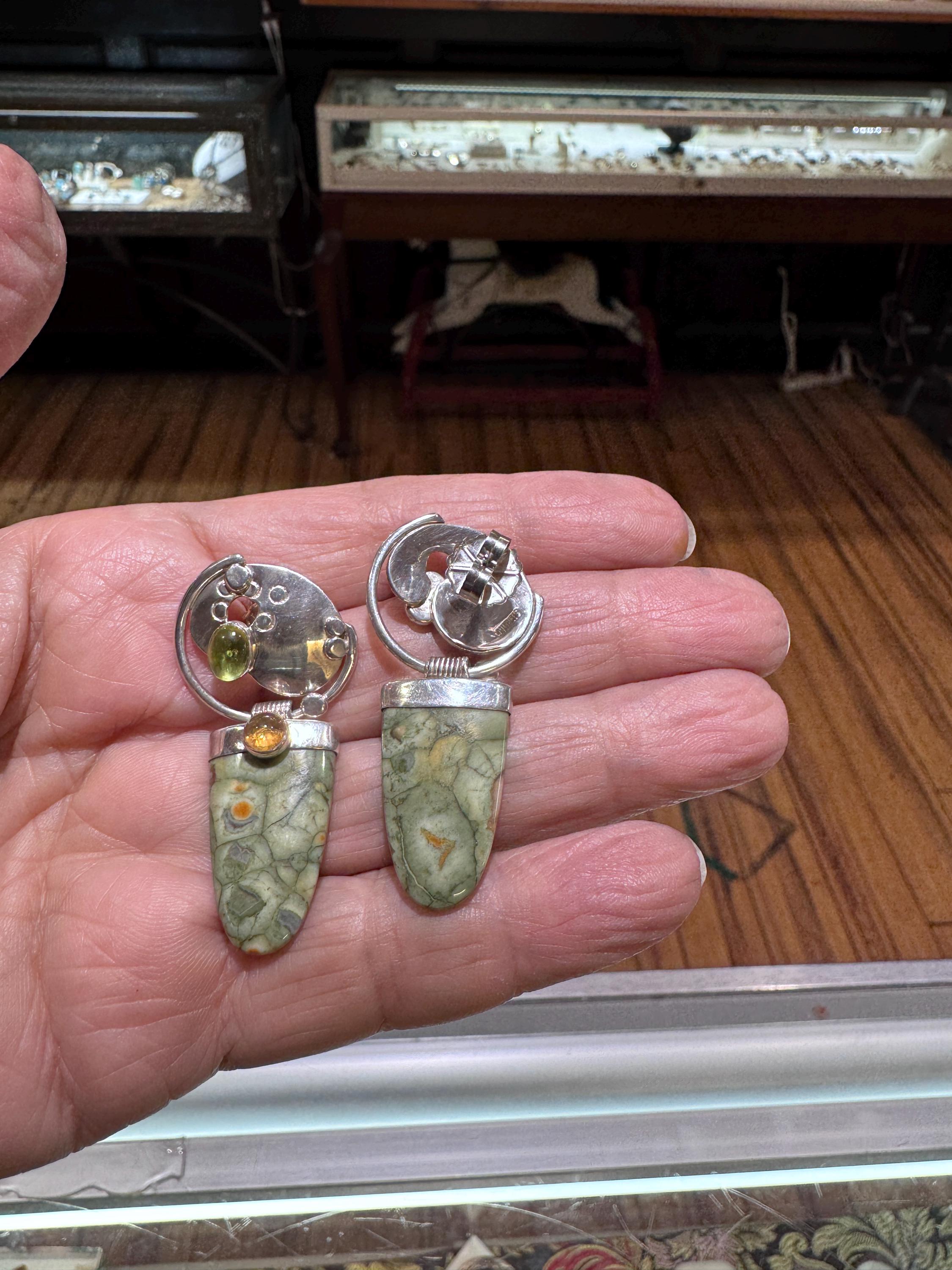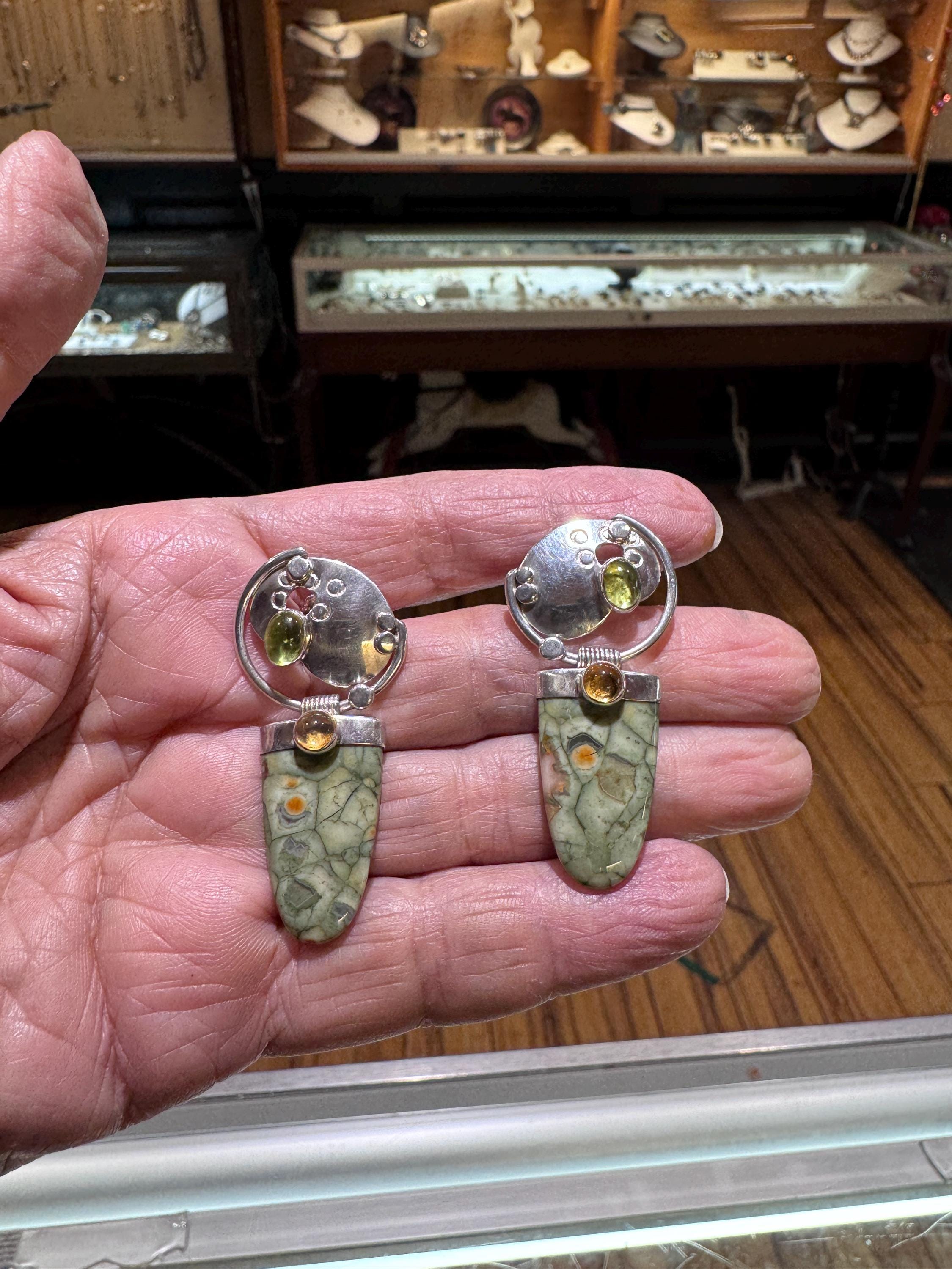 A wonderful pair of wearable art drop earrings. Sterling silver matches up great with the polished rainforest jasper which matches up even better with the peridot and citrine cabochons! A statement indeed! These are vintage and pre owned earrings, sold as is, in great ready to wear condition. Earrings are 1 7/8" long, the rainforest jasper measures 1" x 1/2". Peridot ovals are 6mm x 4mms and the citrines are 4.5mms round.