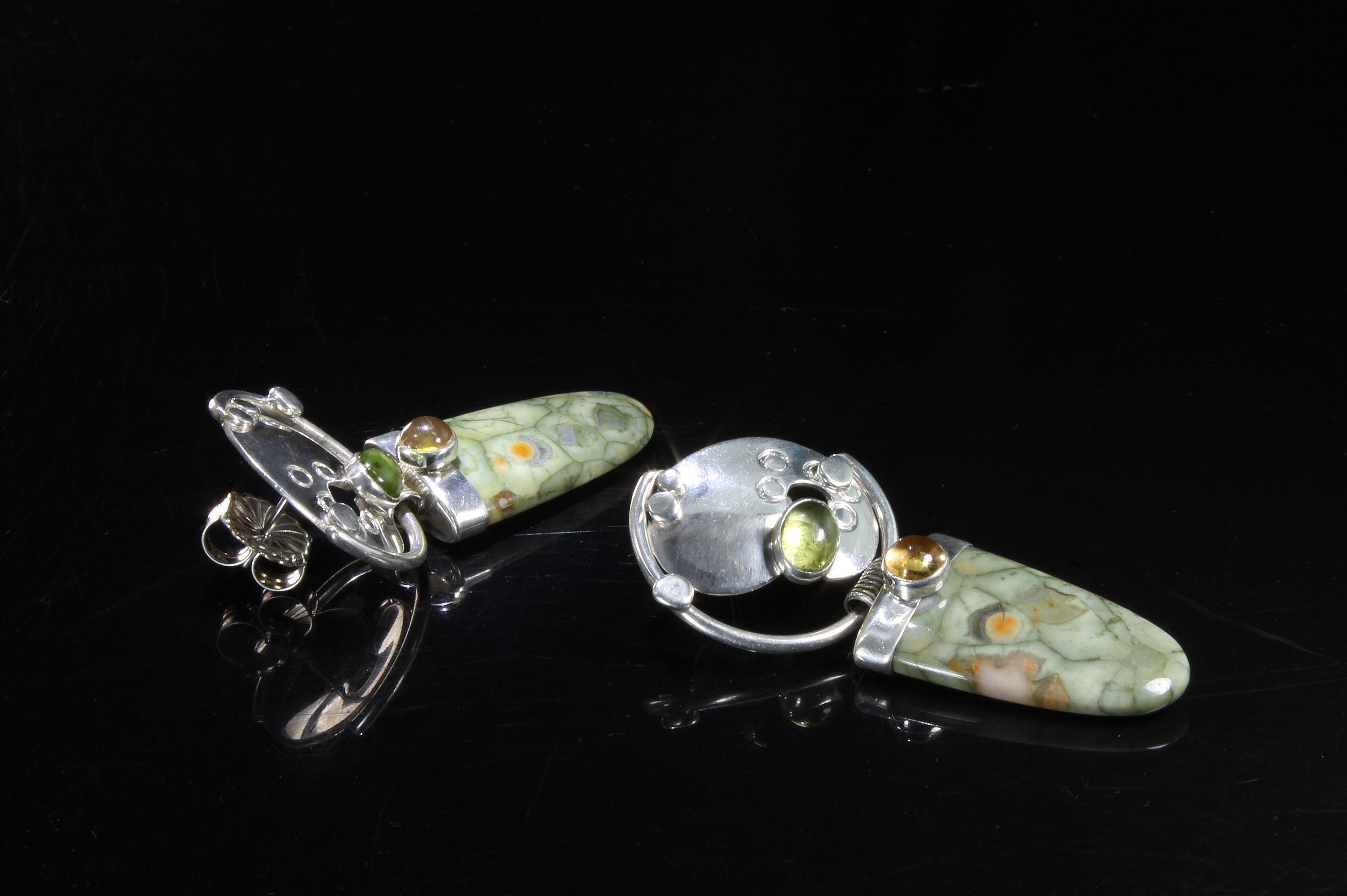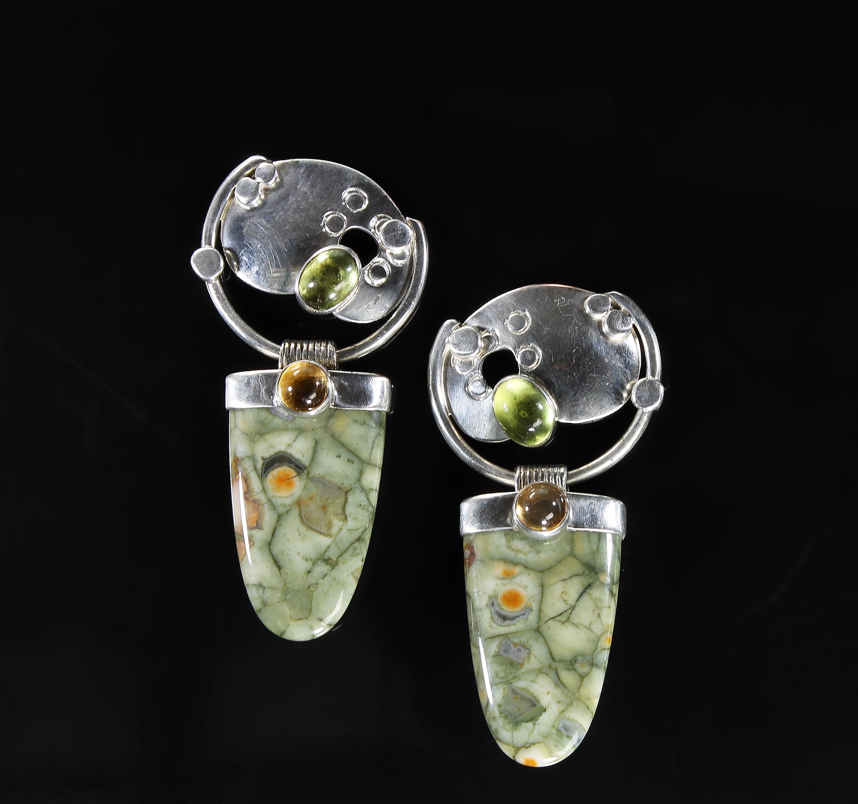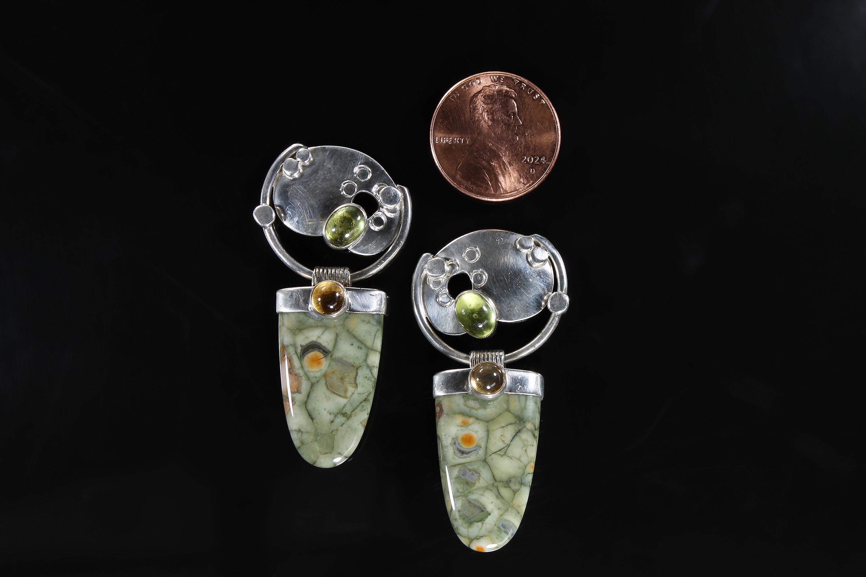 A wonderful pair of wearable art drop earrings. Sterling silver matches up great with the polished rainforest jasper which matches up even better with the peridot and citrine cabochons! A statement indeed! These are vintage and pre owned earrings, sold as is, in great ready to wear condition. Earrings are 1 7/8" long, the rainforest jasper measures 1" x 1/2". Peridot ovals are 6mm x 4mms and the citrines are 4.5mms round.