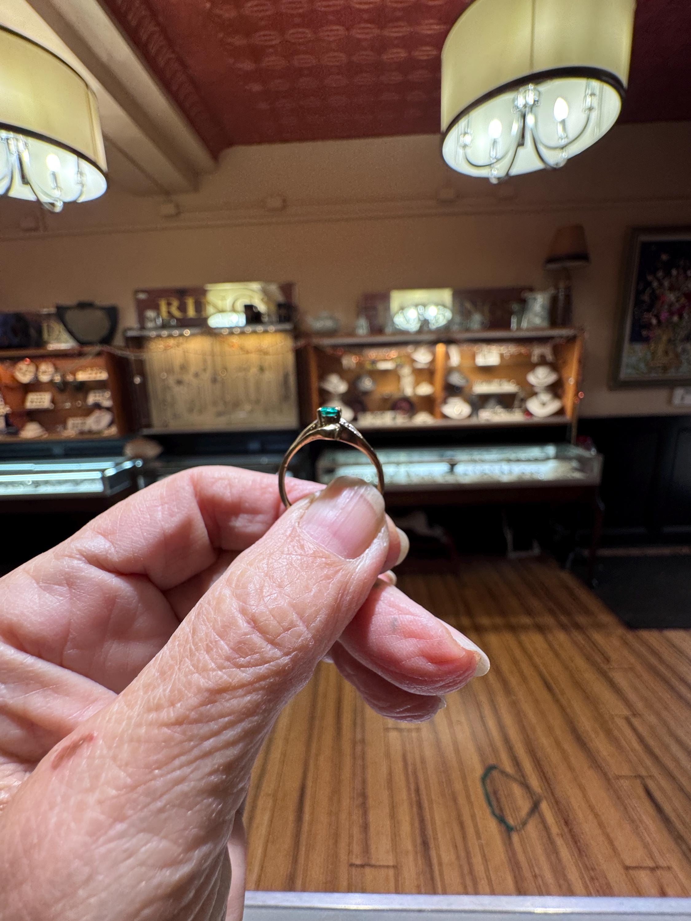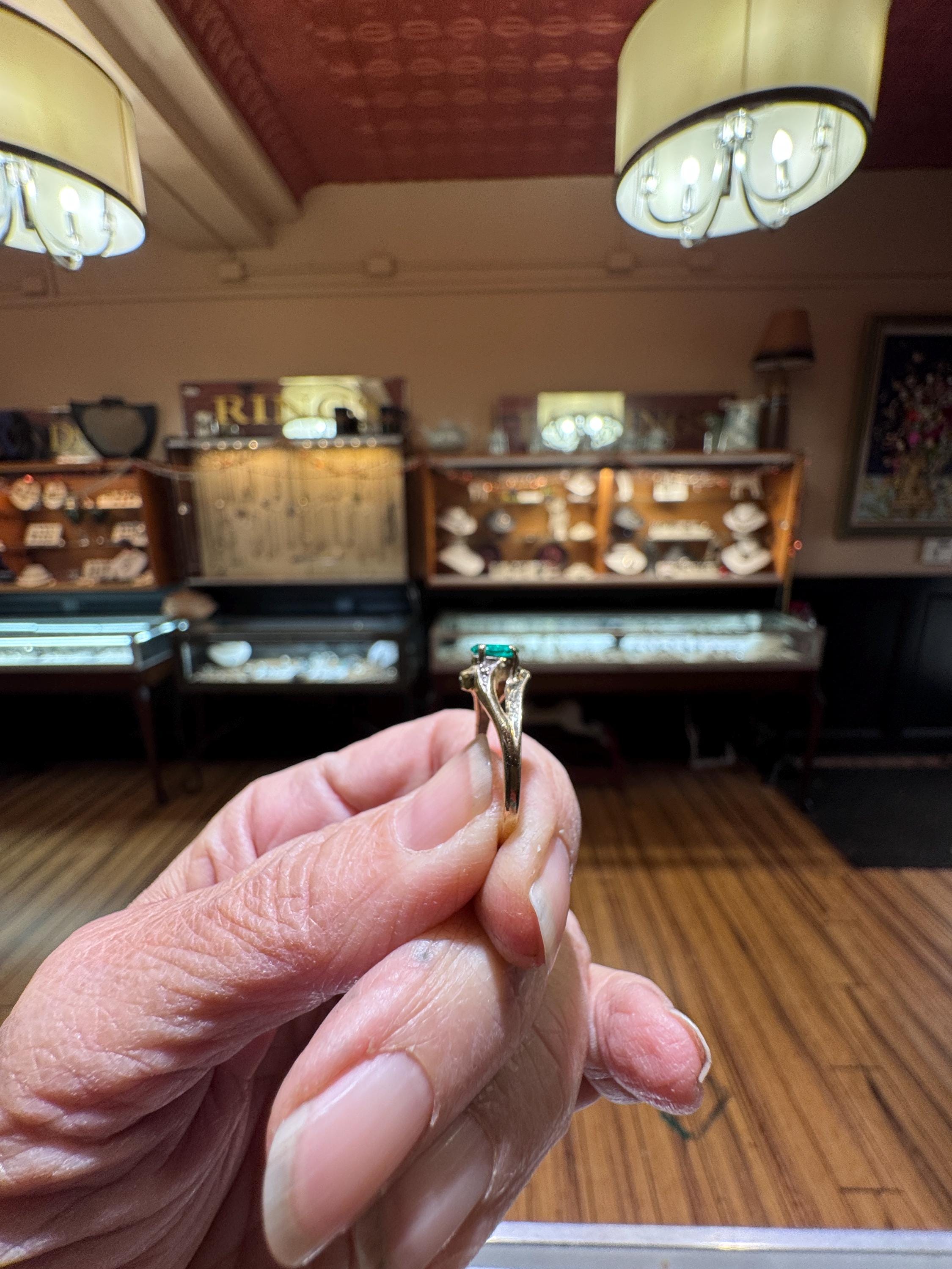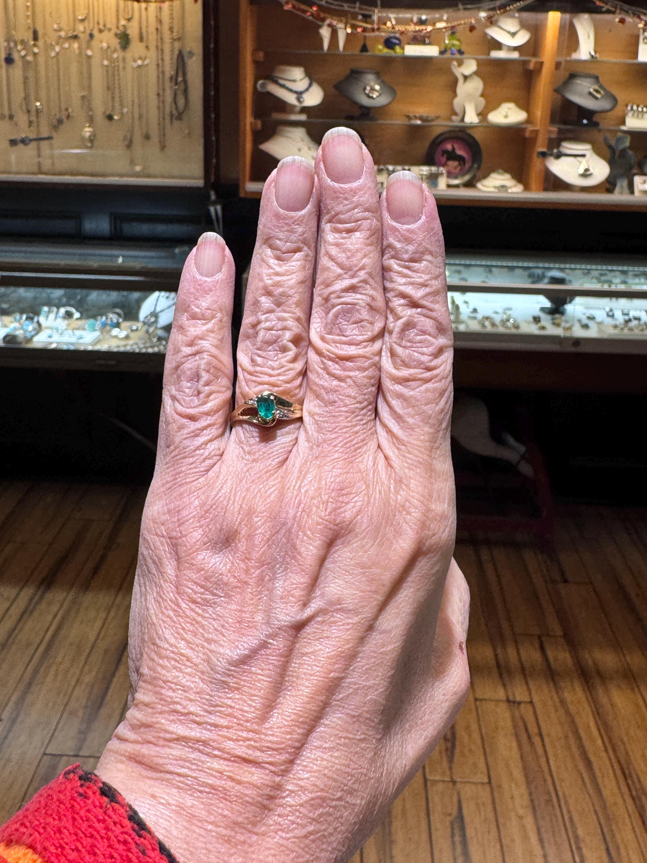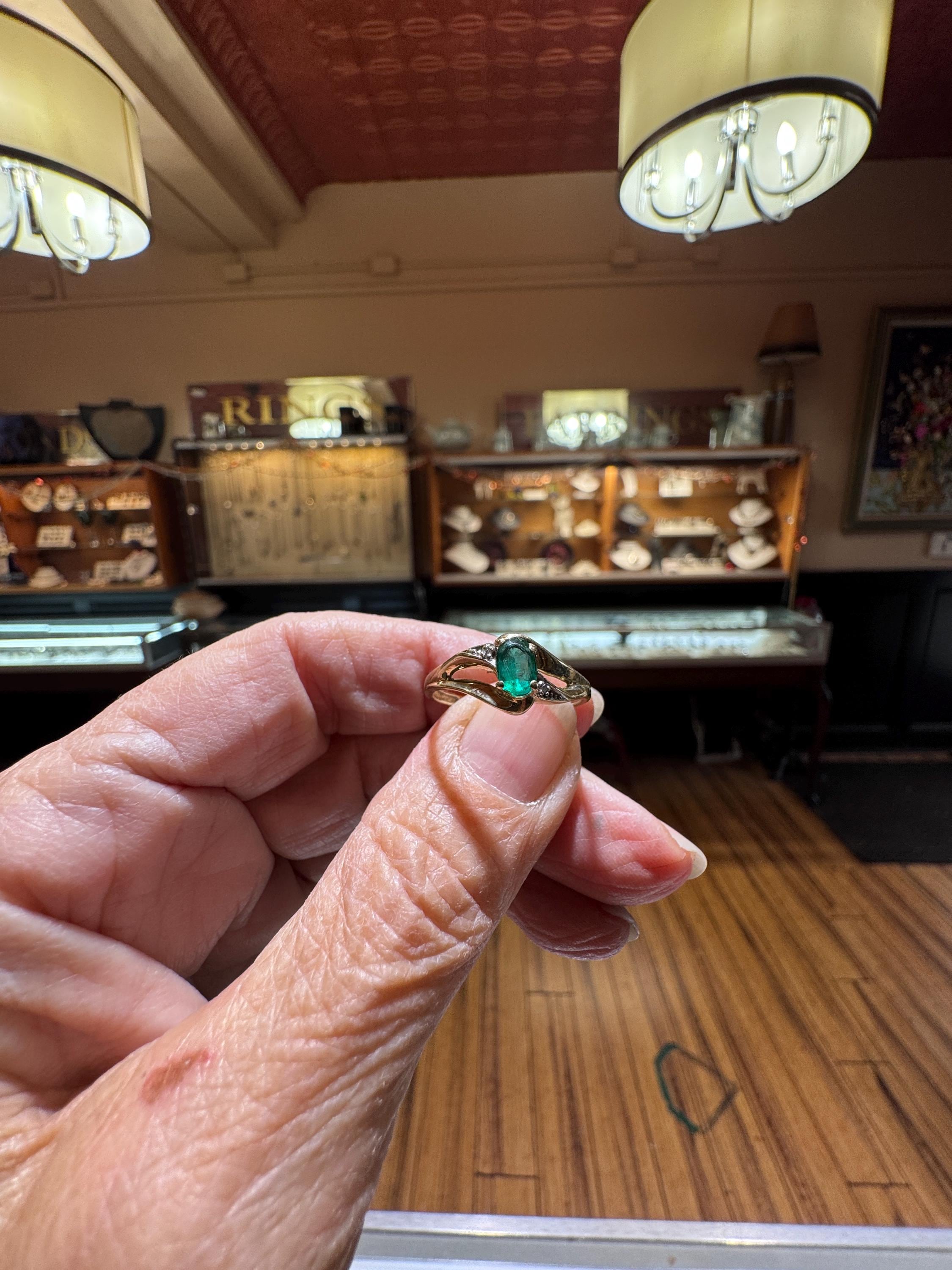 Just a cute and dainty 10K yellow gold ring featuring a 6mm x 4mm oval emerald and two 1mm diamonds. A perfect gift for that May girlie! Currently a size 7.25 we will size this ring up to a size 8.25 free of charge. If you need this ring to be larger than a size 7.25 please contact us before ordering.