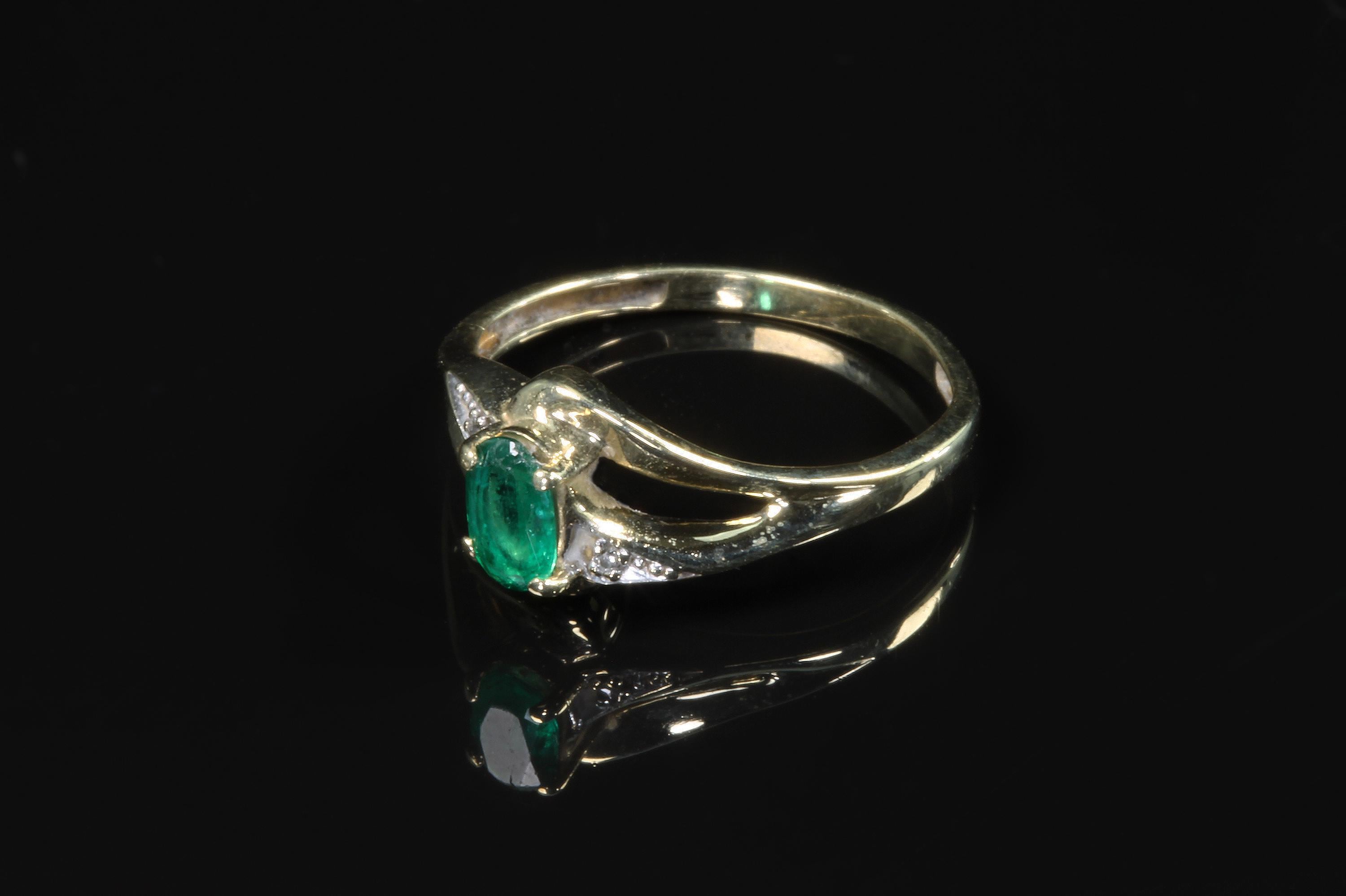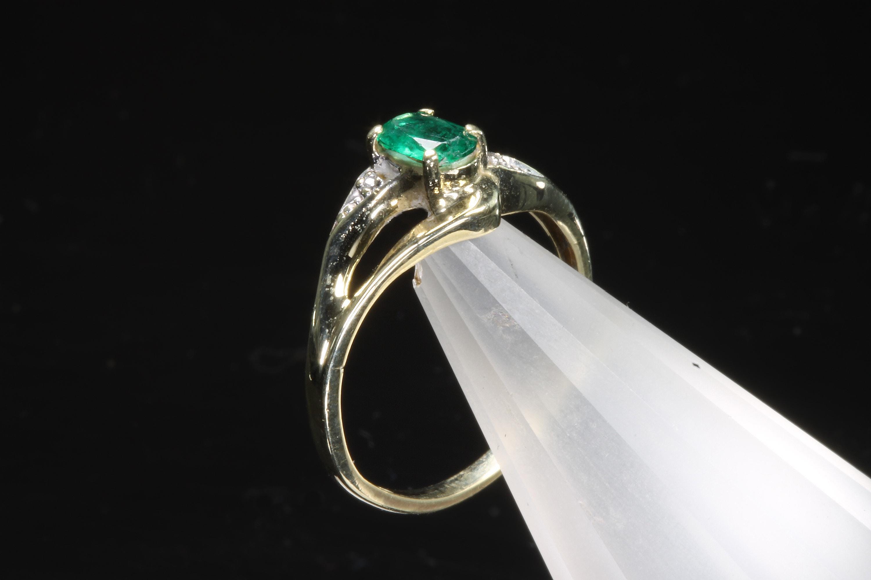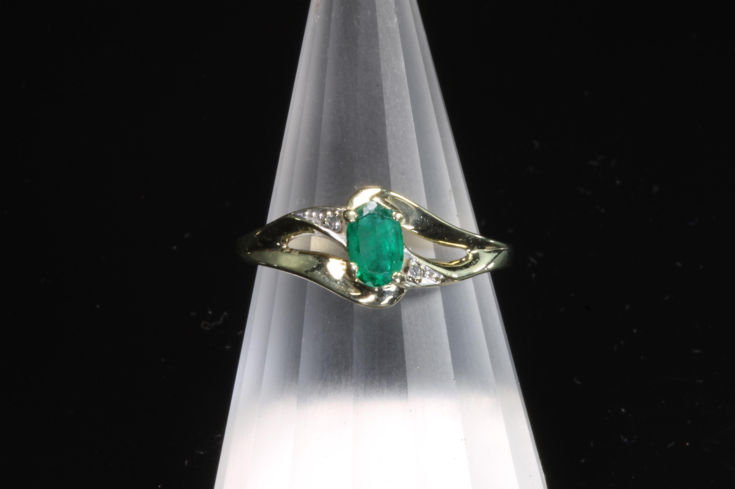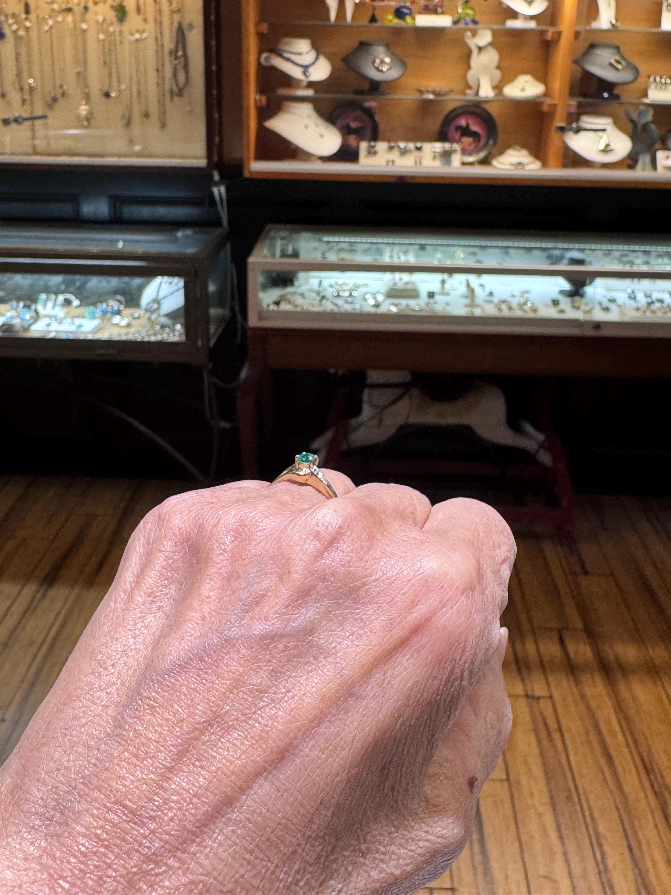 Just a cute and dainty 10K yellow gold ring featuring a 6mm x 4mm oval emerald and two 1mm diamonds. A perfect gift for that May girlie! Currently a size 7.25 we will size this ring up to a size 8.25 free of charge. If you need this ring to be larger than a size 7.25 please contact us before ordering.