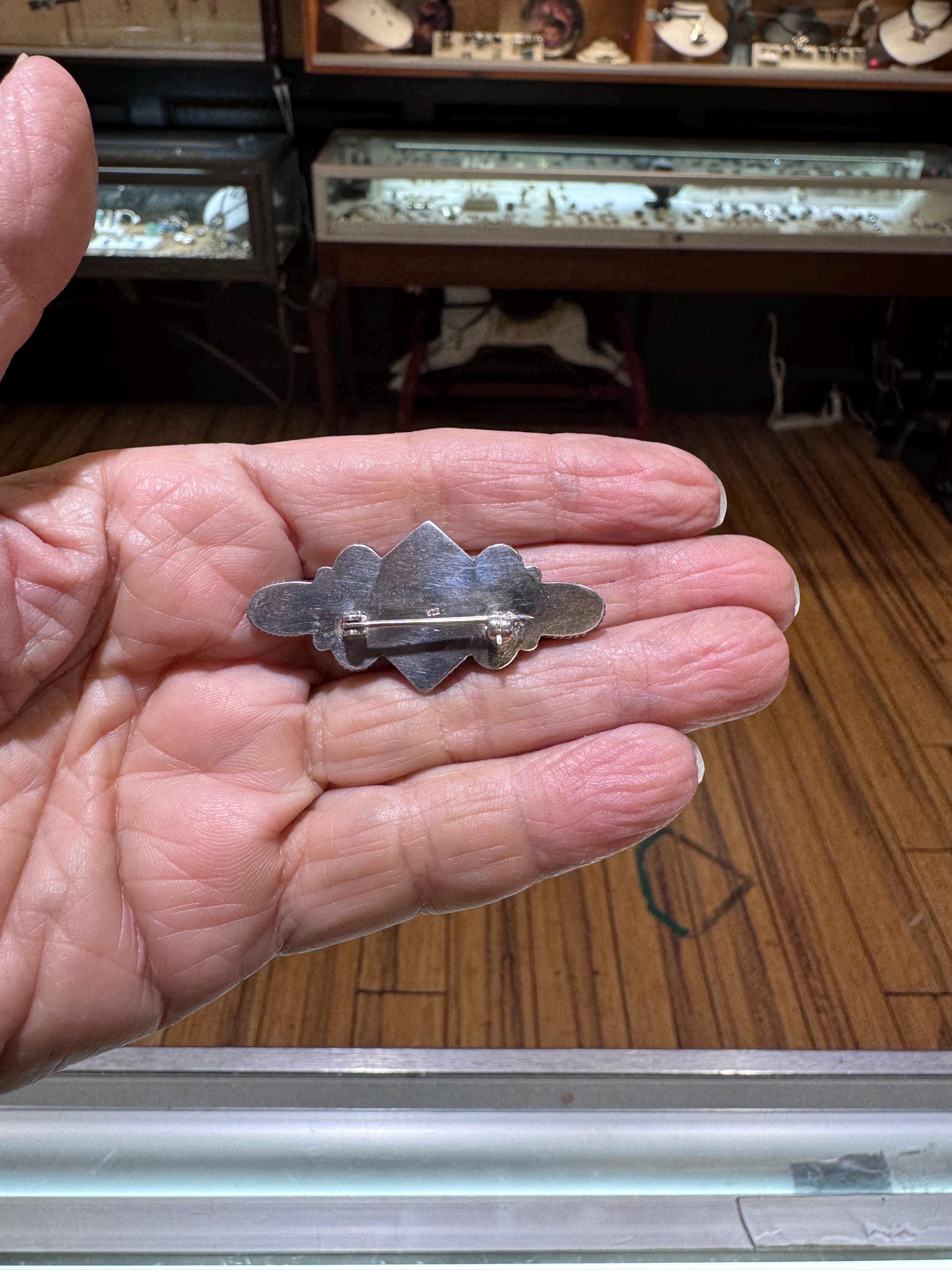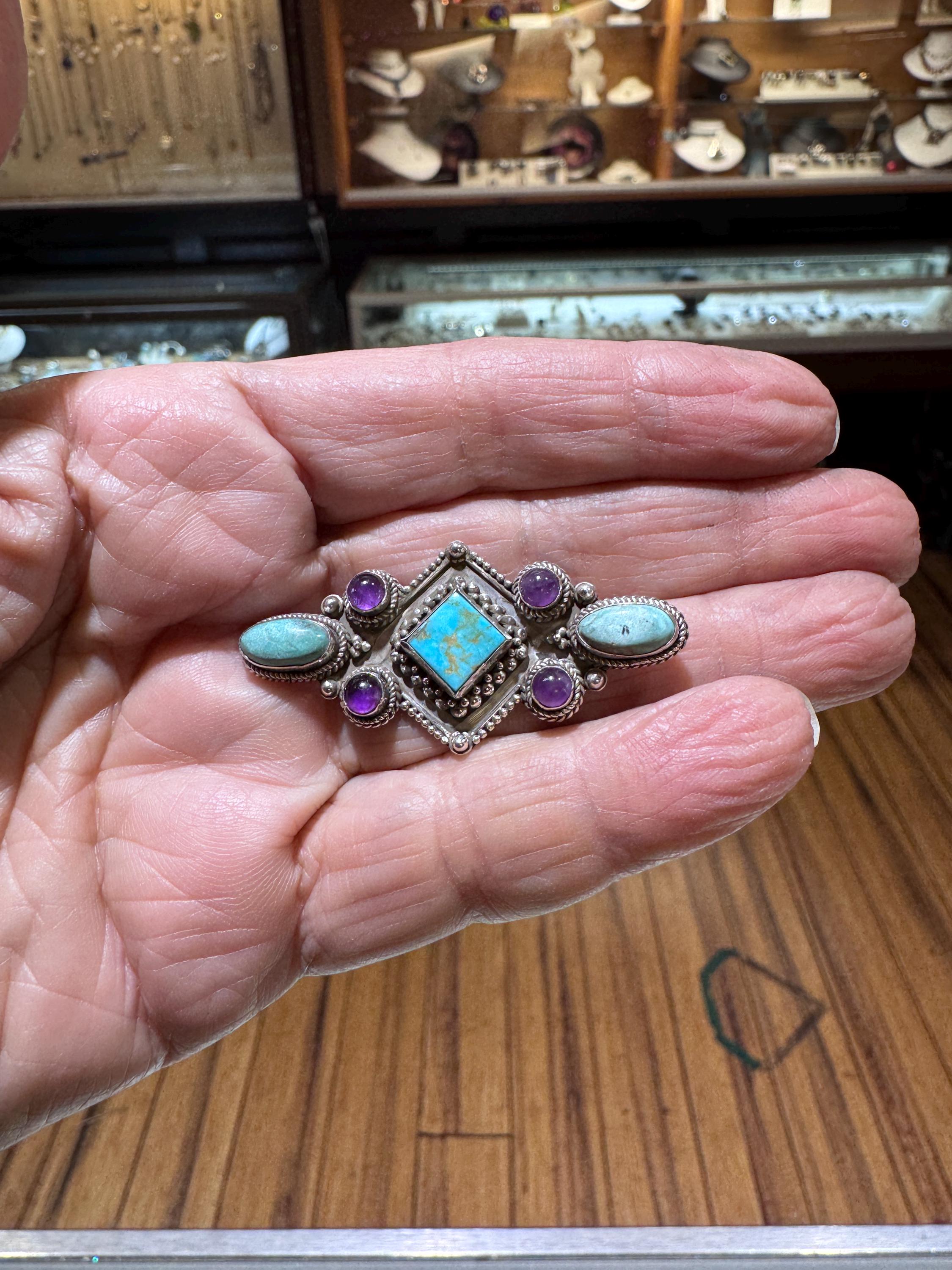 A lovely sterling silver turquoise and amethyst Indigenous/Native American southwestern style brooch.Brooch measures 1 7/8" long and 7/8" wide. This is a vintage and pre owned brooch, sold as is in great ready to wear condition.