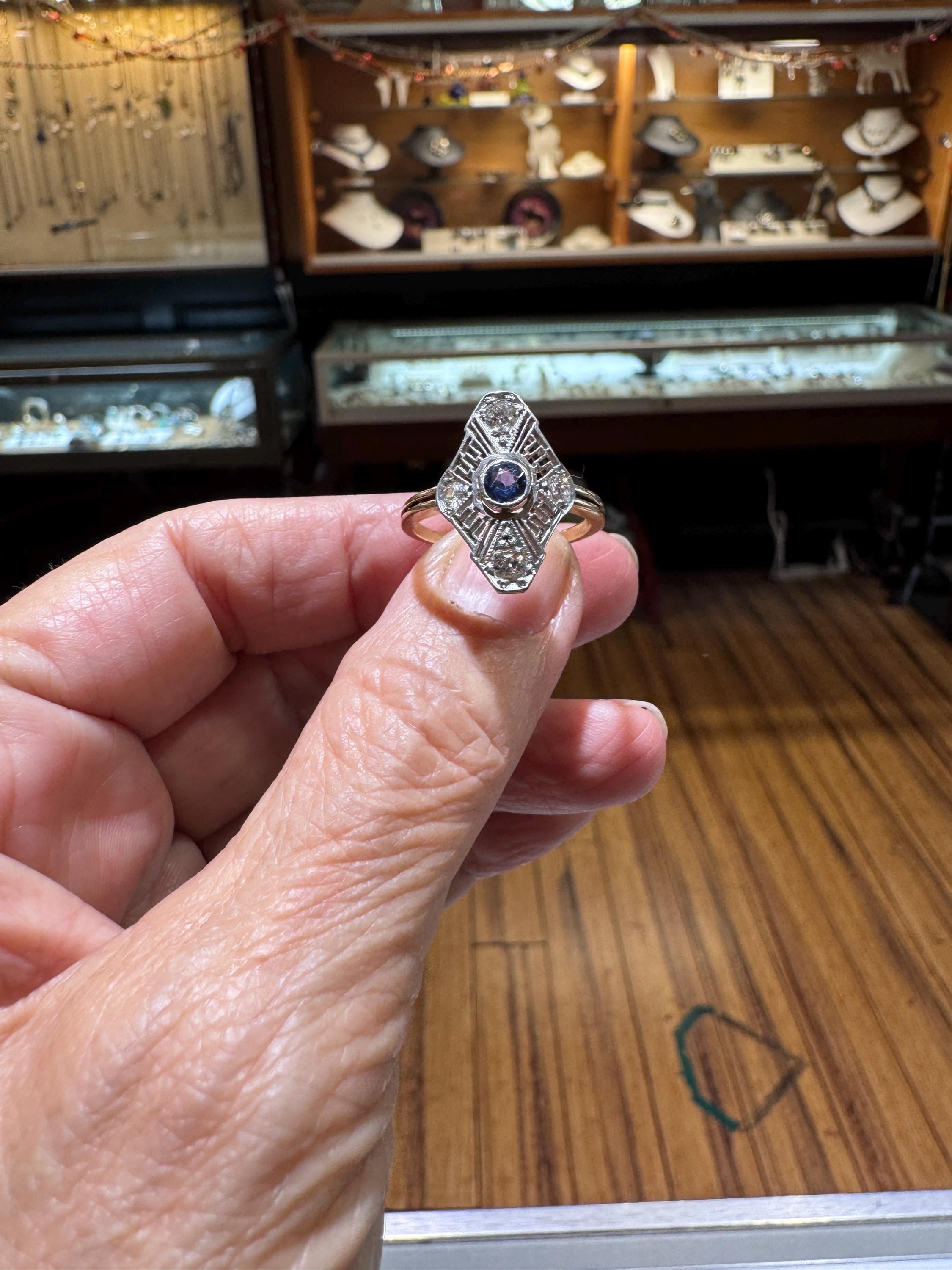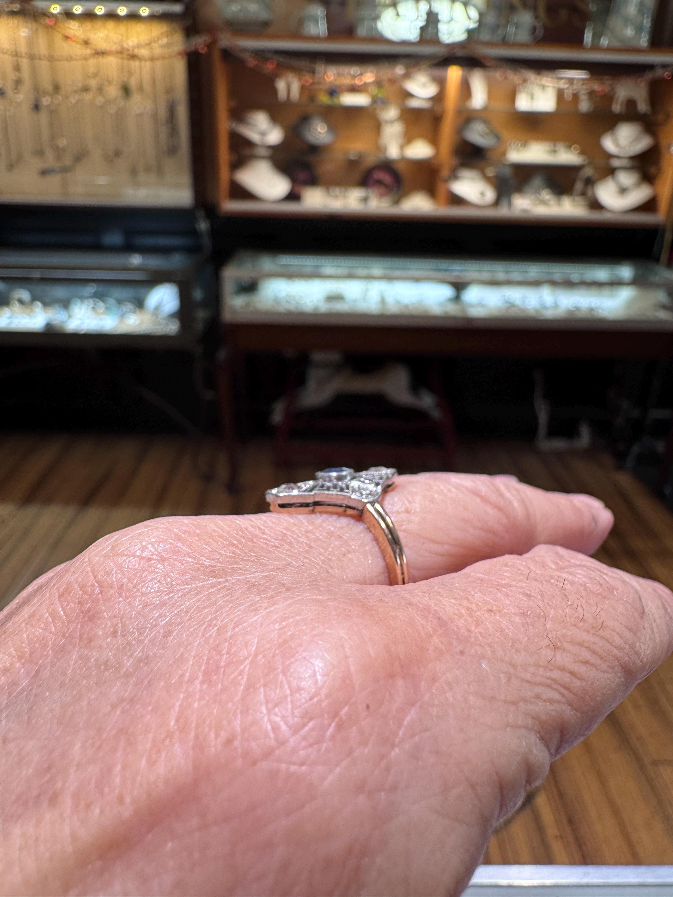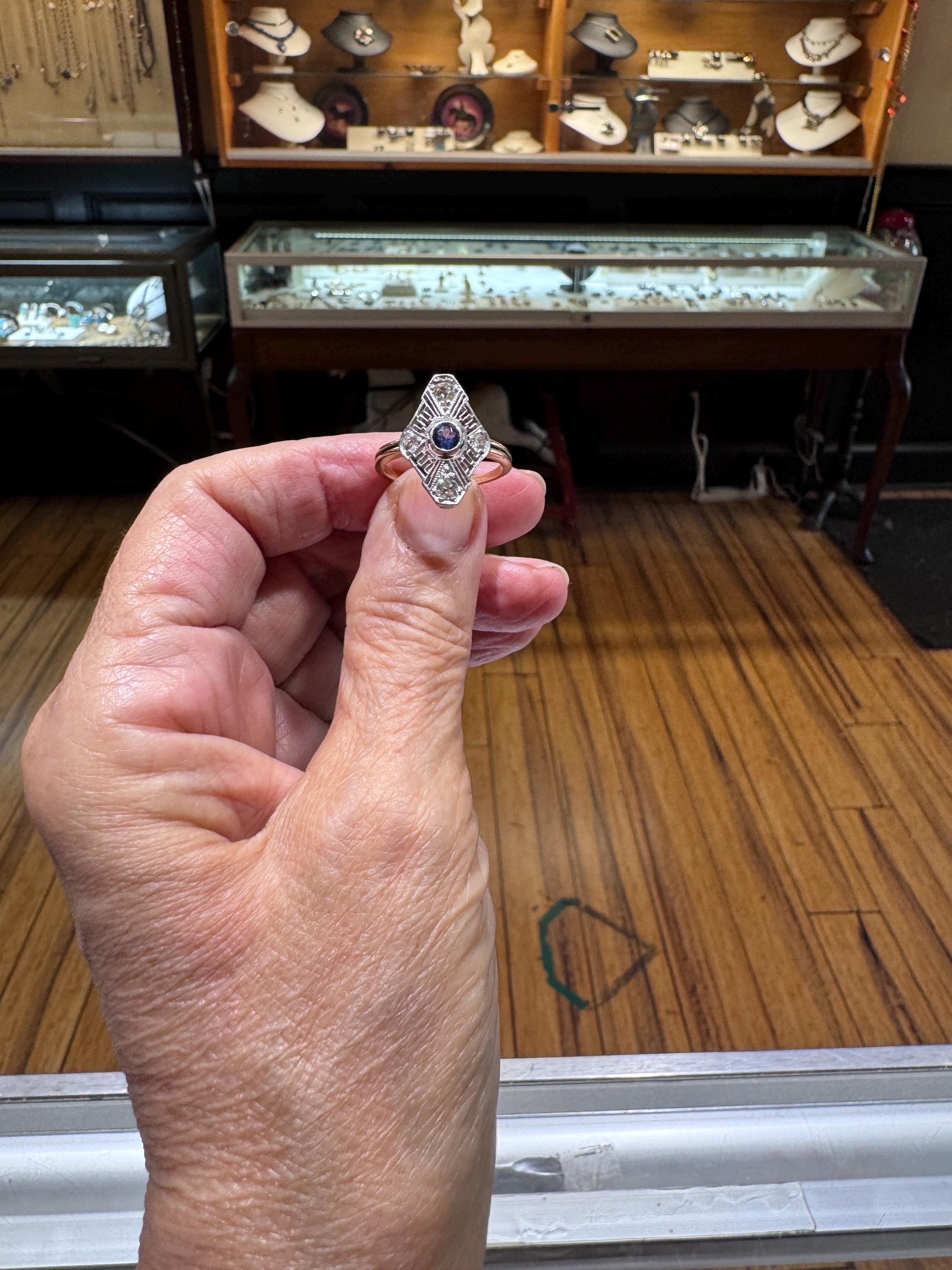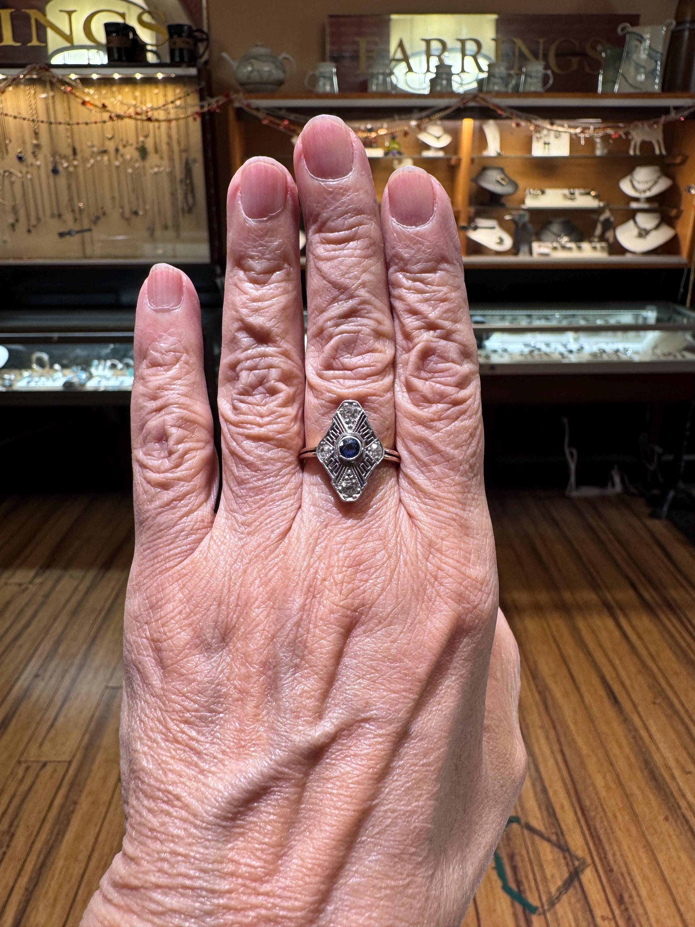 A lovely example of Art Deco style jewelry! This is a two tone 14K gold ring featuring a 4mm round sapphire with four eye clean 3mm round diamonds (.40 ctw). Classic! Elegant! Great gift for the September born. Thus us a vintage and pre owned ring, sold as is in great ready to wear condition. Currently a size 7.75, we will size this ring up to size 8.75 free of charge. If you would like this ring to be larger than a size 8.75 please contact us before ordering.
