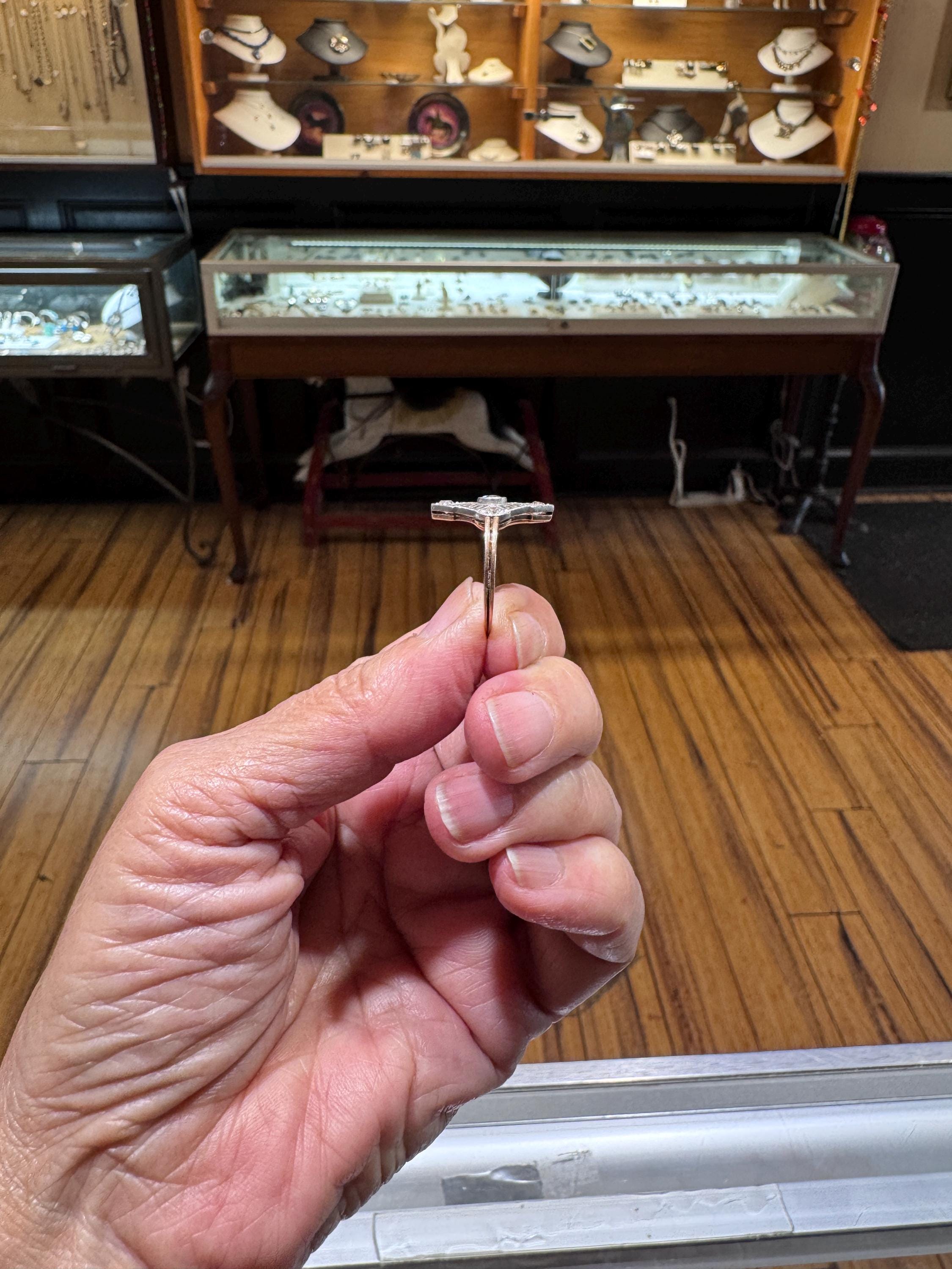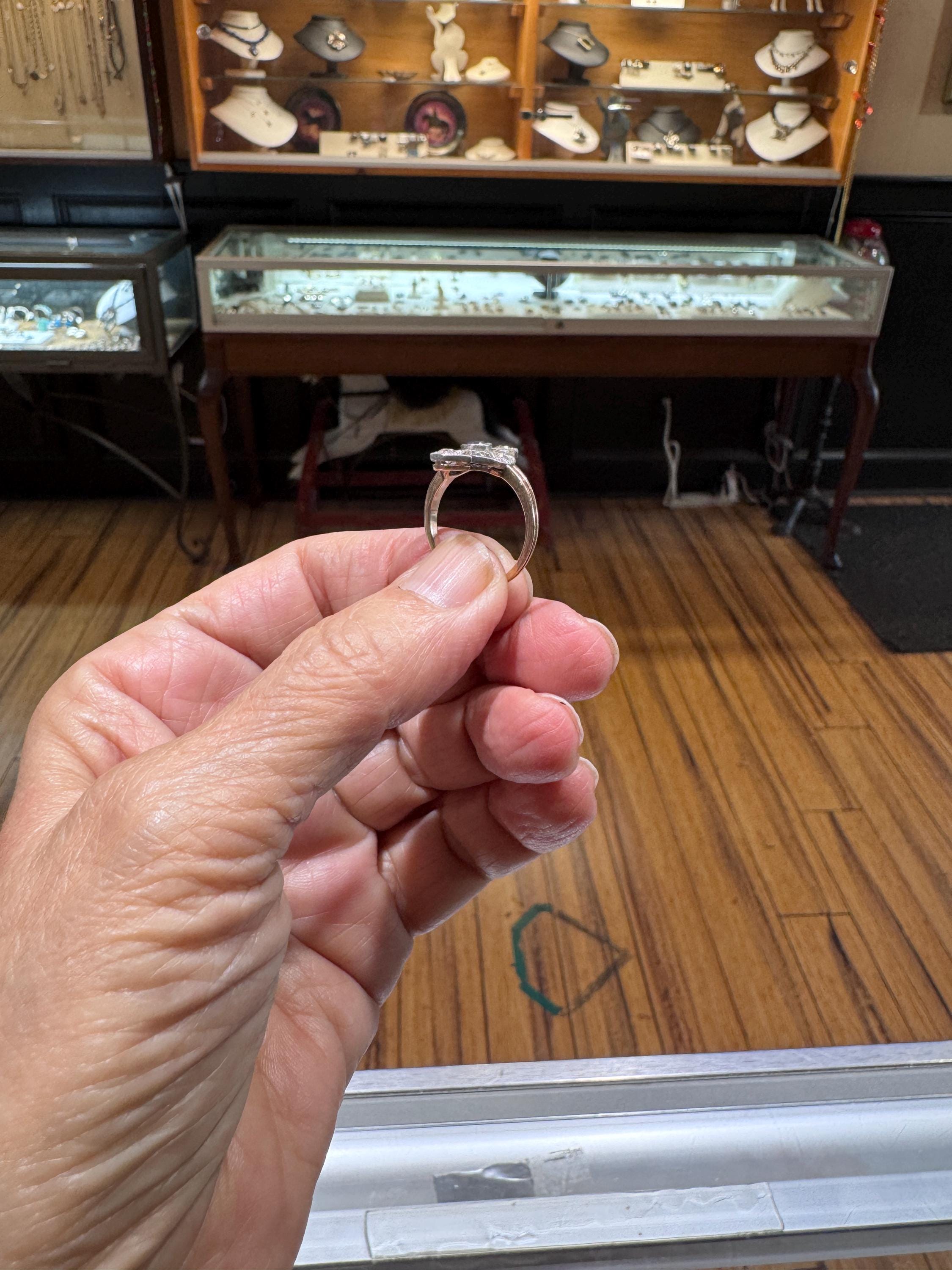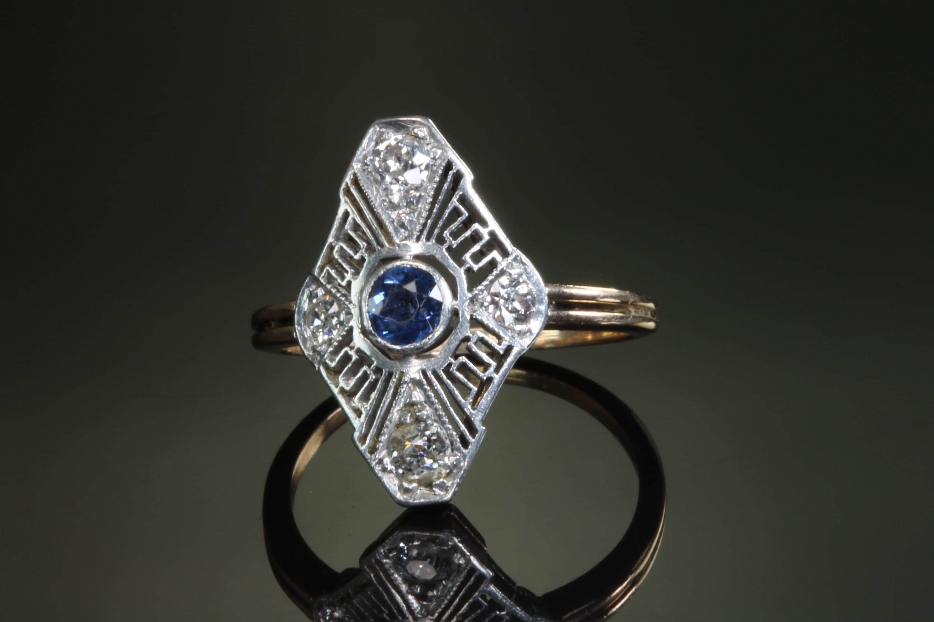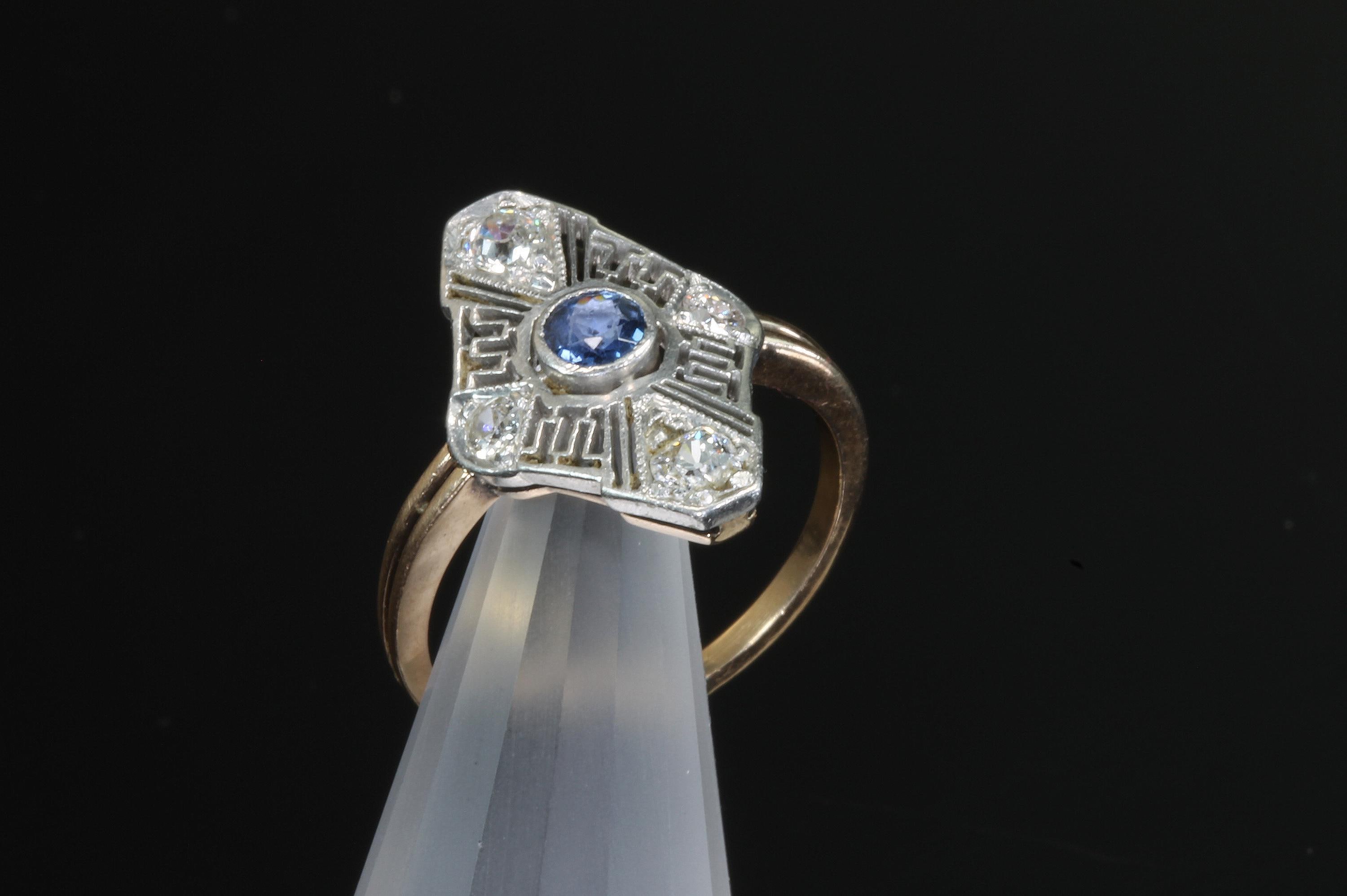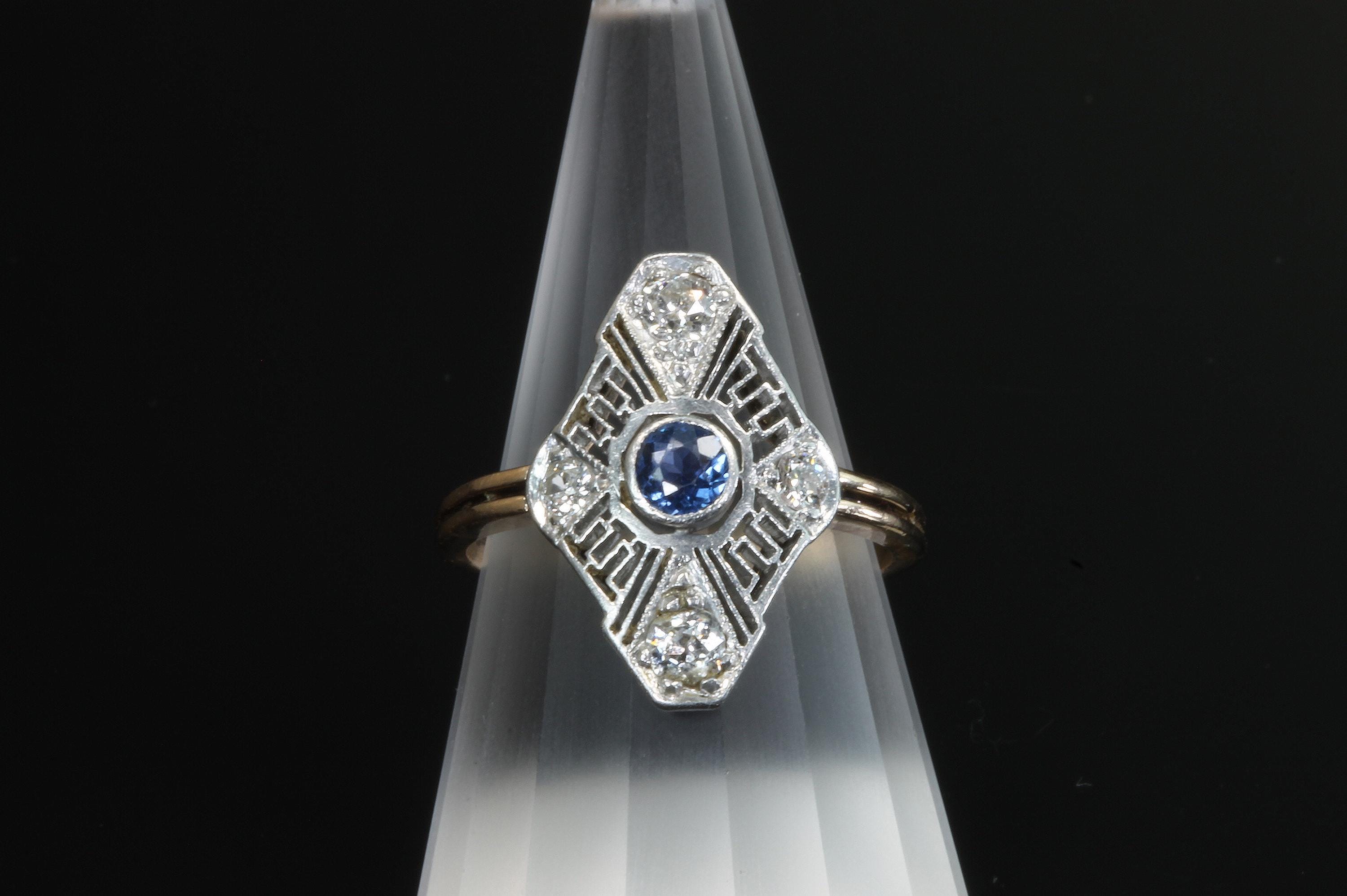 A lovely example of Art Deco style jewelry! This is a two tone 14K gold ring featuring a 4mm round sapphire with four eye clean 3mm round diamonds (.40 ctw). Classic! Elegant! Great gift for the September born. Thus us a vintage and pre owned ring, sold as is in great ready to wear condition. Currently a size 7.75, we will size this ring up to size 8.75 free of charge. If you would like this ring to be larger than a size 8.75 please contact us before ordering.
