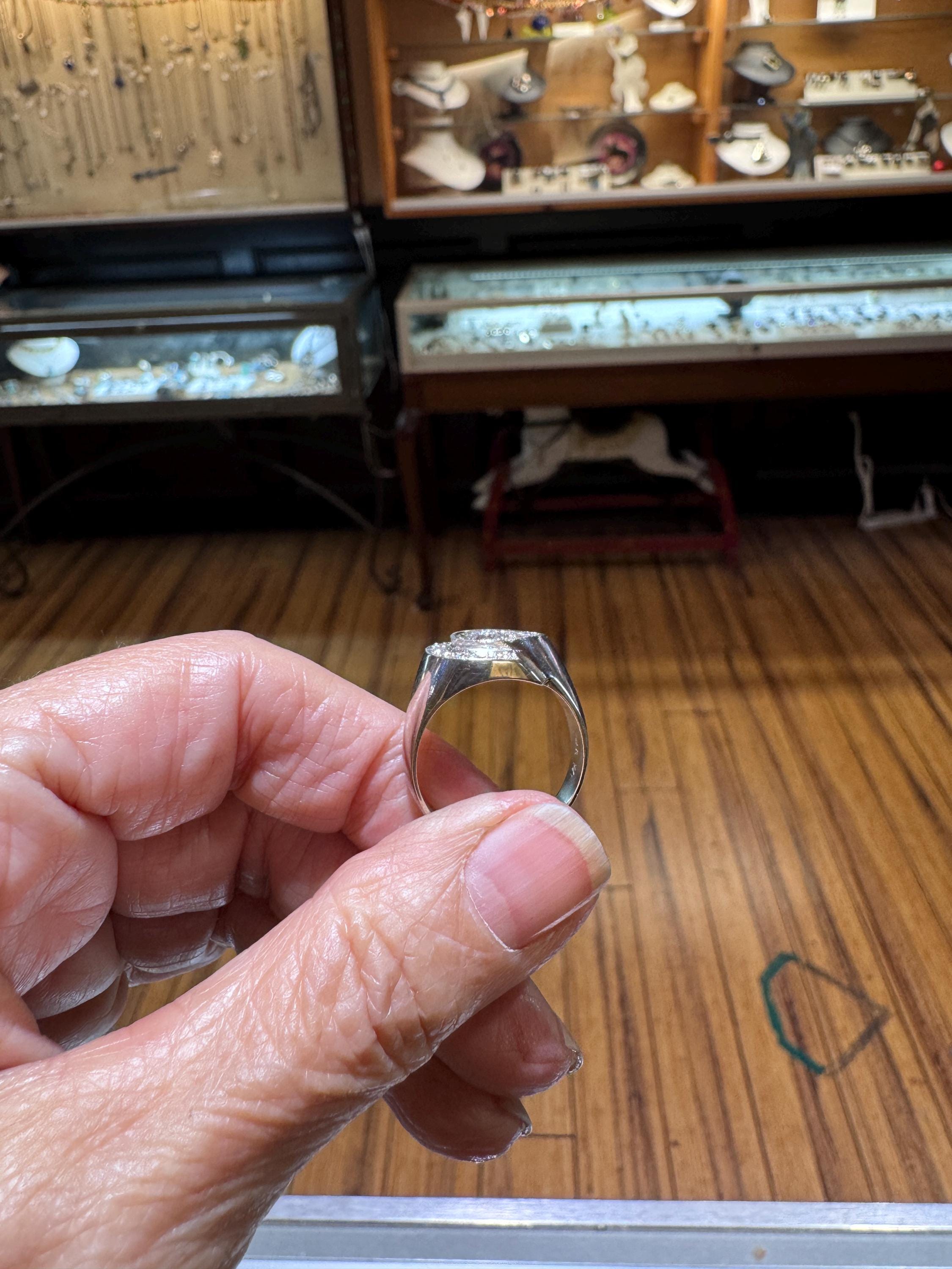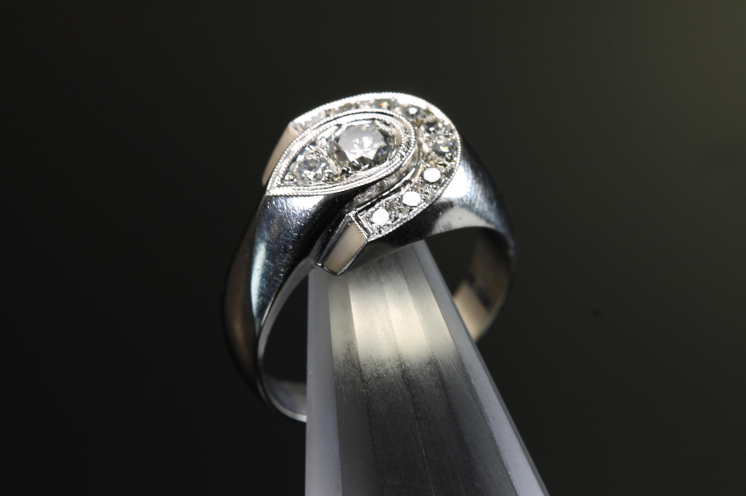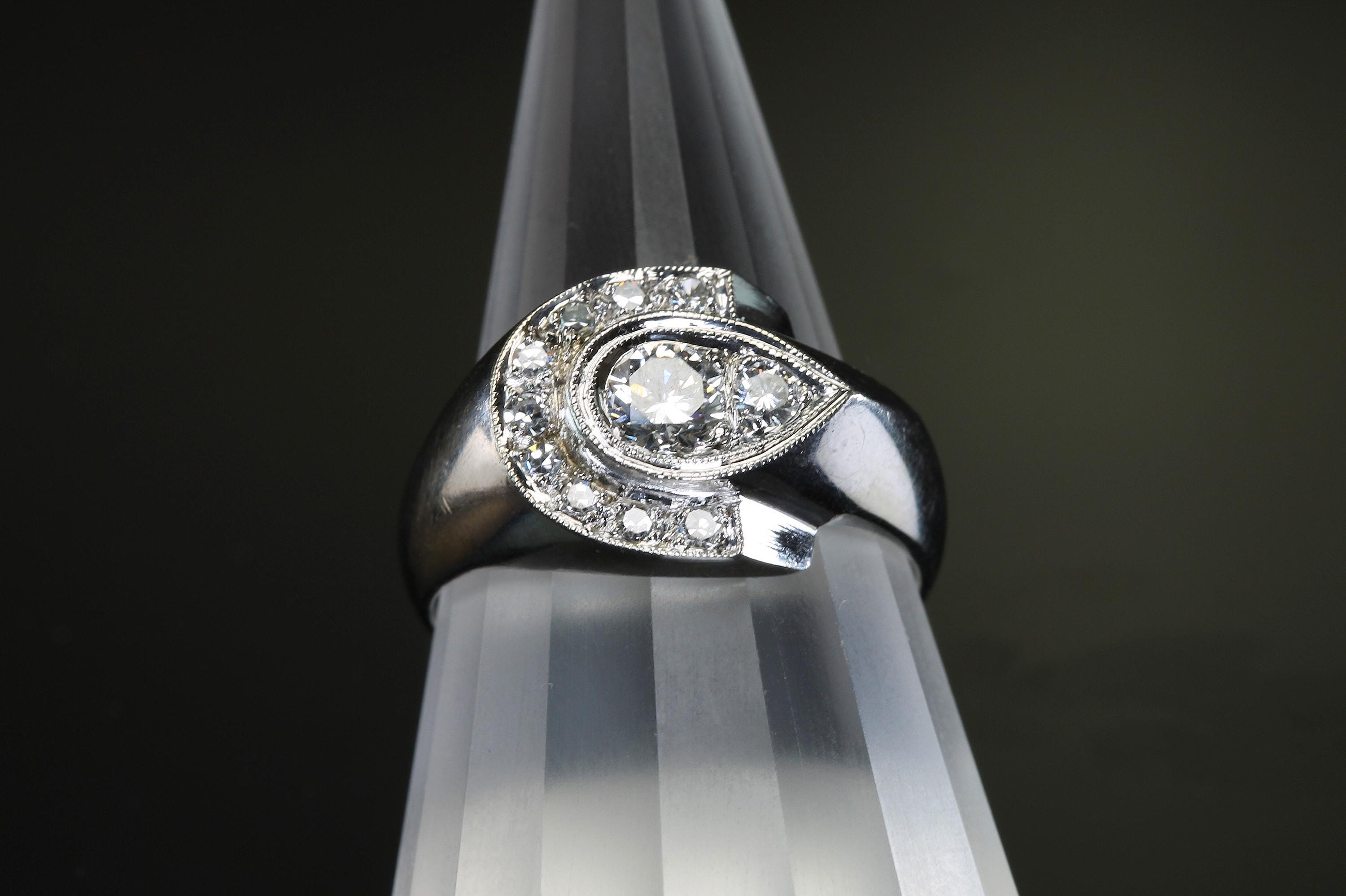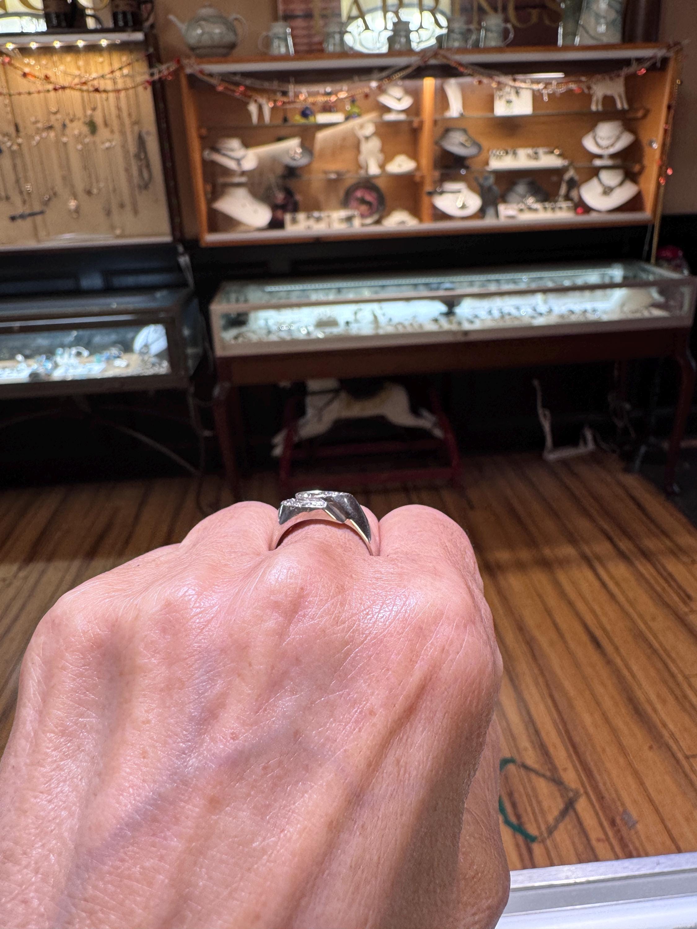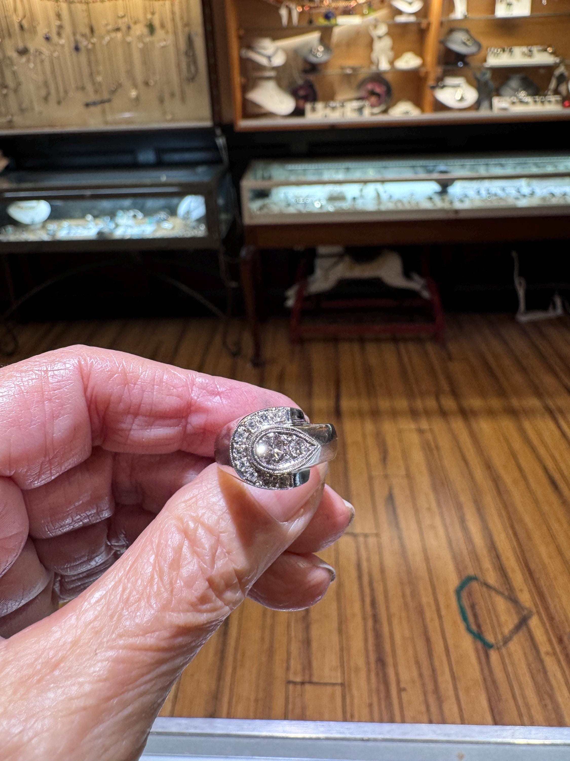 A wonderful mid century ring anyone can wear! This 14K white gold ring features .59 ctw of really eye clean, so close to colorless and well matched diamonds. (VS-SI1, G-I) A fabulous estate find! Currently a size 9 we will size this ring up to a size 10 free of charge. If you would like this ring to be larger than a size 10 please contact us before ordering.