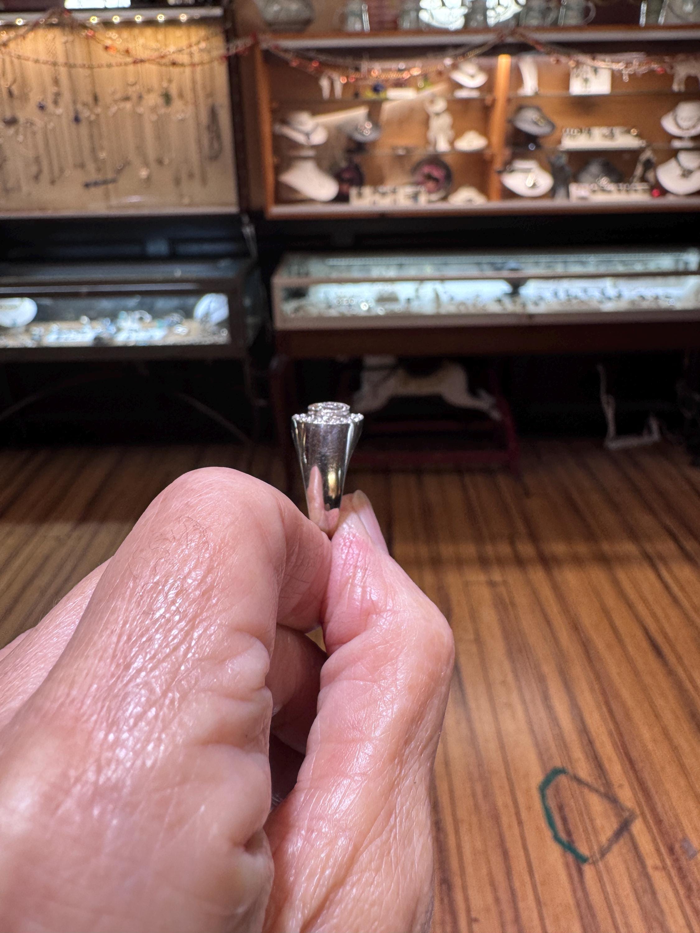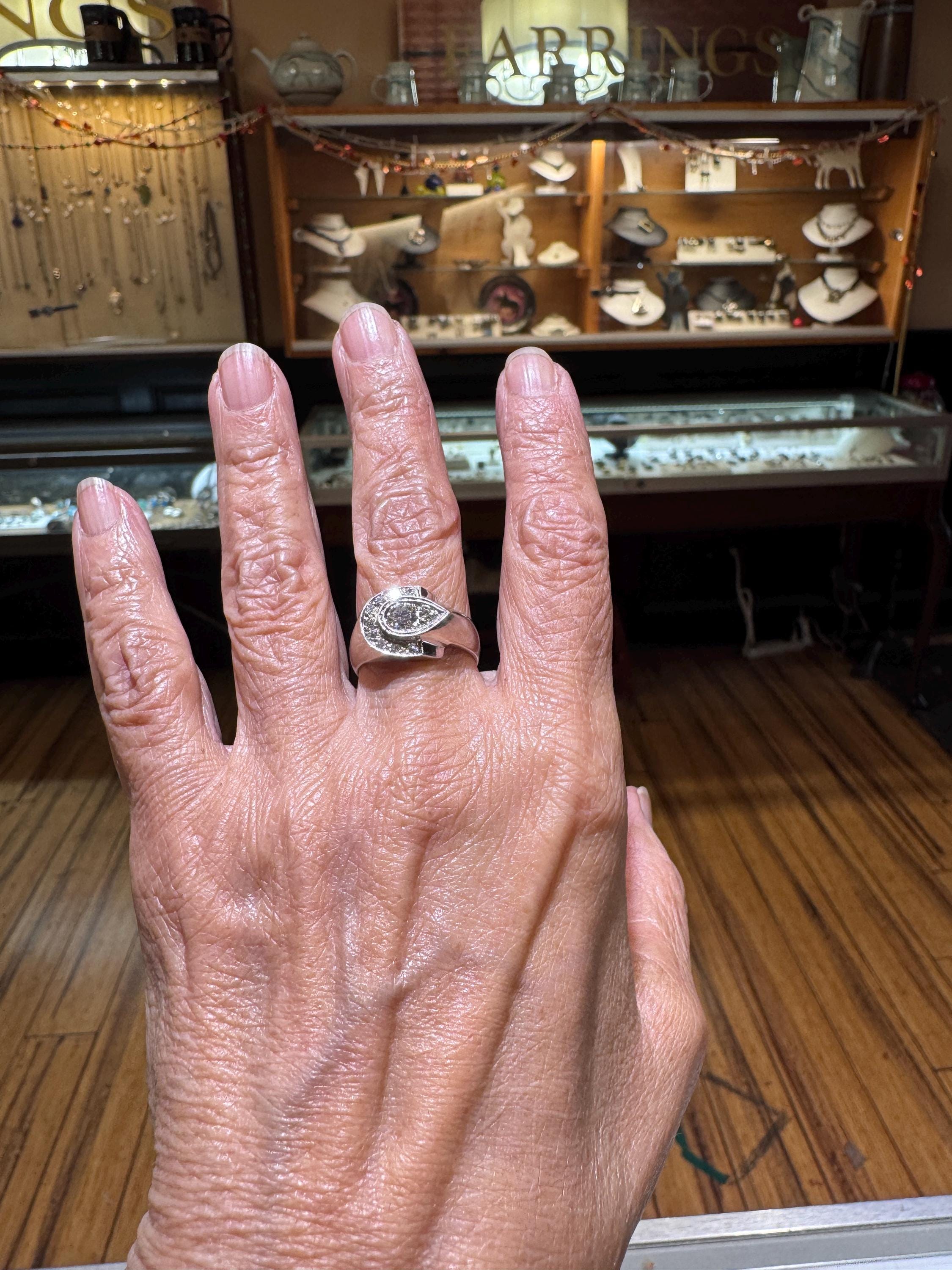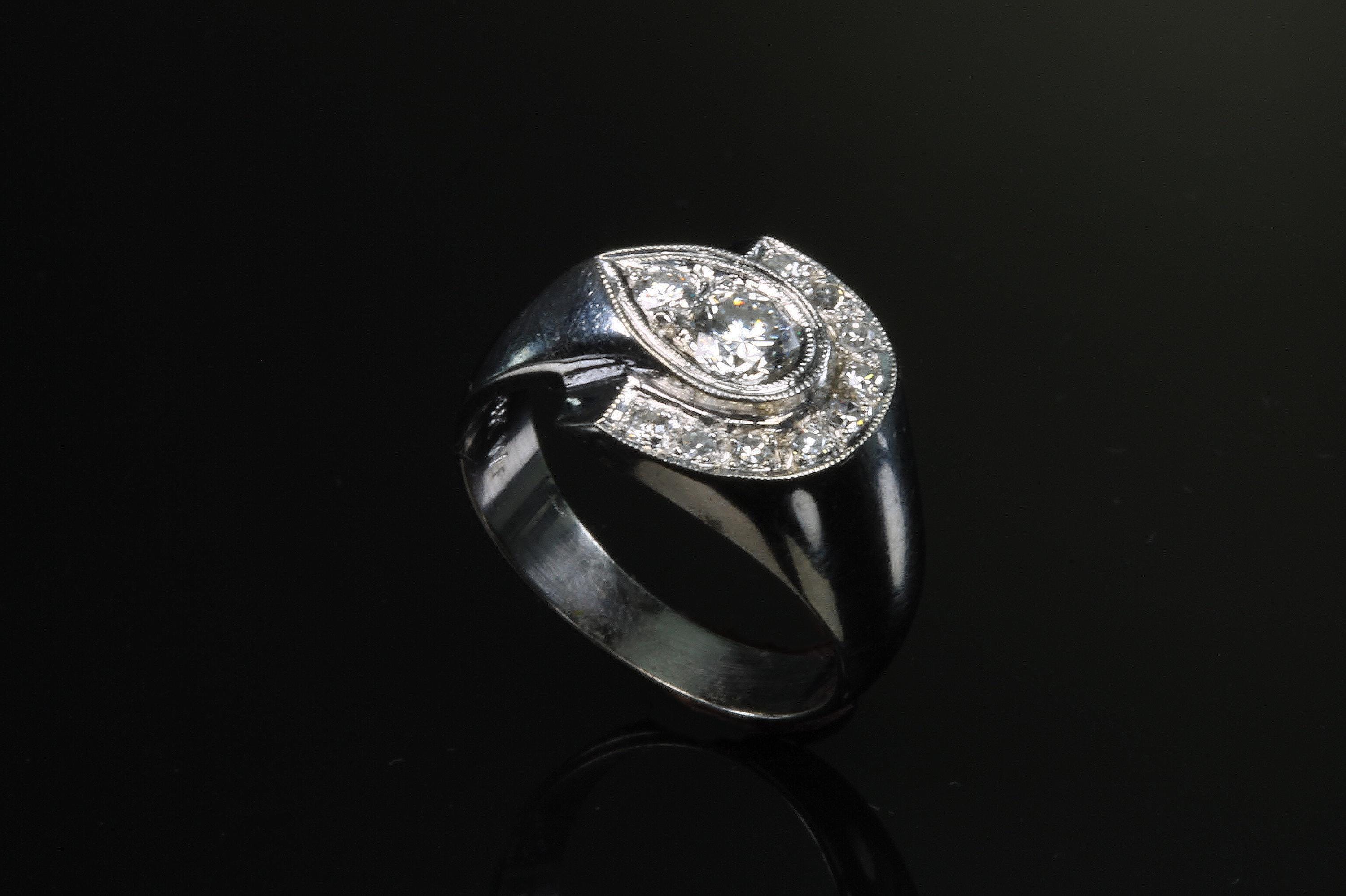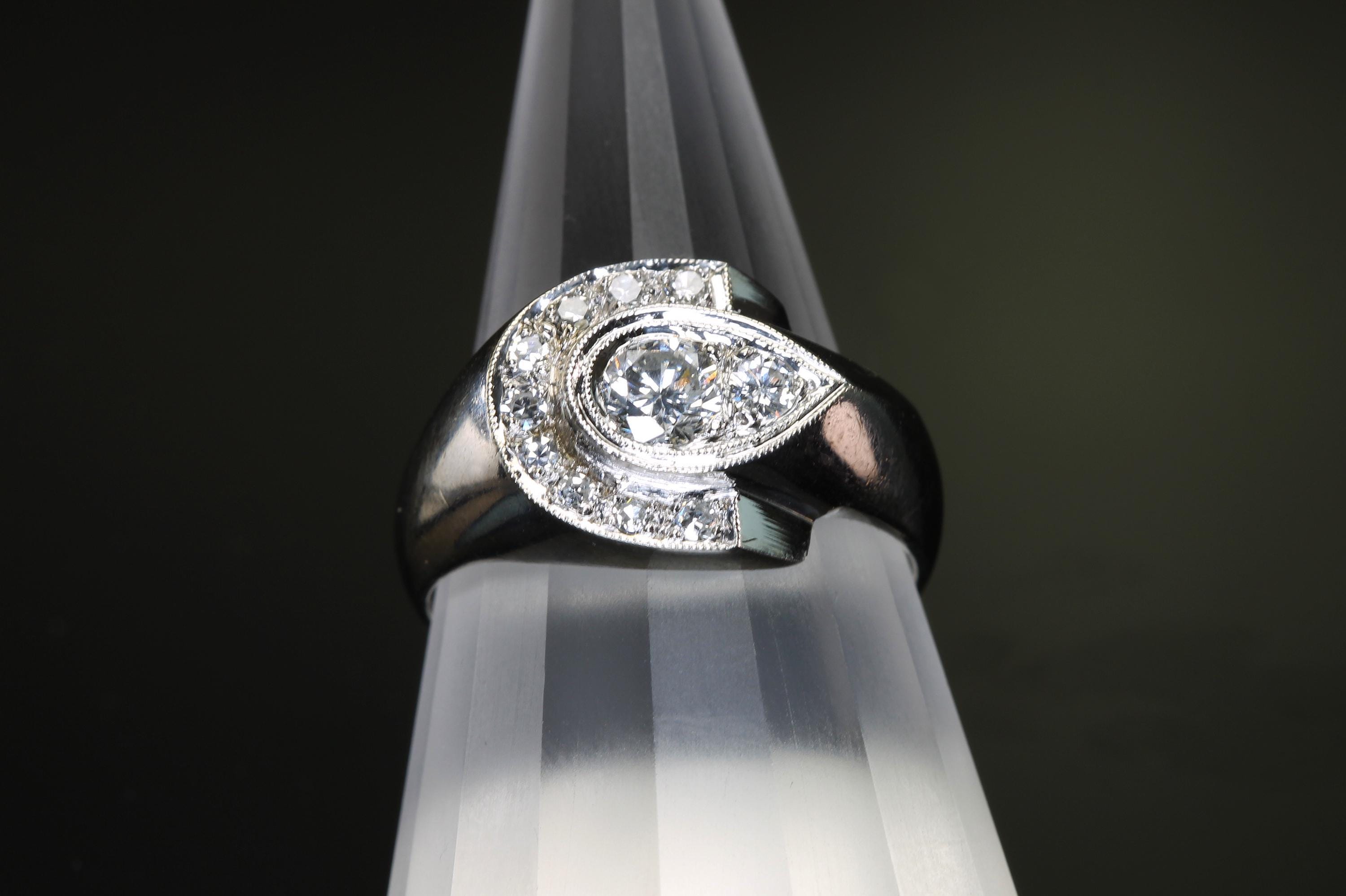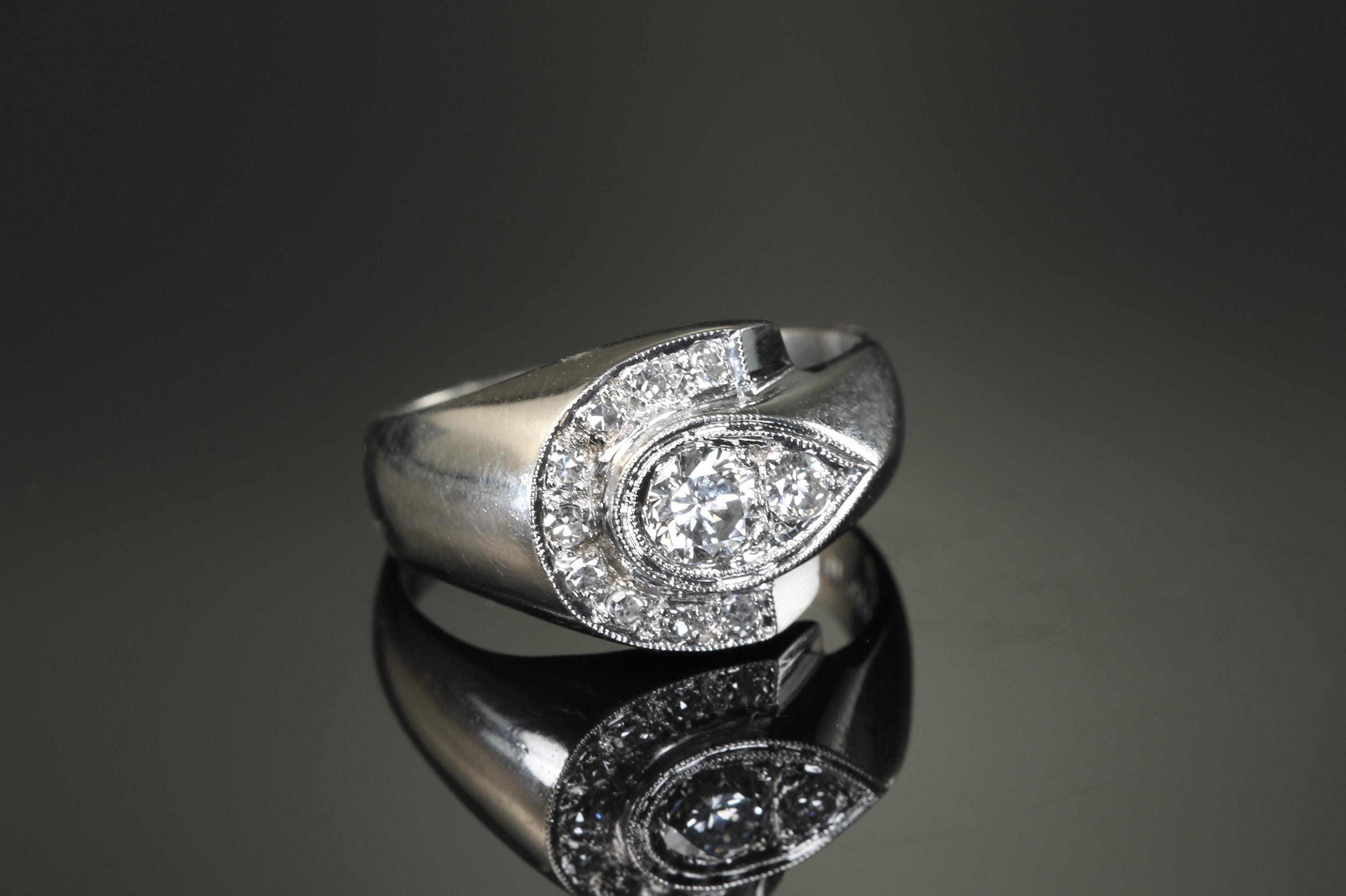 A wonderful mid century ring anyone can wear! This 14K white gold ring features .59 ctw of really eye clean, so close to colorless and well matched diamonds. (VS-SI1, G-I) A fabulous estate find! Currently a size 9 we will size this ring up to a size 10 free of charge. If you would like this ring to be larger than a size 10 please contact us before ordering.