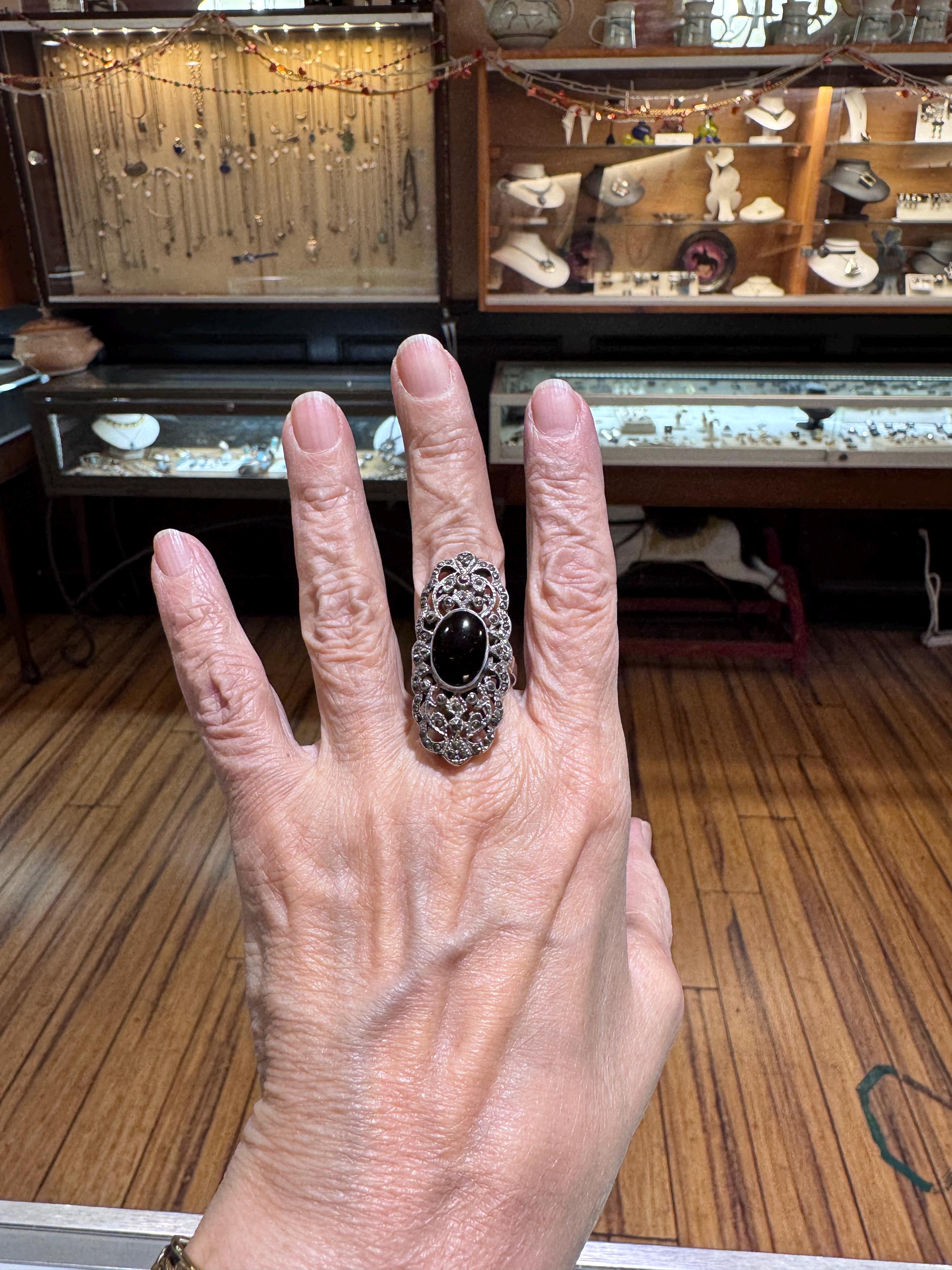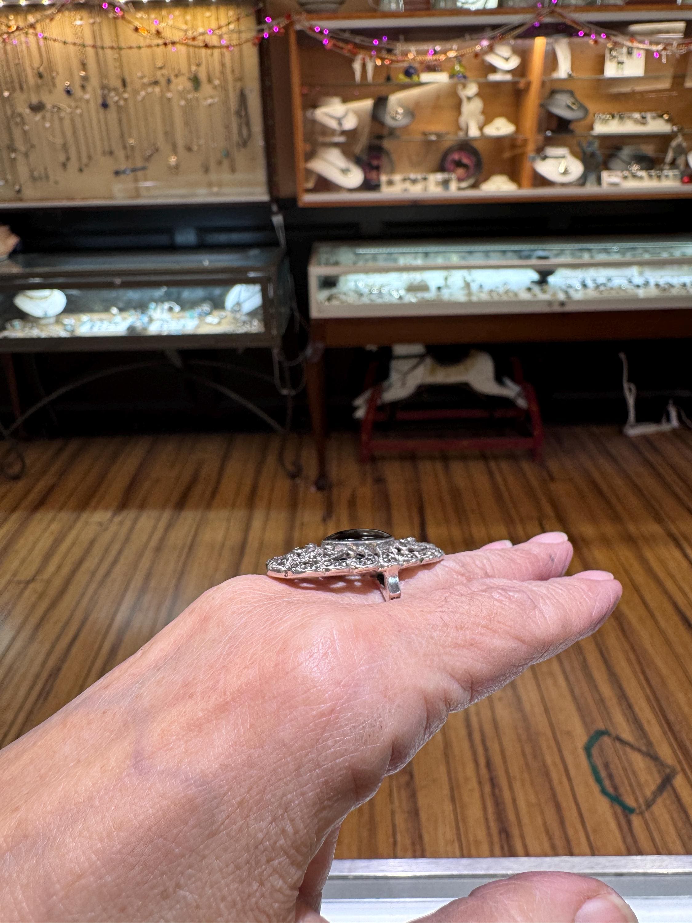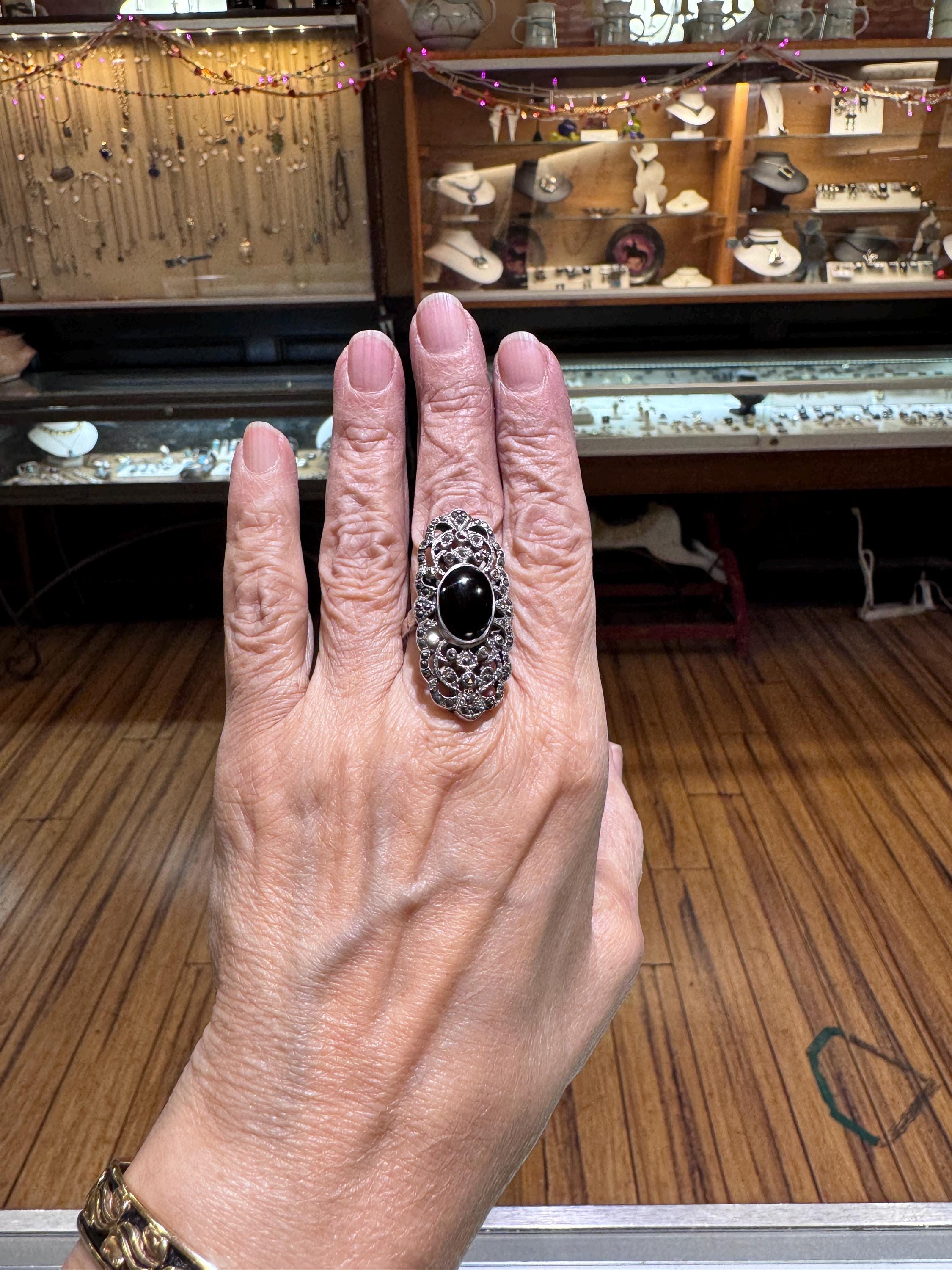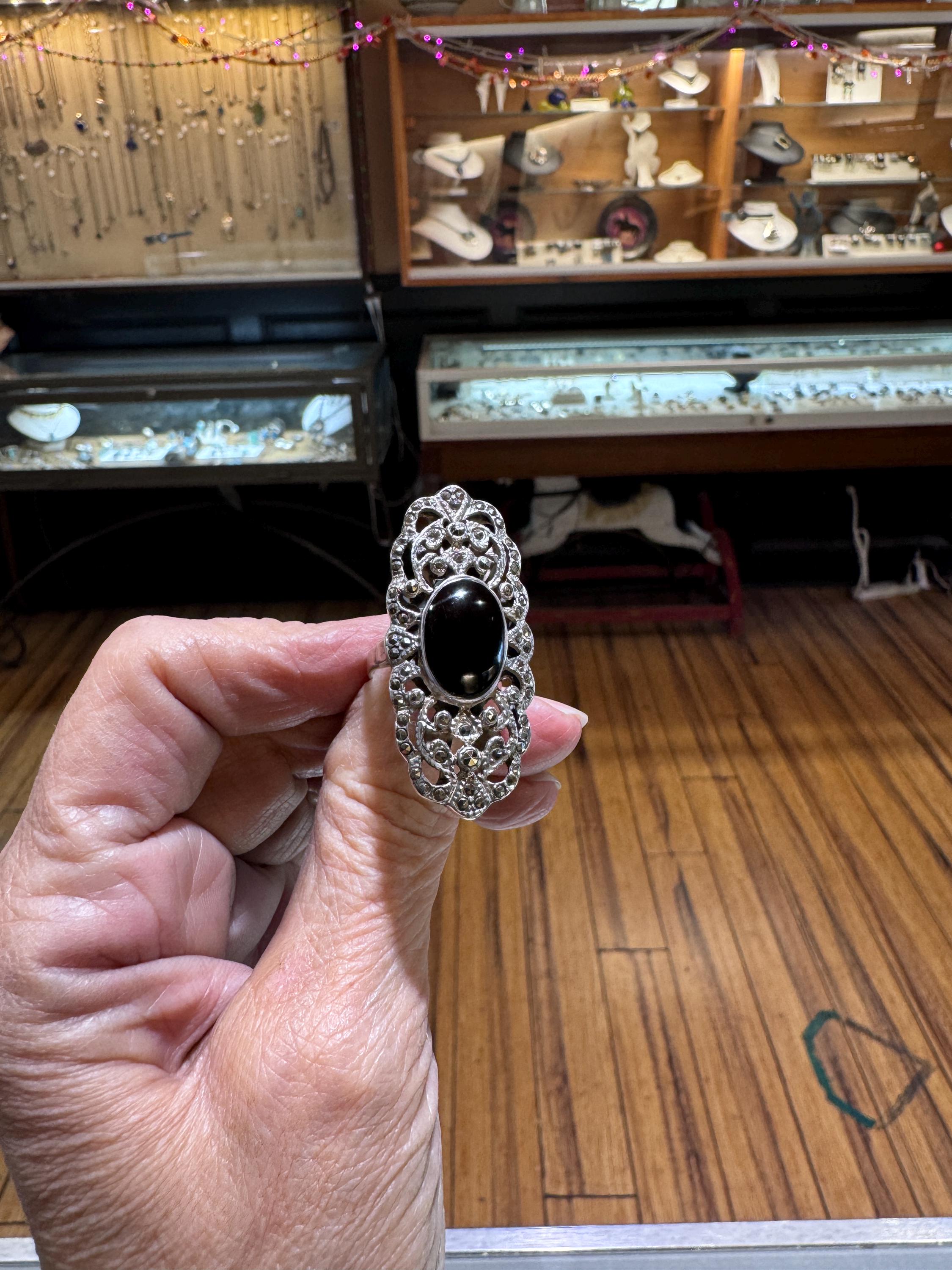 Just your average ring....NOT!! A flashy statement more like it! This is a sterling silver, sparkly marcasite and (14mm x 10mm oval) black onyx party for your hand! This is a vintage and pre owned ring, sold as is in great ready to wear condition. Currently a size 9.75 we will size this ring up to a size 10.75 free of charge. If you need this ring to be larger than a 10.75 please contact us before ordering.