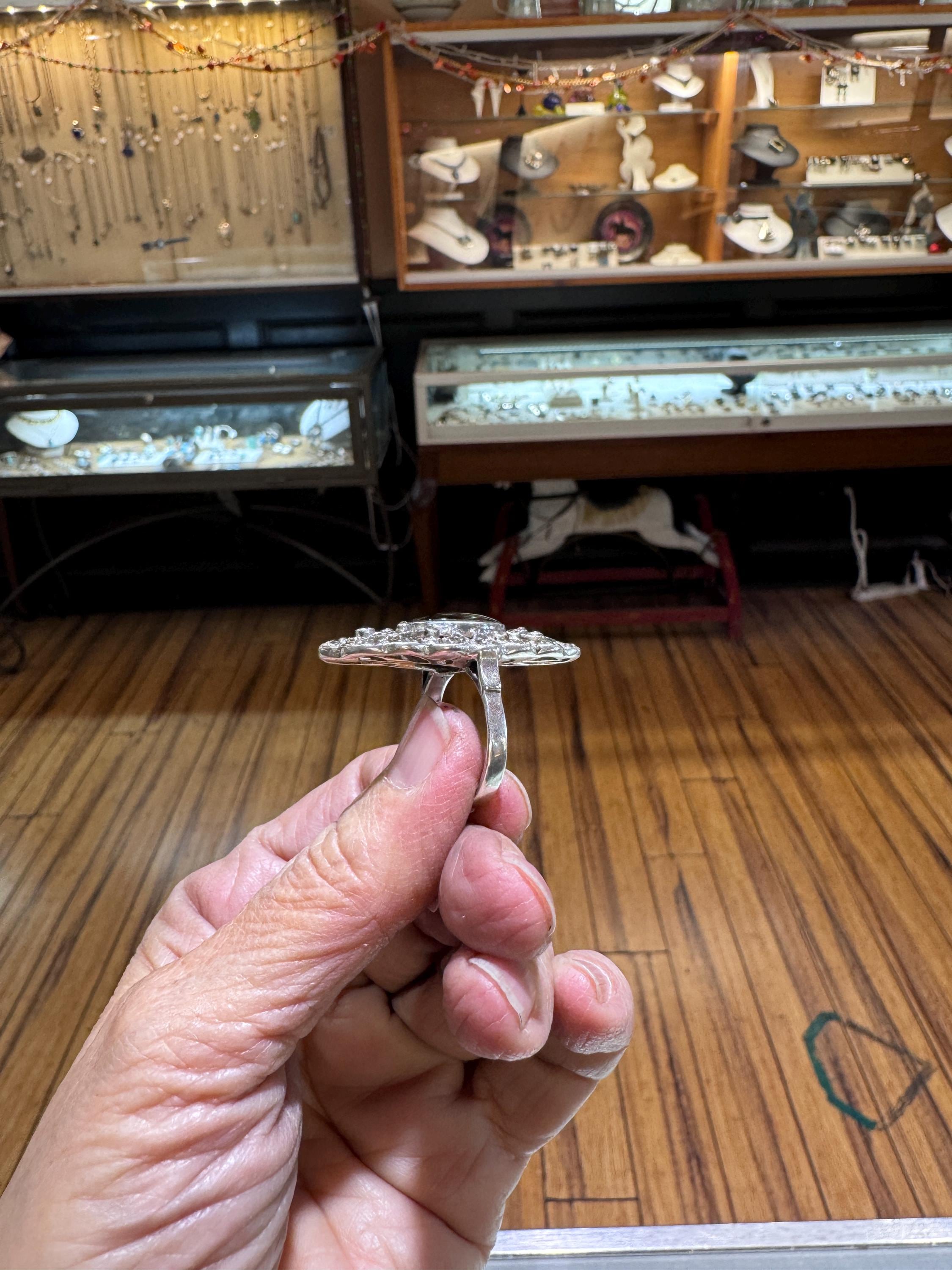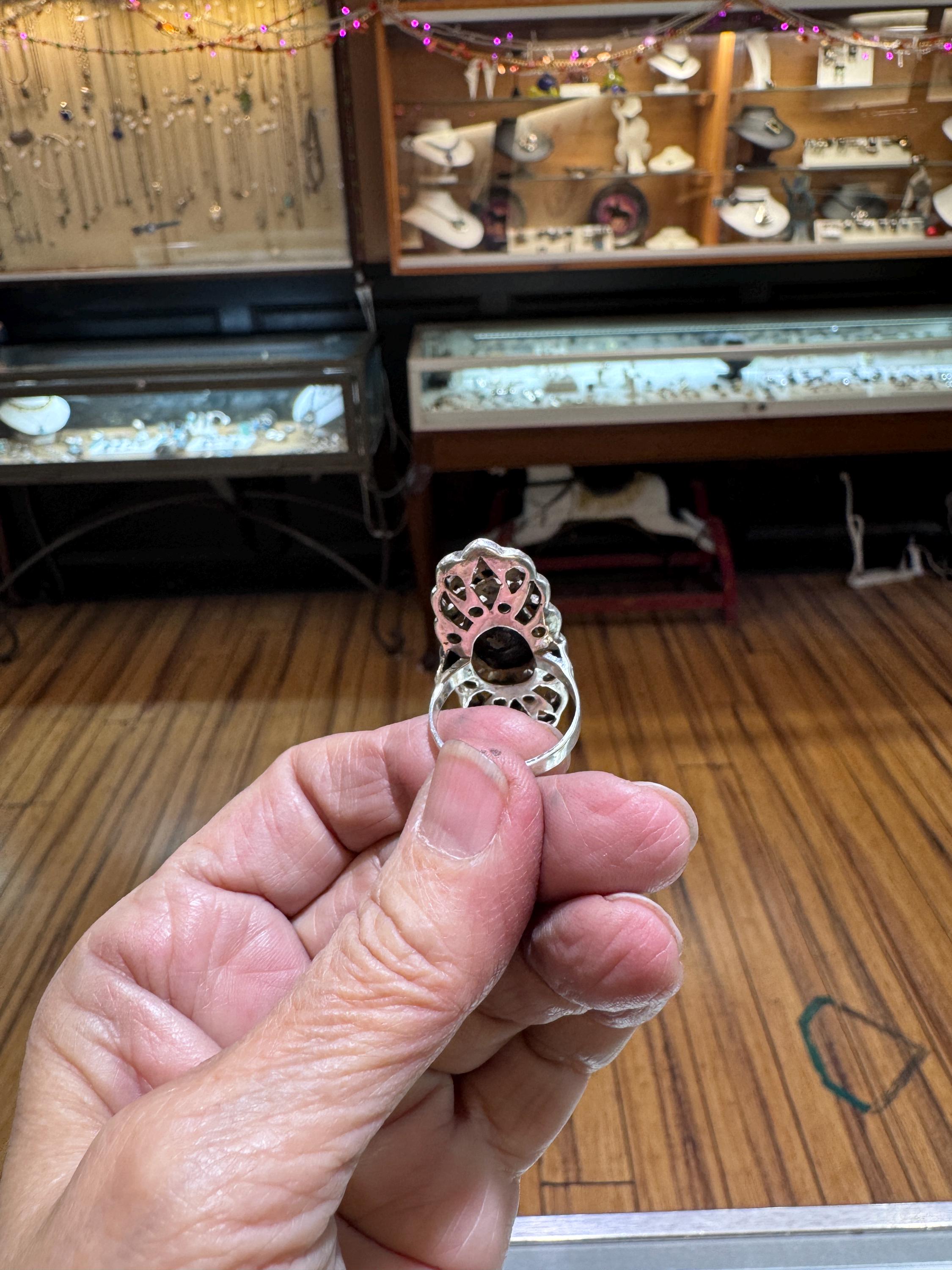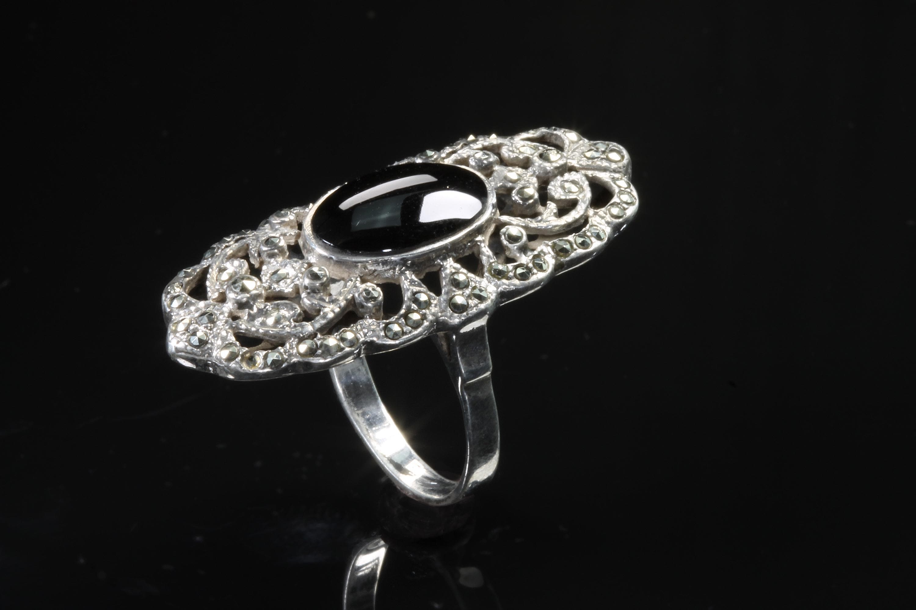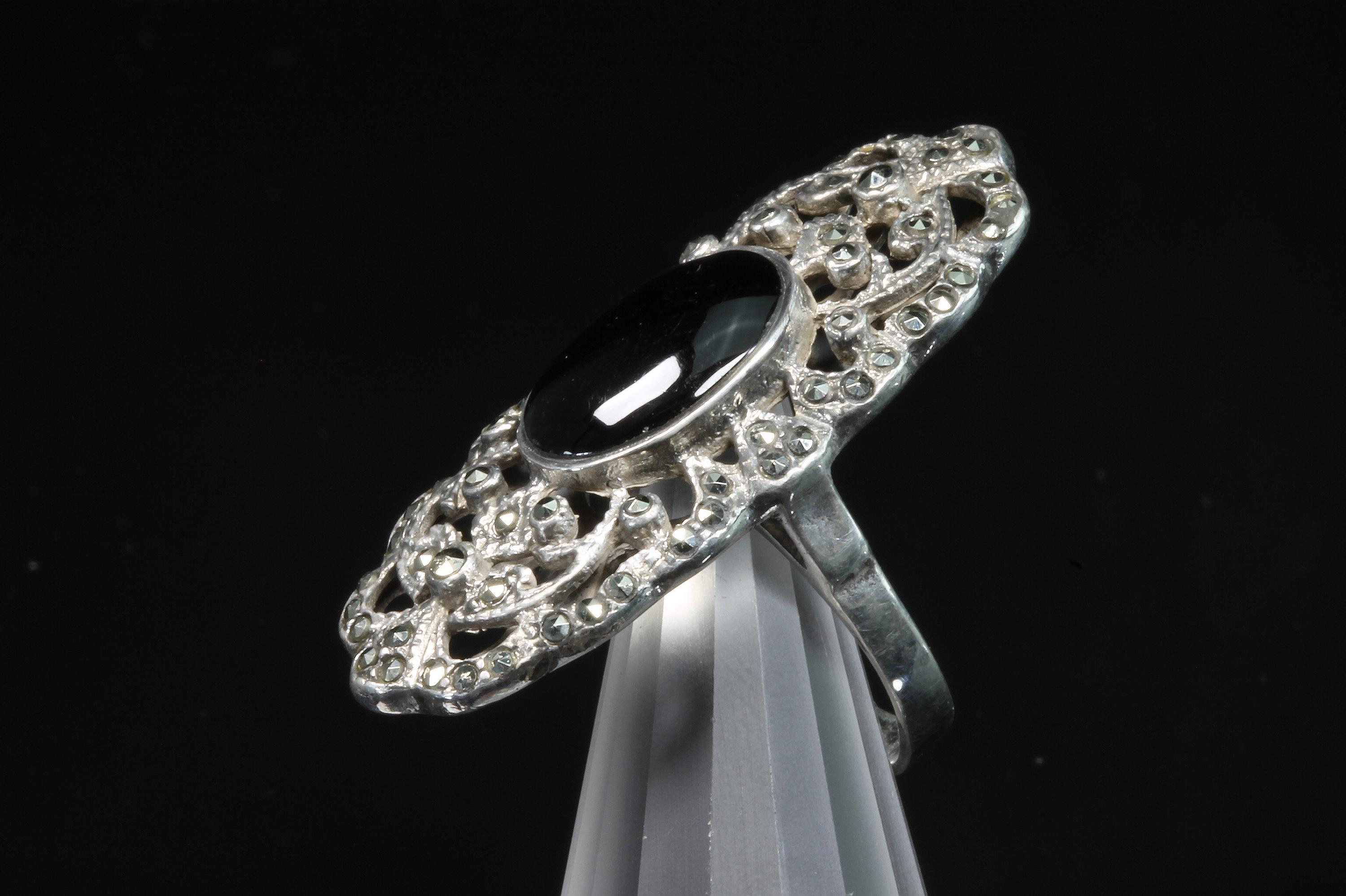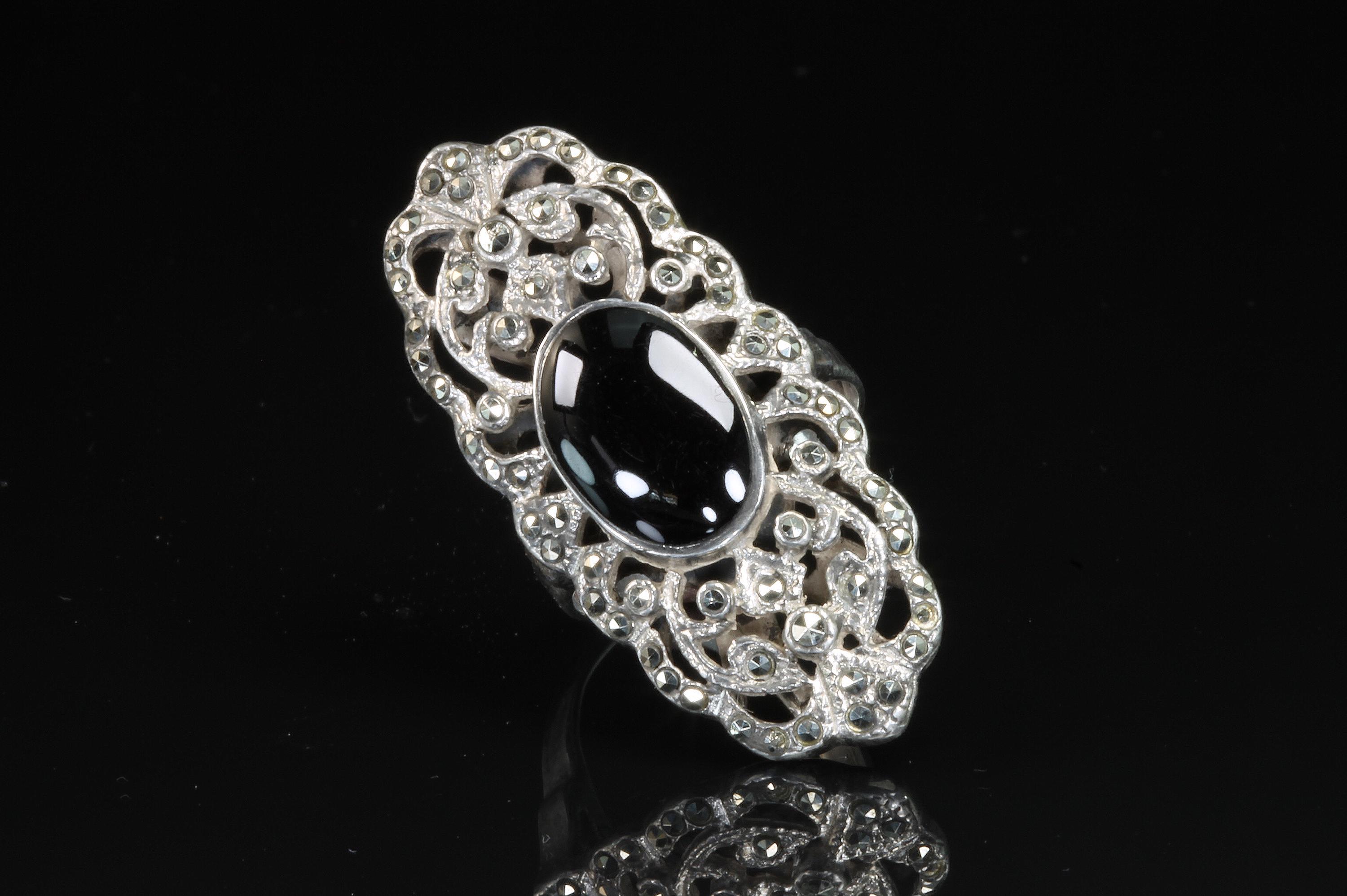 Just your average ring....NOT!! A flashy statement more like it! This is a sterling silver, sparkly marcasite and (14mm x 10mm oval) black onyx party for your hand! This is a vintage and pre owned ring, sold as is in great ready to wear condition. Currently a size 9.75 we will size this ring up to a size 10.75 free of charge. If you need this ring to be larger than a 10.75 please contact us before ordering.