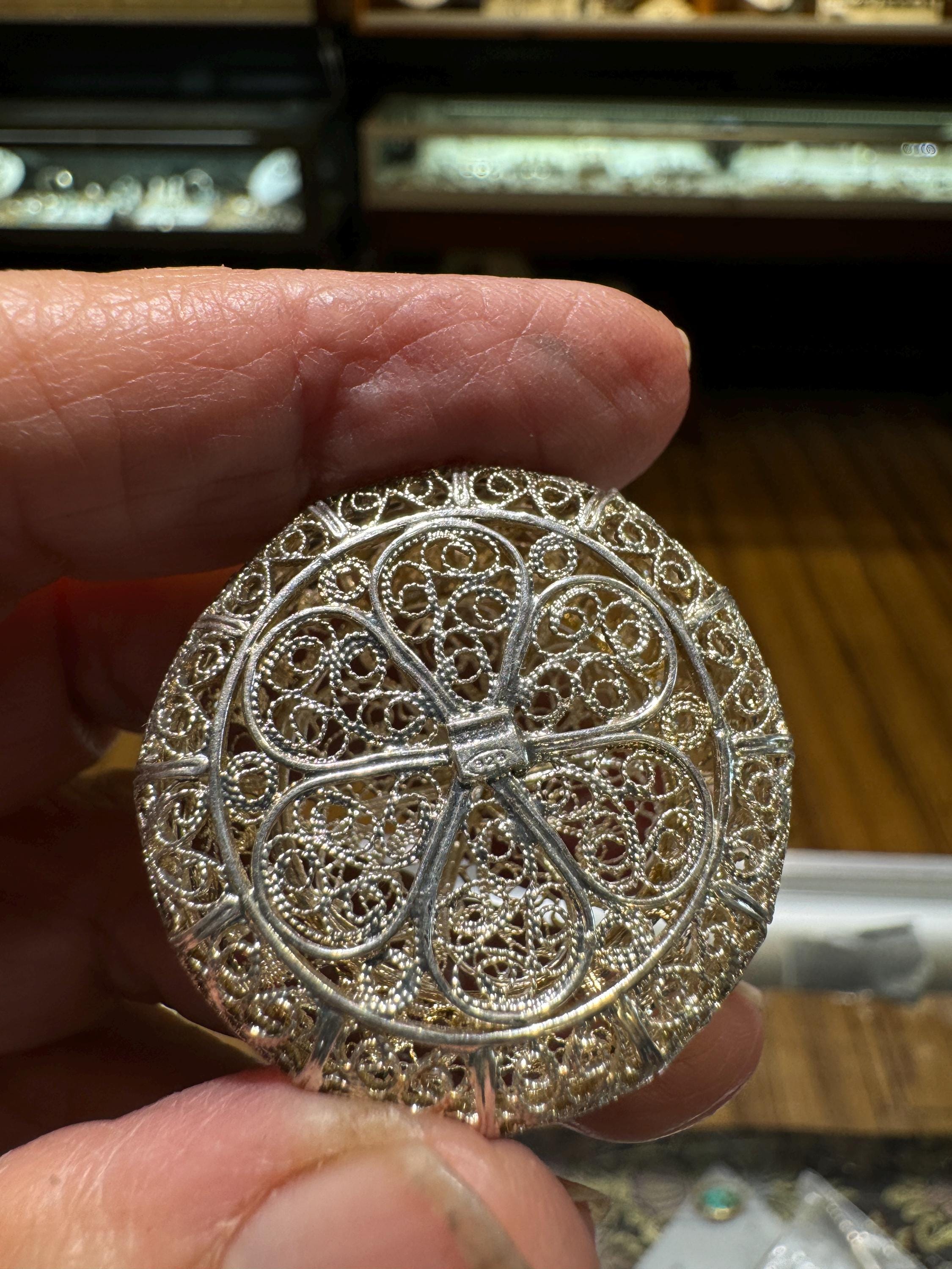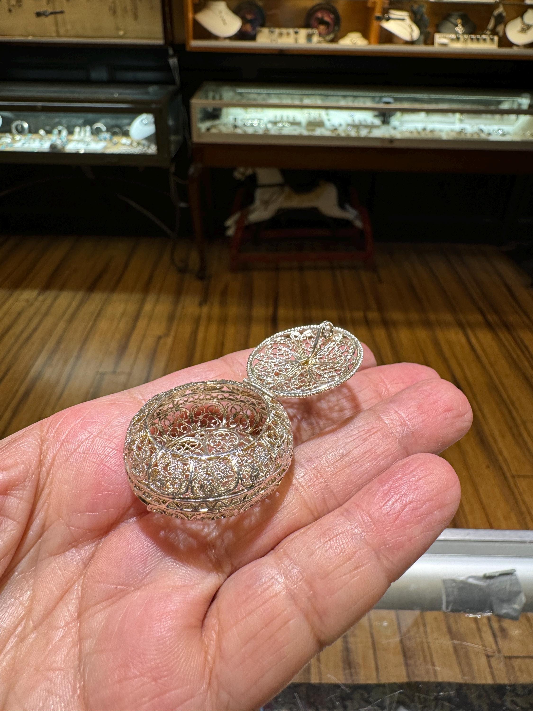 A cute way to carry something! Today’s medications or a keepsake! This sterling silver filigree round box has a hinged lid that does click into place. This is a vintage and pre owned collectible pill box, sold as is in great ready to use condition. I’m almost sure it may once have been a pretty way to carry some coin when some coin meant something!!