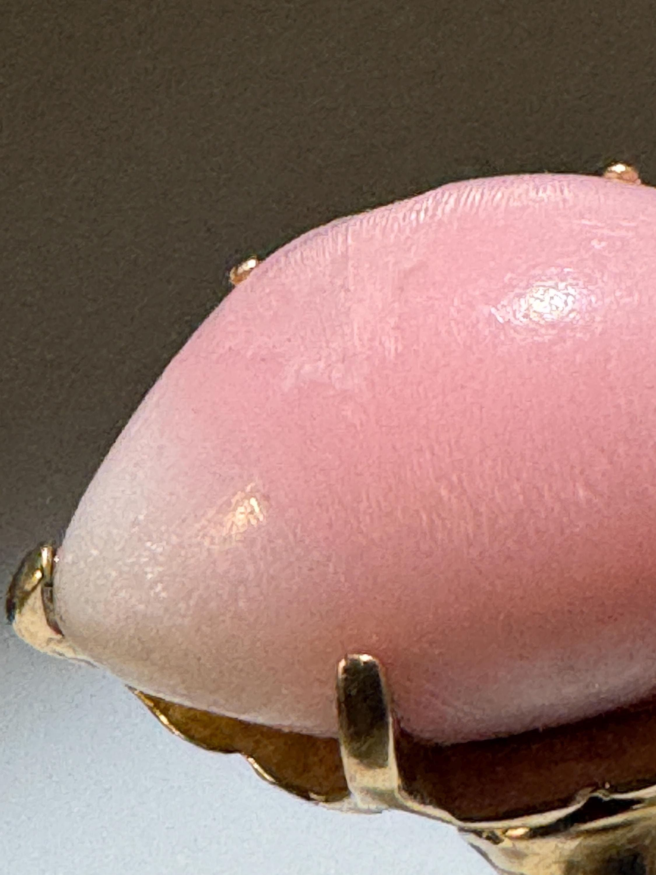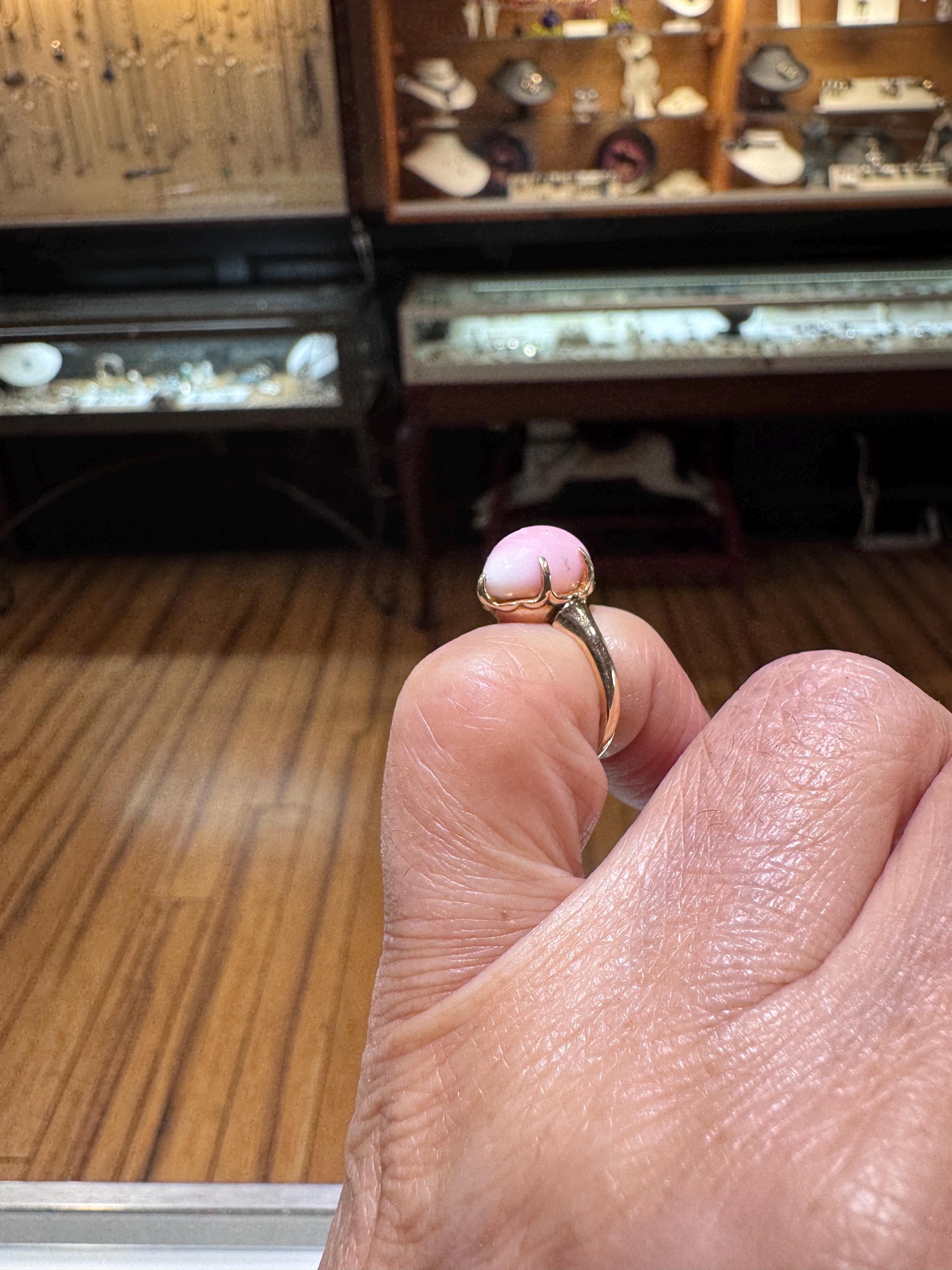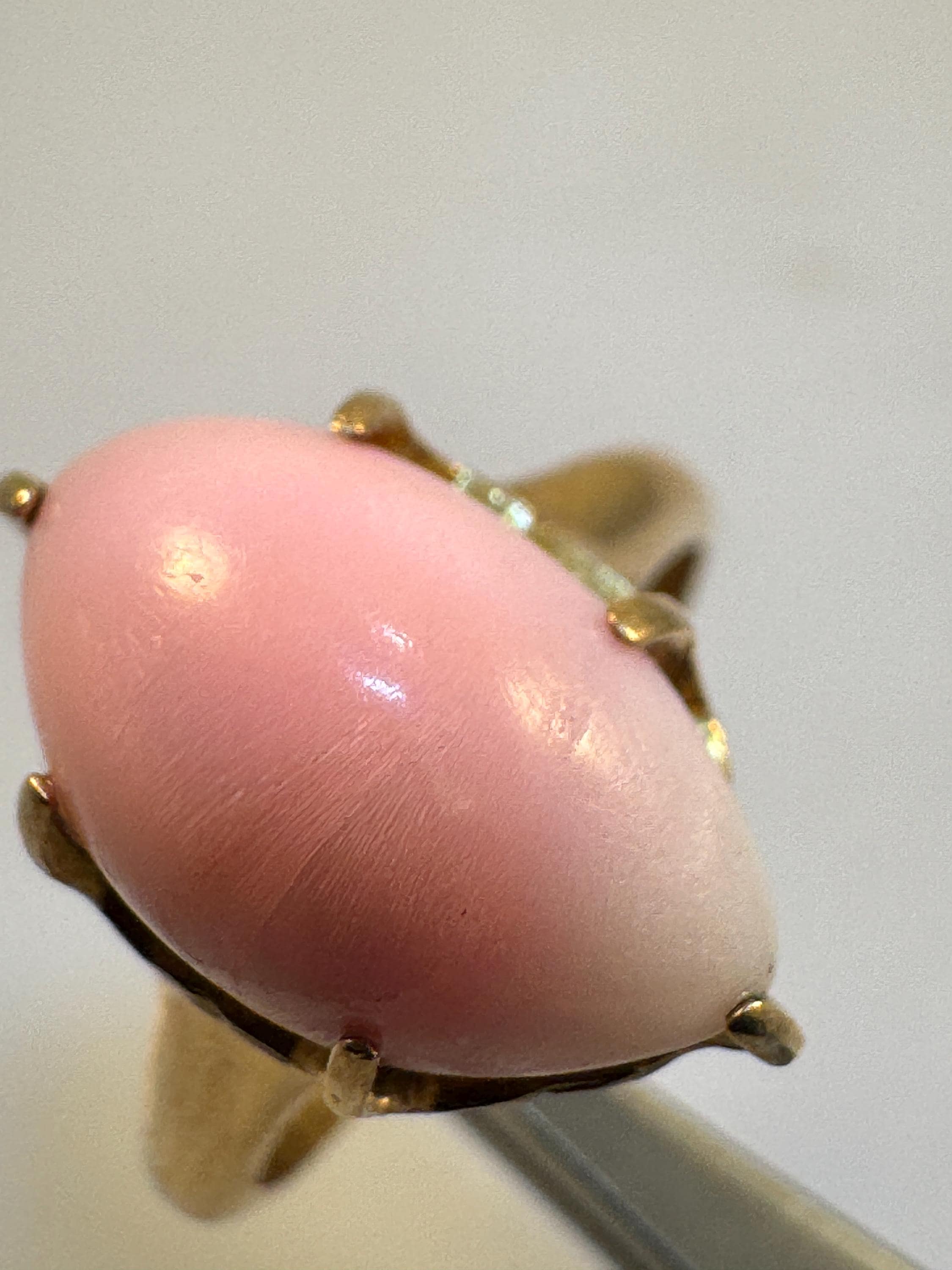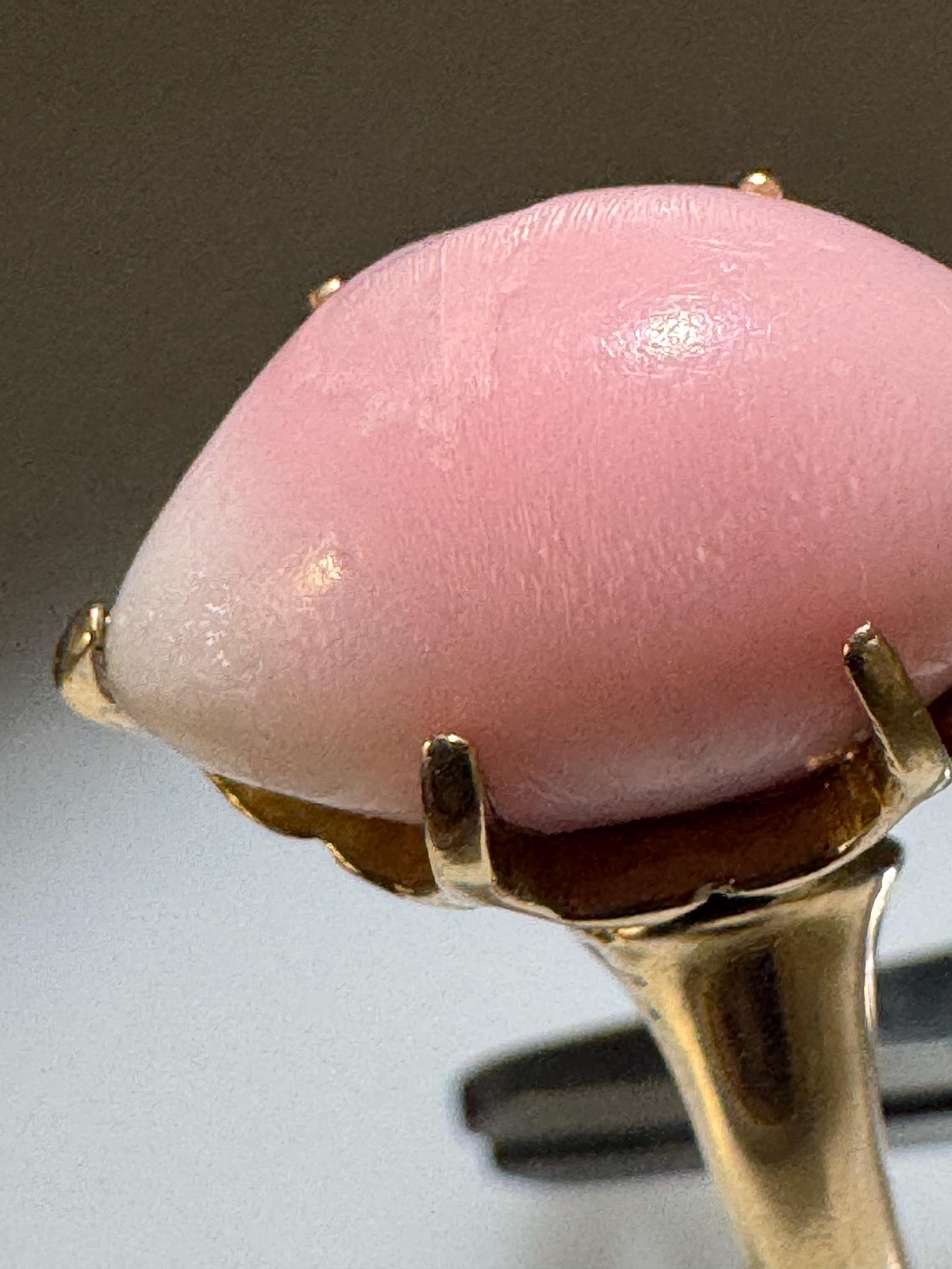What a great and rare find! Technically not a pearl, there is no nacre rather it is considered a calcareous concretion of the Queen conch. Conch pearl sounds much nicer! If you look closely at this 'pearl' aside from the perfect pink color you can see the flame or ripple like pattern indicative of conch pearls. The ring itself is 14K yellow gold. This ring is currently a size 3; we will size this ring up to a size 6 free of charge. However, we do not want to size it up any more than a size 6 due to possible pressure on the pearl. This is a vintage and pre owned ring, sold as is in great ready to wear condition.