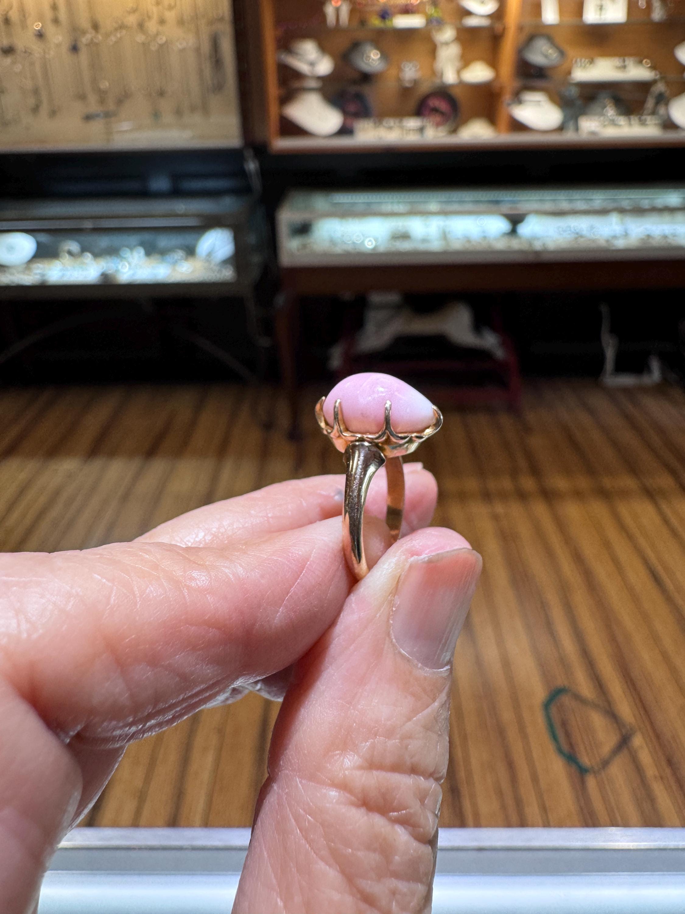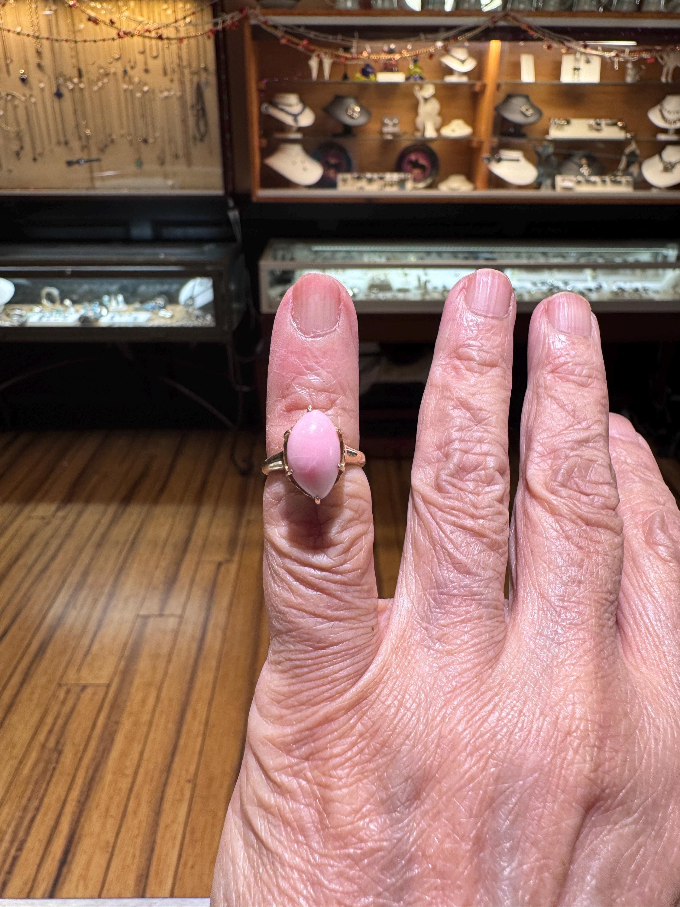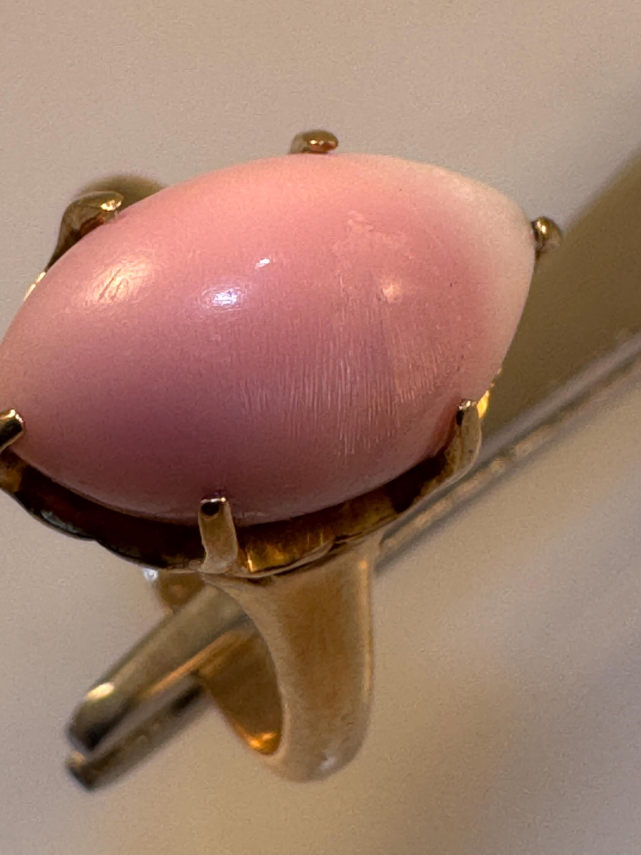What a great and rare find! Technically not a pearl, there is no nacre rather it is considered a calcareous concretion of the Queen conch. Conch pearl sounds much nicer! If you look closely at this 'pearl' aside from the perfect pink color you can see the flame or ripple like pattern indicative of conch pearls. The ring itself is 14K yellow gold. This ring is currently a size 3; we will size this ring up to a size 6 free of charge. However, we do not want to size it up any more than a size 6 due to possible pressure on the pearl. This is a vintage and pre owned ring, sold as is in great ready to wear condition.
