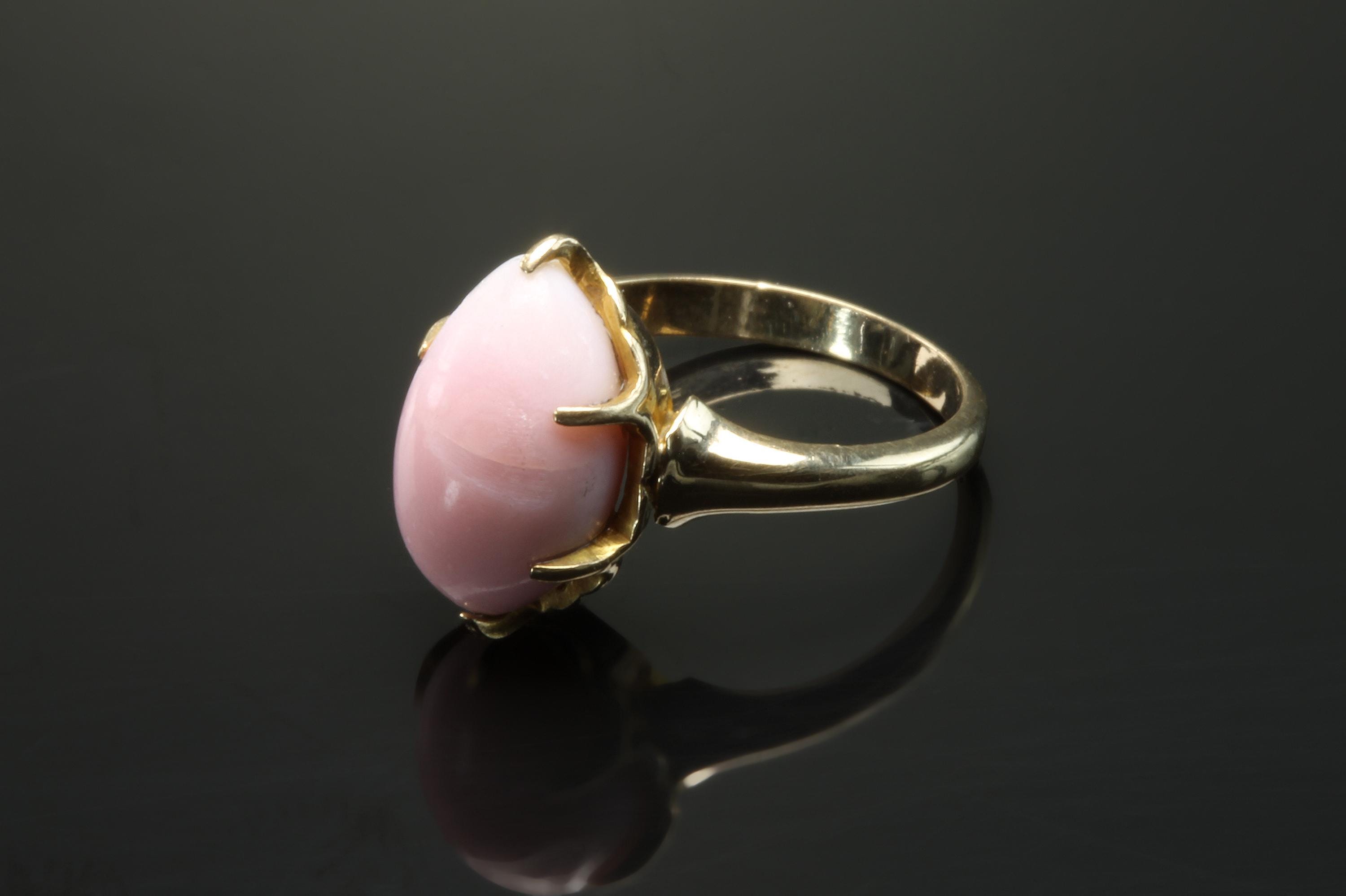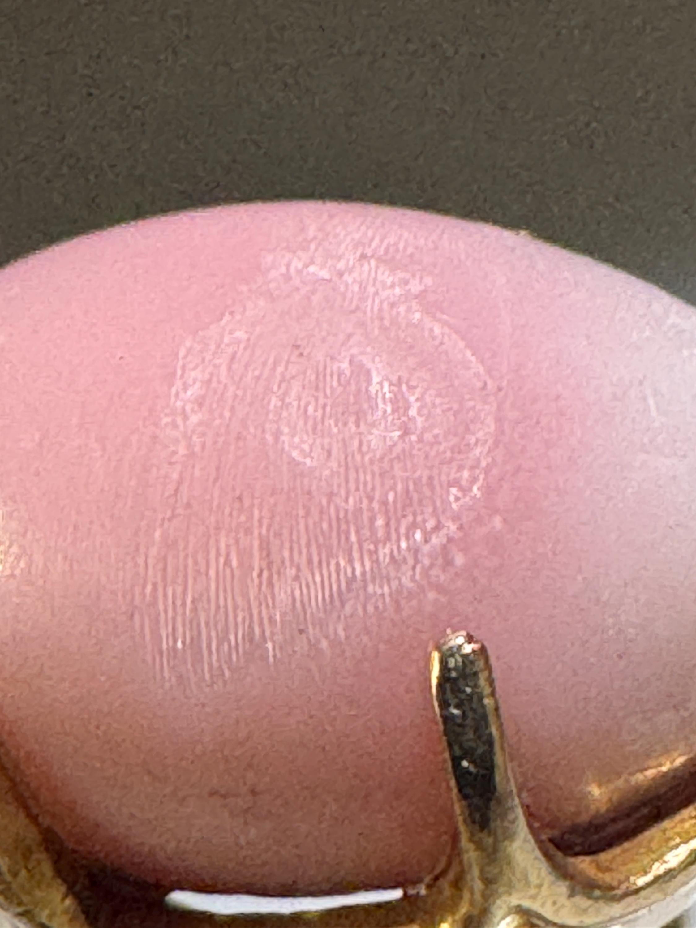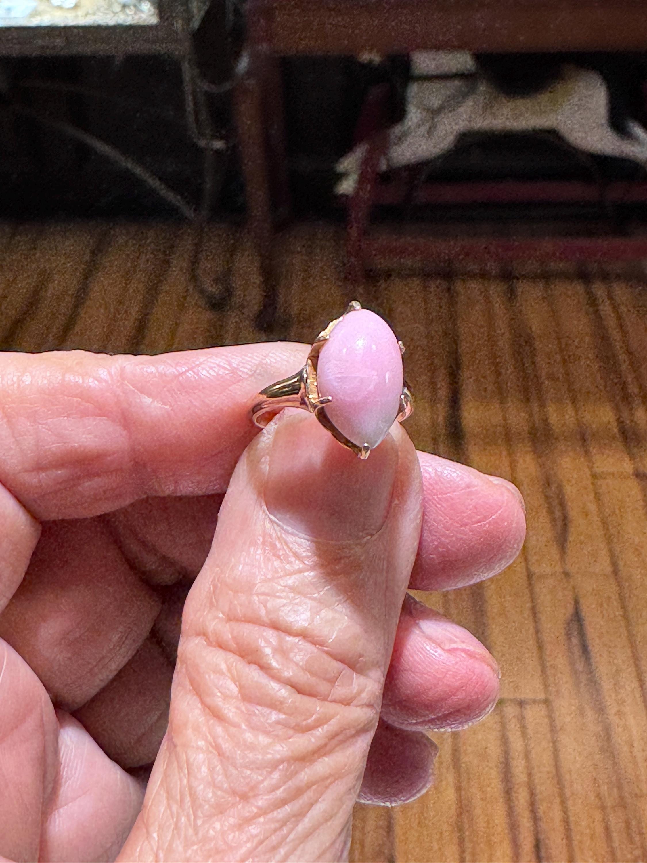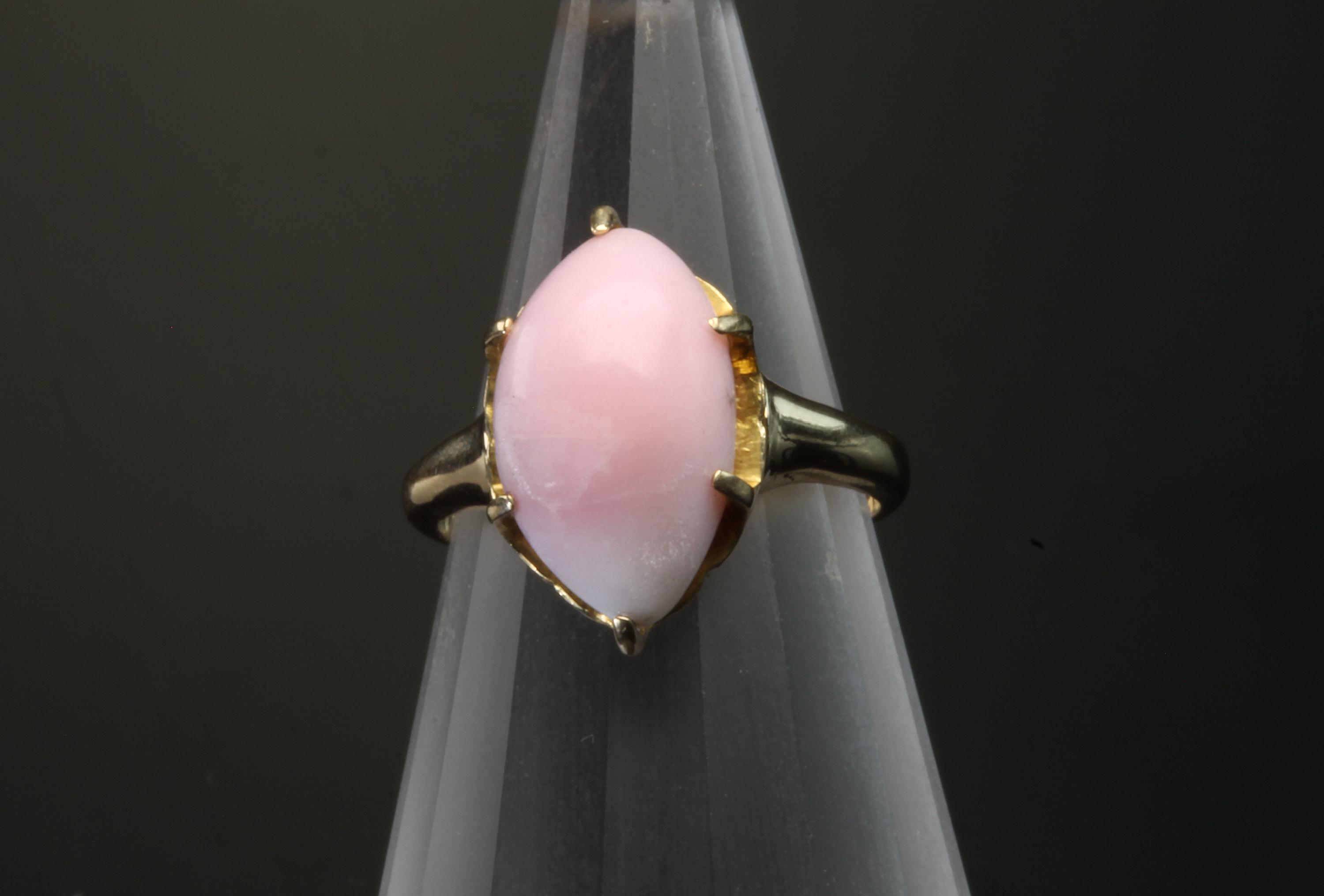 What a great and rare find! Technically not a pearl, there is no nacre rather it is considered a calcareous concretion of the Queen conch. Conch pearl sounds much nicer! If you look closely at this 'pearl' aside from the perfect pink color you can see the flame or ripple like pattern indicative of conch pearls. The ring itself is 14K yellow gold. This ring is currently a size 3; we will size this ring up to a size 6 free of charge. However, we do not want to size it up any more than a size 6 due to possible pressure on the pearl. This is a vintage and pre owned ring, sold as is in great ready to wear condition.