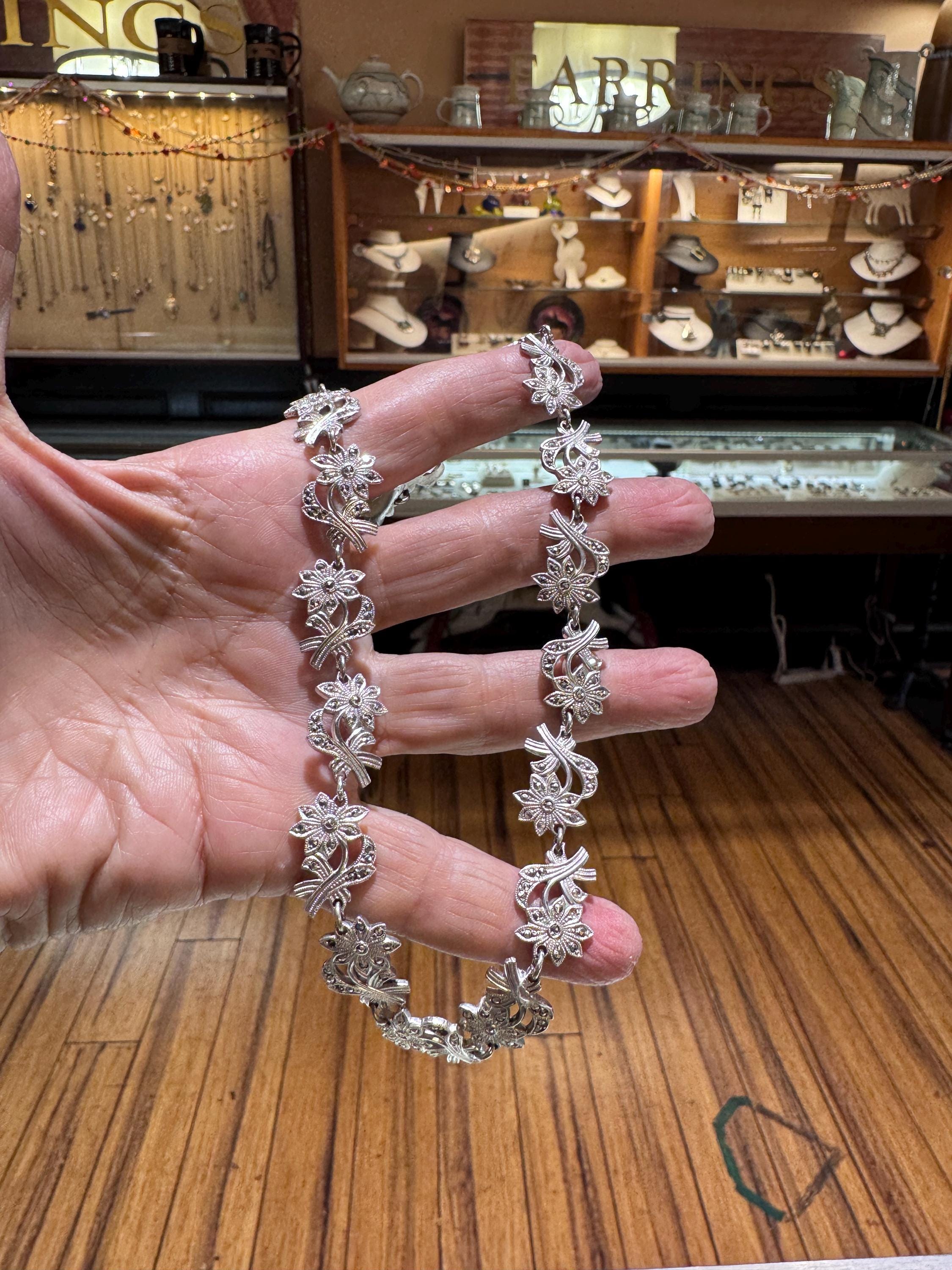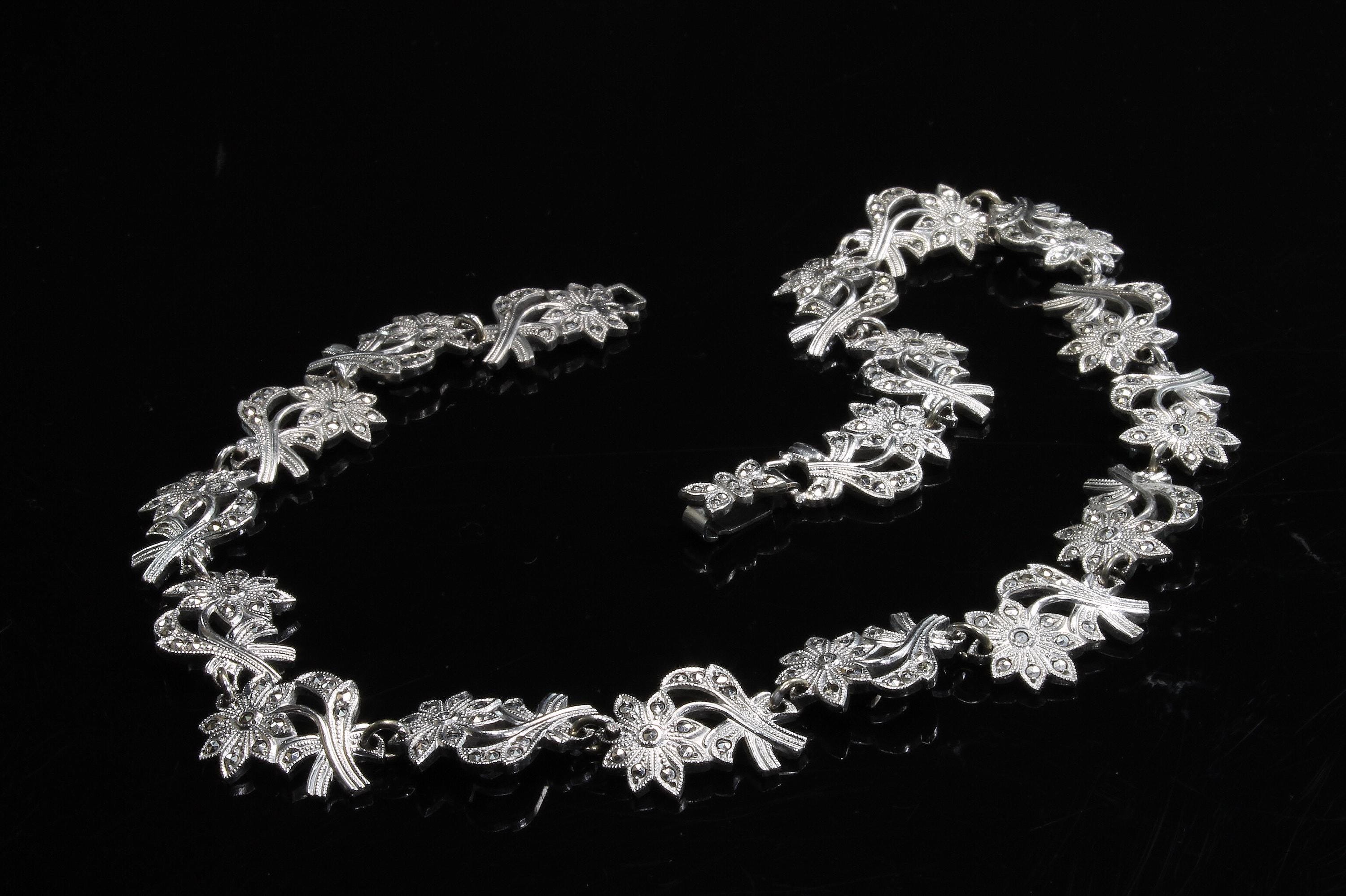 A sparkly 14.5" sterling silver and marcasite floral choker that screams winter fashion! This is a vintage and pre owned necklace, sold as is in great ready to wear condition!
