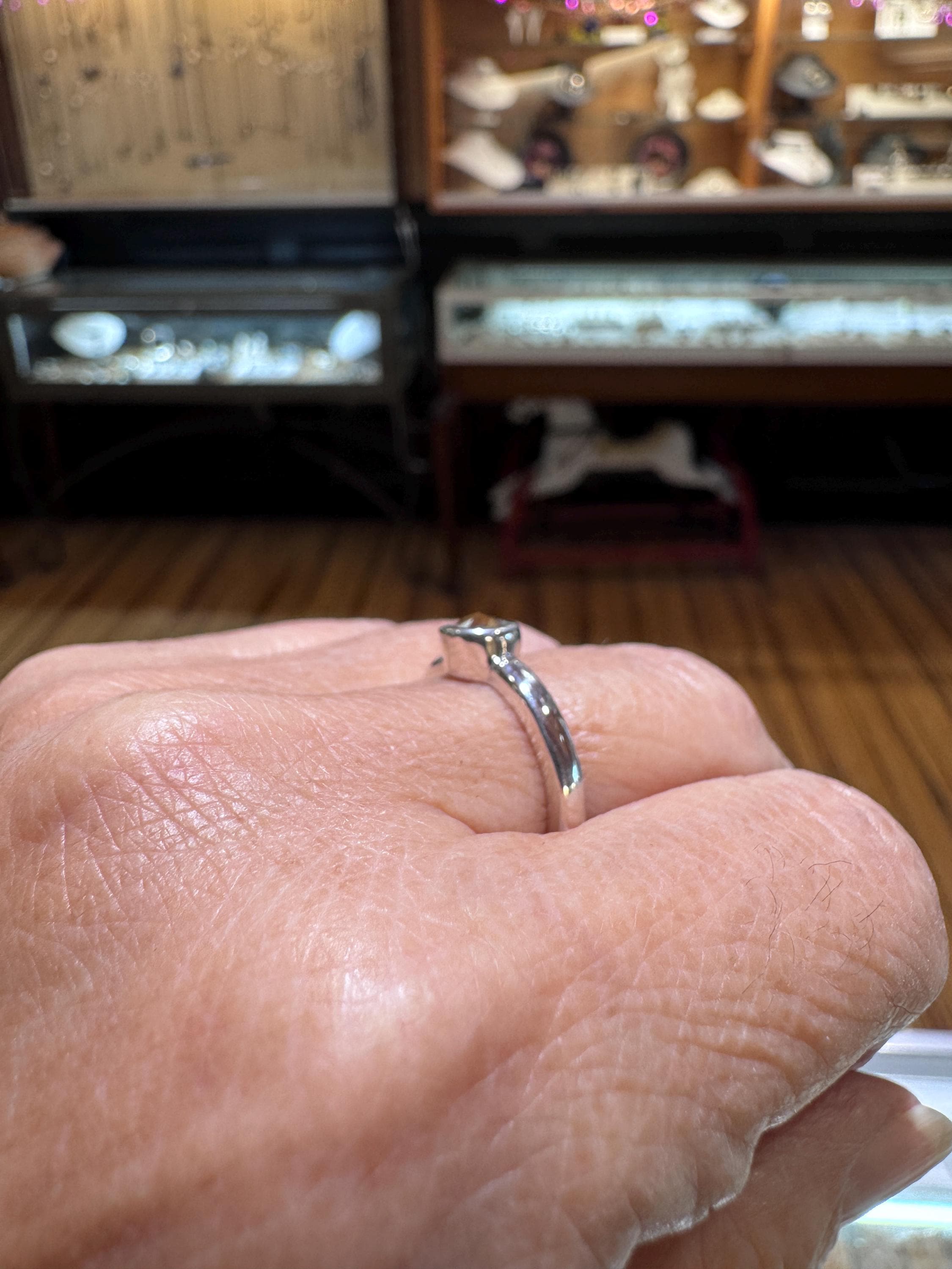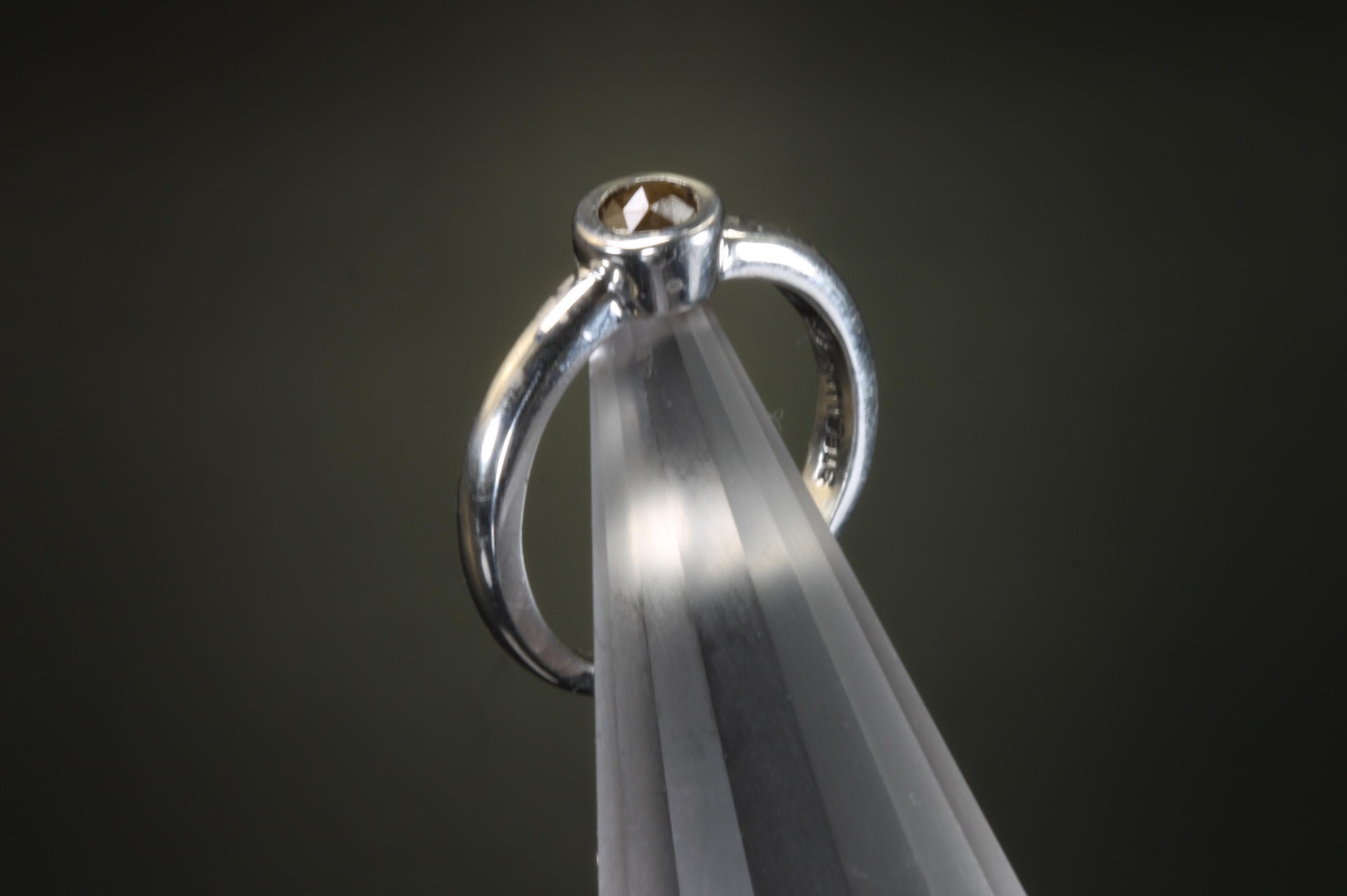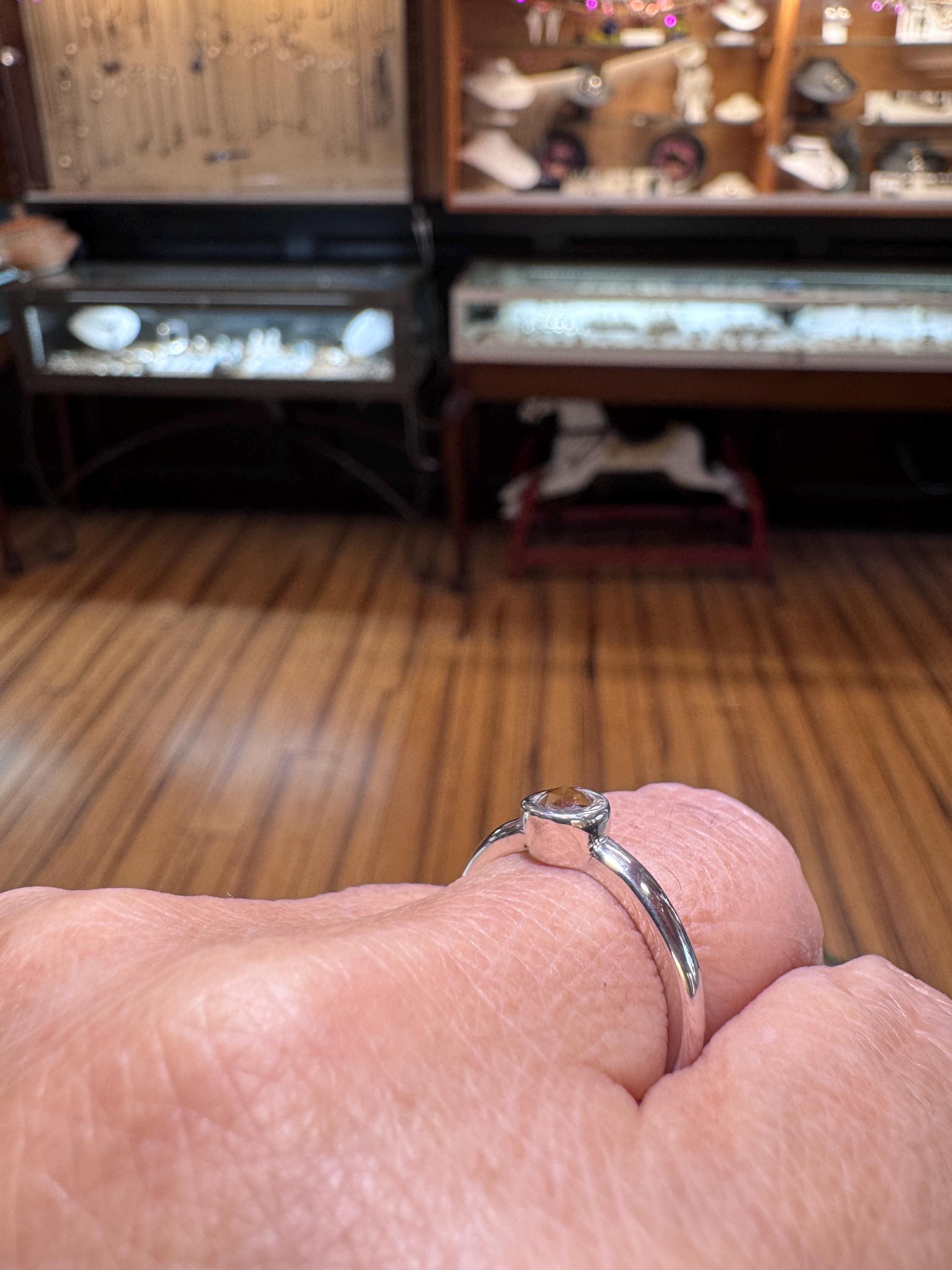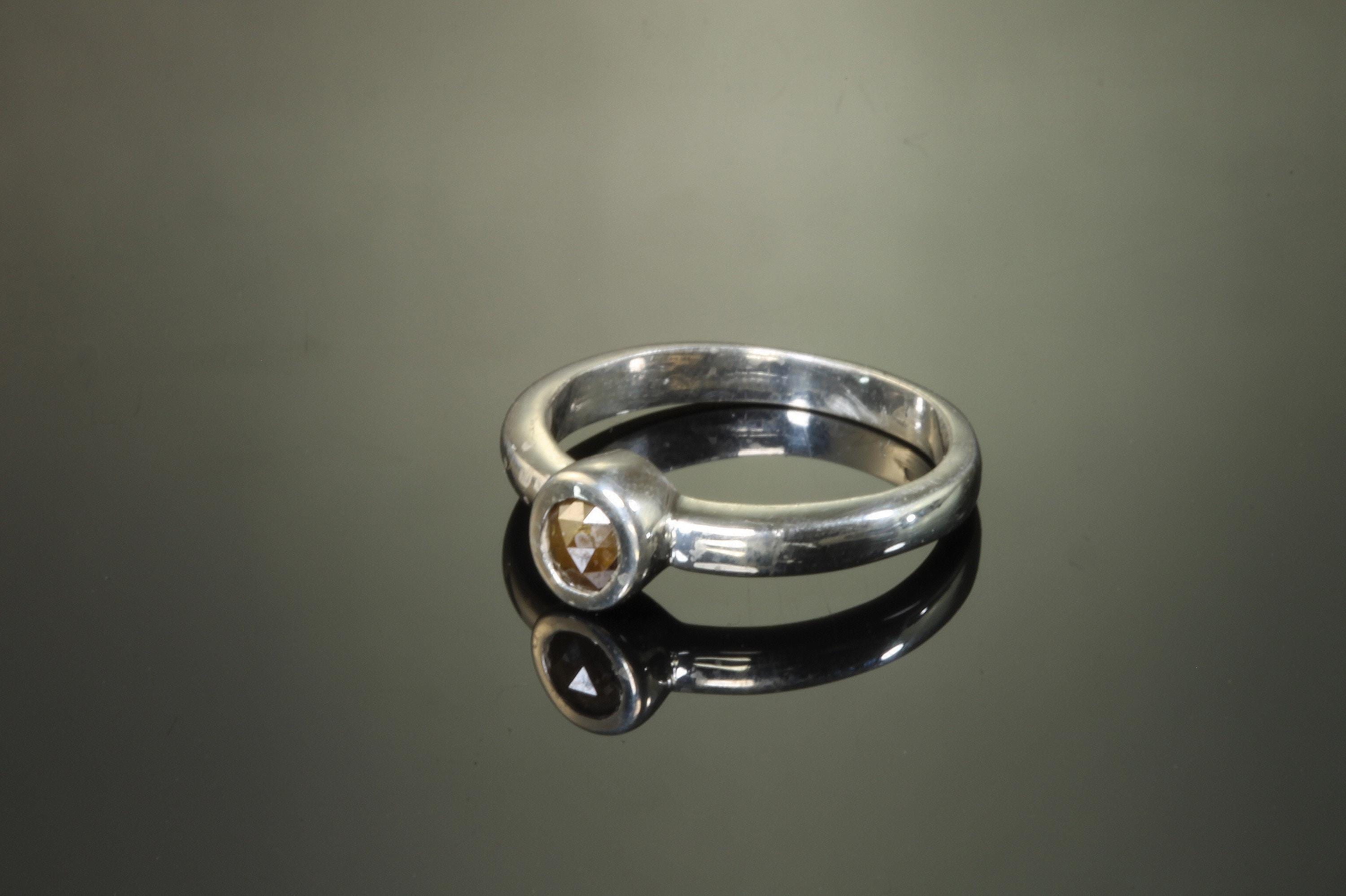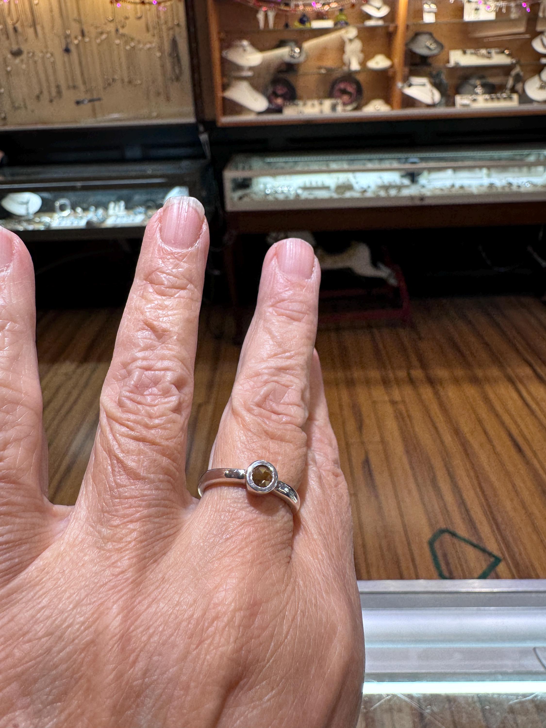 Handmade by us! Our sterling silver solitaire diamond ring features a .29 carat brown rosecut diamond! A unique look that won’t break the bank. A promise ring or wedding ring or whatever occasion, this ring will cause conversations. Currently a size 7.5 we will size this ring up to a size 9.5 free of charge. If you need this ring to be larger than a size 9.5 please let us know before ordering. There will be a small fee for the larger size(s).