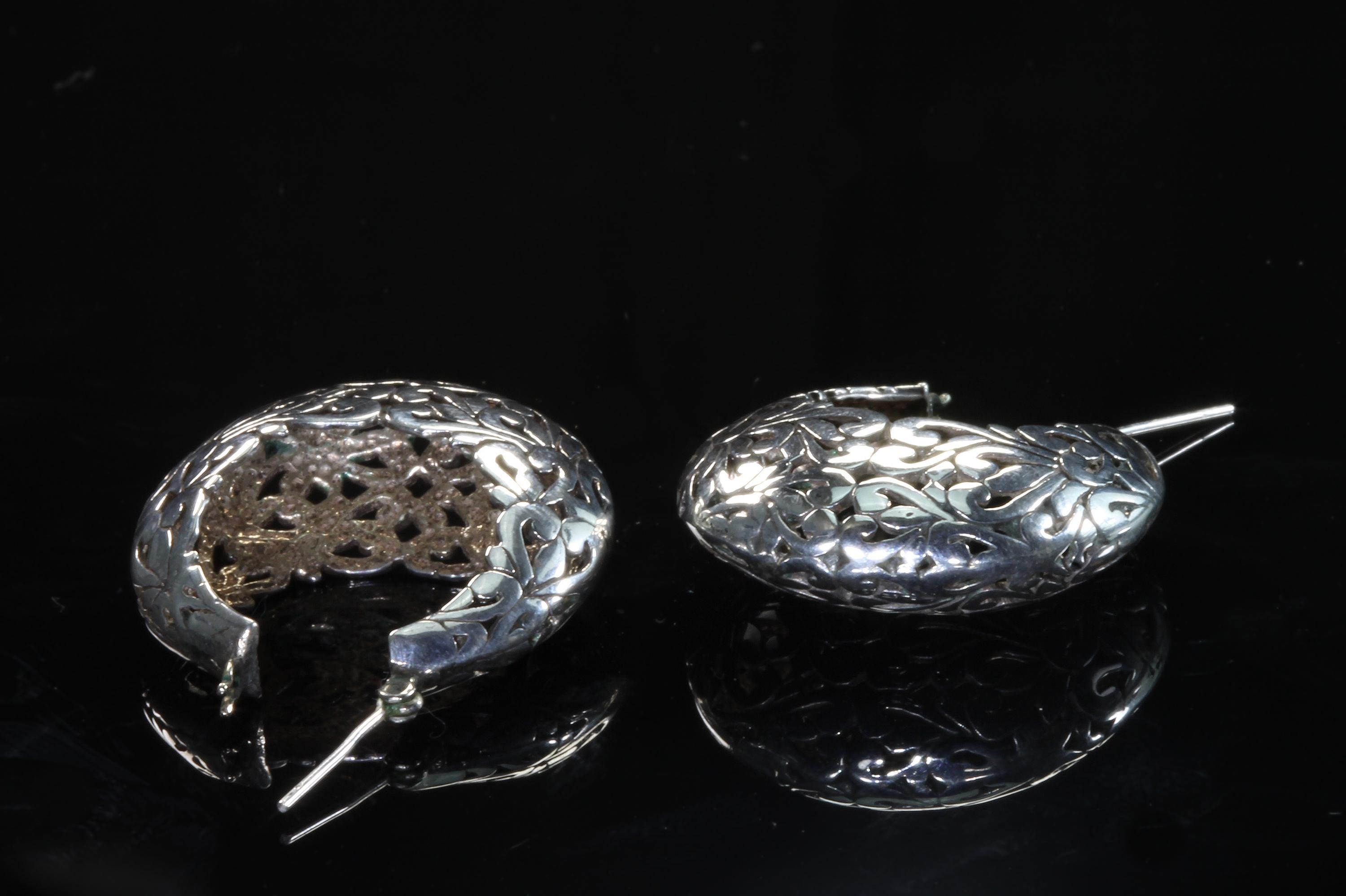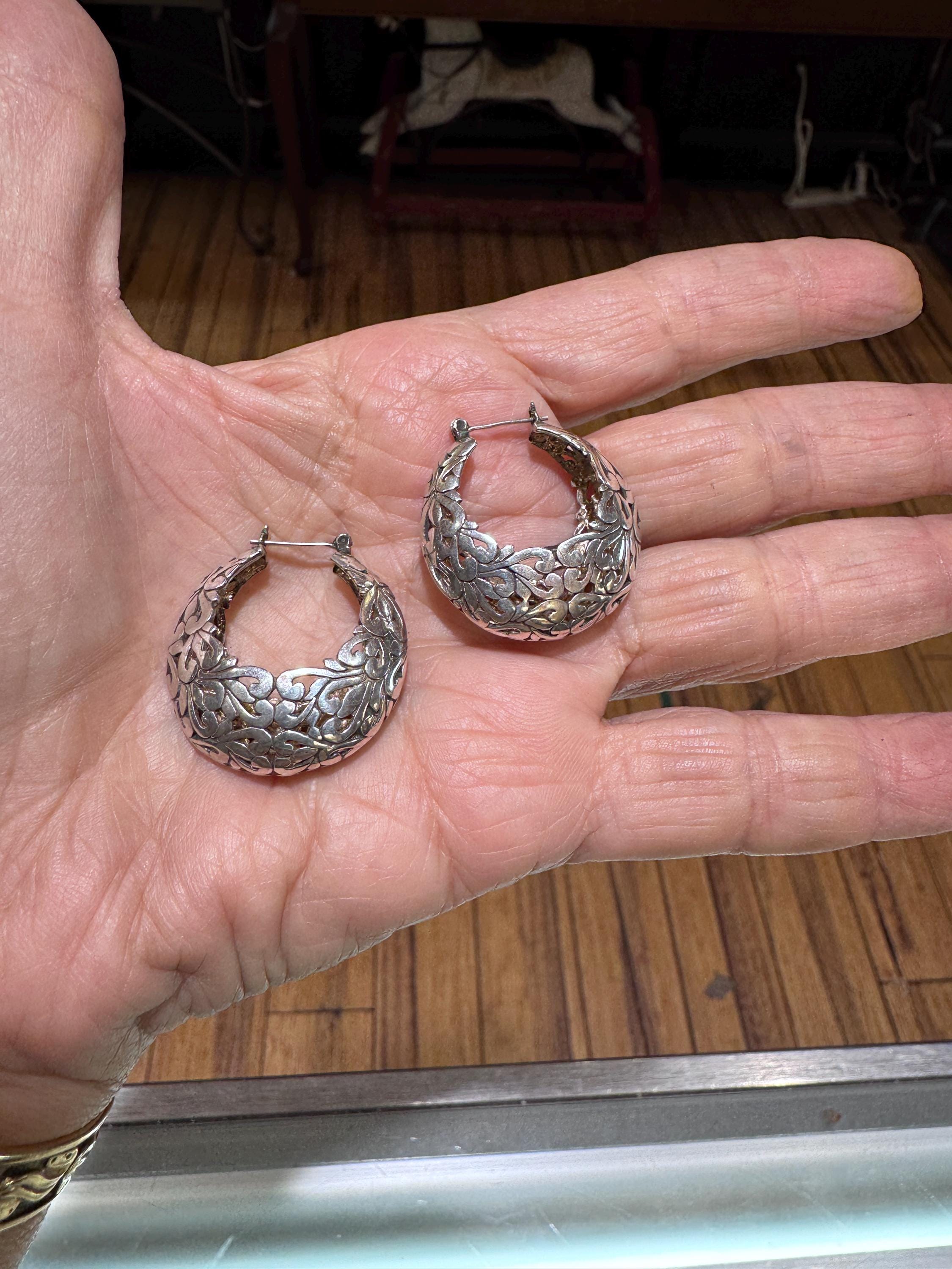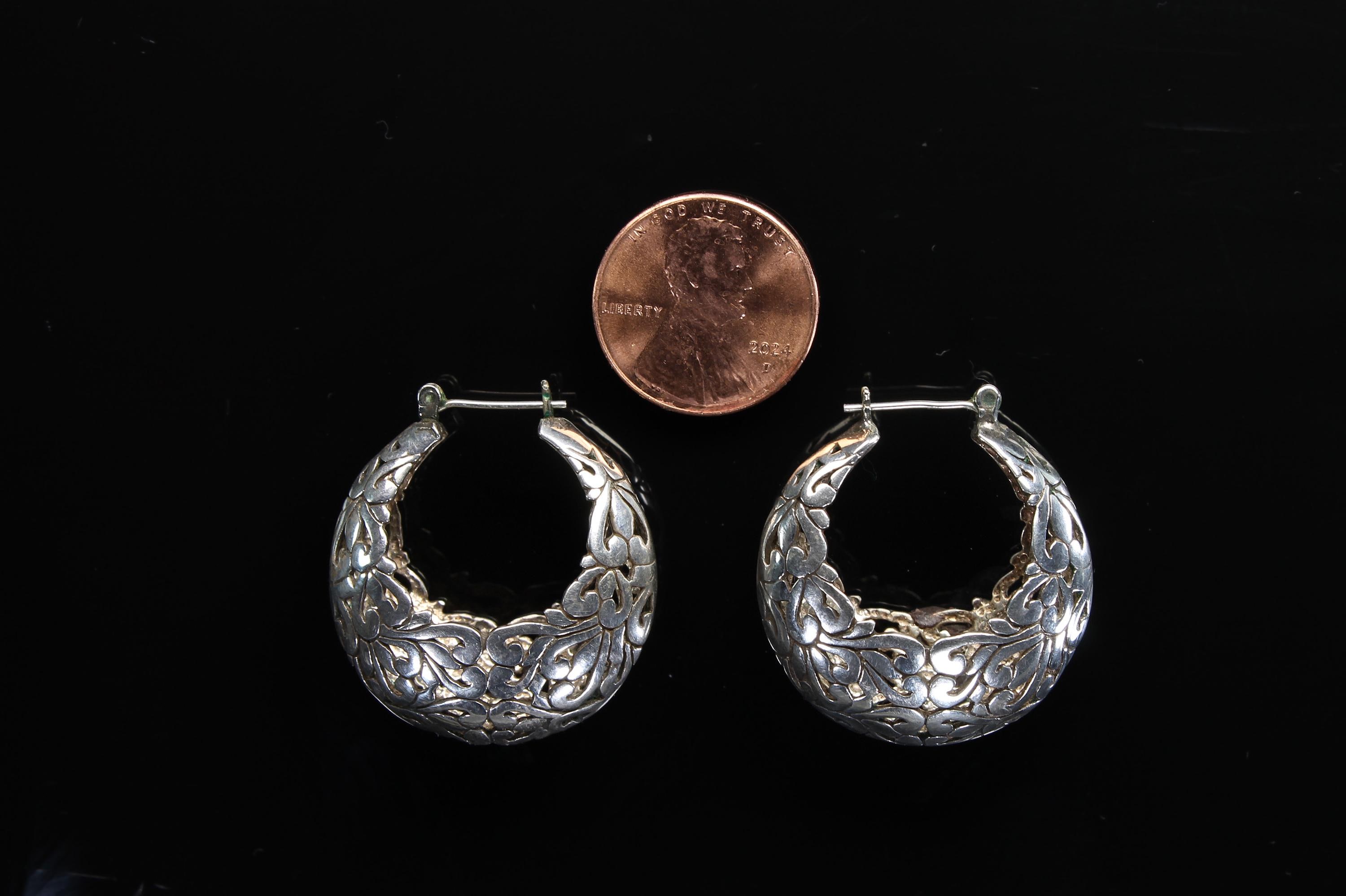 A lovely pair of vintage Jezlaine sterling silver Art Nouveau inspired hoop earrings. A comfy weight, a great look and secure clasps will make these a daily favorite! These are vintage and pre owned earrings, sold as is in great ready to wear condition.