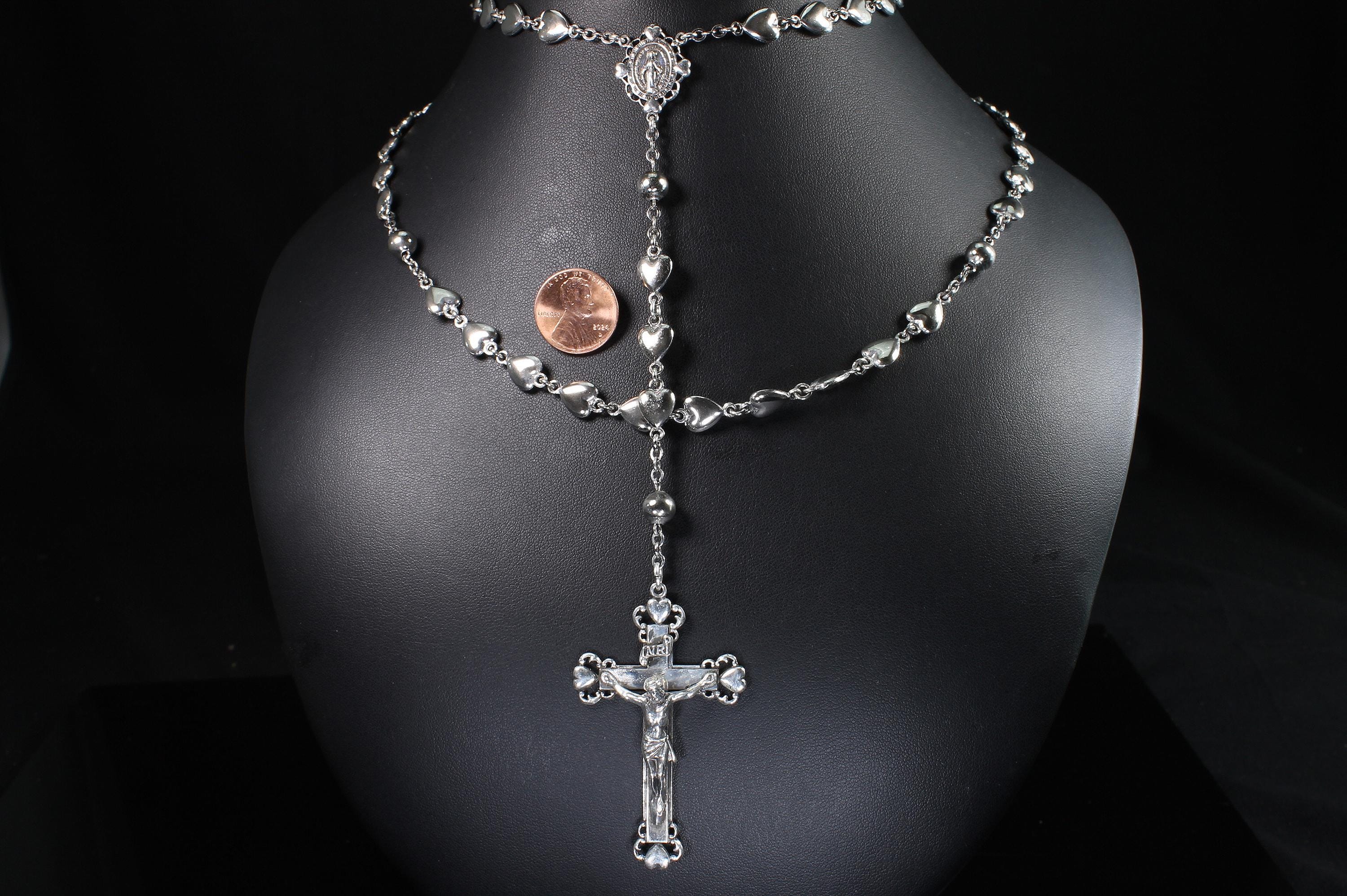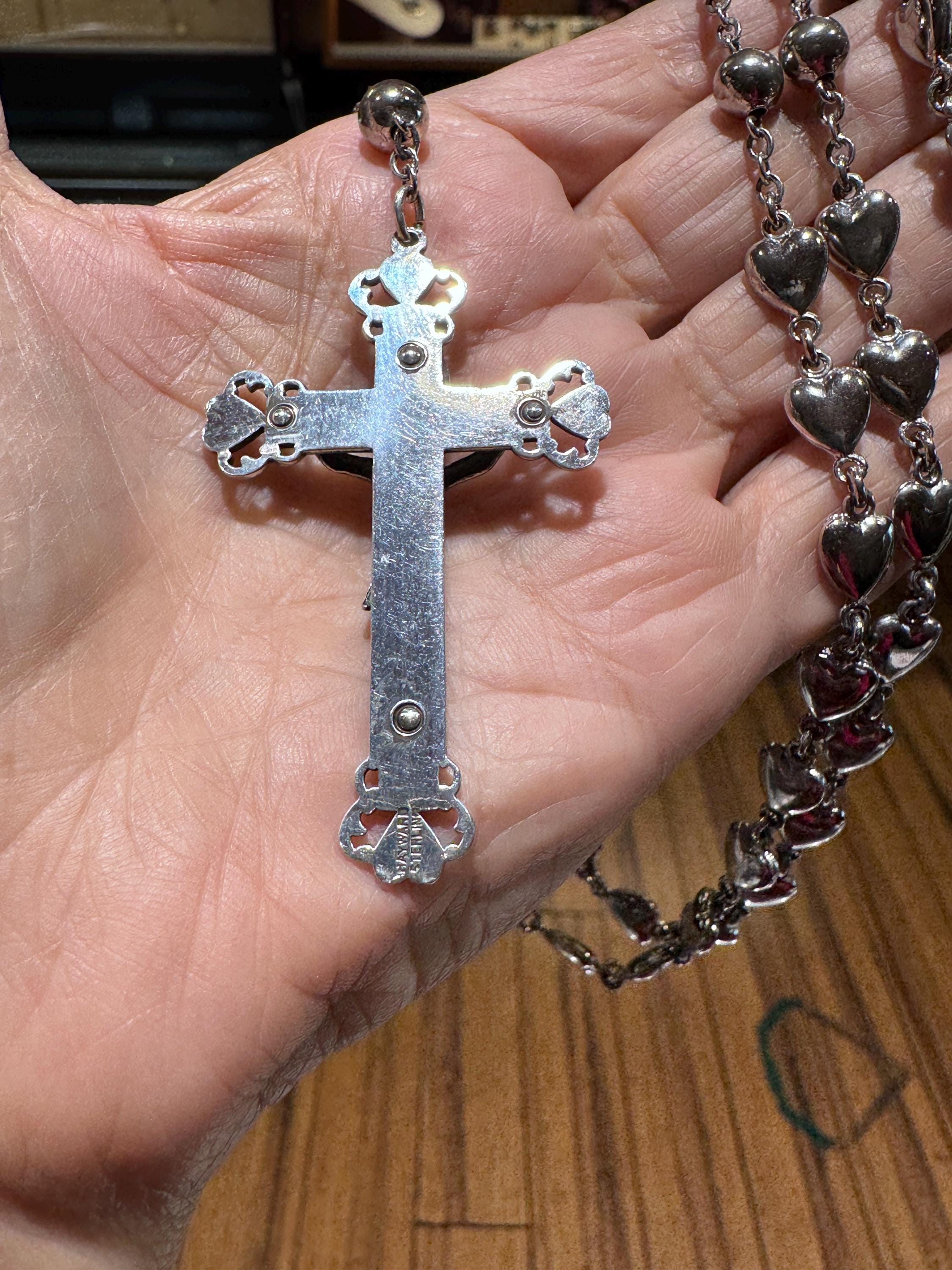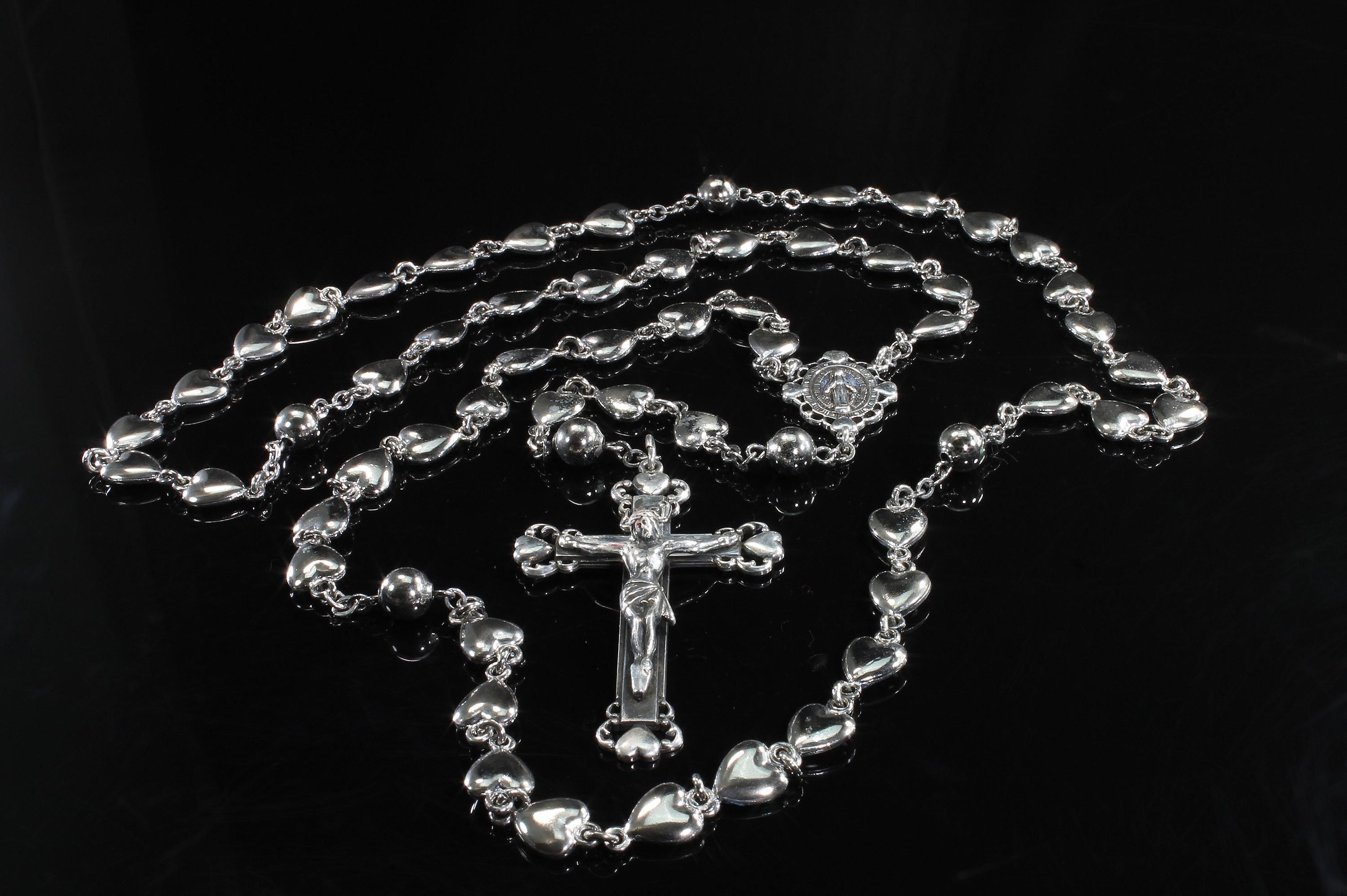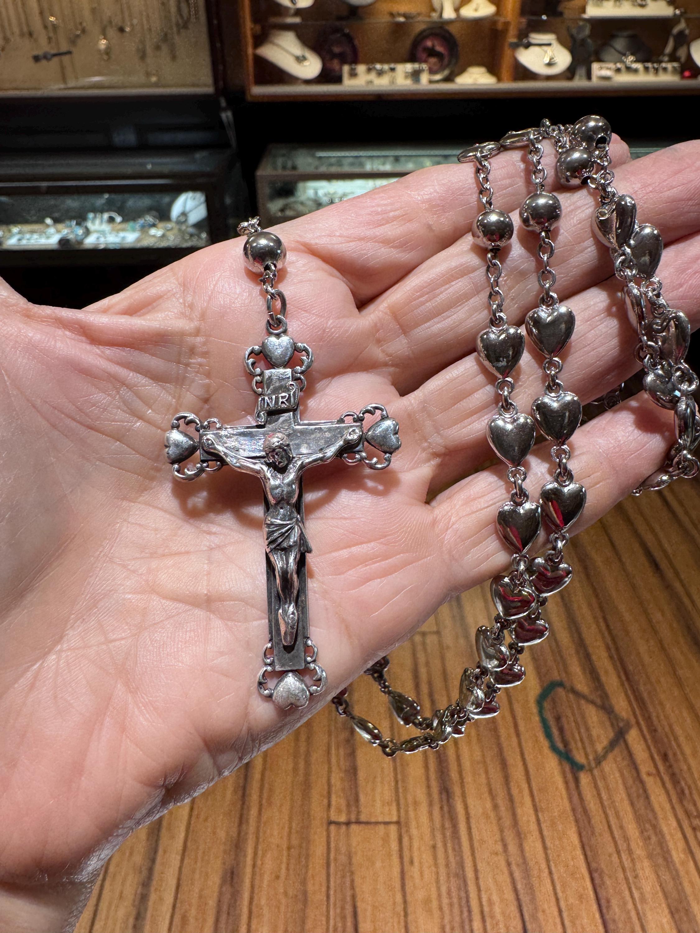 A vintage sterling silver rosary with heart shaped beads. Hallmarked Hayward this is a heavy set! Weighing in at 57.7 dwt or 89.73 grams, this is a vintage and pre owned rosary, sold as is in great ready to use condition. The beads feel good in your hands!