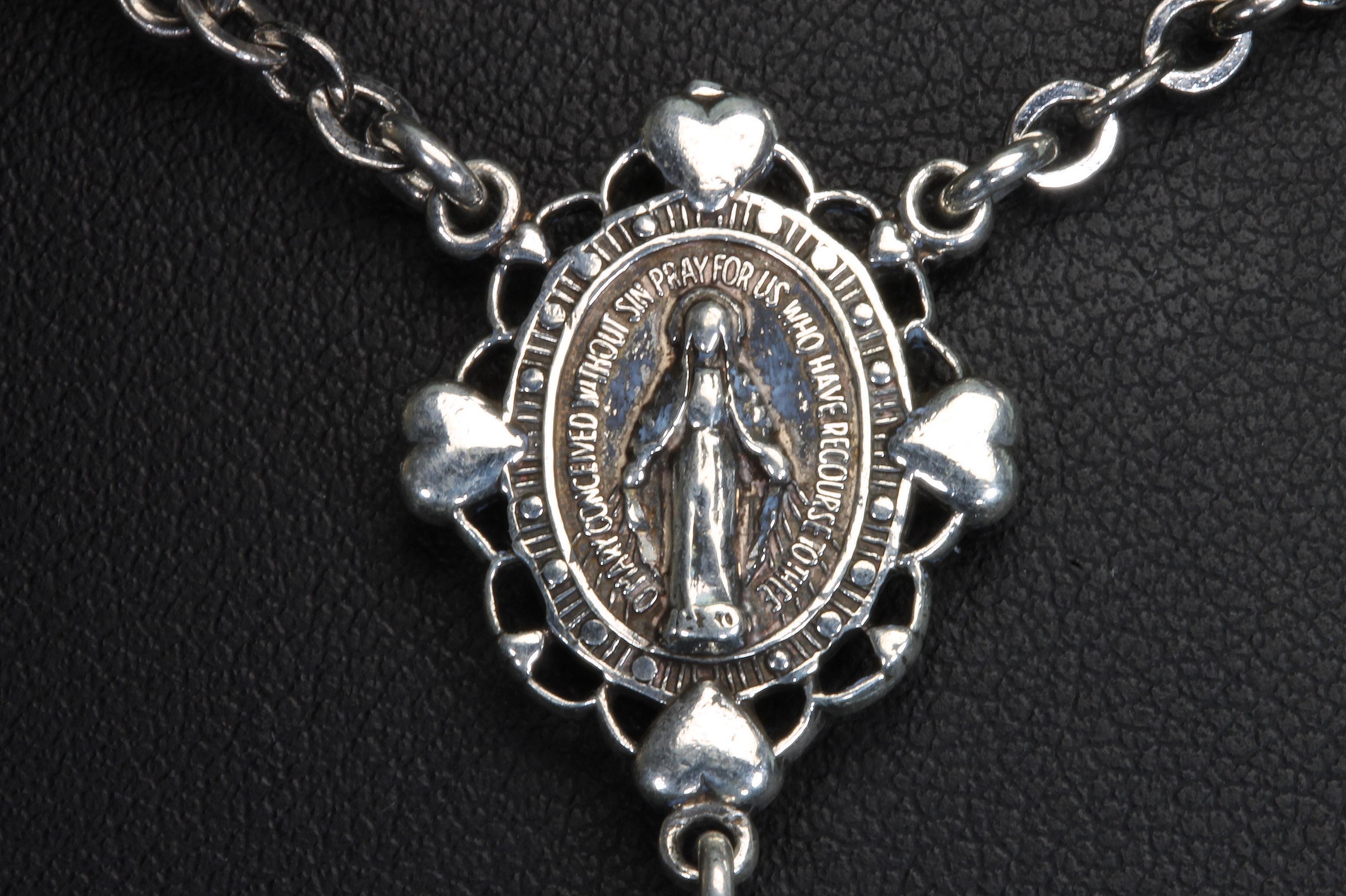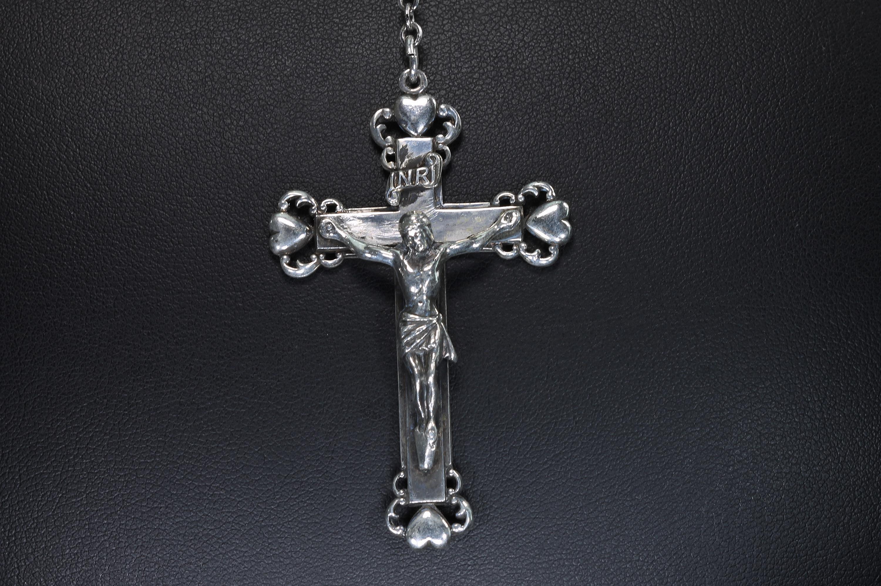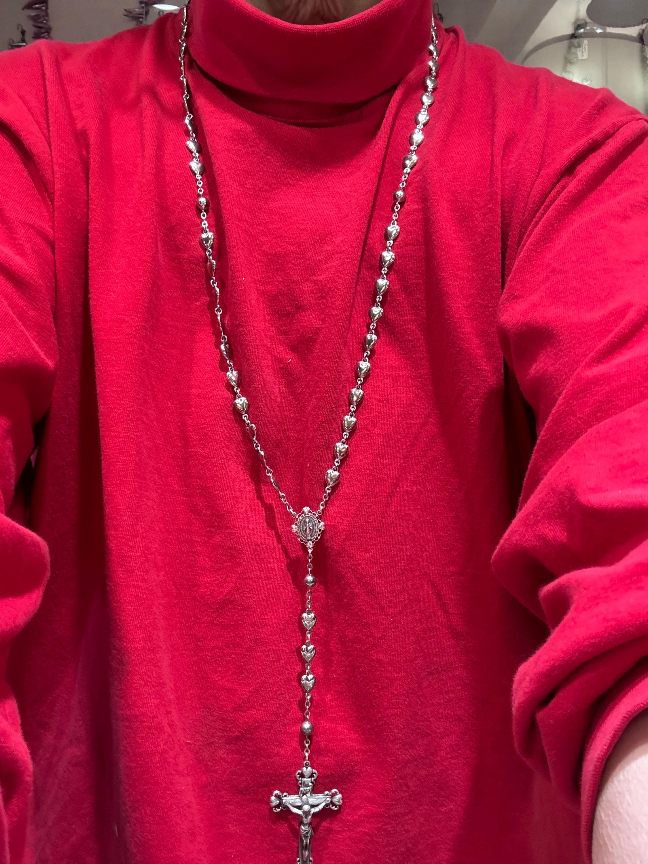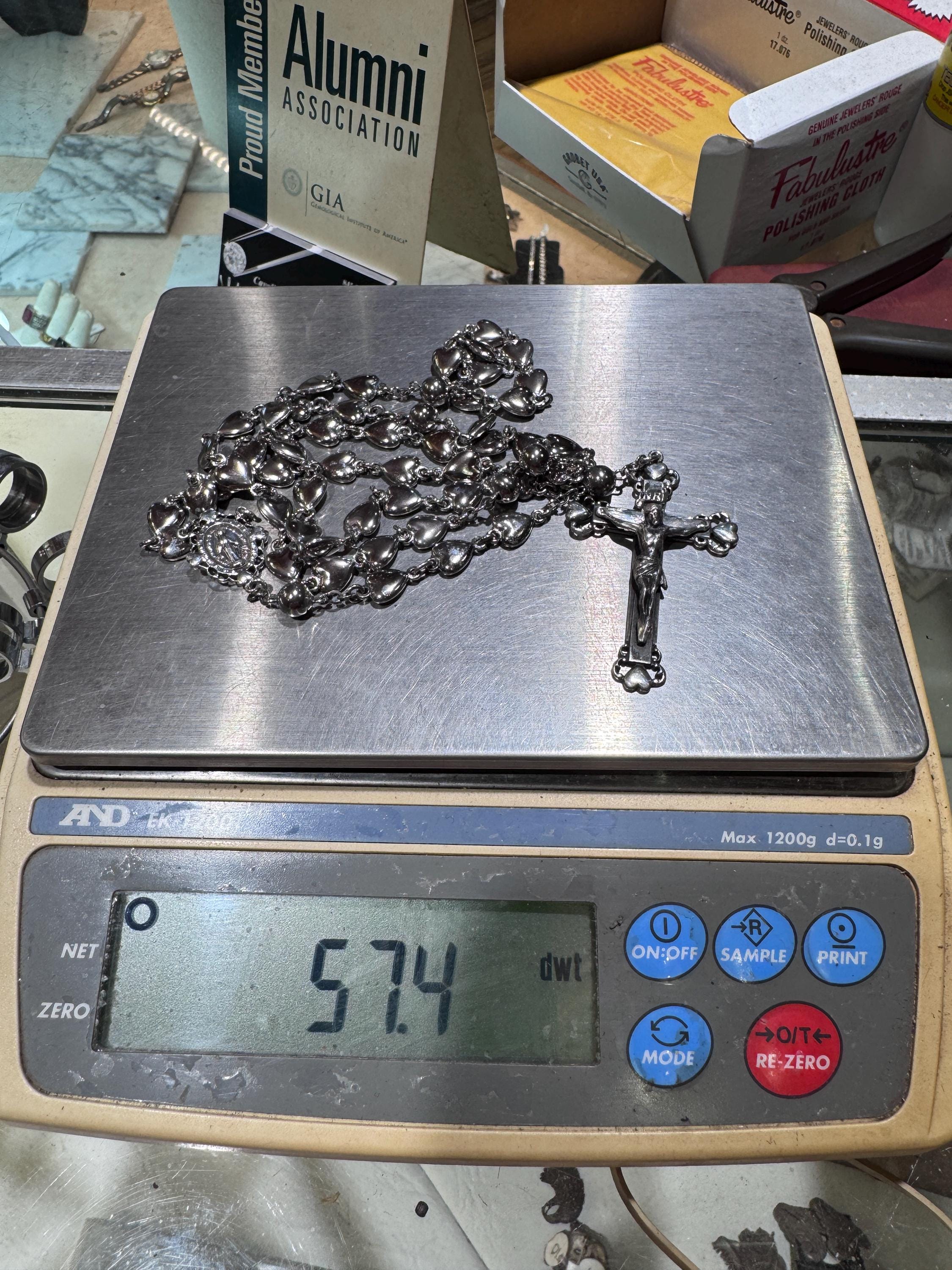 A vintage sterling silver rosary with heart shaped beads. Hallmarked Hayward this is a heavy set! Weighing in at 57.7 dwt or 89.73 grams, this is a vintage and pre owned rosary, sold as is in great ready to use condition. The beads feel good in your hands!