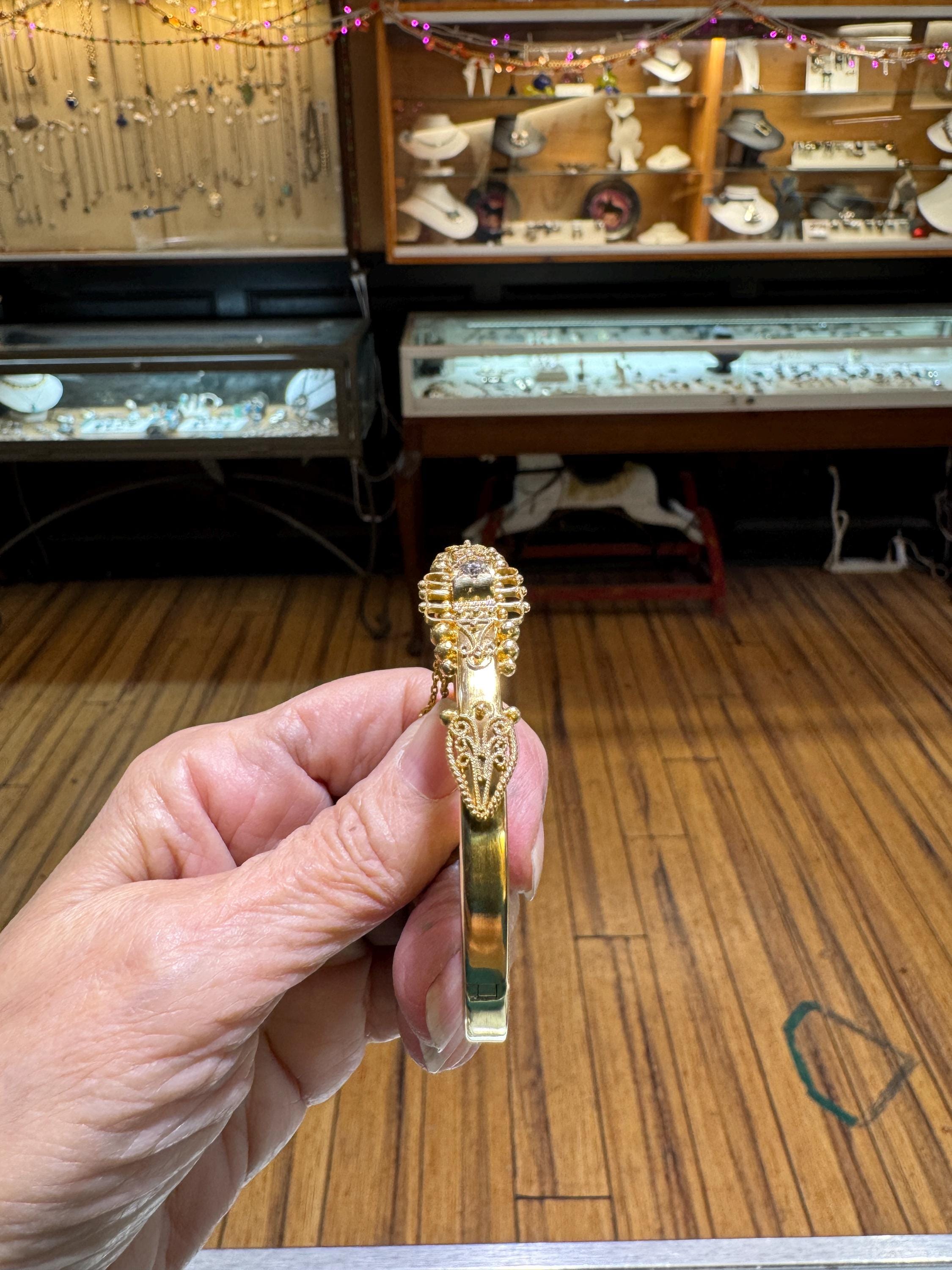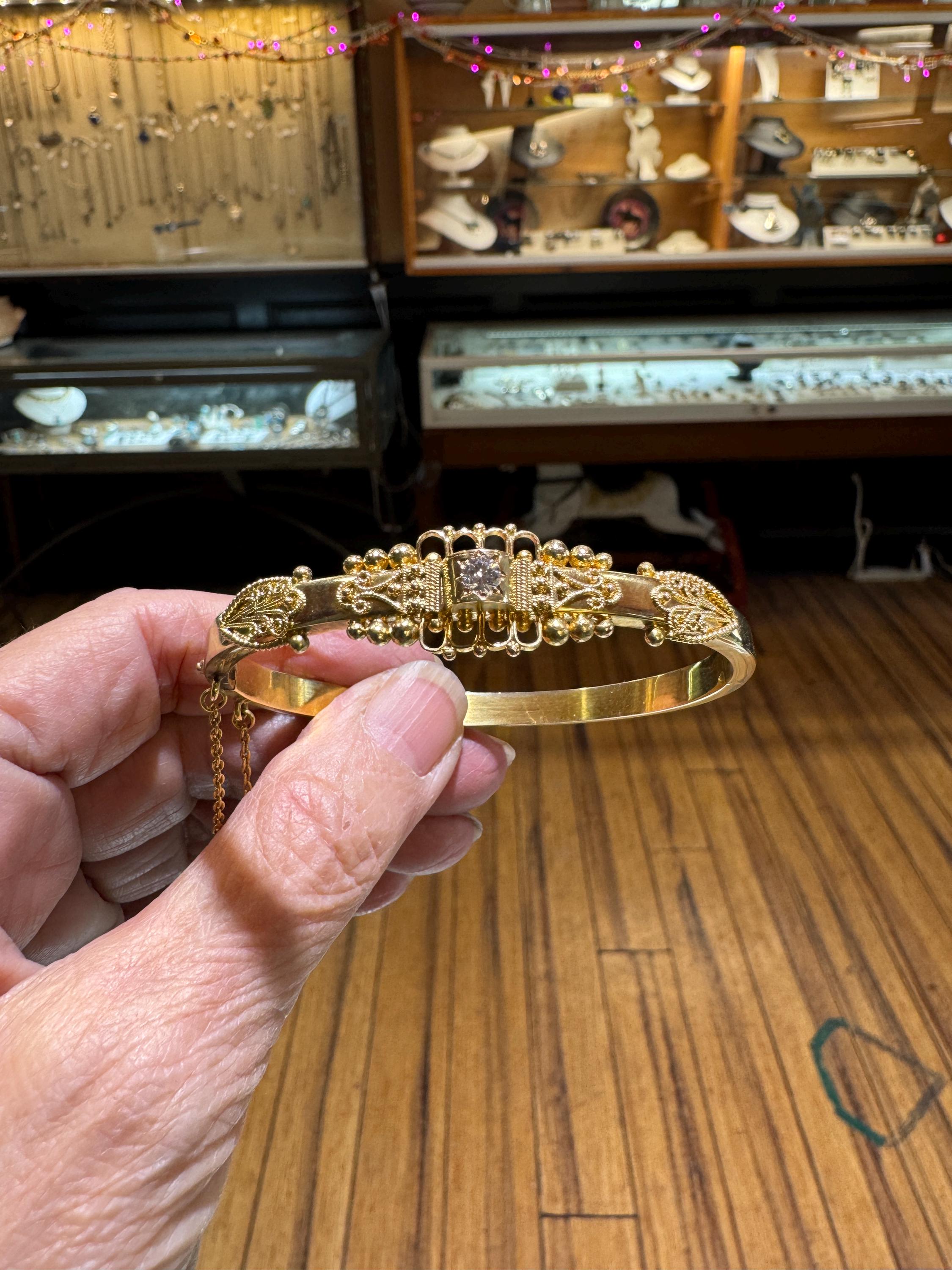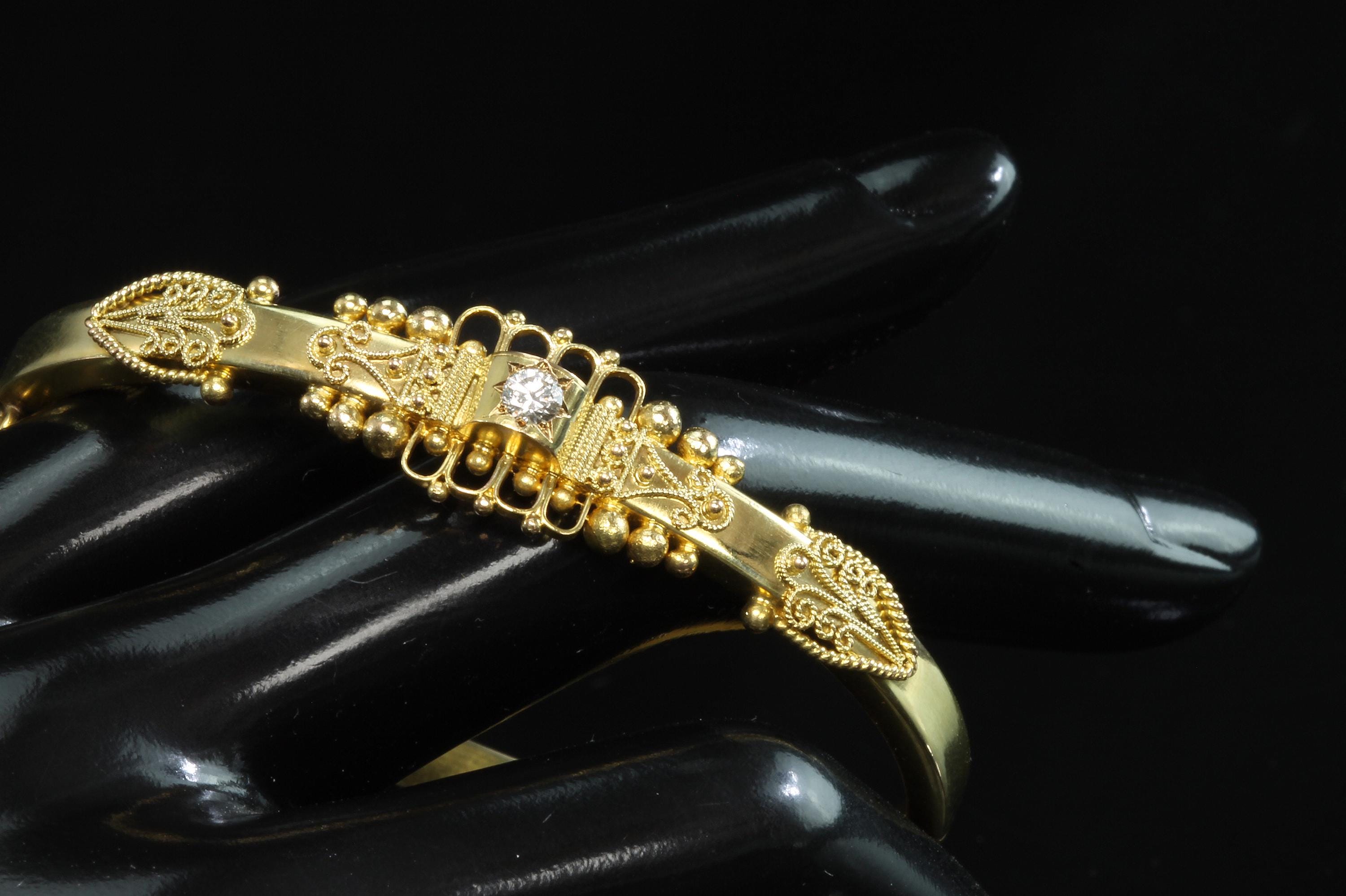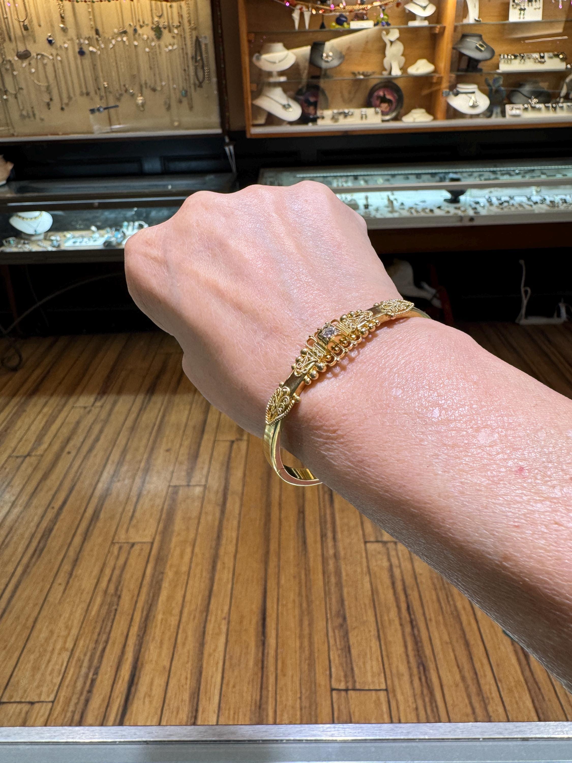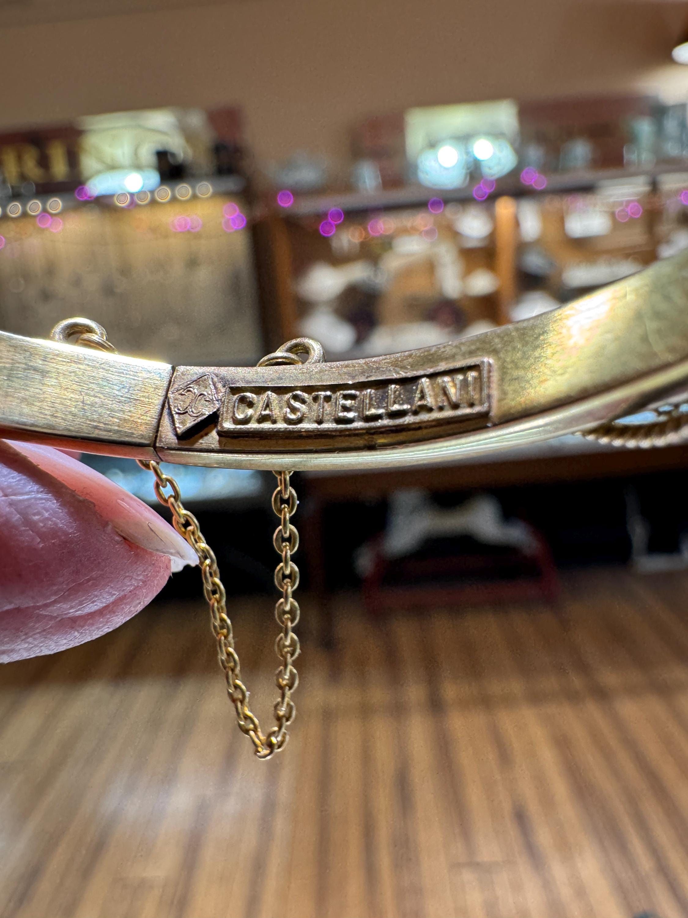 An amazing estate find! A looking like new 15K (yes, fifteen karat!) rather ornate bangle bracelet by the prestigious Italian Castellani Jewelers. Castellani was the jeweler who started the archeaological revival themed jewellery of the mid 19Th century. This bracelet is a great example of that Etruscan revival period. Featuring ornate designs and a .25ct eye clean diamond. Regal but not over the top. This bracelet weighs in at 7.8 dwt or 12.13 grams. This is a vintage and pre owned bracelet, sold as is in fabulous ready to wear condition.