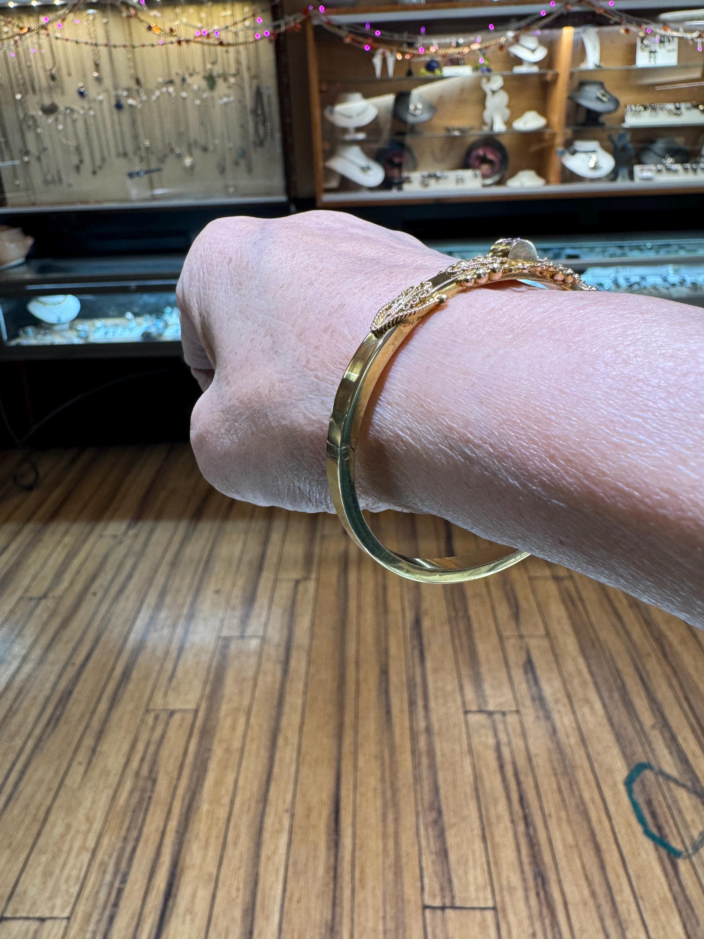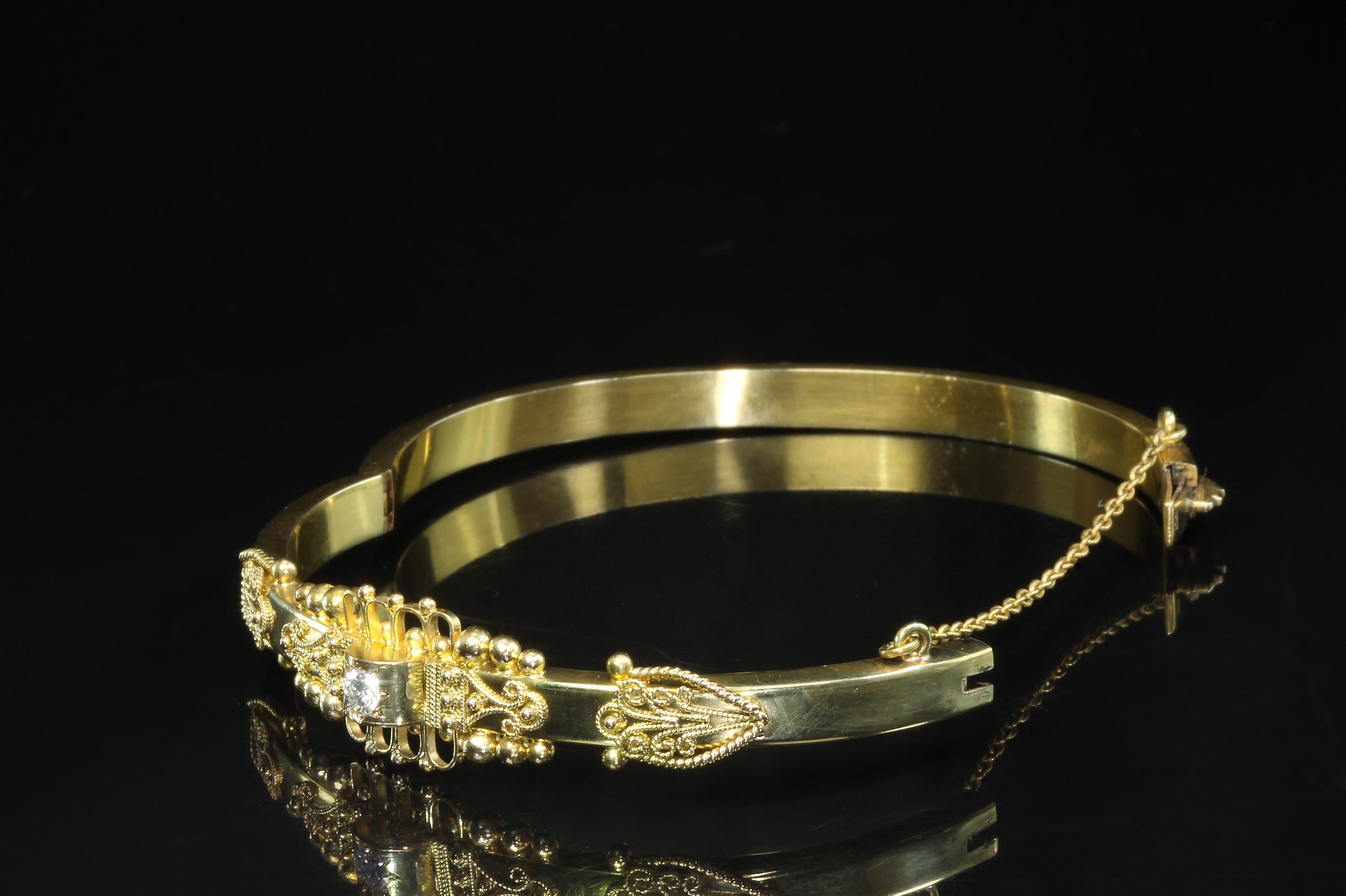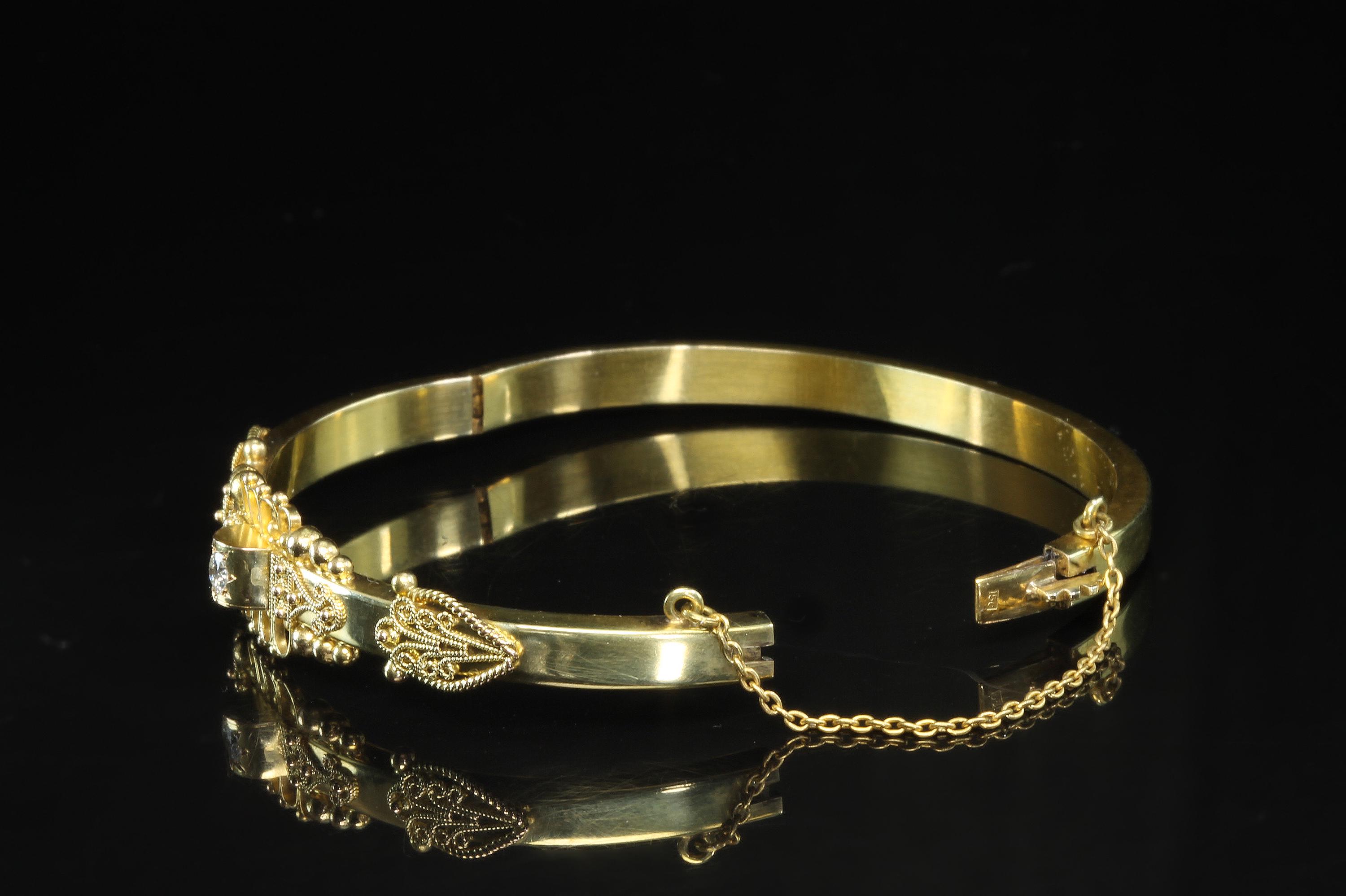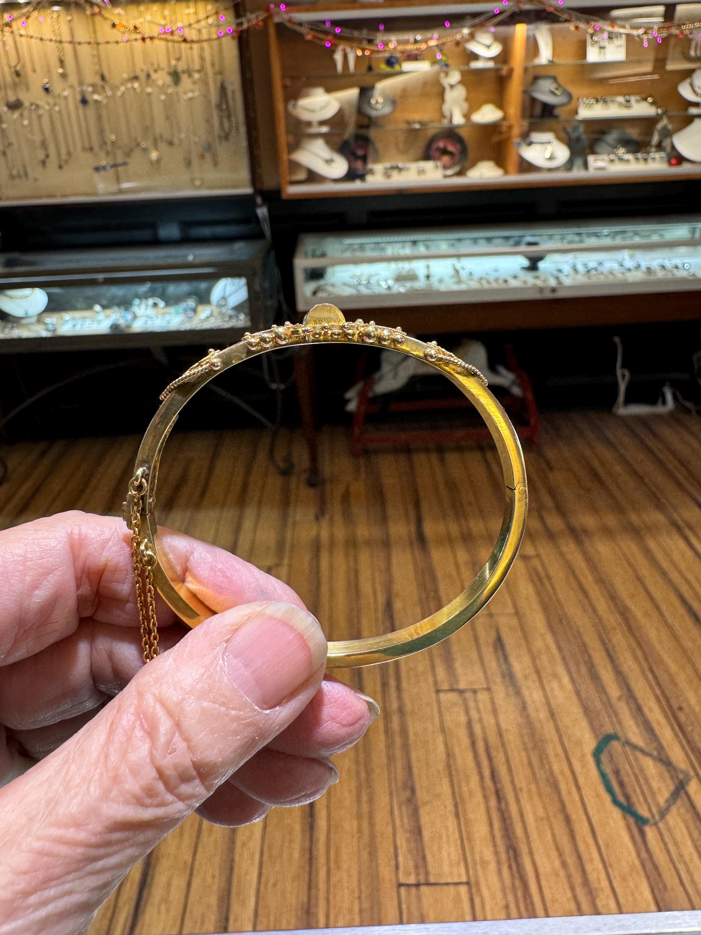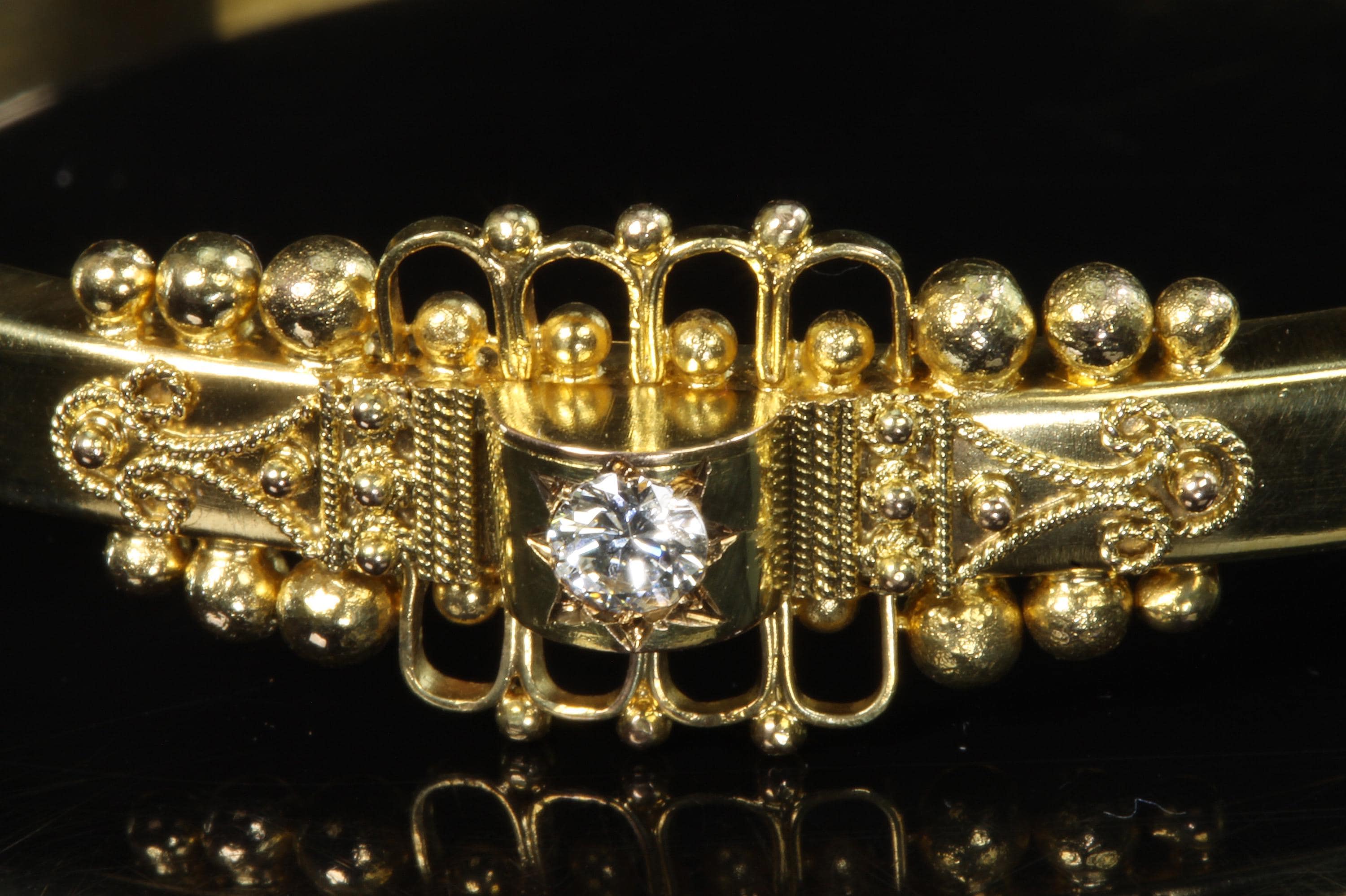 An amazing estate find! A looking like new 15K (yes, fifteen karat!) rather ornate bangle bracelet by the prestigious Italian Castellani Jewelers. Castellani was the jeweler who started the archeaological revival themed jewellery of the mid 19Th century. This bracelet is a great example of that Etruscan revival period. Featuring ornate designs and a .25ct eye clean diamond. Regal but not over the top. This bracelet weighs in at 7.8 dwt or 12.13 grams. This is a vintage and pre owned bracelet, sold as is in fabulous ready to wear condition.