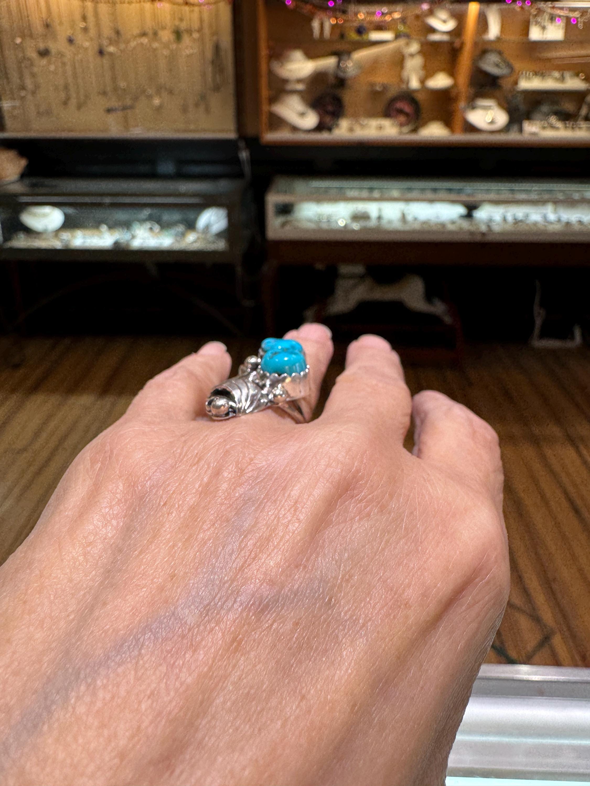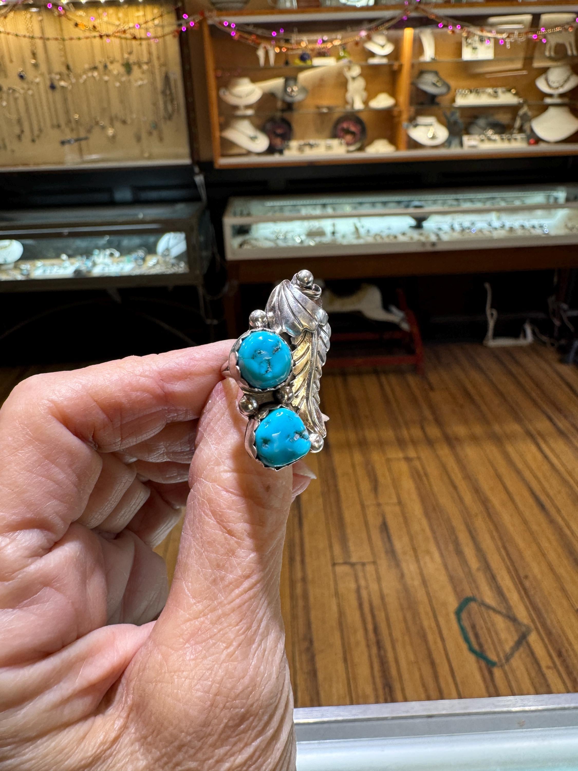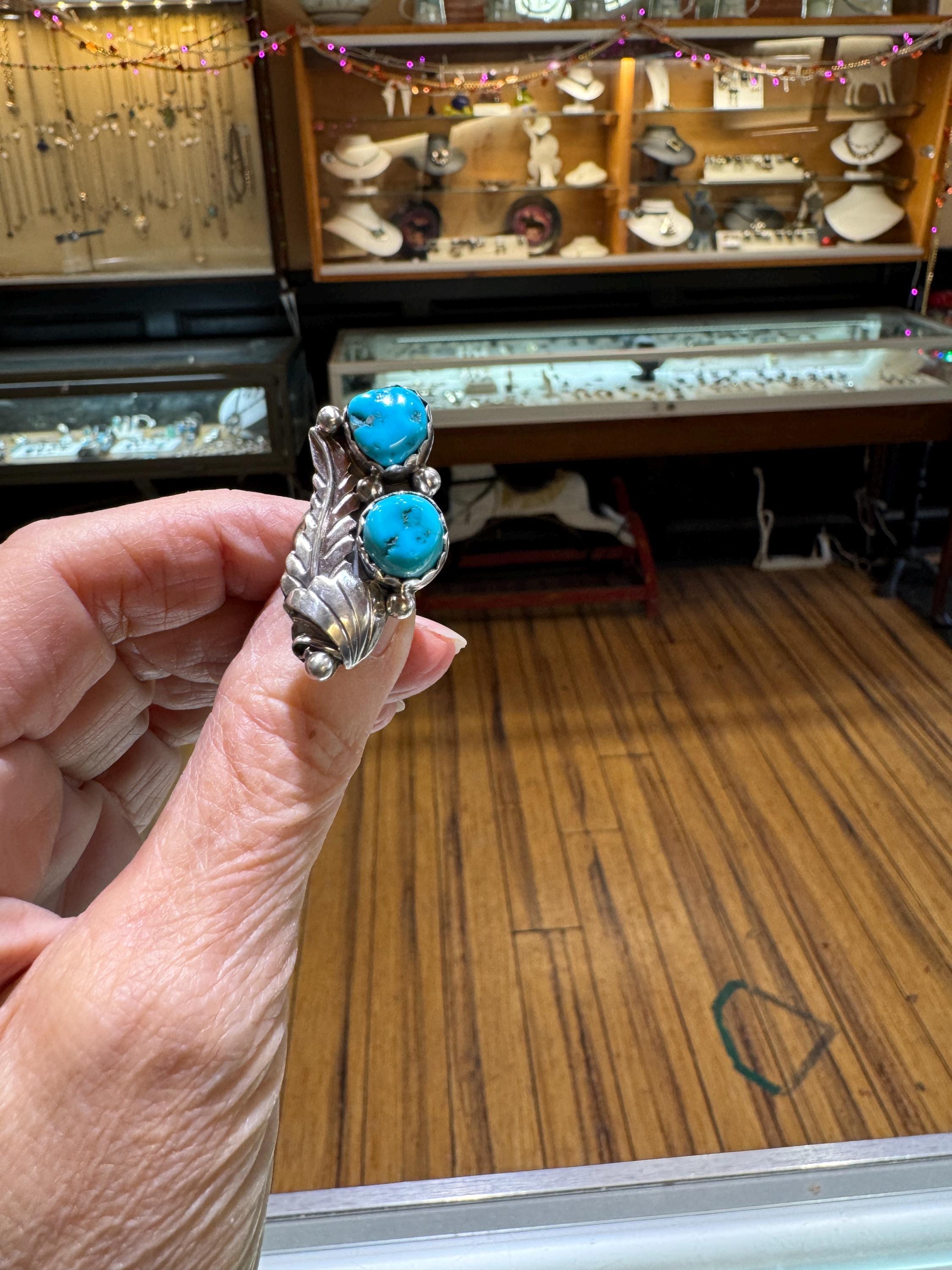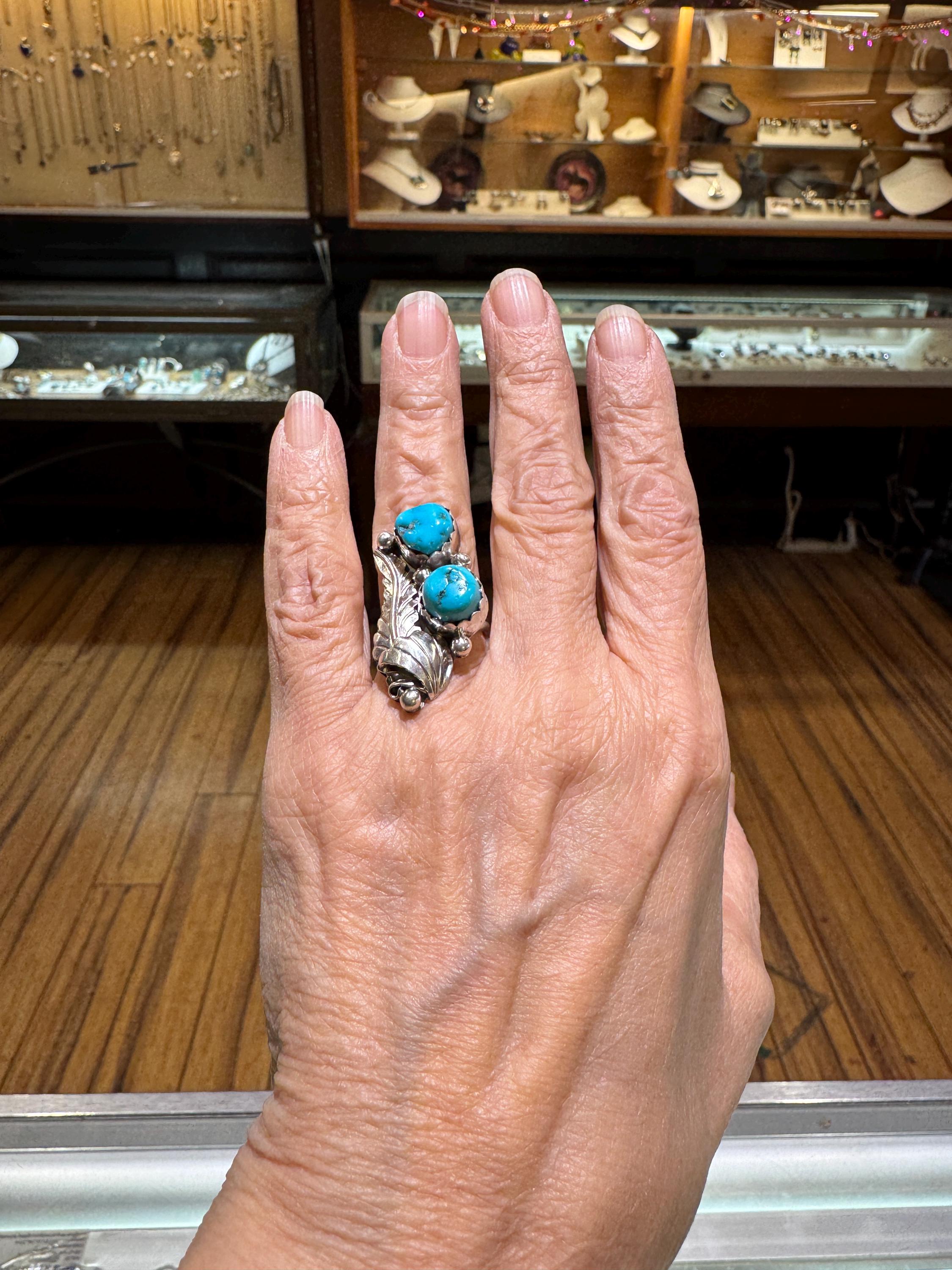 A beautiful blue turquoise feather motif sterling silver ring. Possibly Navajo. Definitely southwestern! This is a vintage and pre owned ring, sold as is in great ready to wear condition. Currently a size 6.5 we will size this ring up to a size 7.5 free of charge. If you need this ring to be larger than a 7.5 please contact us before ordering.