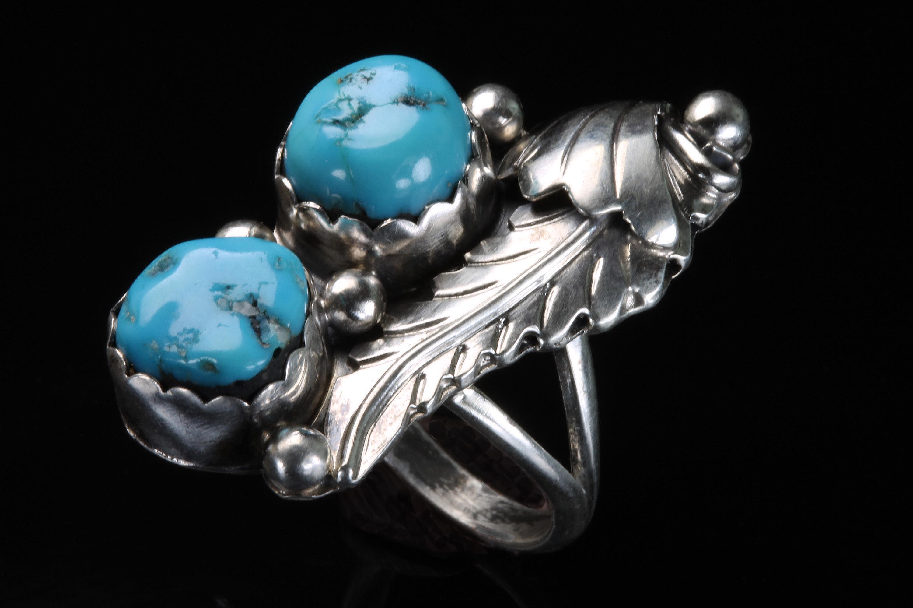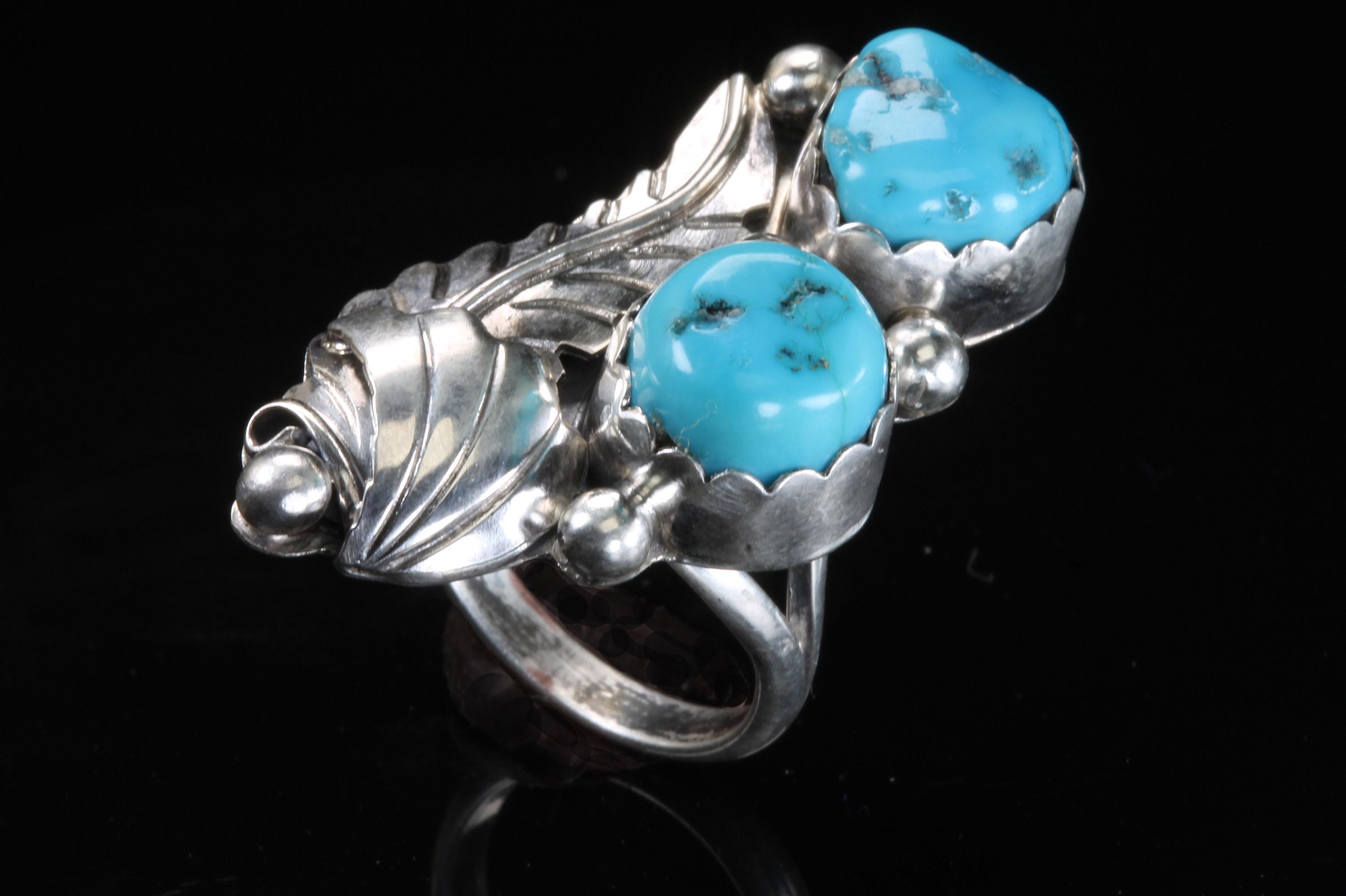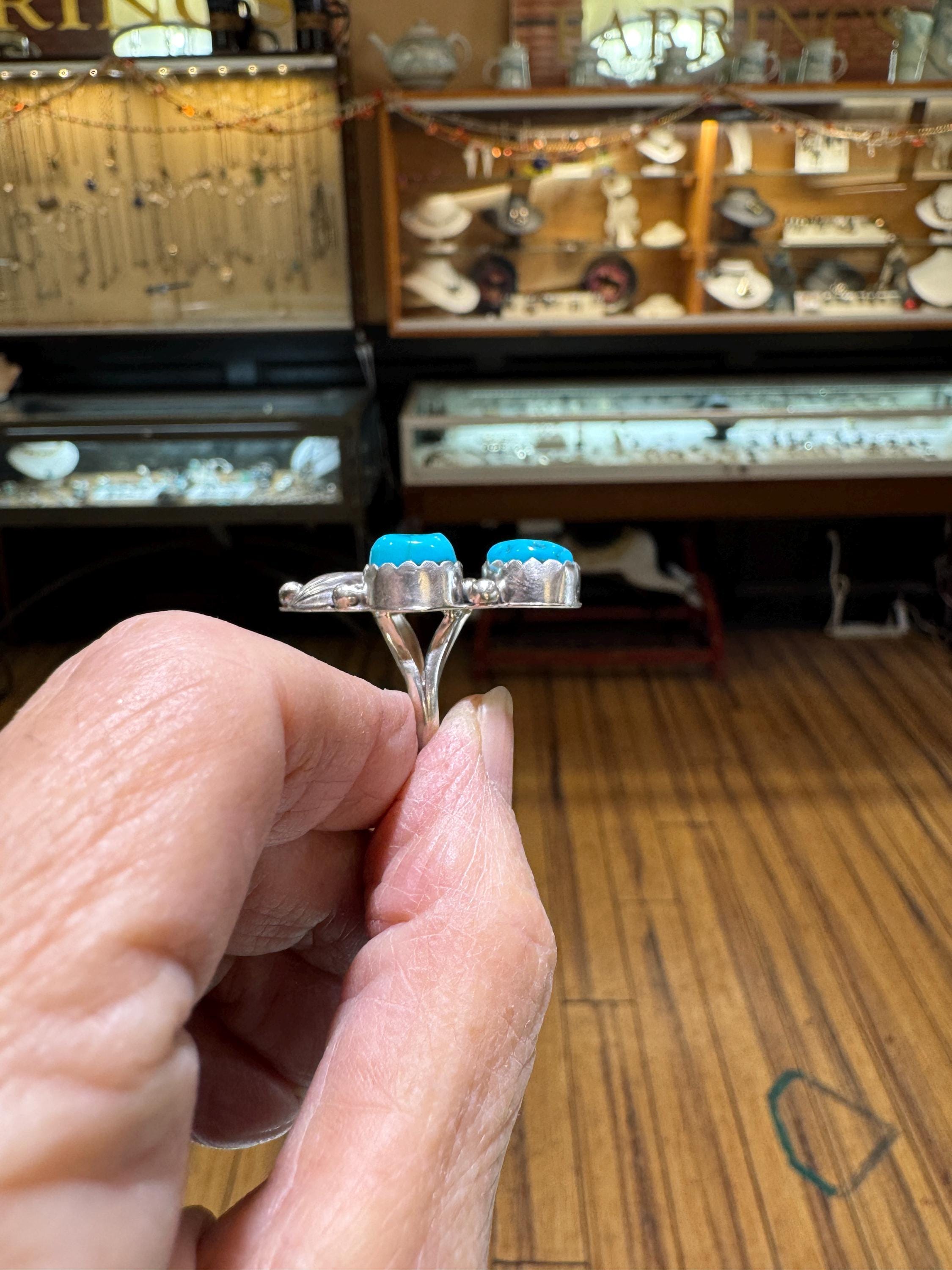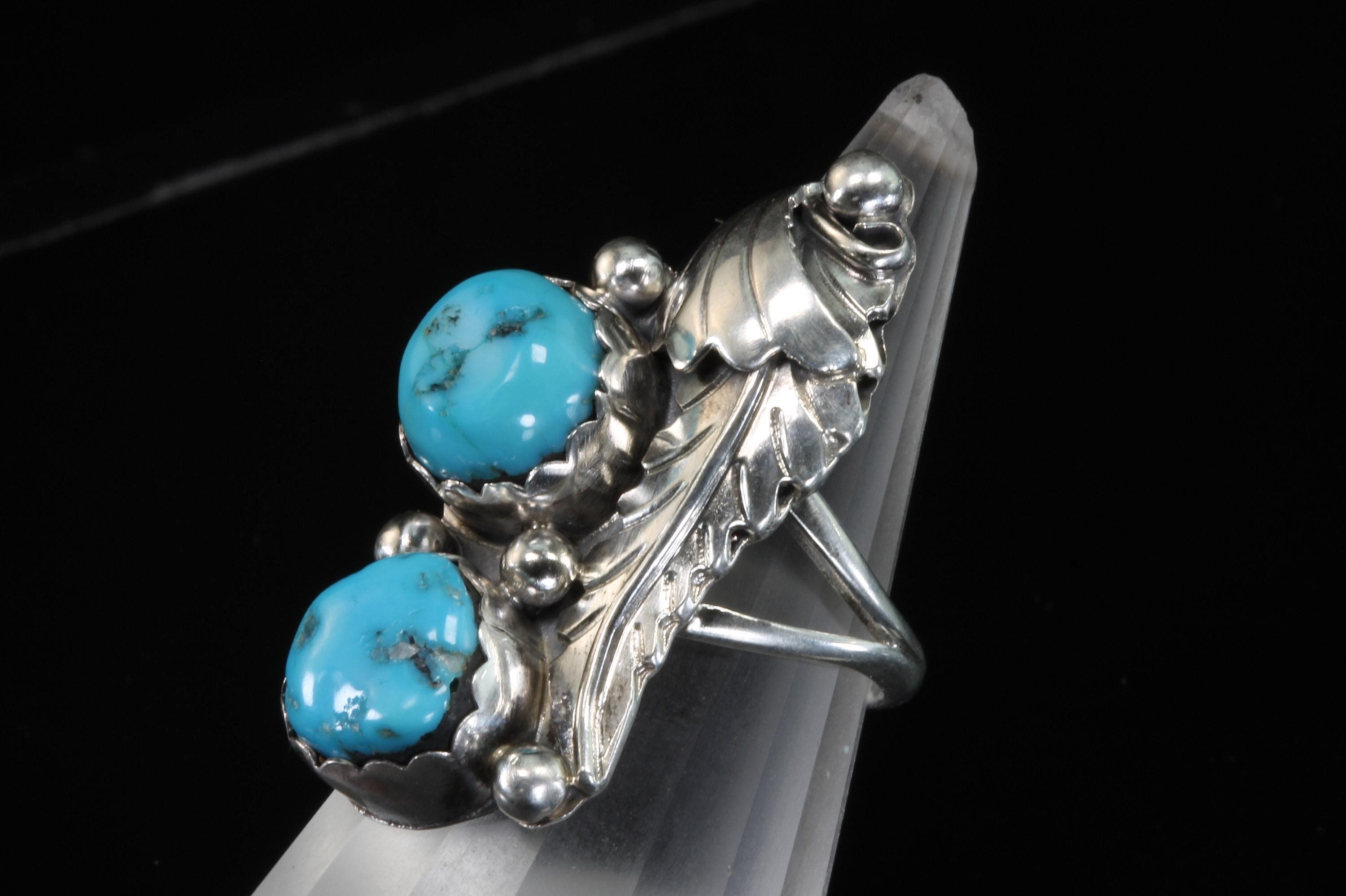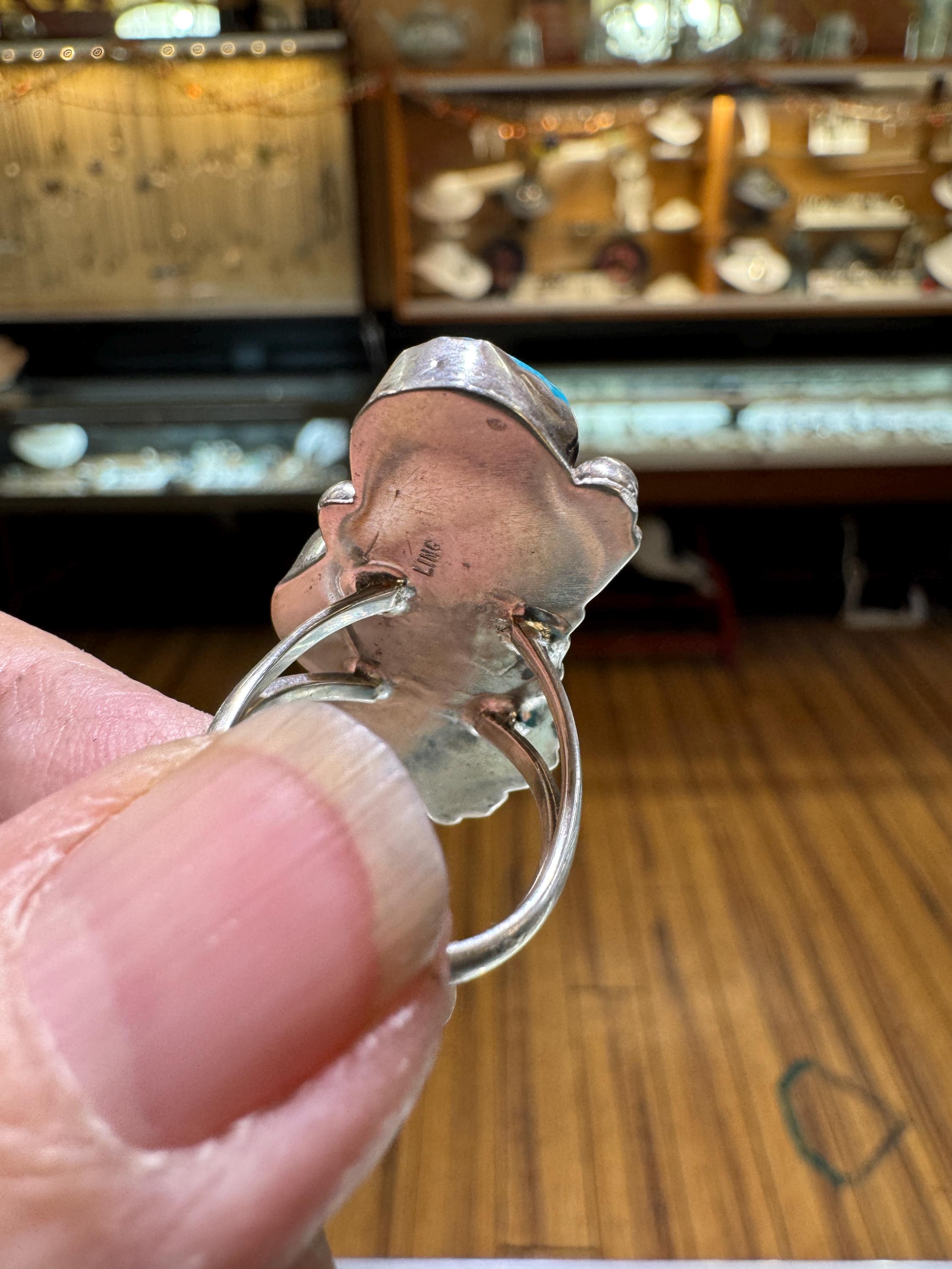 A beautiful blue turquoise feather motif sterling silver ring. Possibly Navajo. Definitely southwestern! This is a vintage and pre owned ring, sold as is in great ready to wear condition. Currently a size 6.5 we will size this ring up to a size 7.5 free of charge. If you need this ring to be larger than a 7.5 please contact us before ordering.