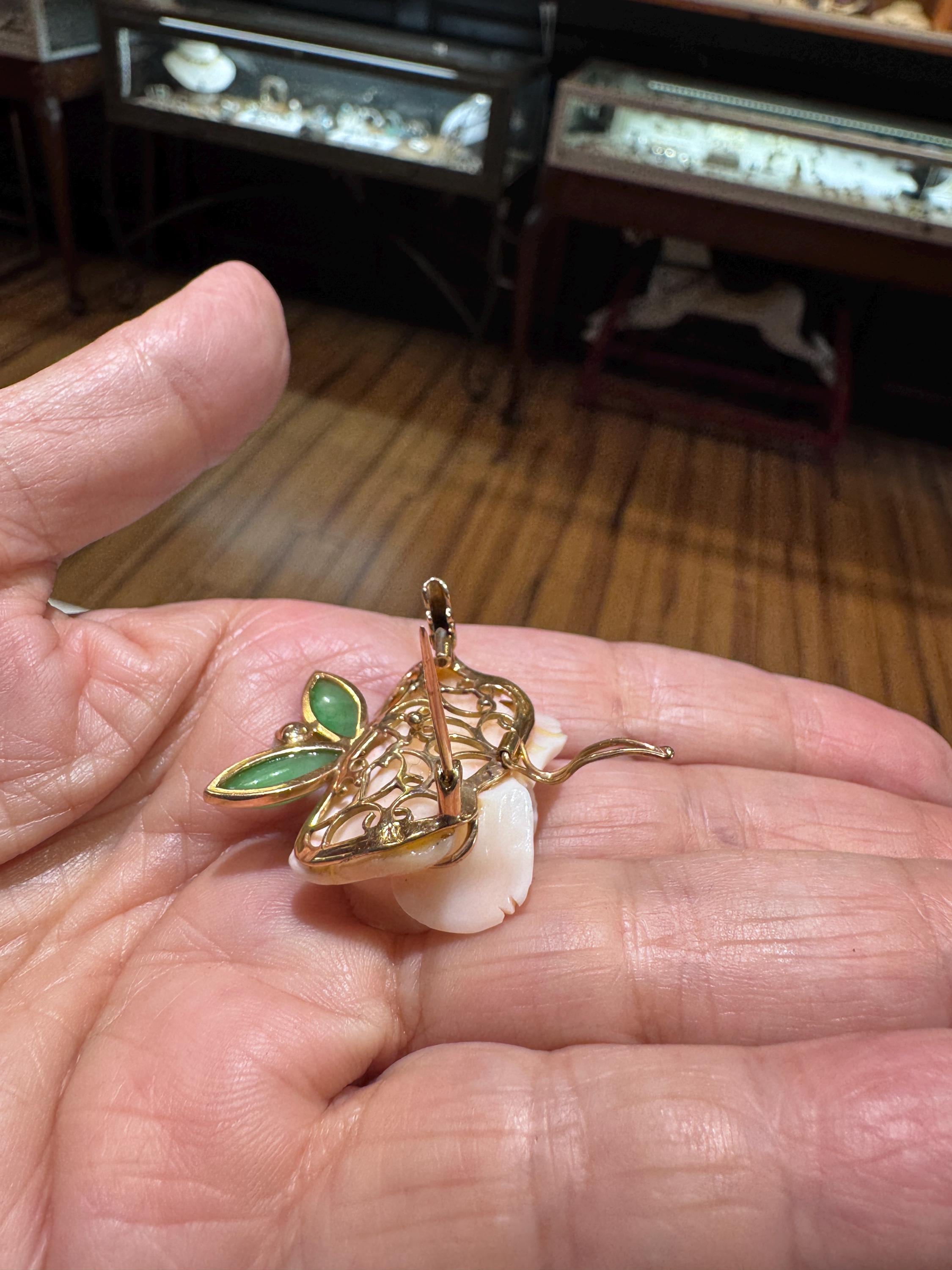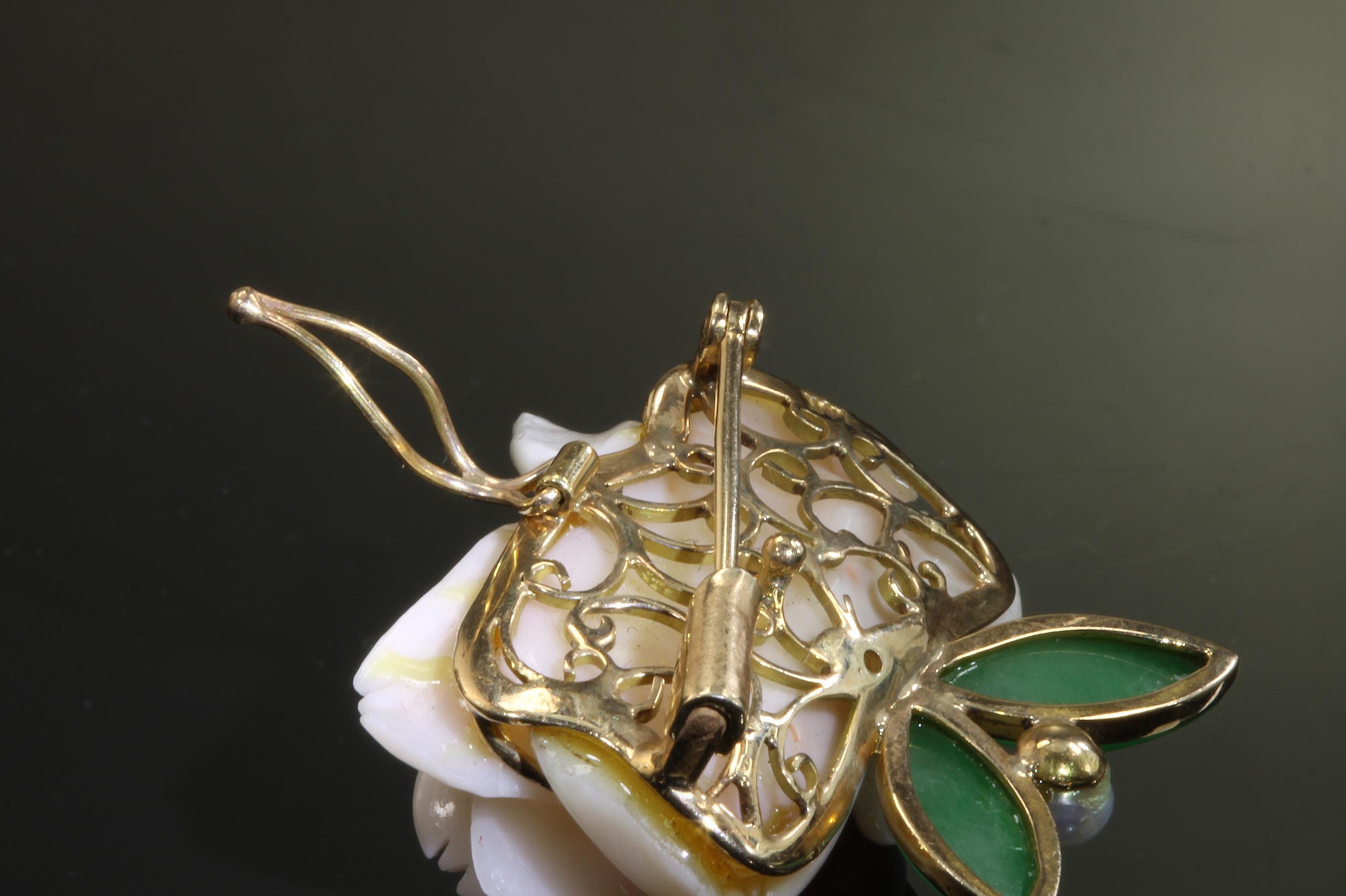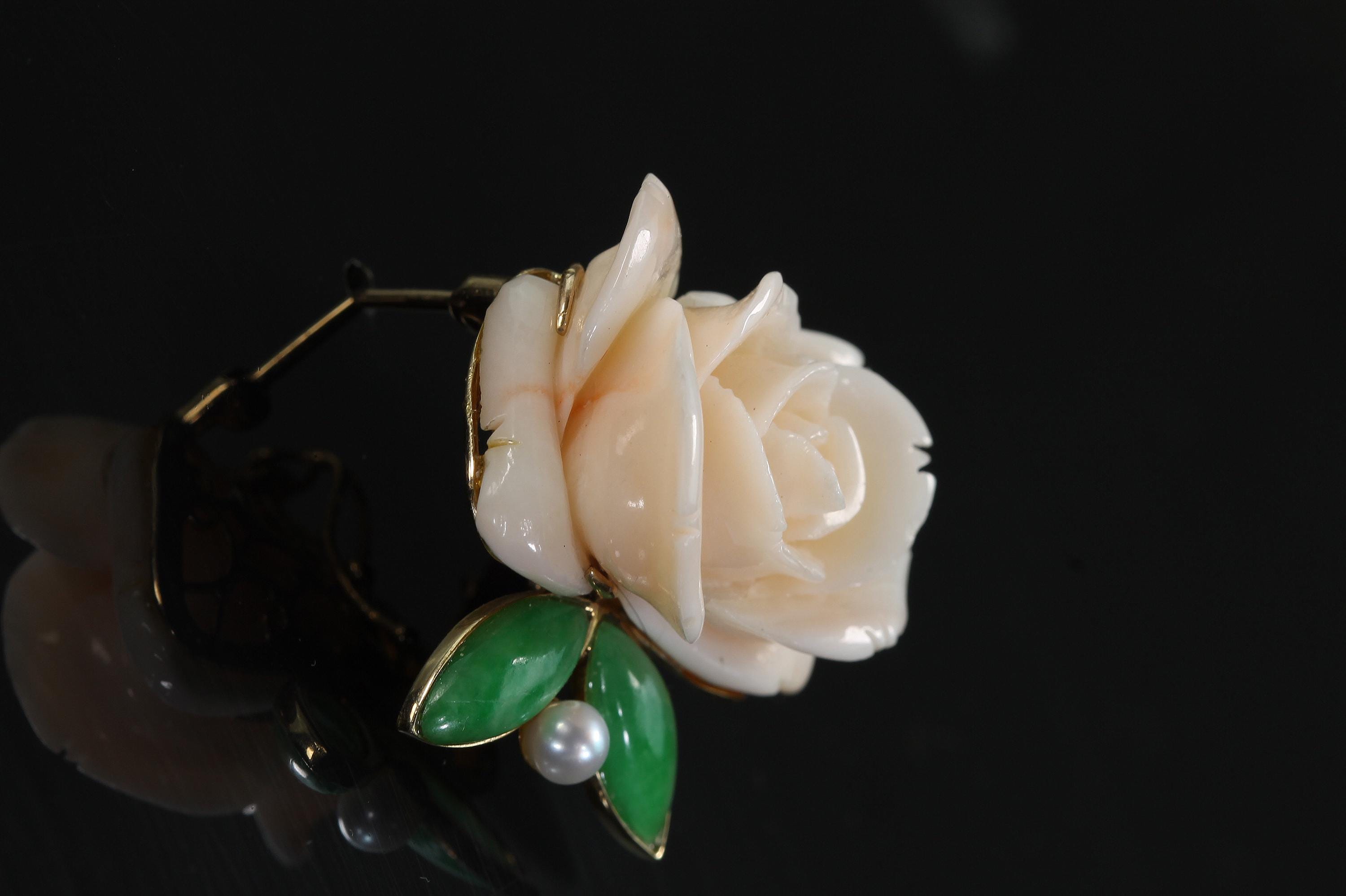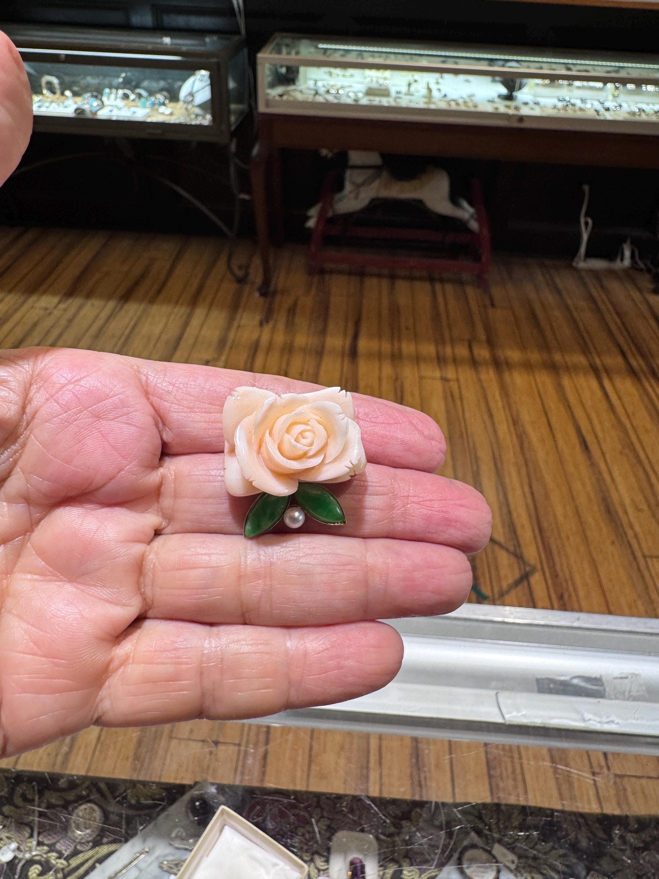 What a fabulous find! This 14K yellow gold brooch/pearl enhancer features a stunning carved rose made from angel sling coral. Jade or jadeite leaves a natural pearl round out the look! A great way to give a flower that will never fade! This is a vintage and pre owned brooch/pearl enhancer, sold as is in great ready to wear condition. This brooch/pearl enhancer measures approximately 29mm x 29mm just slightly over an inch squared.