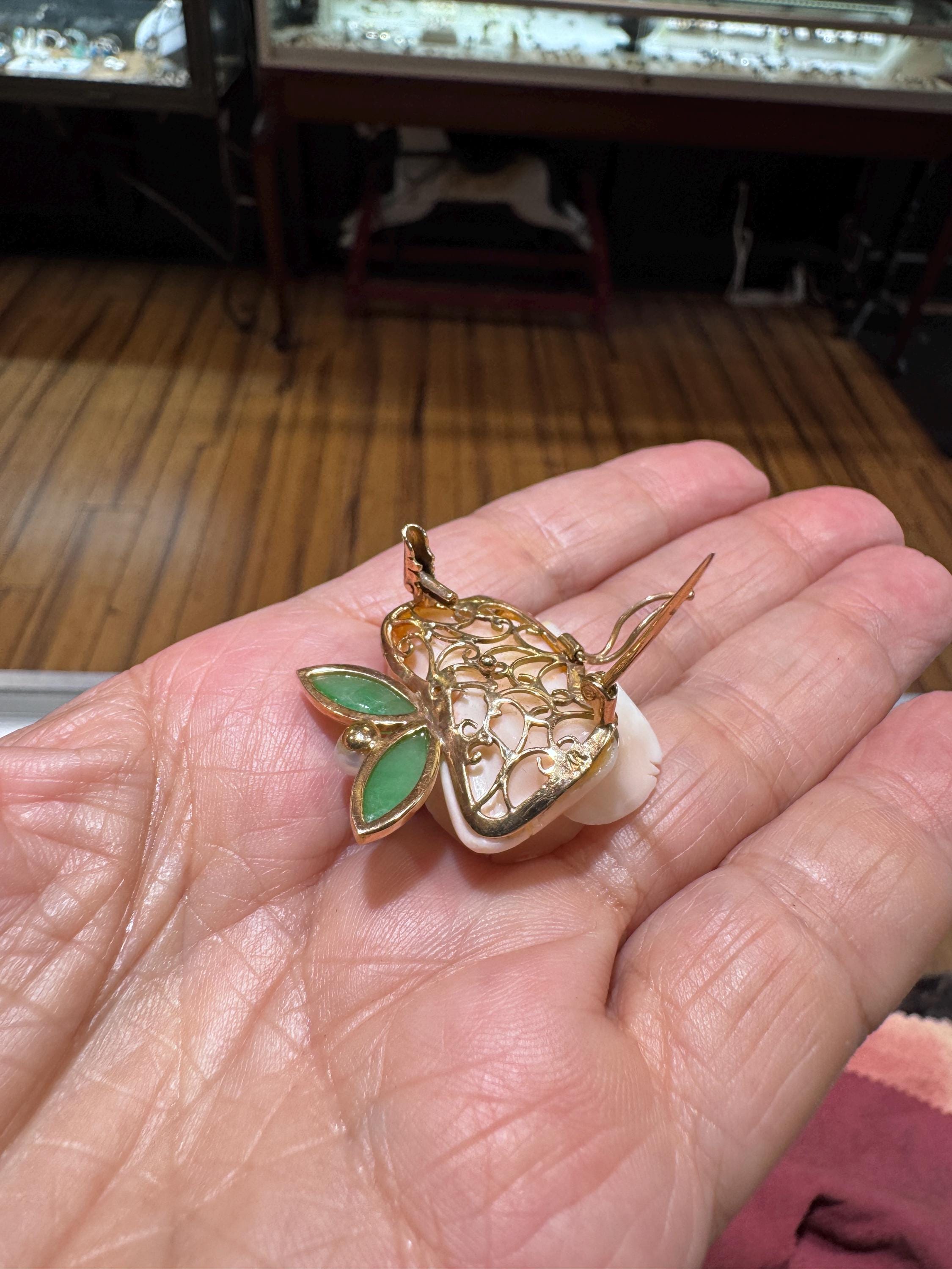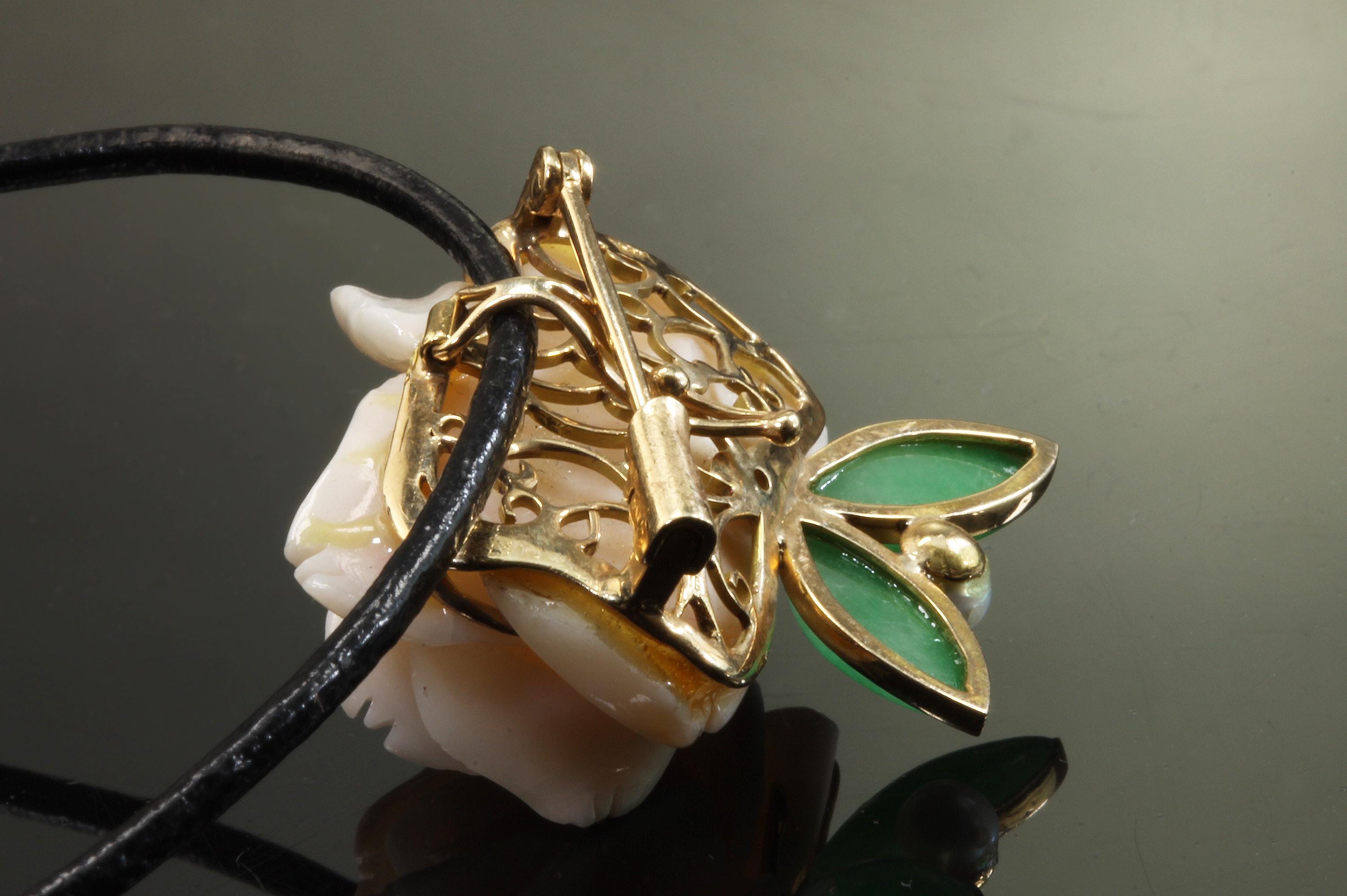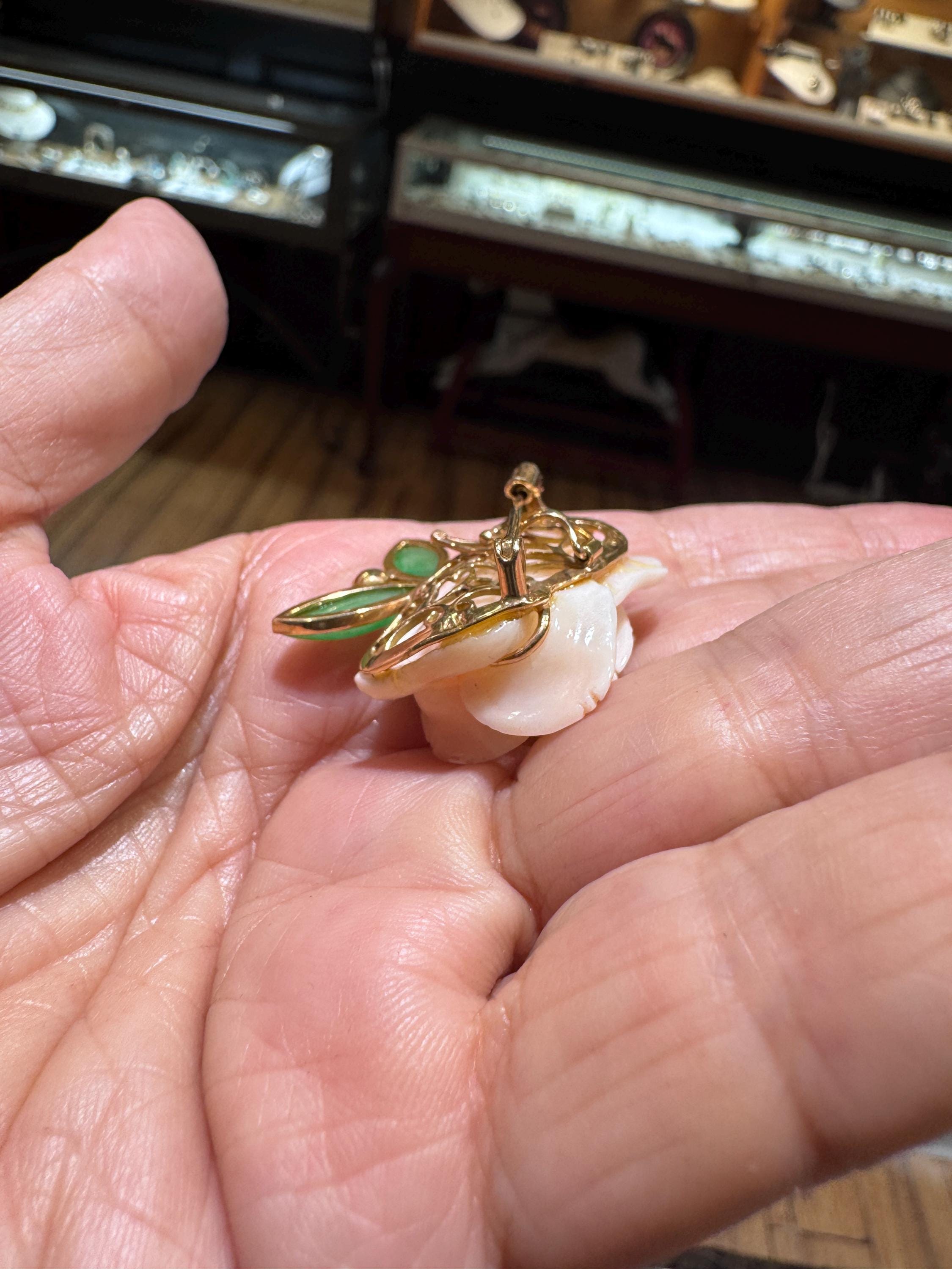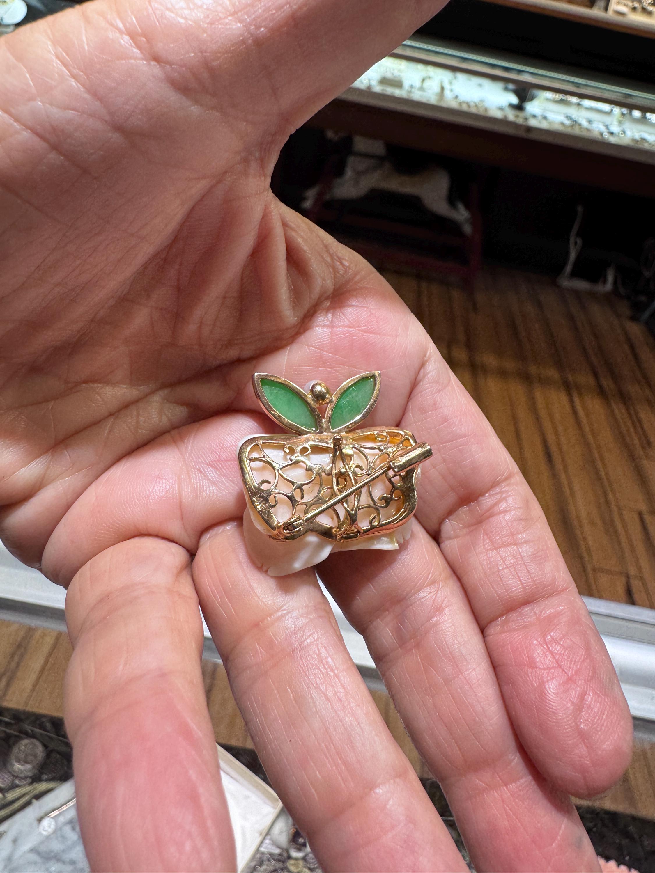 What a fabulous find! This 14K yellow gold brooch/pearl enhancer features a stunning carved rose made from angel sling coral. Jade or jadeite leaves a natural pearl round out the look! A great way to give a flower that will never fade! This is a vintage and pre owned brooch/pearl enhancer, sold as is in great ready to wear condition. This brooch/pearl enhancer measures approximately 29mm x 29mm just slightly over an inch squared.