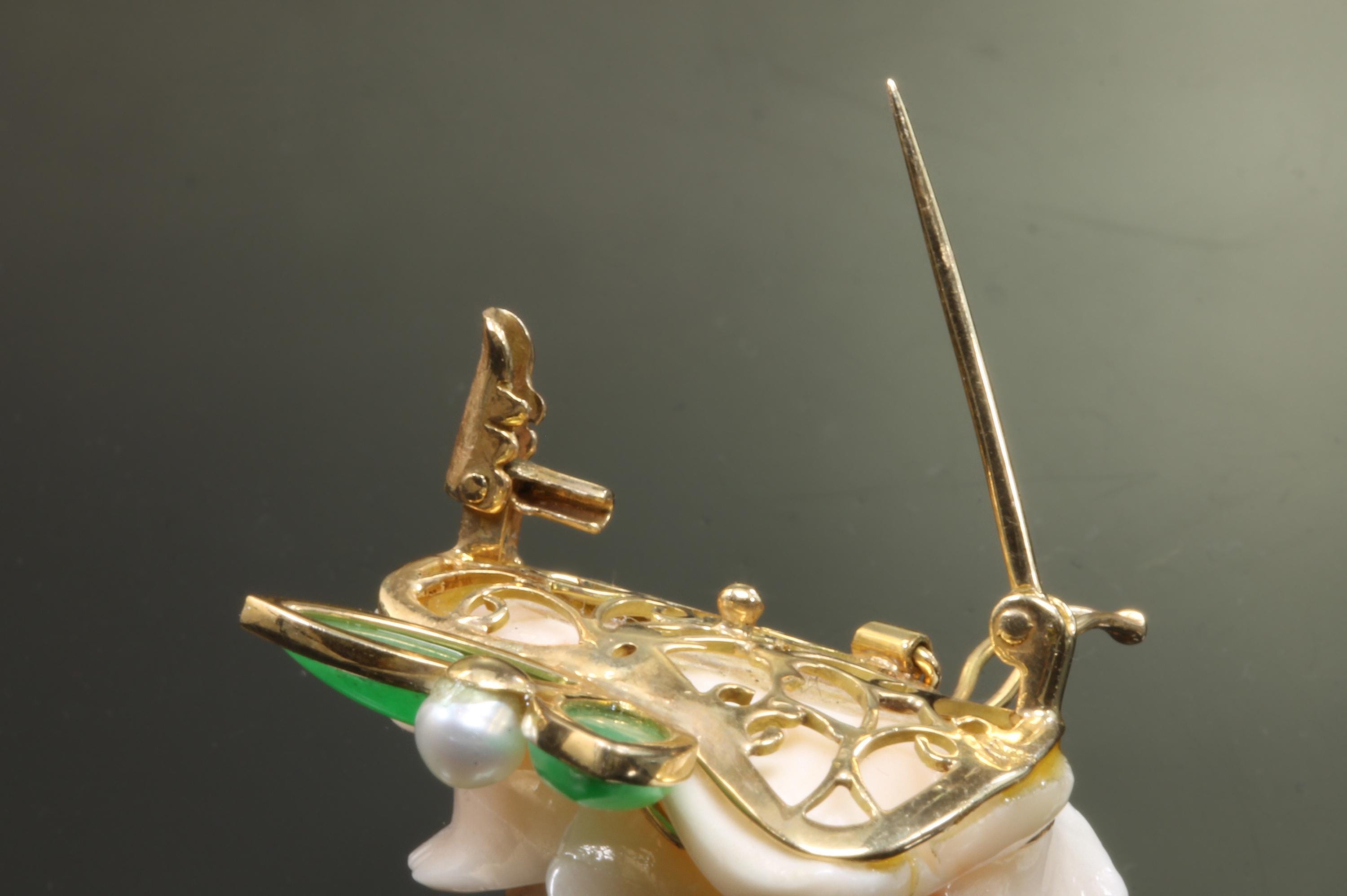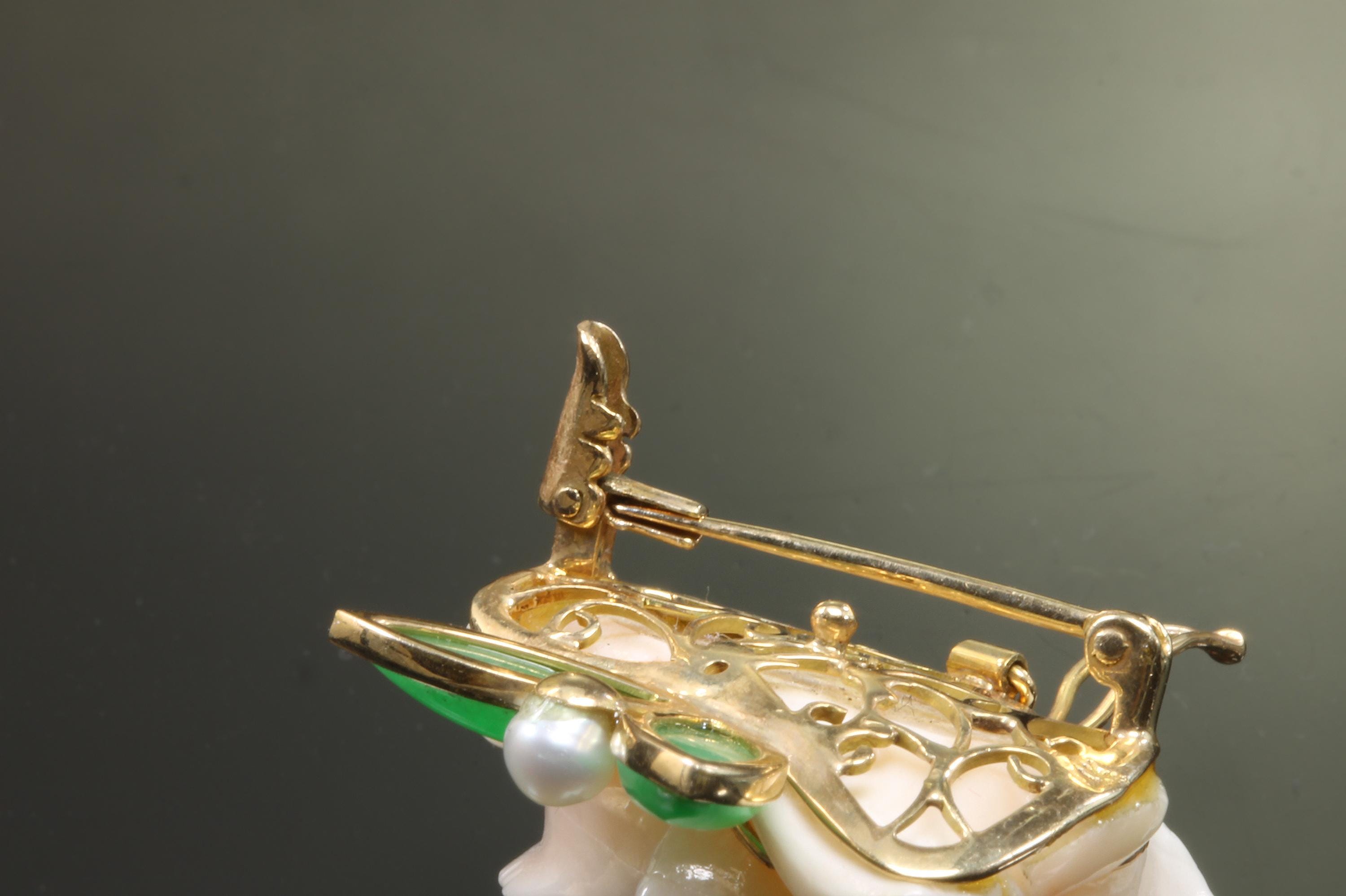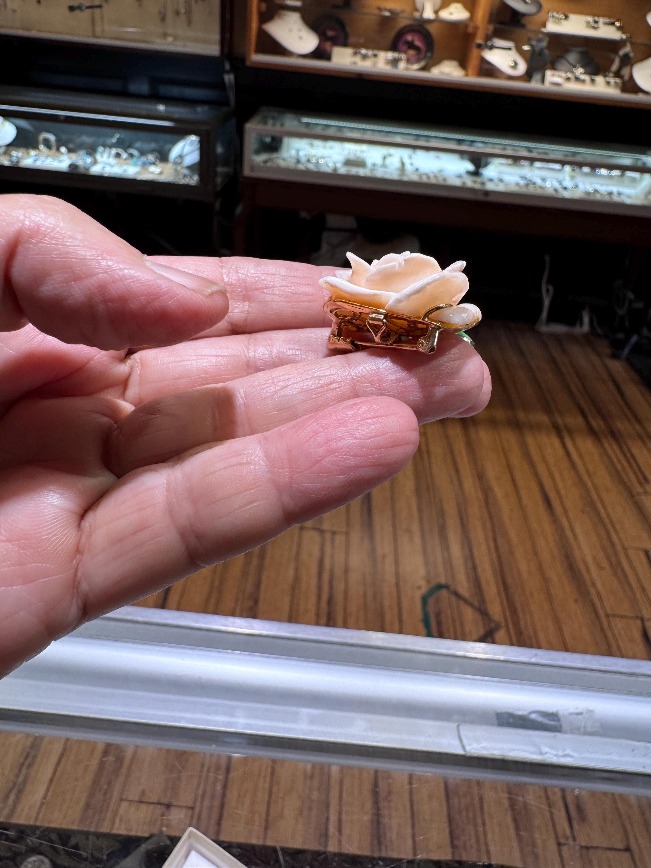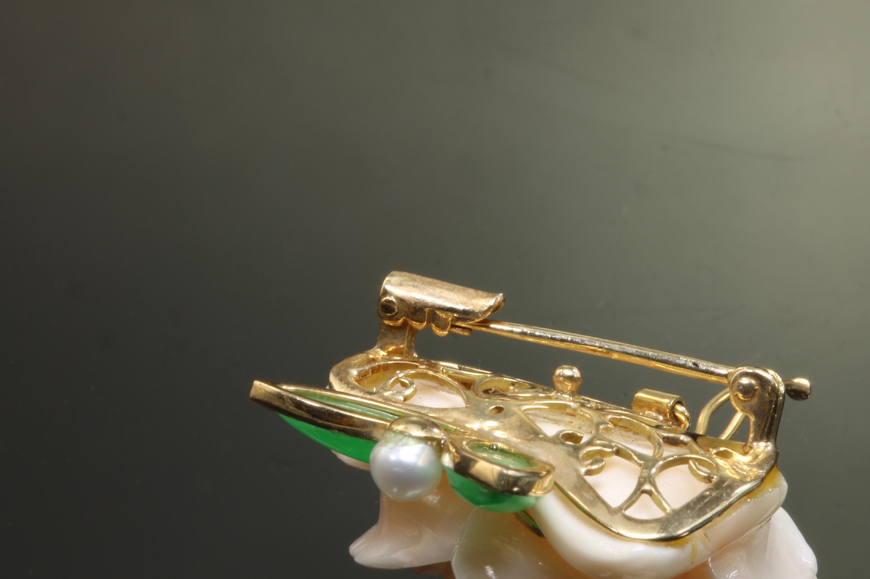 What a fabulous find! This 14K yellow gold brooch/pearl enhancer features a stunning carved rose made from angel sling coral. Jade or jadeite leaves a natural pearl round out the look! A great way to give a flower that will never fade! This is a vintage and pre owned brooch/pearl enhancer, sold as is in great ready to wear condition. This brooch/pearl enhancer measures approximately 29mm x 29mm just slightly over an inch squared.
