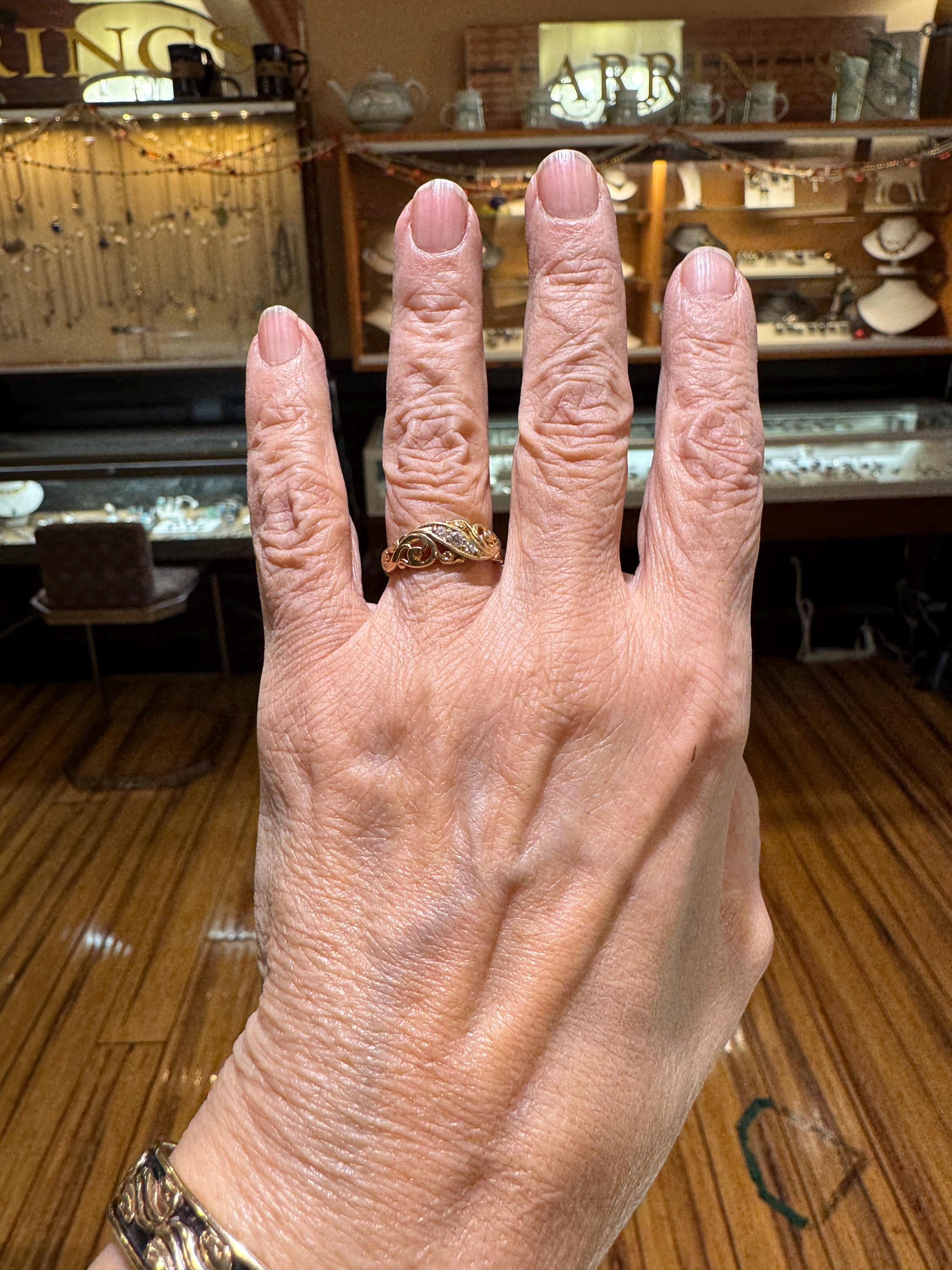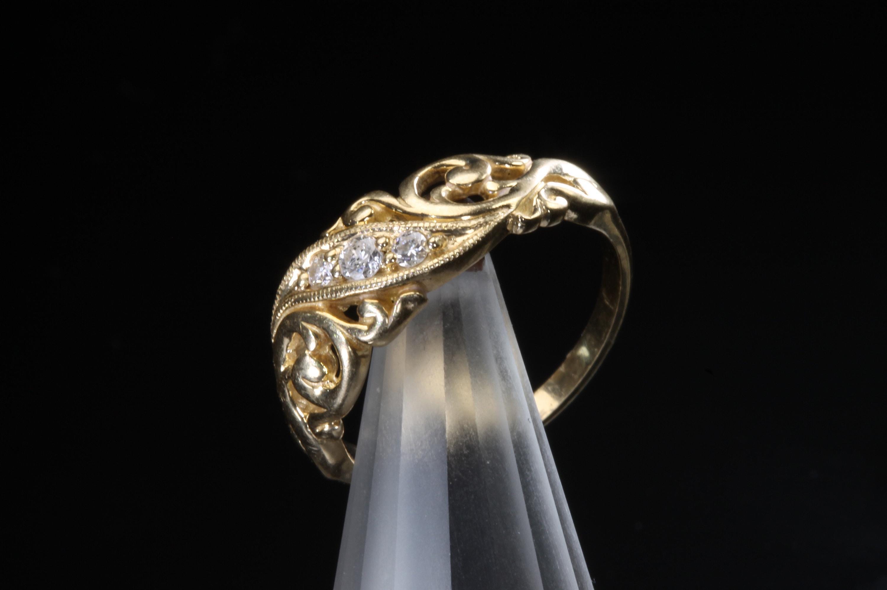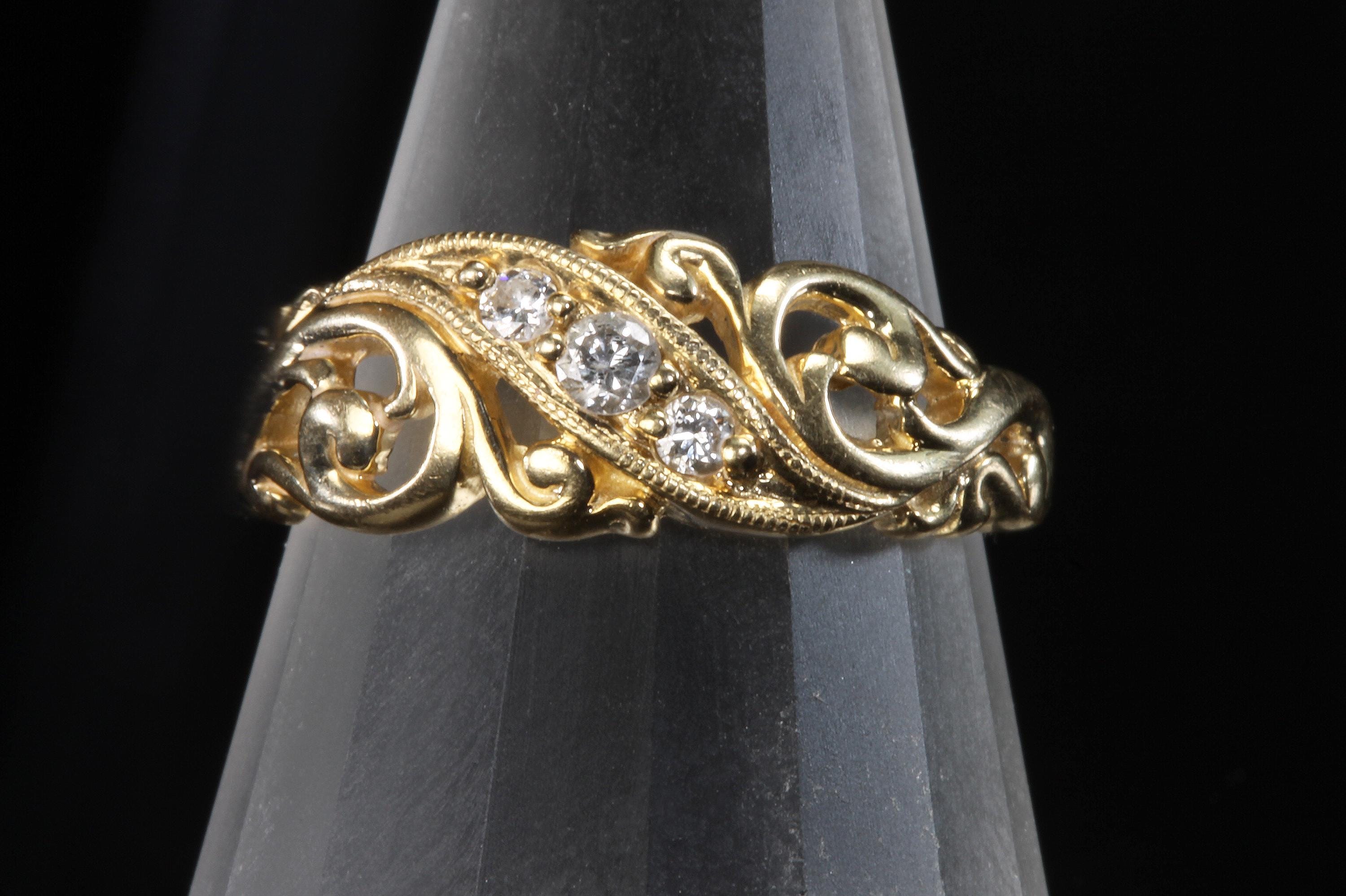 Fabulous filigree fantasy! This is a 14K yellow gold KBN hallmarked .09 ctw diamond ring. Everyday wear at its best! This is a vintage and pre owned ring, sold as is in great ready to wear condition. Currently a size 6.5 we will size this ring up to a size 7.5 free of size.