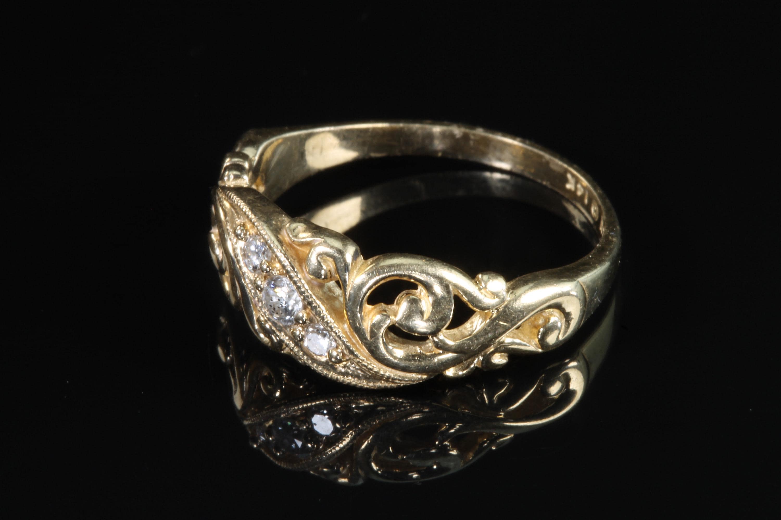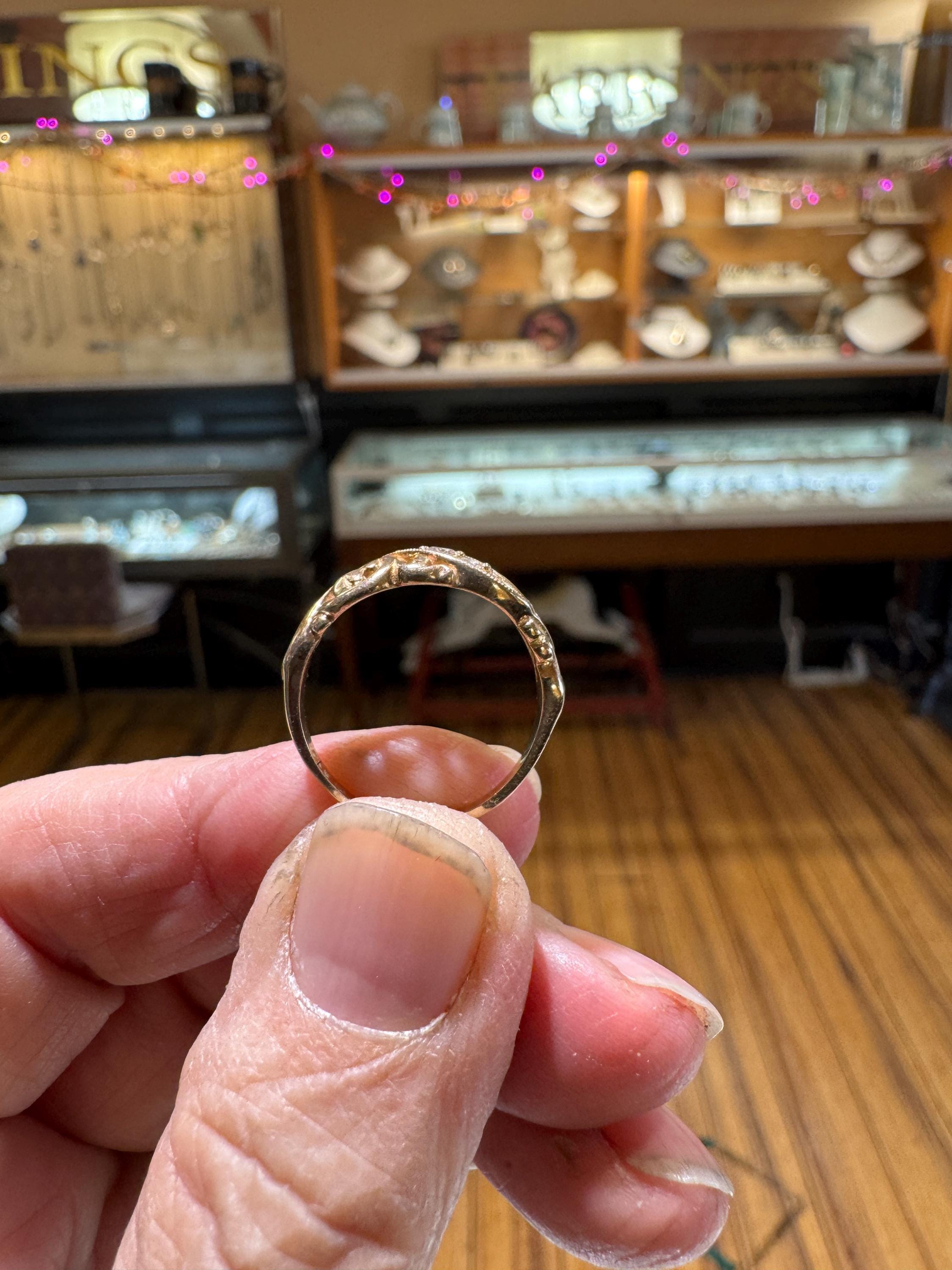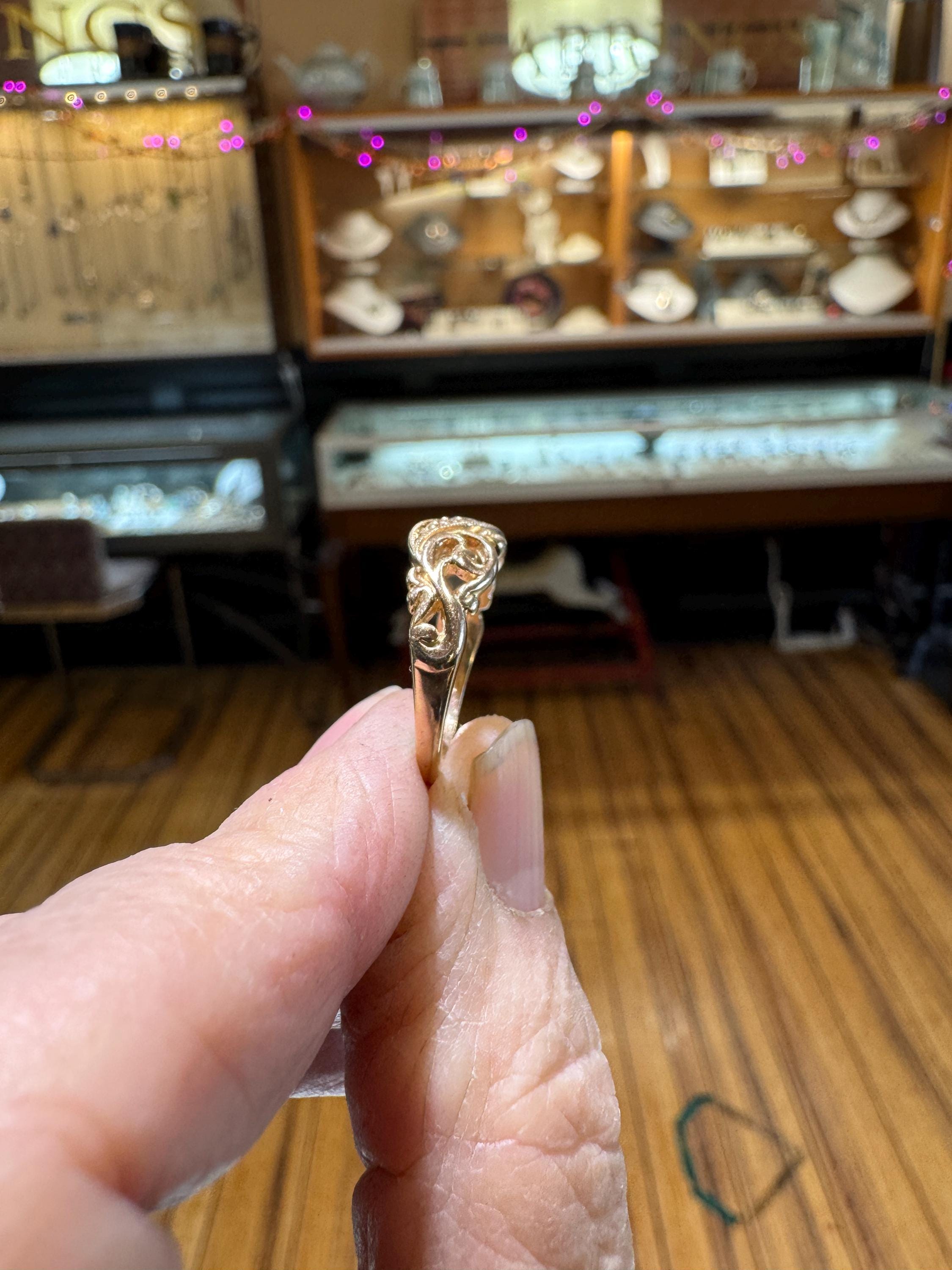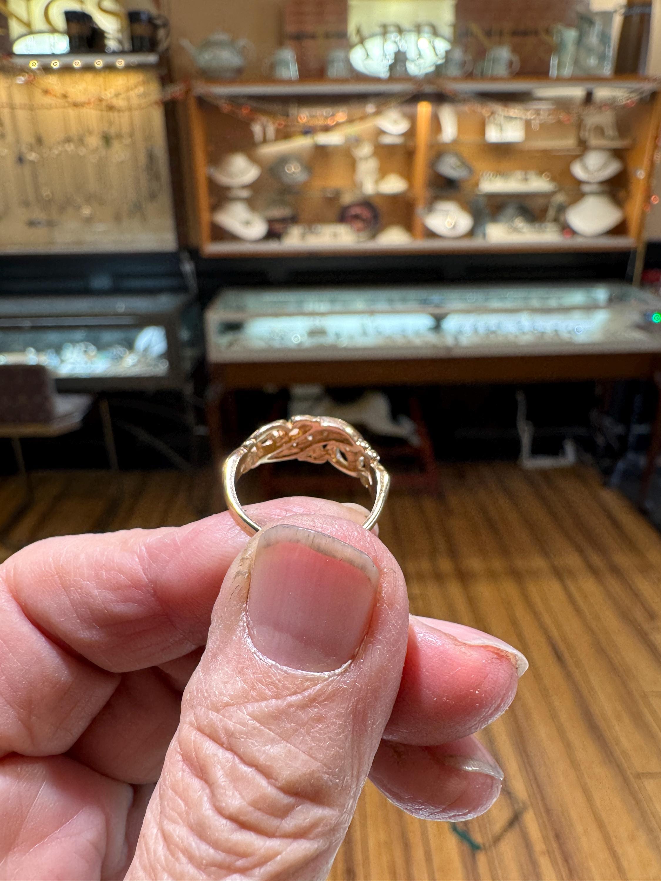 Fabulous filigree fantasy! This is a 14K yellow gold KBN hallmarked .09 ctw diamond ring. Everyday wear at its best! This is a vintage and pre owned ring, sold as is in great ready to wear condition. Currently a size 6.5 we will size this ring up to a size 7.5 free of size.