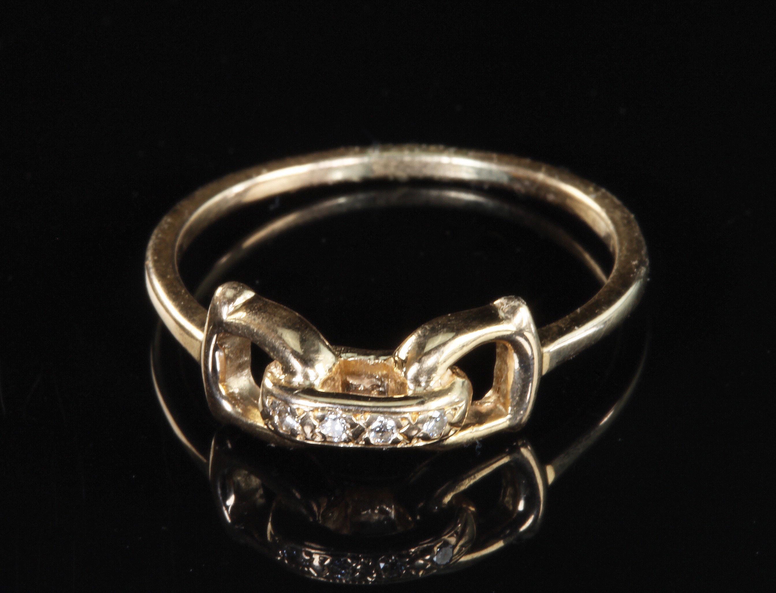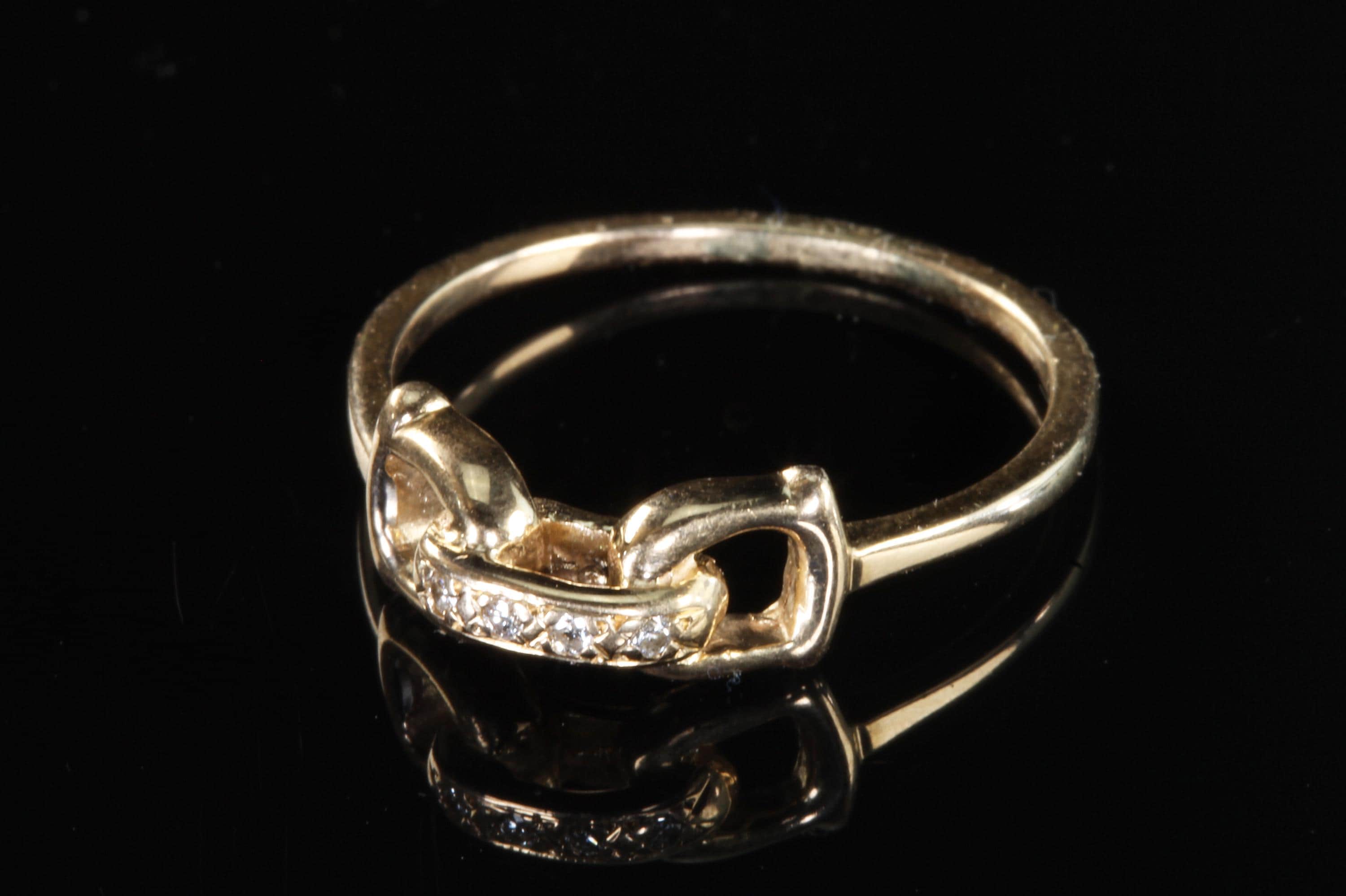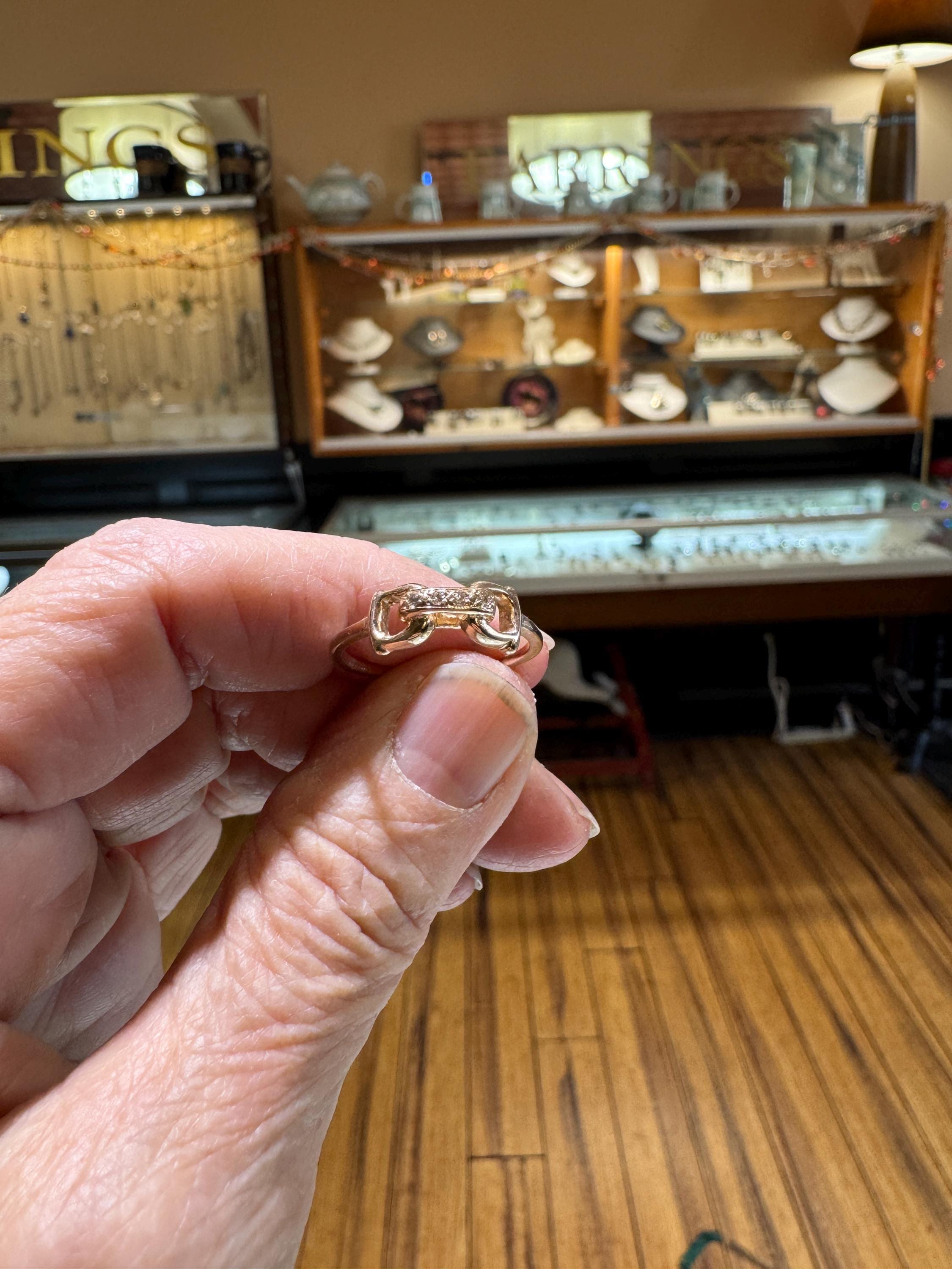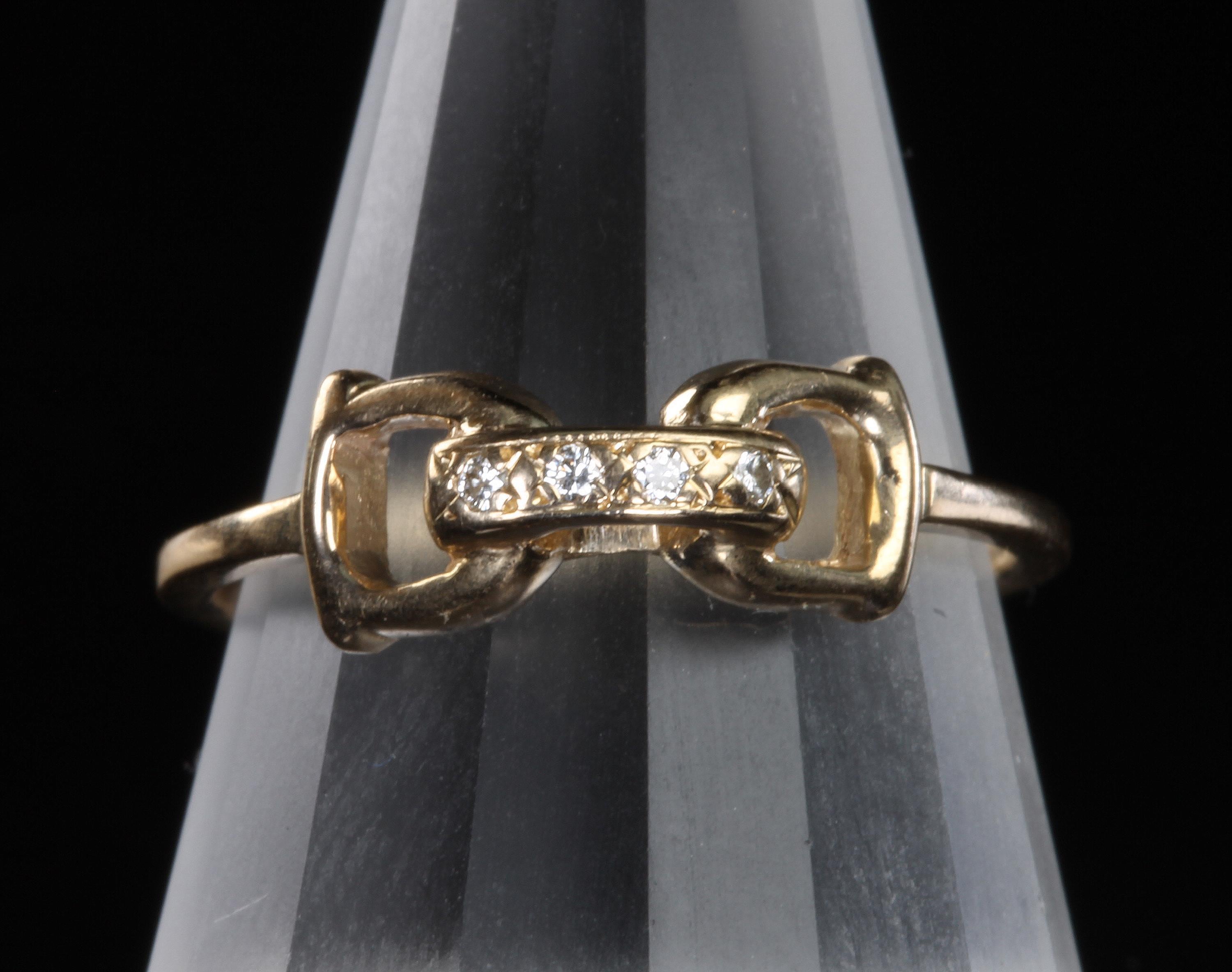 An equestrian themed 14K yellow gold .02 ctw diamond D ring bit ring. A fabulous gift for any horse lover! This is a vintage and pre owned ring, sold as is in great ready to wear condition. Currently a size 7.75 we will size this ring up to a 8.75 free of charge. If you need this ring to be larger than a 8.75 please contact us before ordering.