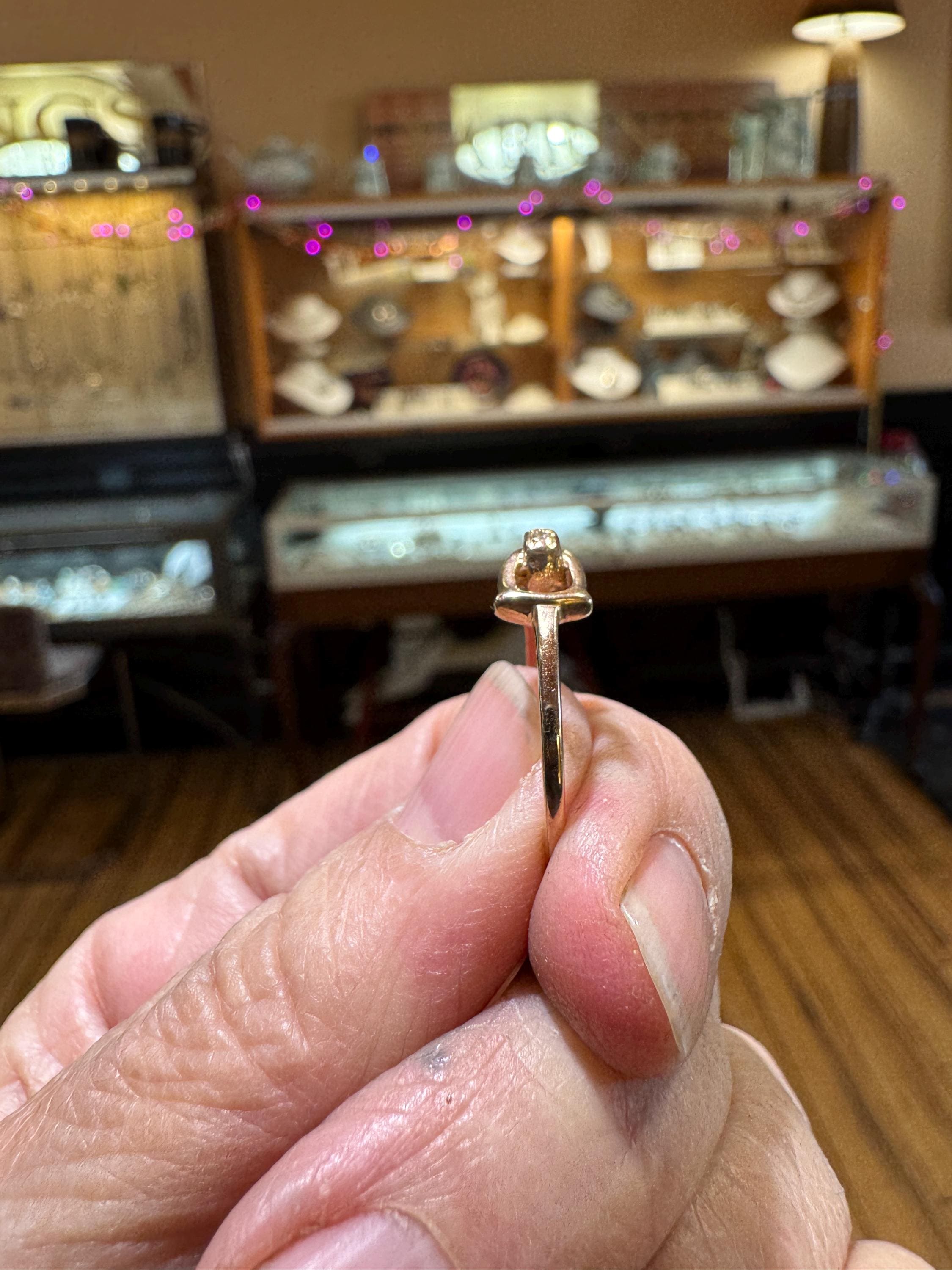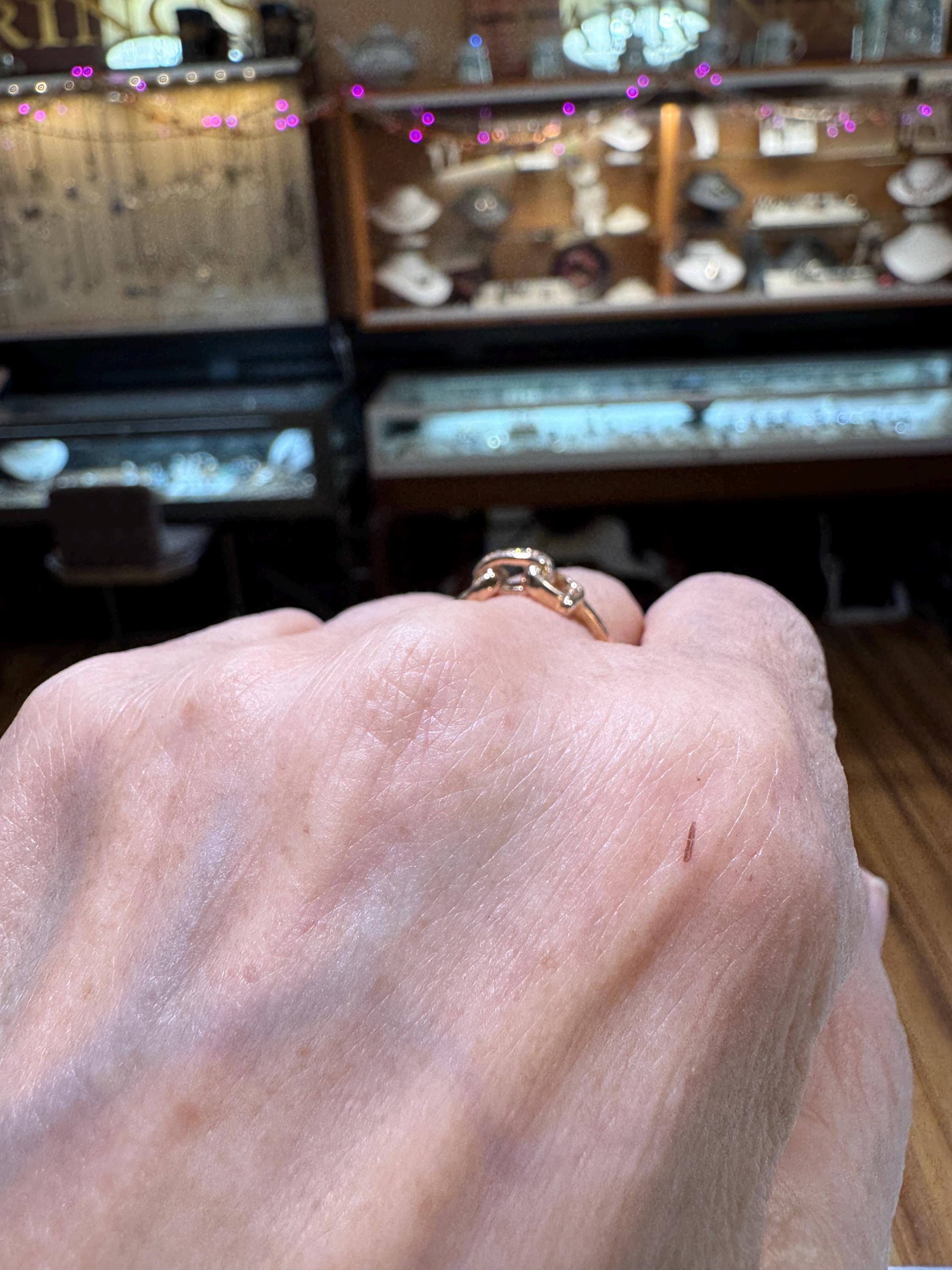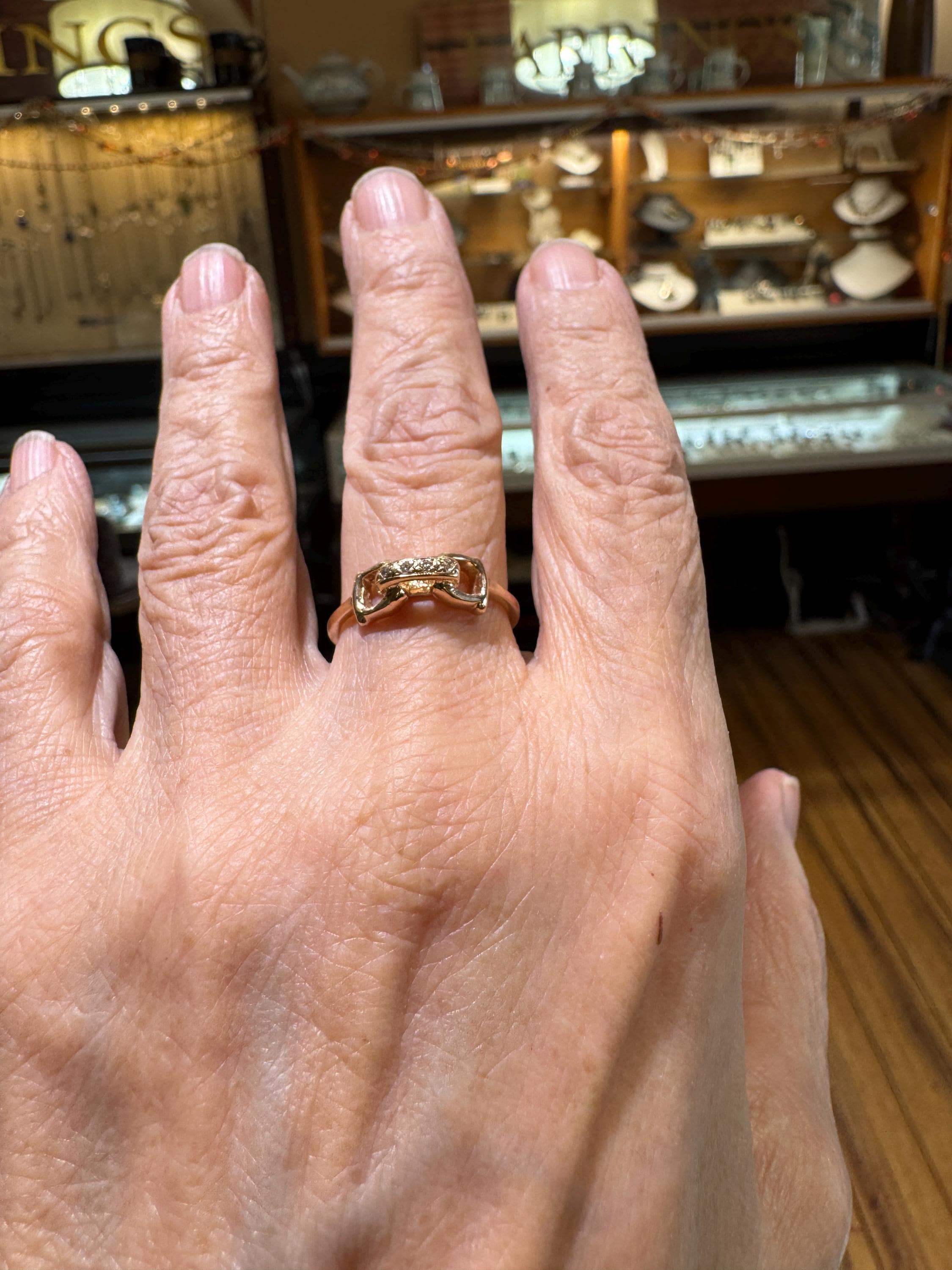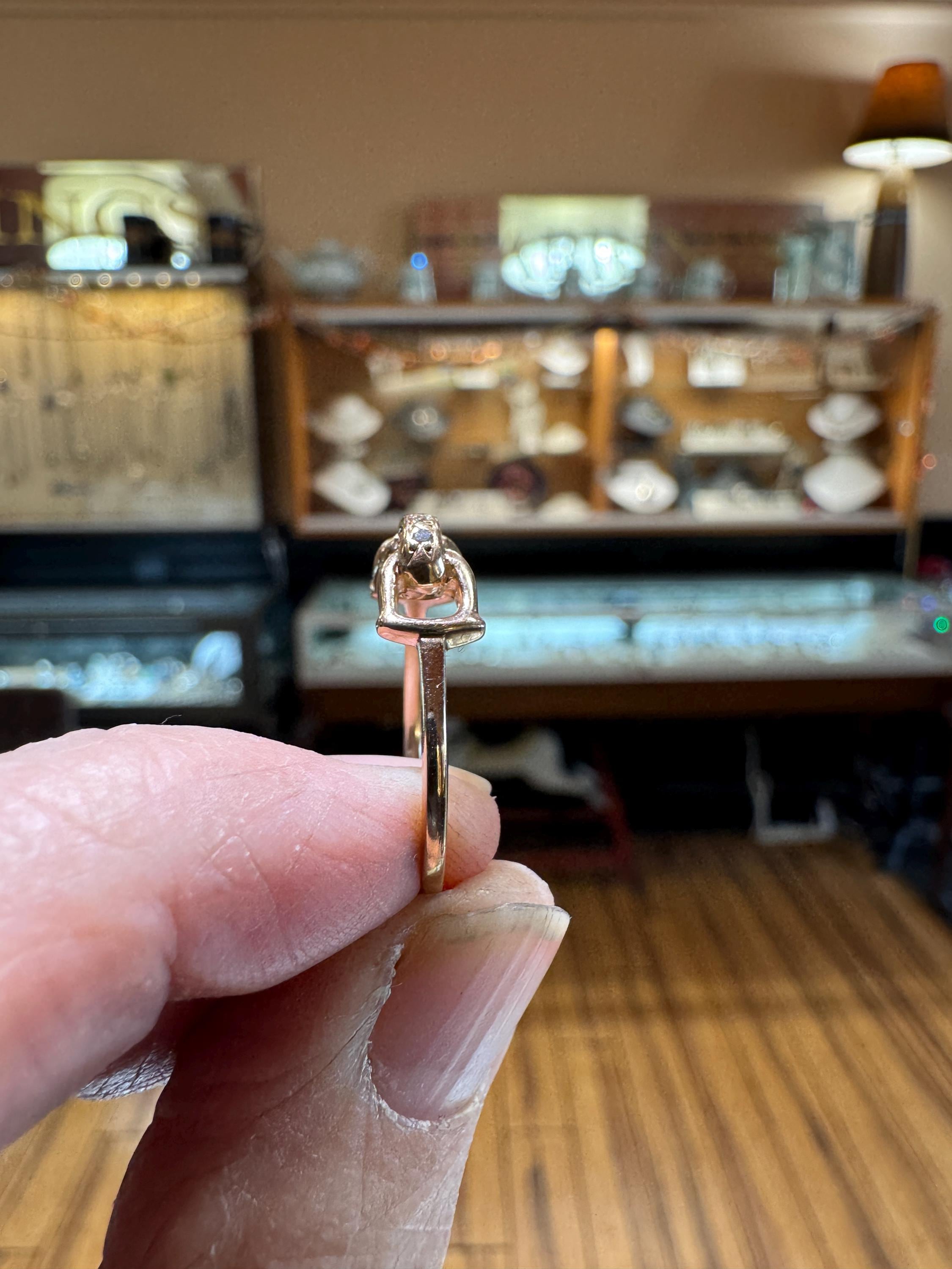 An equestrian themed 14K yellow gold .02 ctw diamond D ring bit ring. A fabulous gift for any horse lover! This is a vintage and pre owned ring, sold as is in great ready to wear condition. Currently a size 7.75 we will size this ring up to a 8.75 free of charge. If you need this ring to be larger than a 8.75 please contact us before ordering.