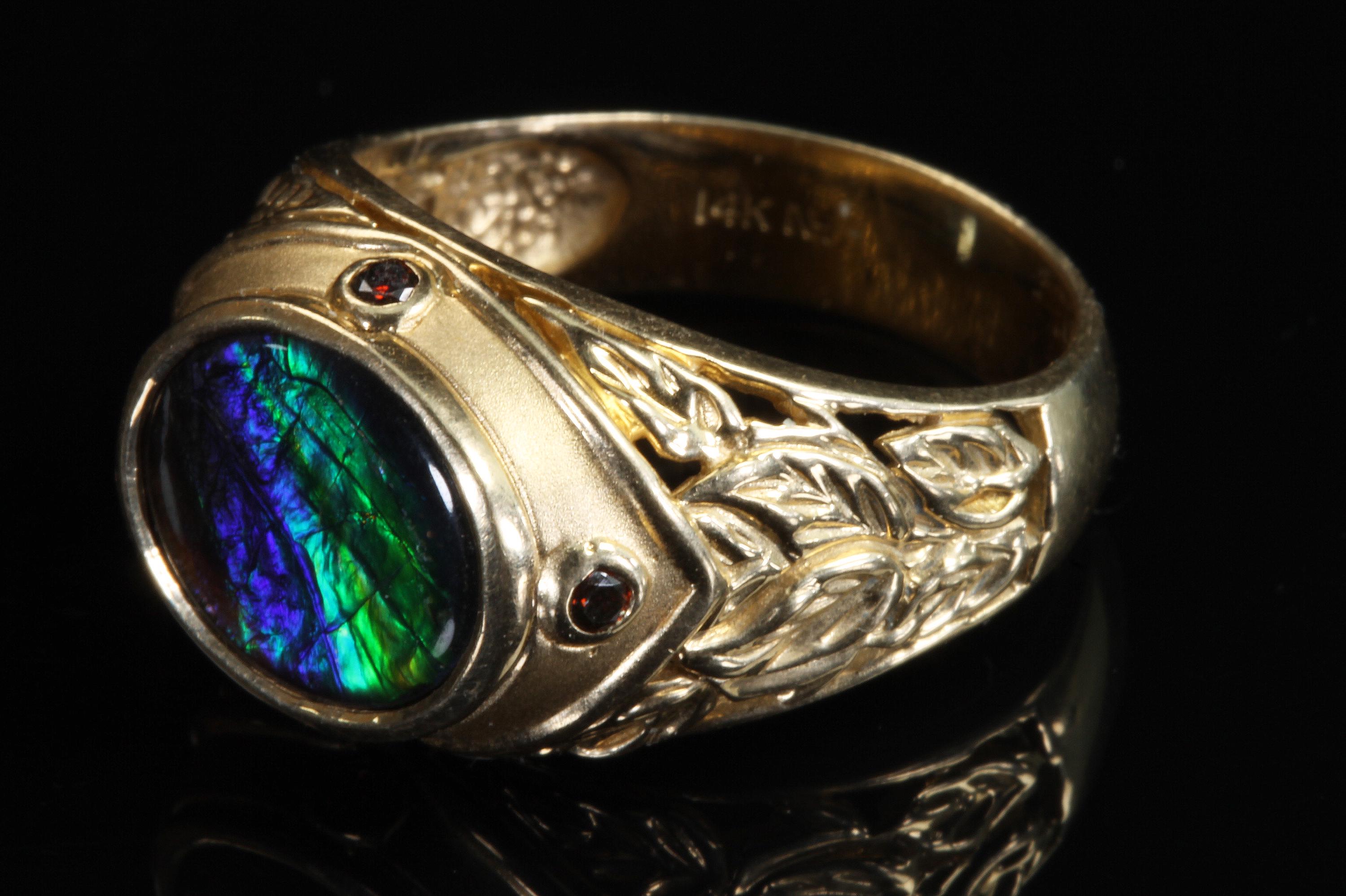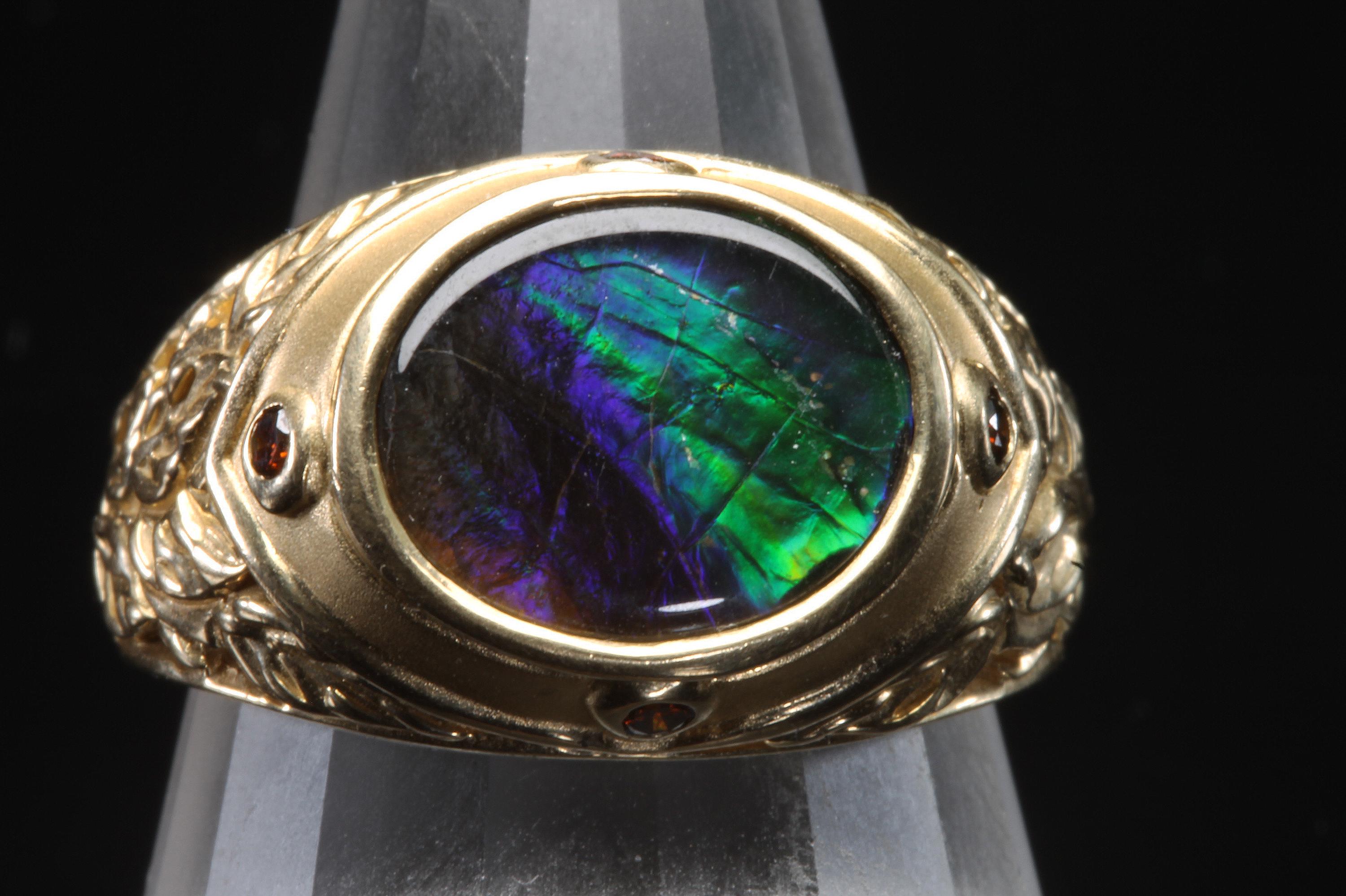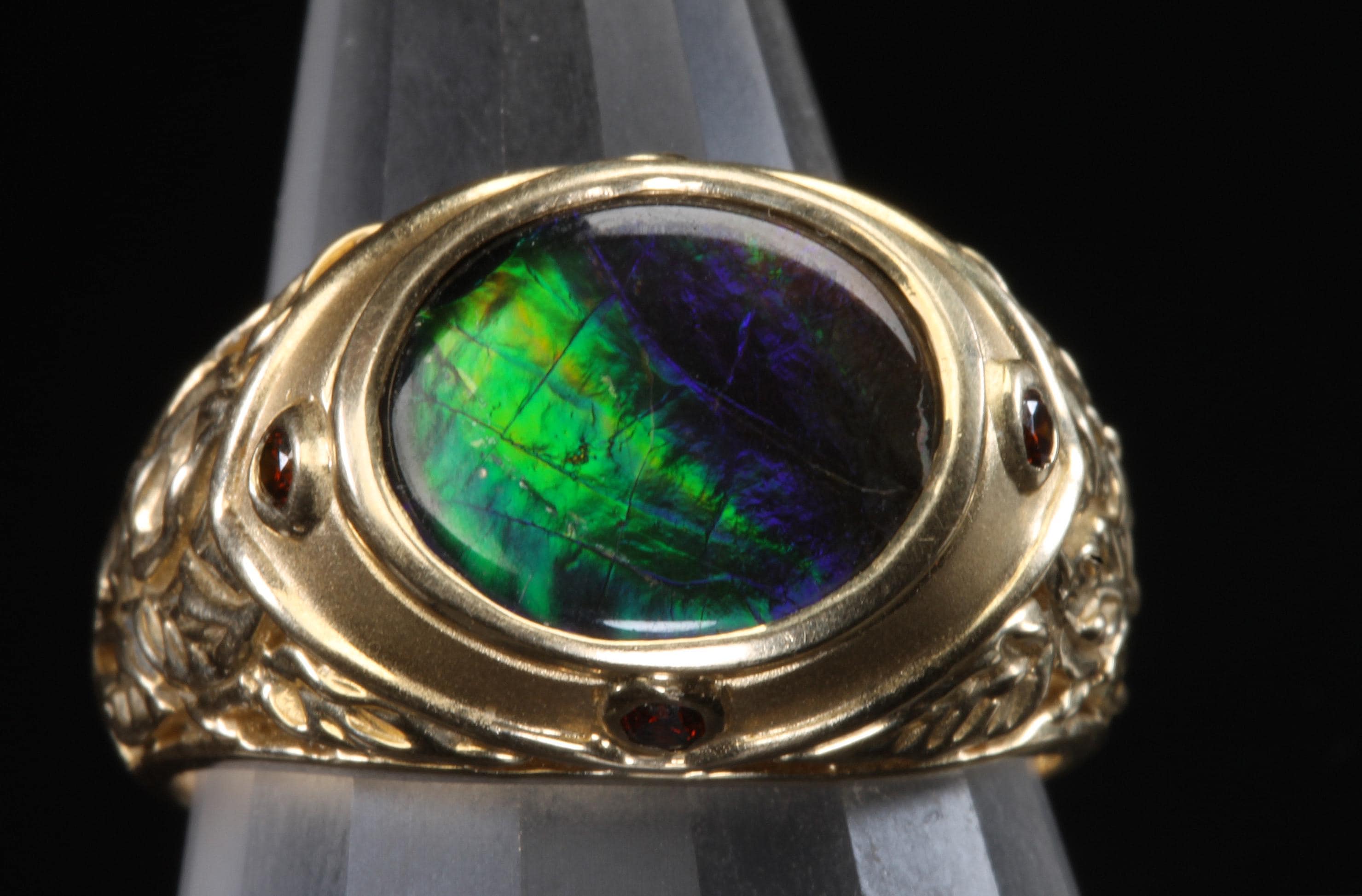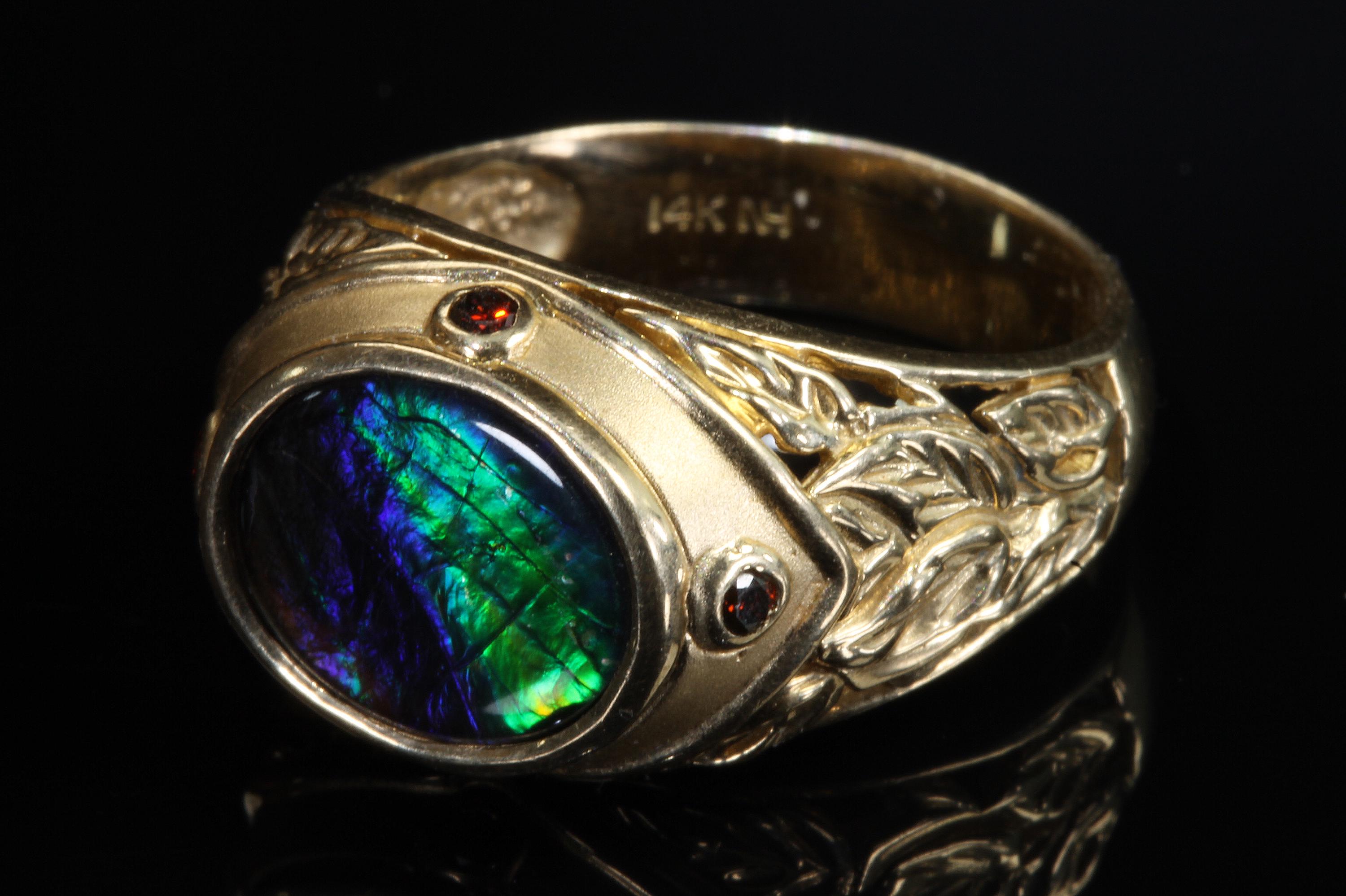 Rare fossilized beauty! This 14k yellow gold ring features a bezel set 12 mm x 10mm ammolite cabochon and four accent 1.5mm garnets. Ammolite is the gem created from fossilized mollusk which is called ammonite. It’s a rare gem and on the soft side; diamond is a 10 in hardness, amethyst a 7. Ammolite is around a three or four. This is a vintage and pre owned ring, sold as is in what looks like new condition. The Ammolite gem shows no real sign of wear. This ring weighs in at 6 dwt or 9.33 grams. Size 9 only!
