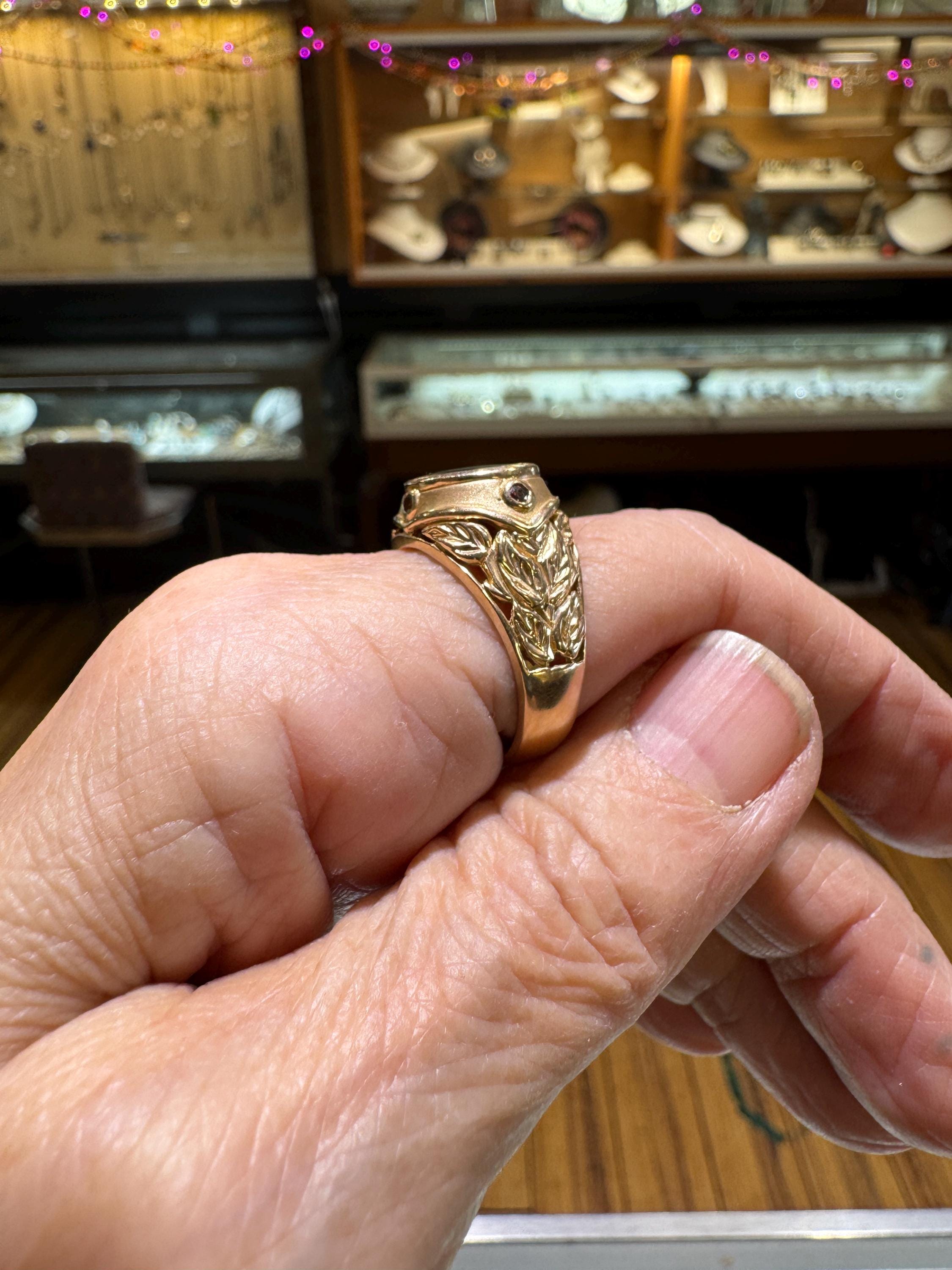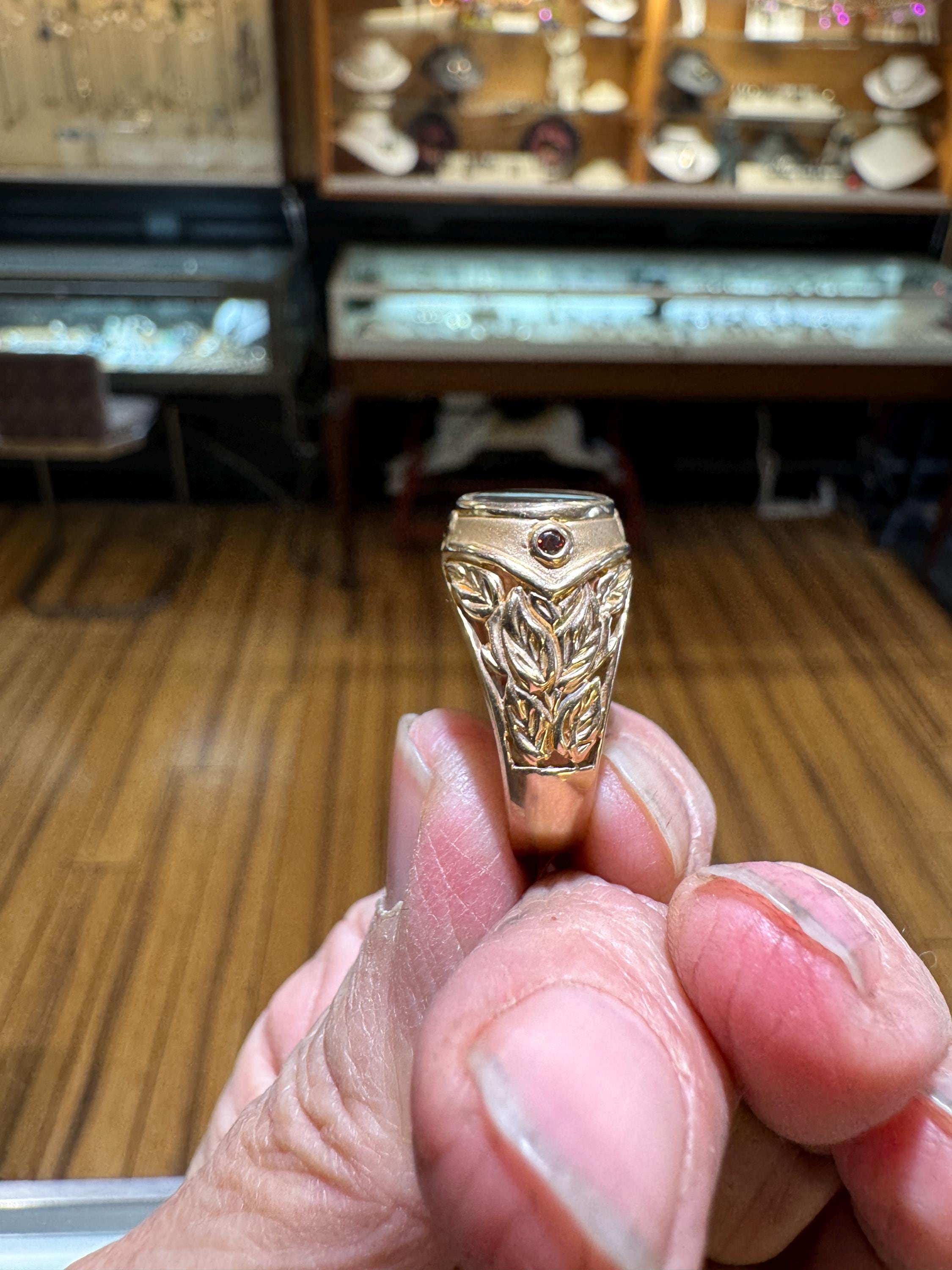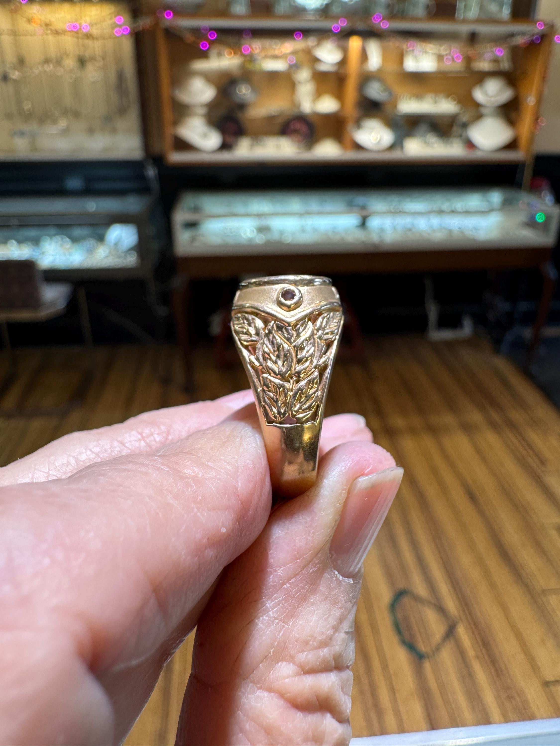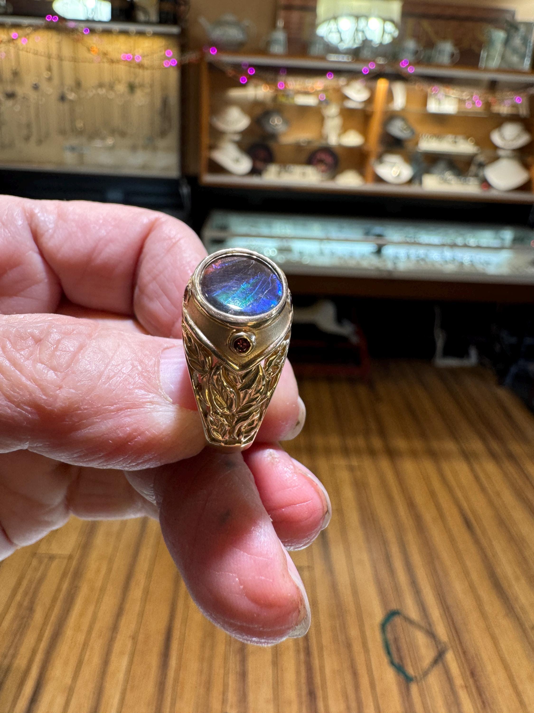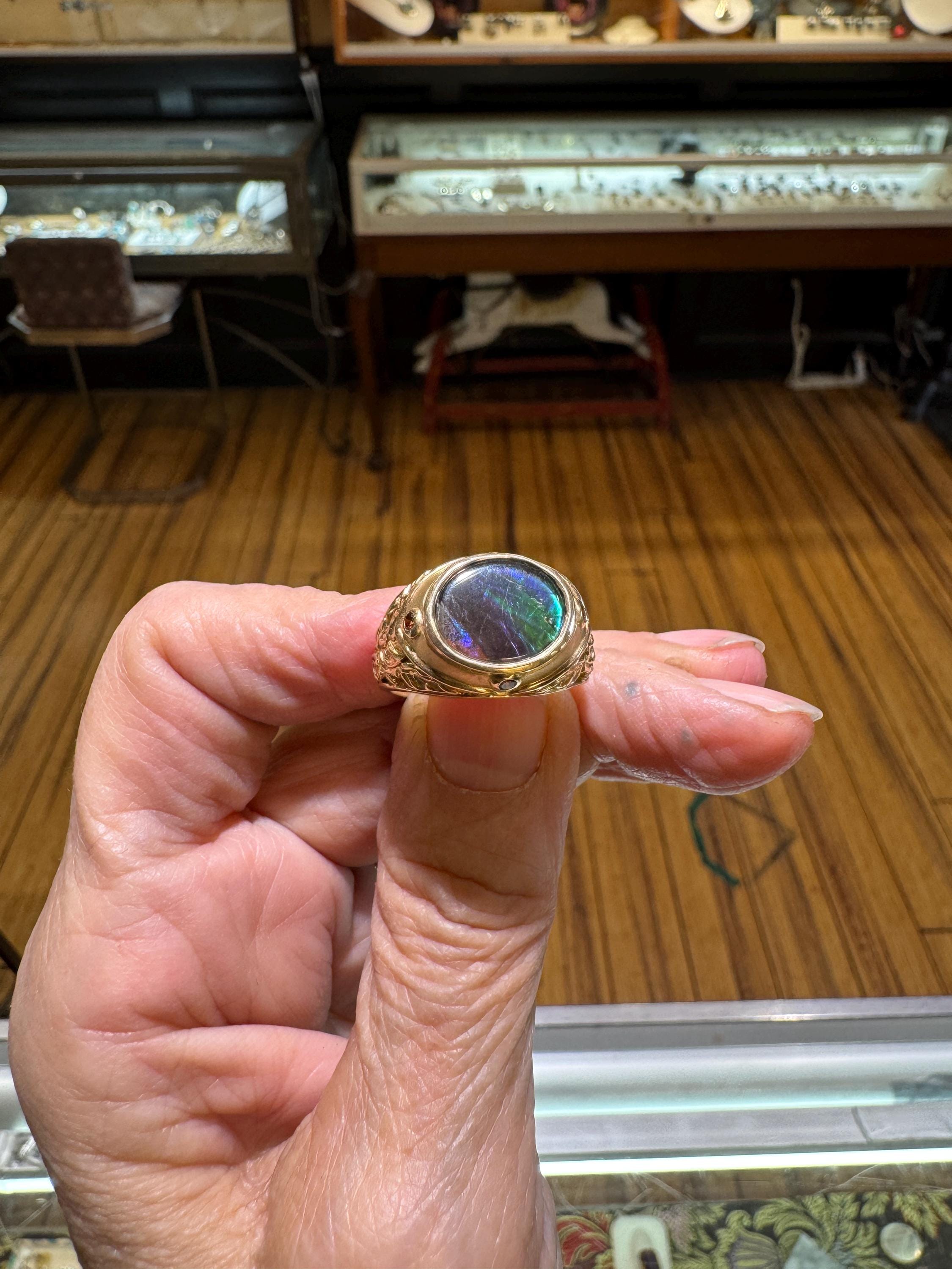 Rare fossilized beauty! This 14k yellow gold ring features a bezel set 12 mm x 10mm ammolite cabochon and four accent 1.5mm garnets. Ammolite is the gem created from fossilized mollusk which is called ammonite. It’s a rare gem and on the soft side; diamond is a 10 in hardness, amethyst a 7. Ammolite is around a three or four. This is a vintage and pre owned ring, sold as is in what looks like new condition. The Ammolite gem shows no real sign of wear. This ring weighs in at 6 dwt or 9.33 grams. Size 9 only!