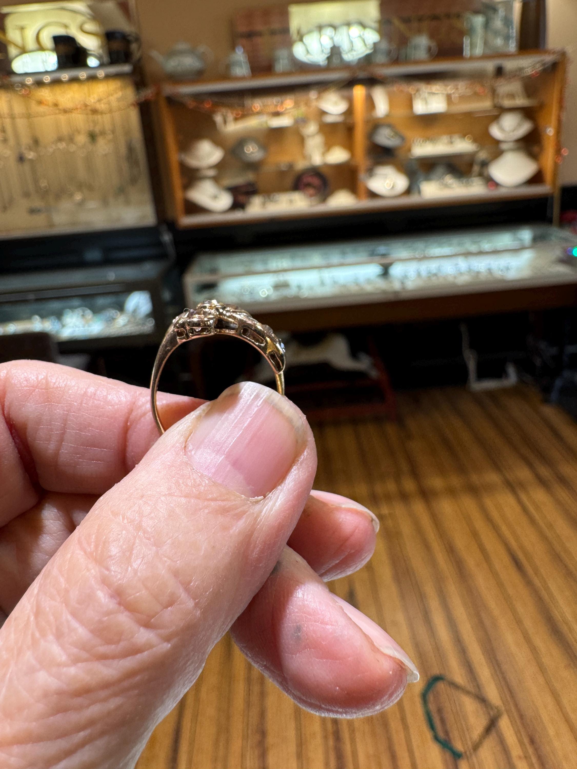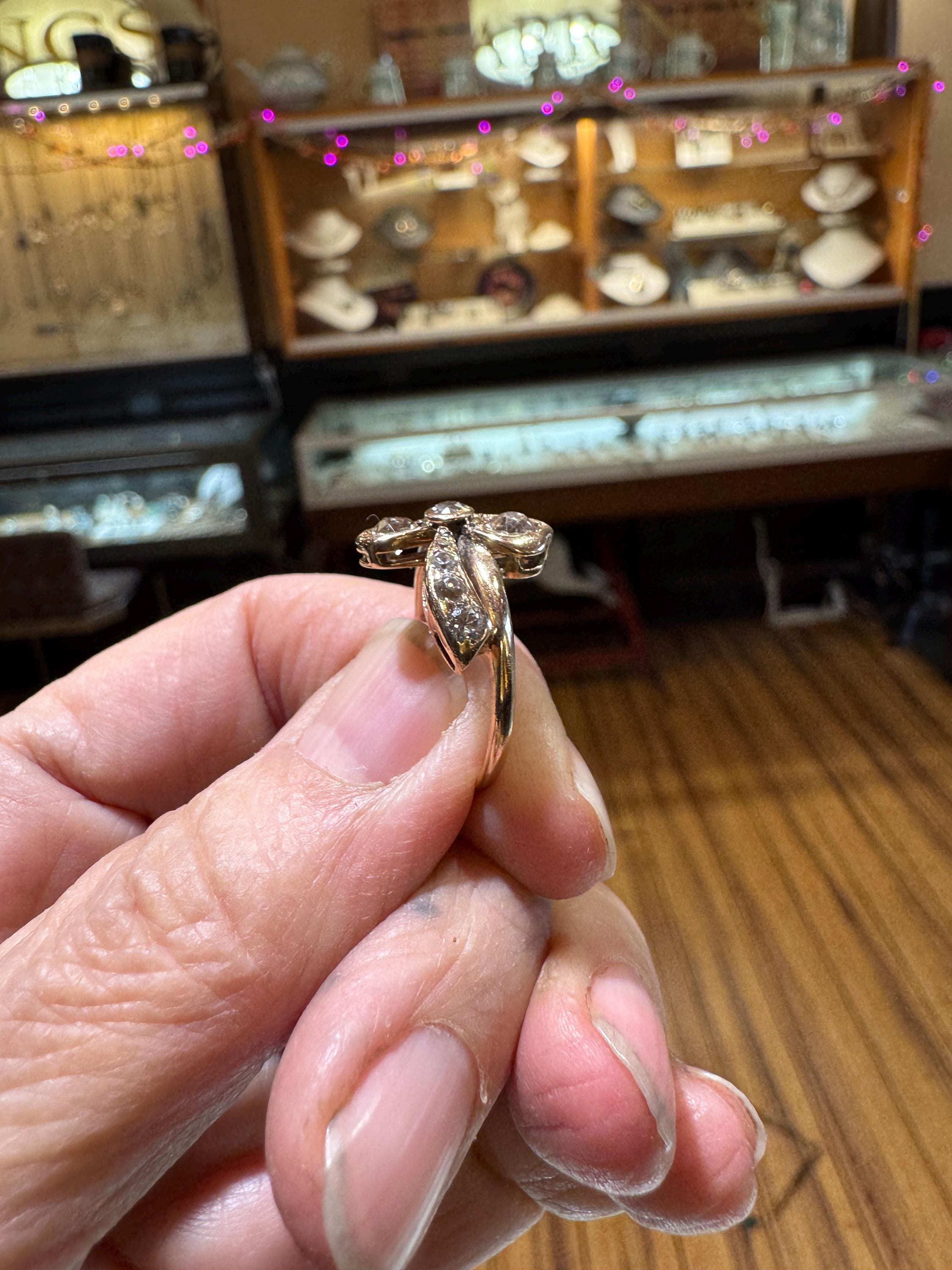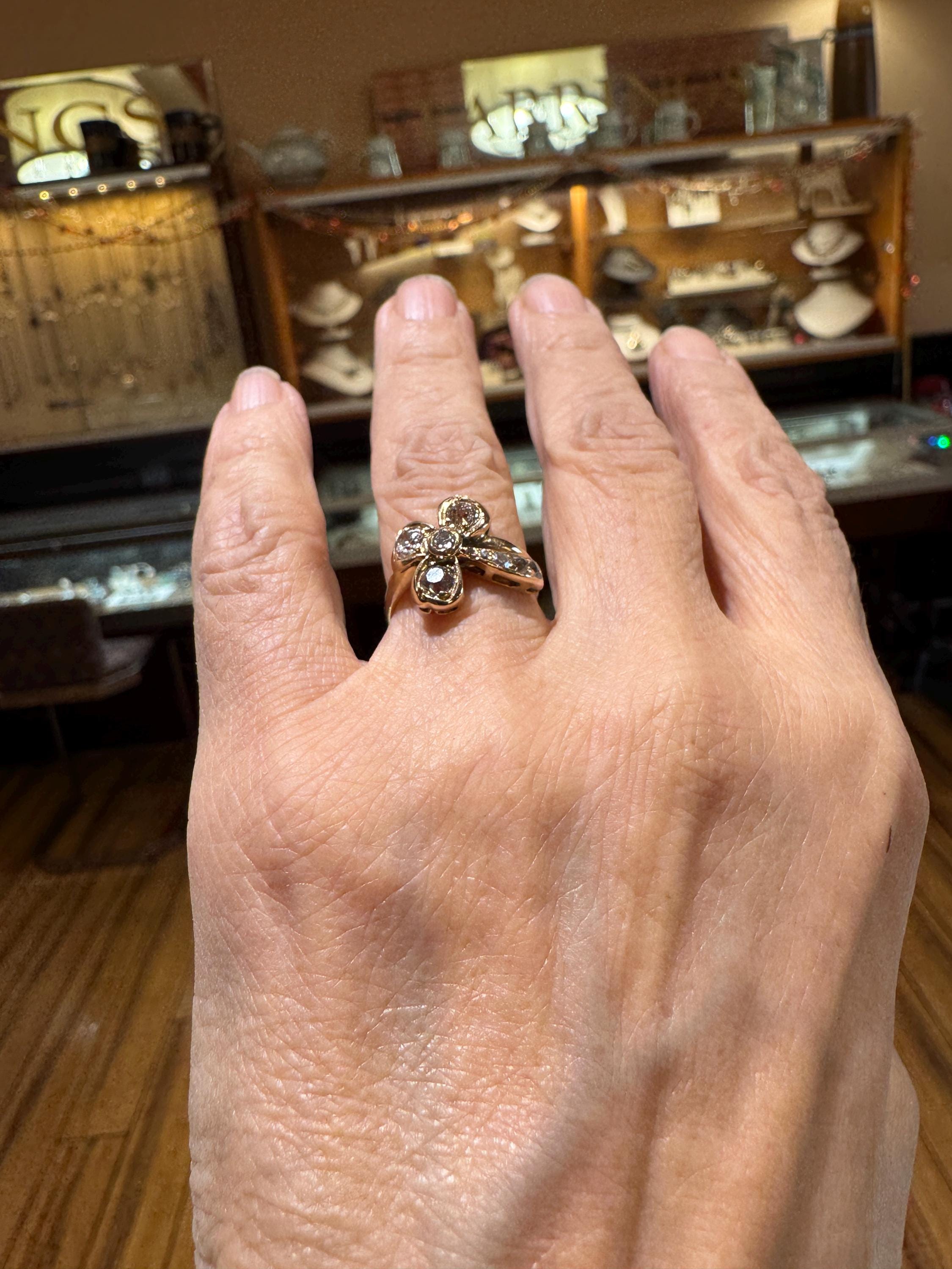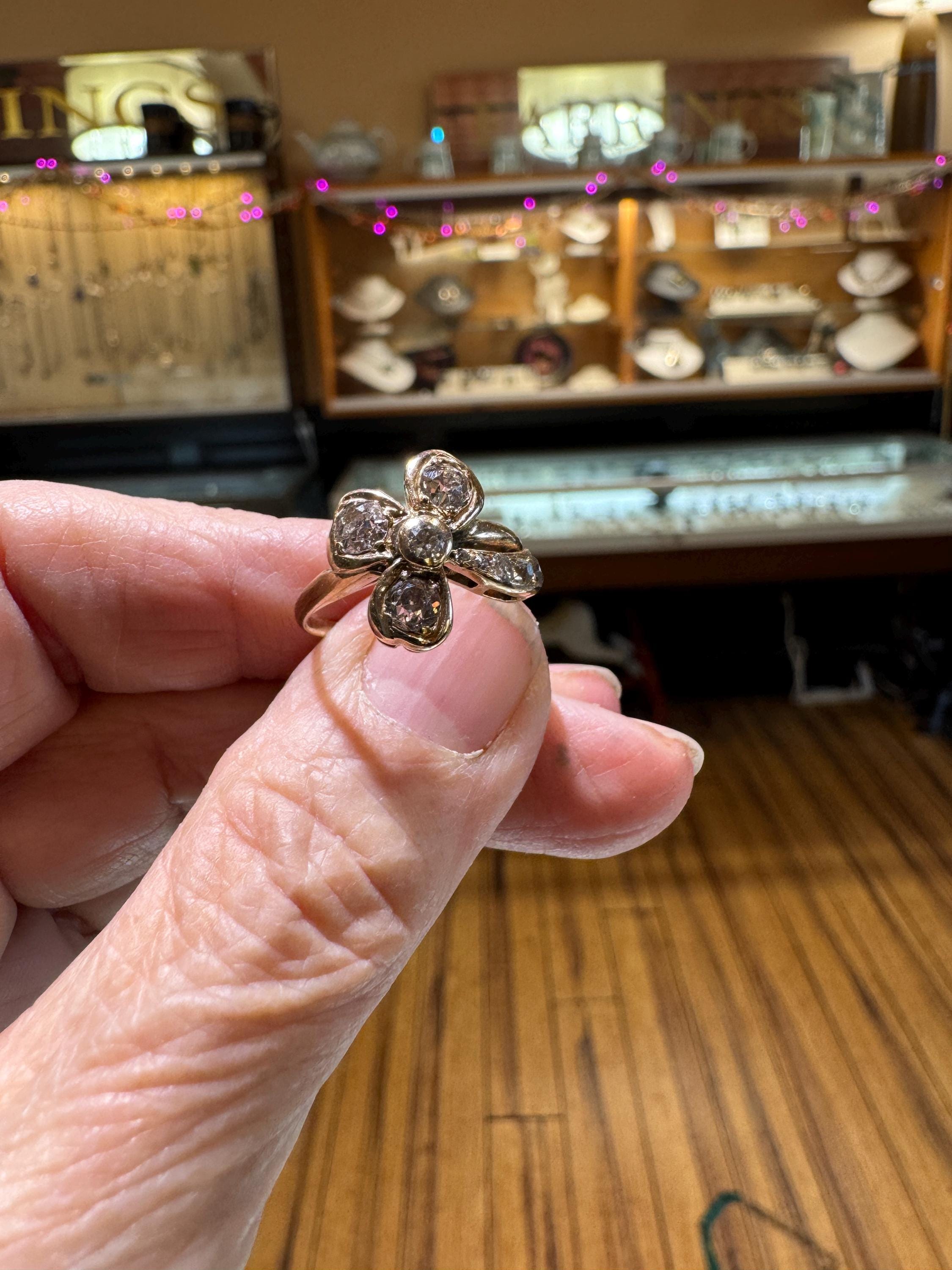 What a fortuitous find! This 14K yellow gold ring features approximately .85 ctw of old European cut diamonds set in a shamrock design! Who will be the lucky one to wear this beauty once again?! This is a vintage and pre owned ring, sold as is in great ready to wear condition. Currently a size 6.25 we will size this ring up to a size 7.25 free of charge. If you need this ring to be larger than a 7.25 please contact us before ordering. Weight is approximate since no stones were removed for weighing.