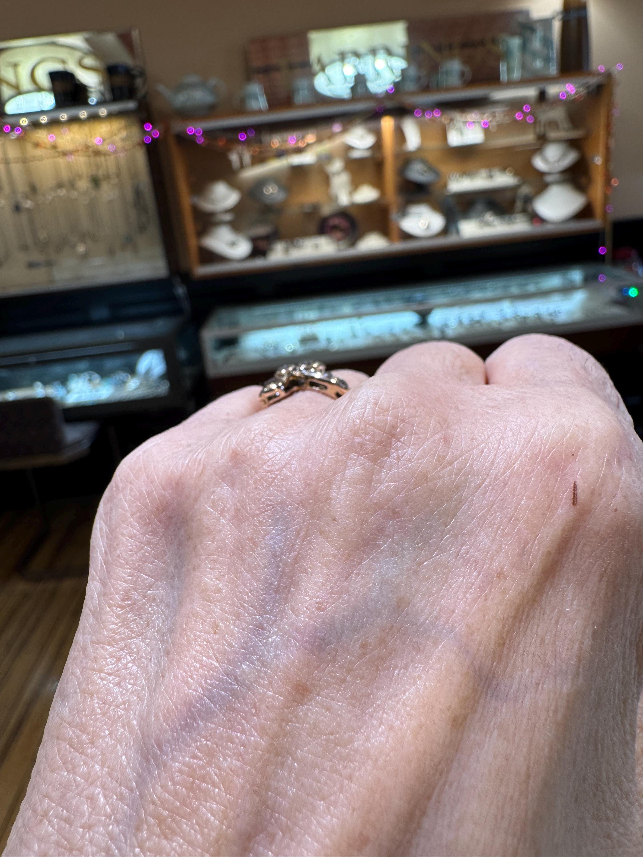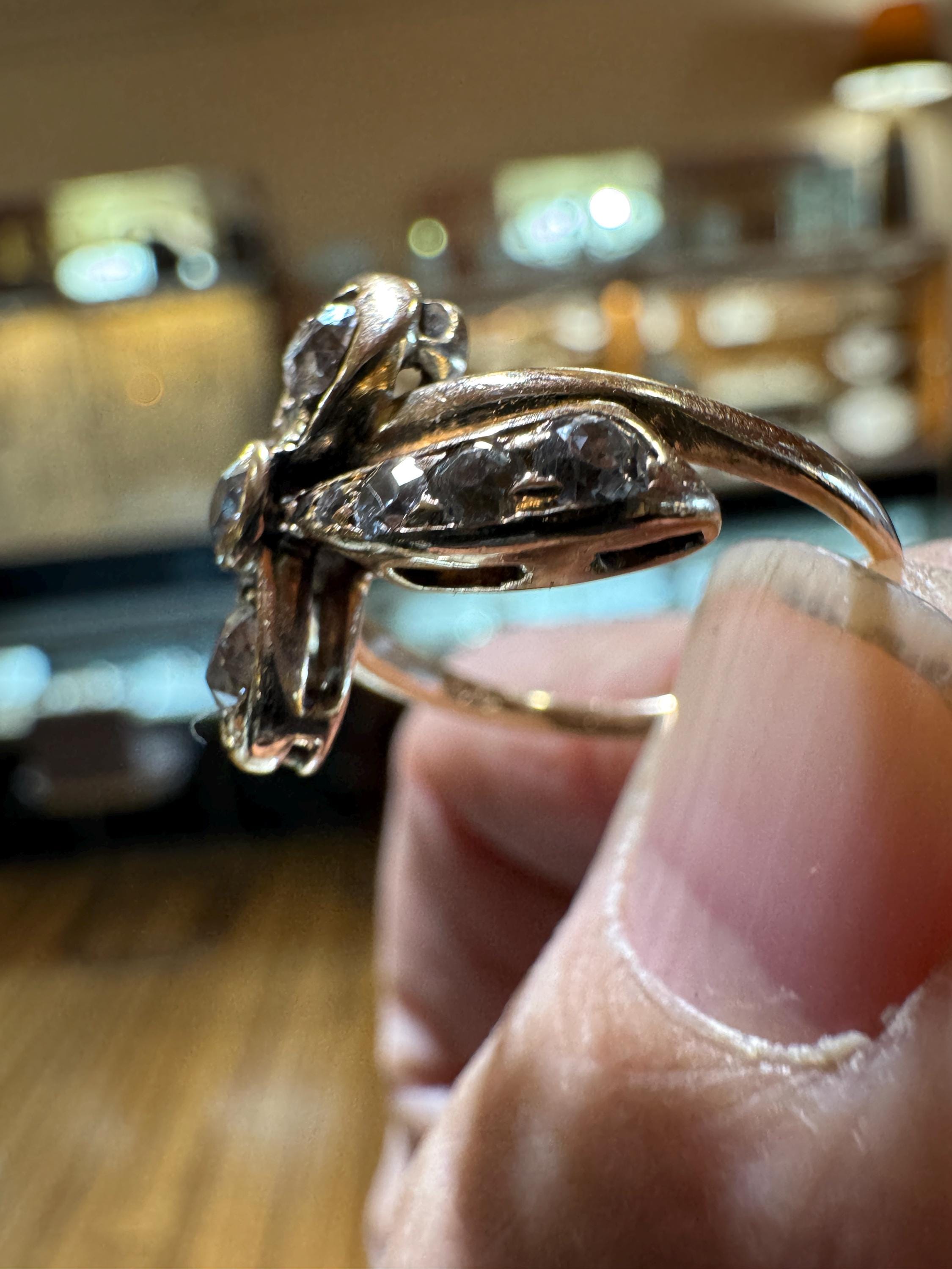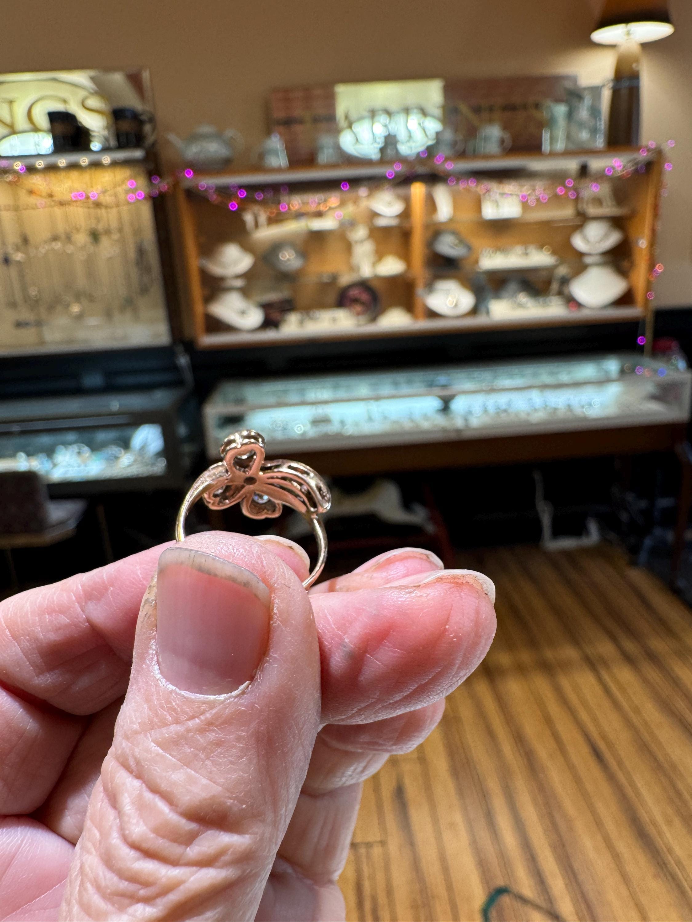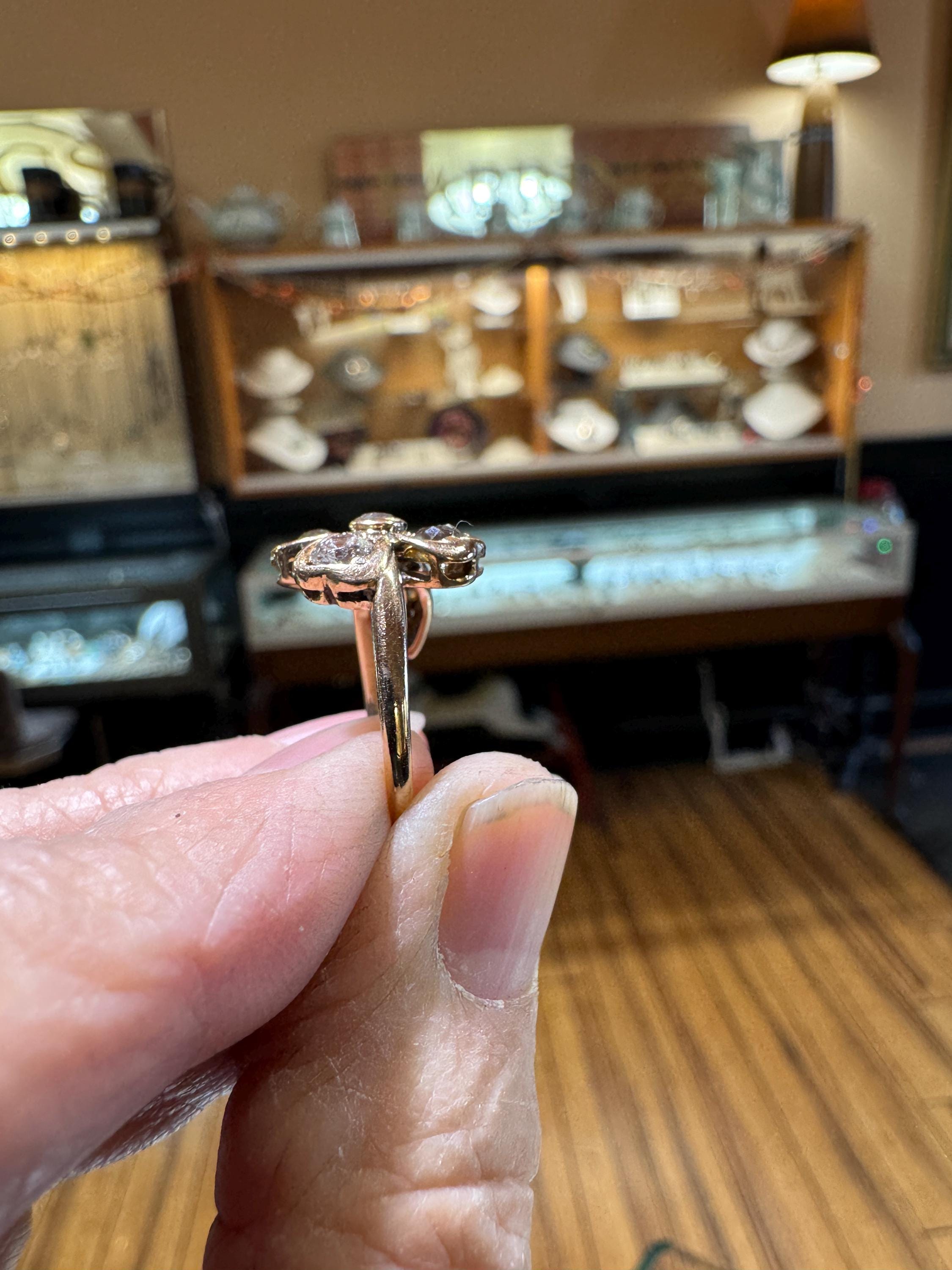 What a fortuitous find! This 14K yellow gold ring features approximately .85 ctw of old European cut diamonds set in a shamrock design! Who will be the lucky one to wear this beauty once again?! This is a vintage and pre owned ring, sold as is in great ready to wear condition. Currently a size 6.25 we will size this ring up to a size 7.25 free of charge. If you need this ring to be larger than a 7.25 please contact us before ordering. Weight is approximate since no stones were removed for weighing.