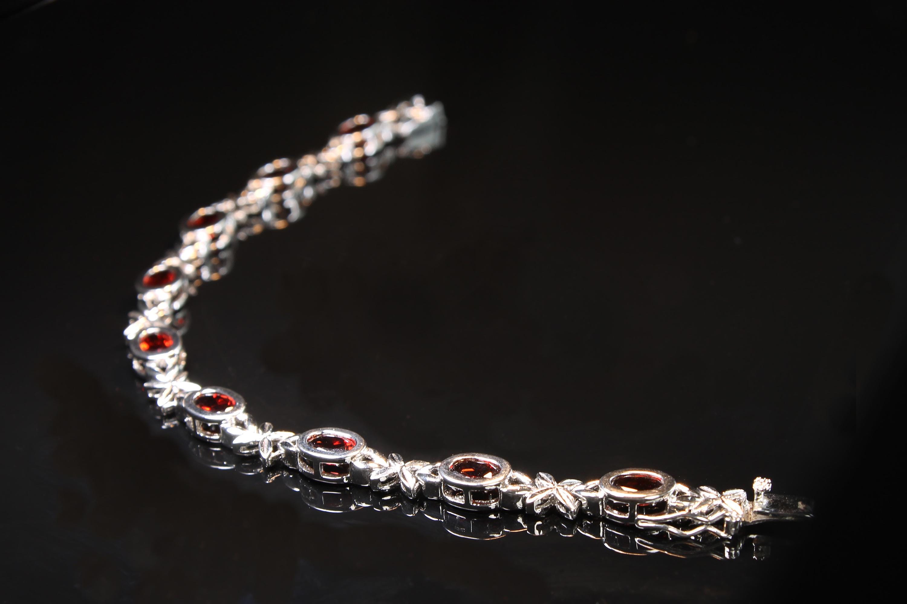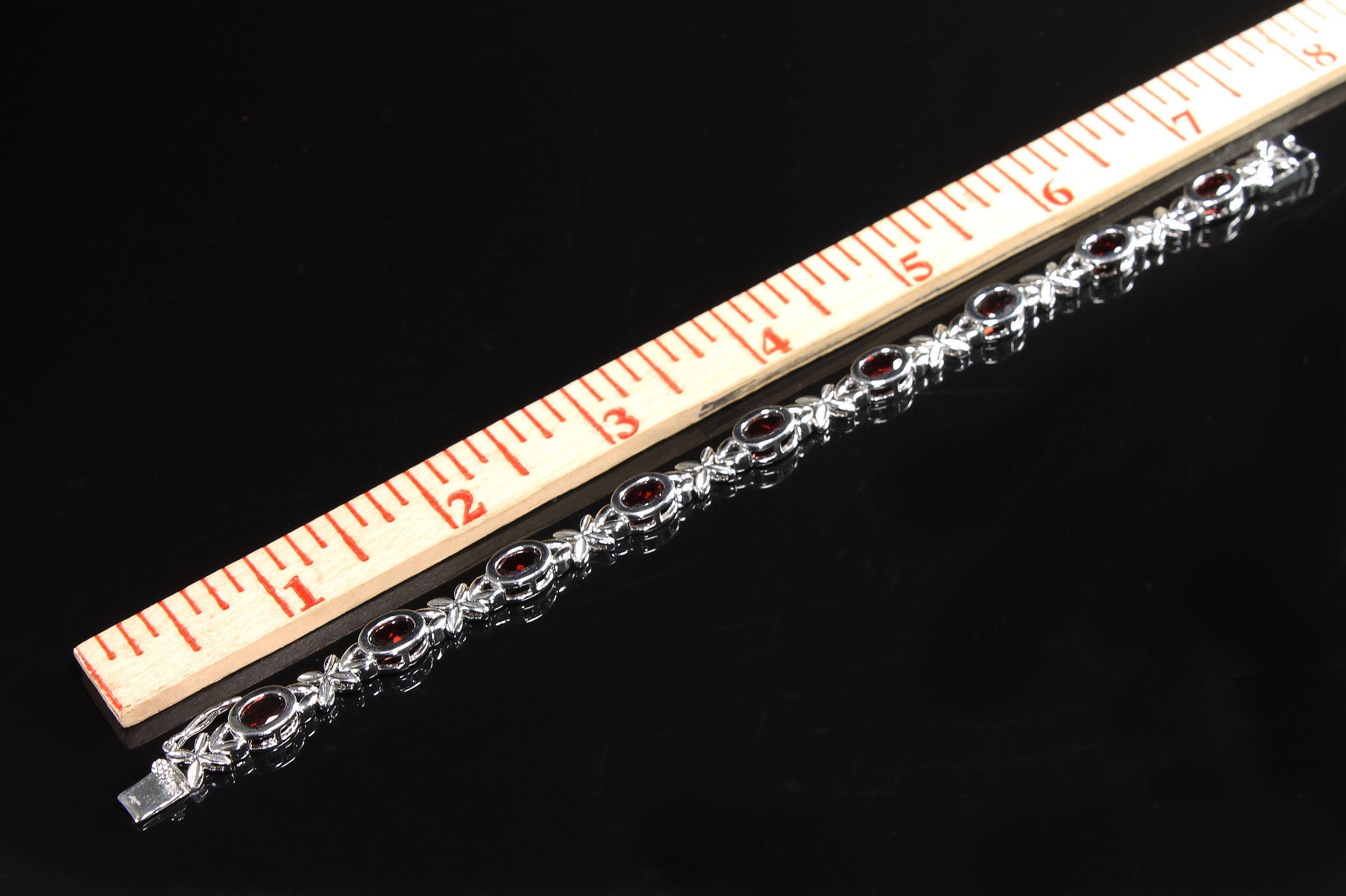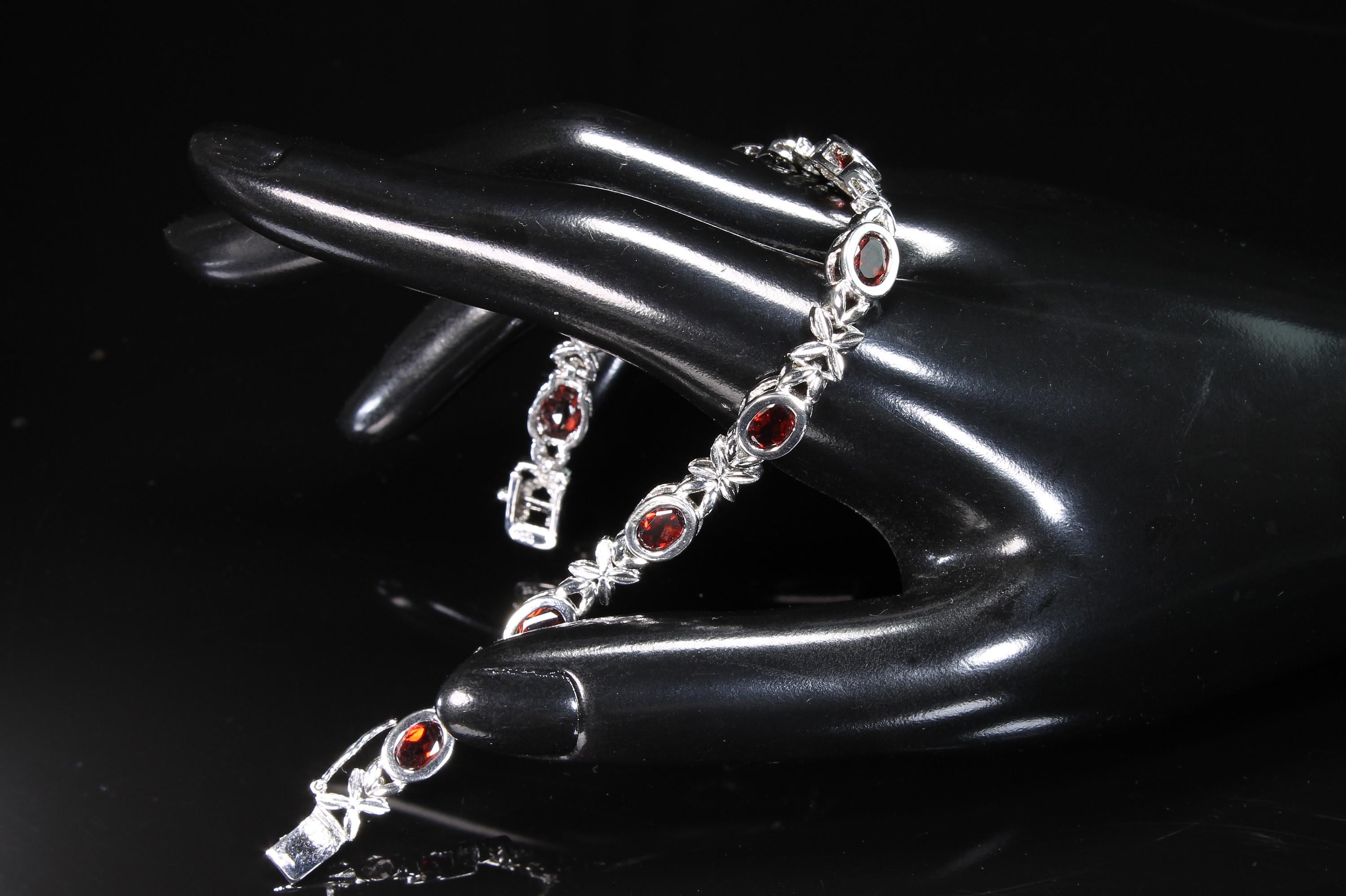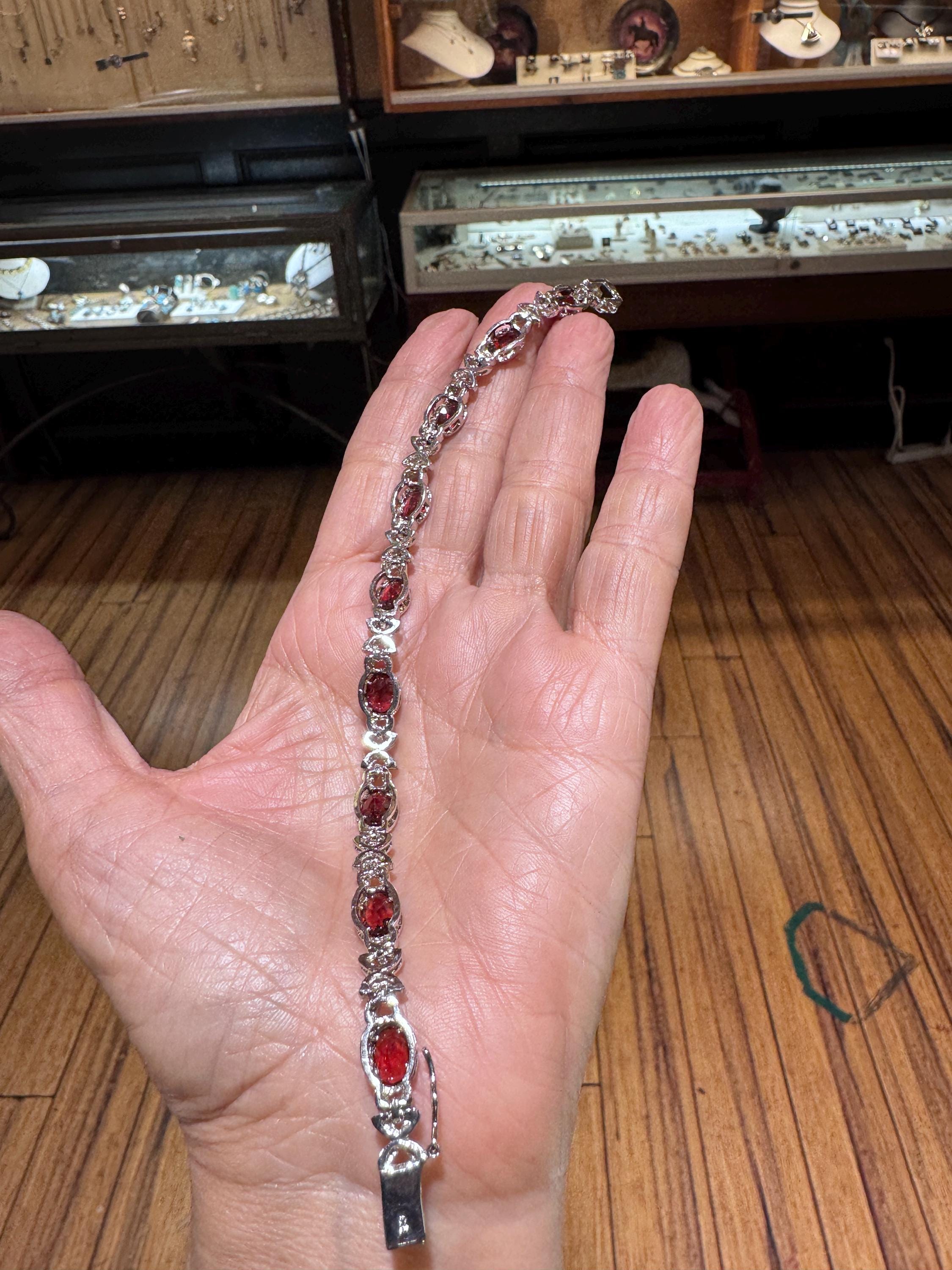 A lovely spot of red for your outfit off the day!. A sterling silver 'Hugs and Kisses' bracelet where nine 7mm x 5mm radiant red garnets are the hugs! This is a vintage and pre owned bracelet, sold as is in great ready to wear condition. This bracelet measure 7 3/8" long.