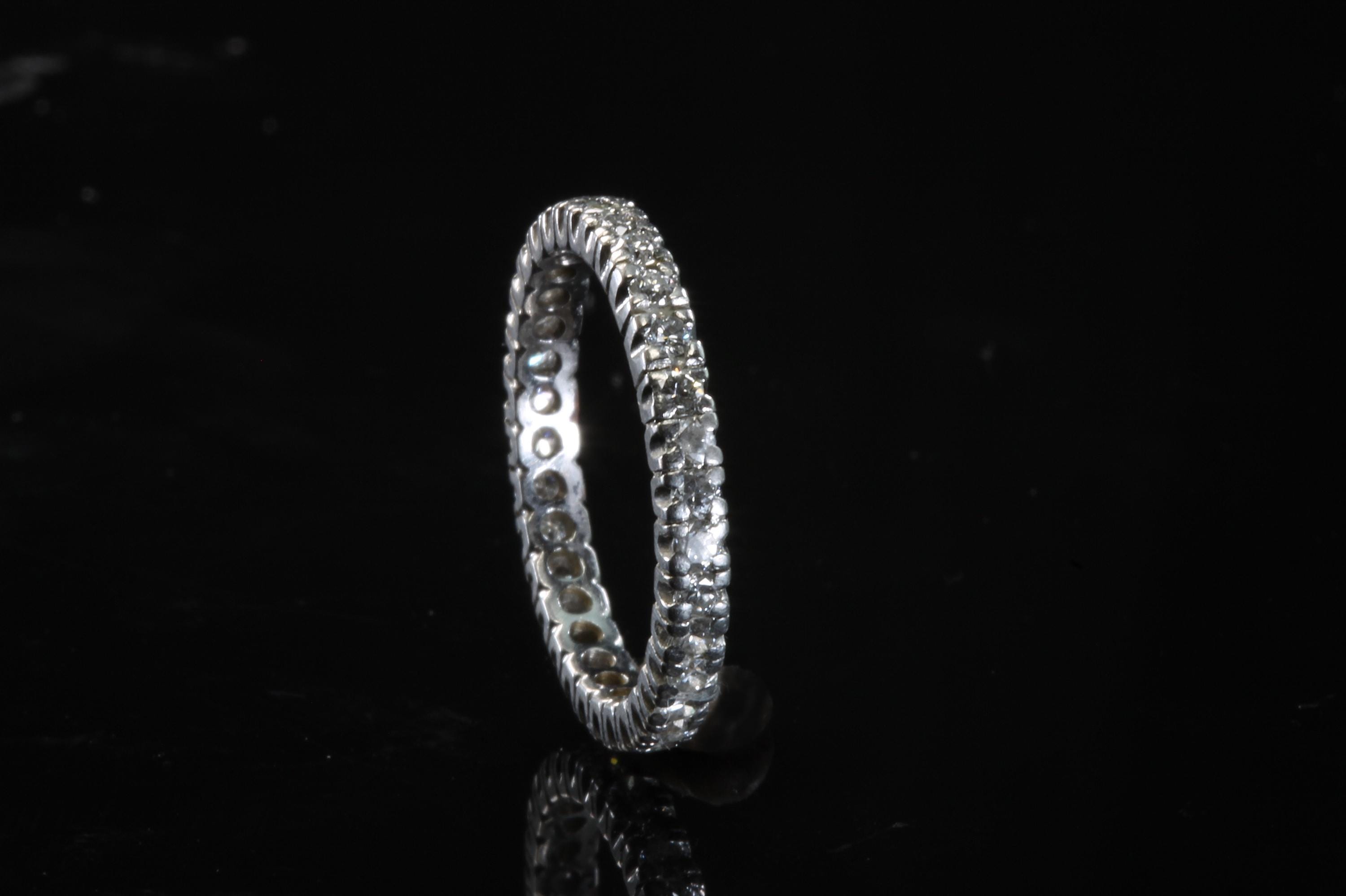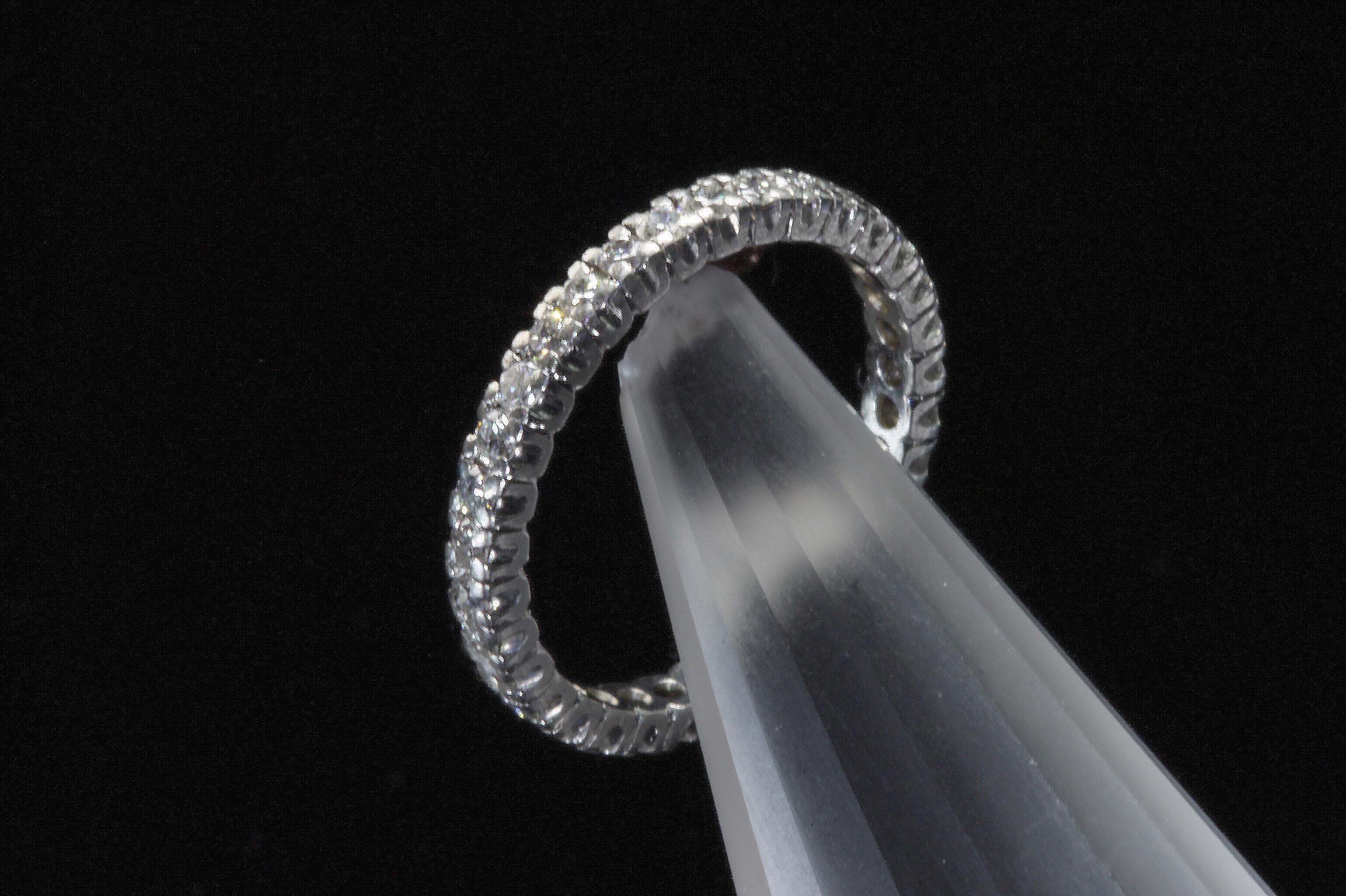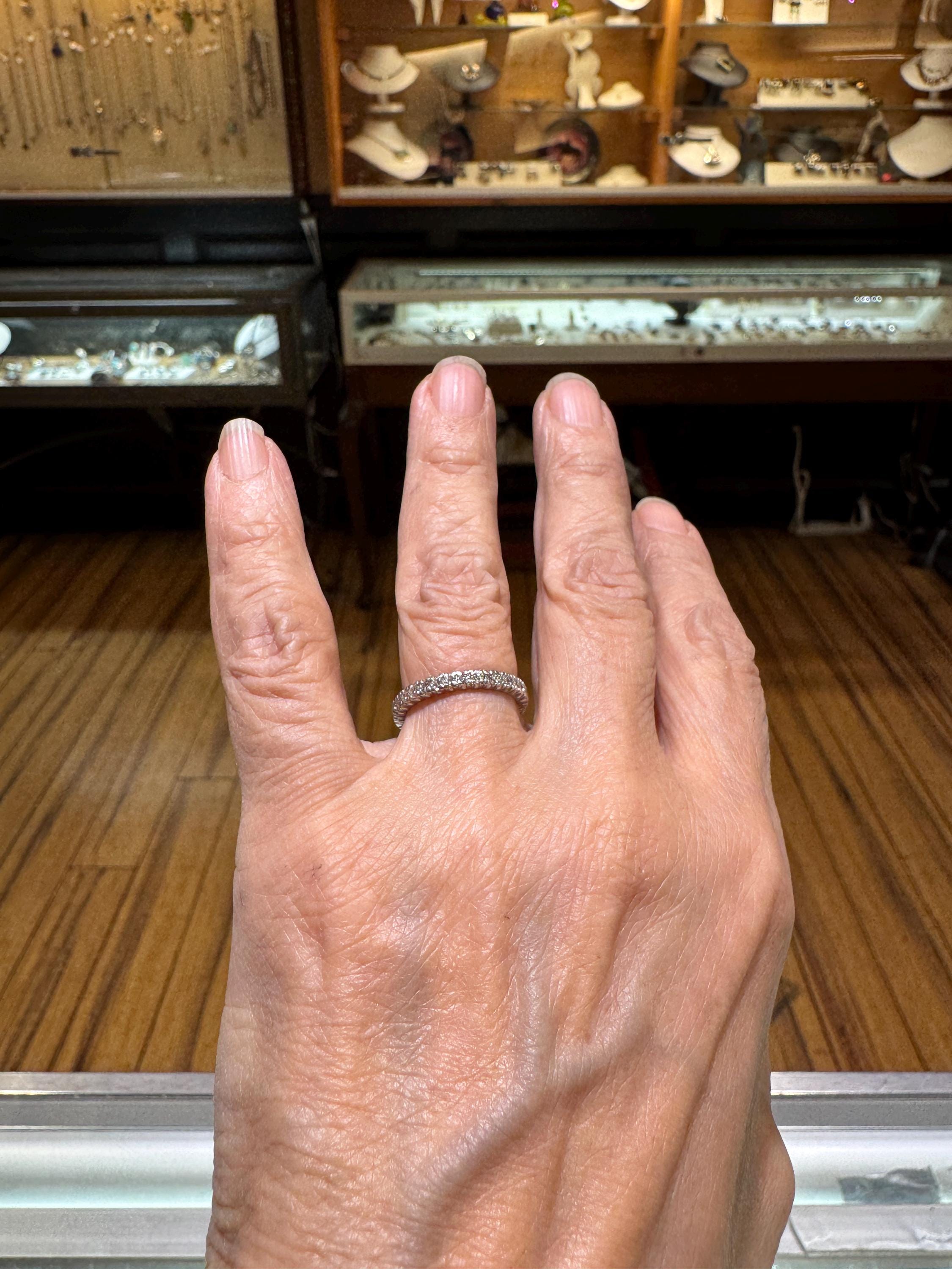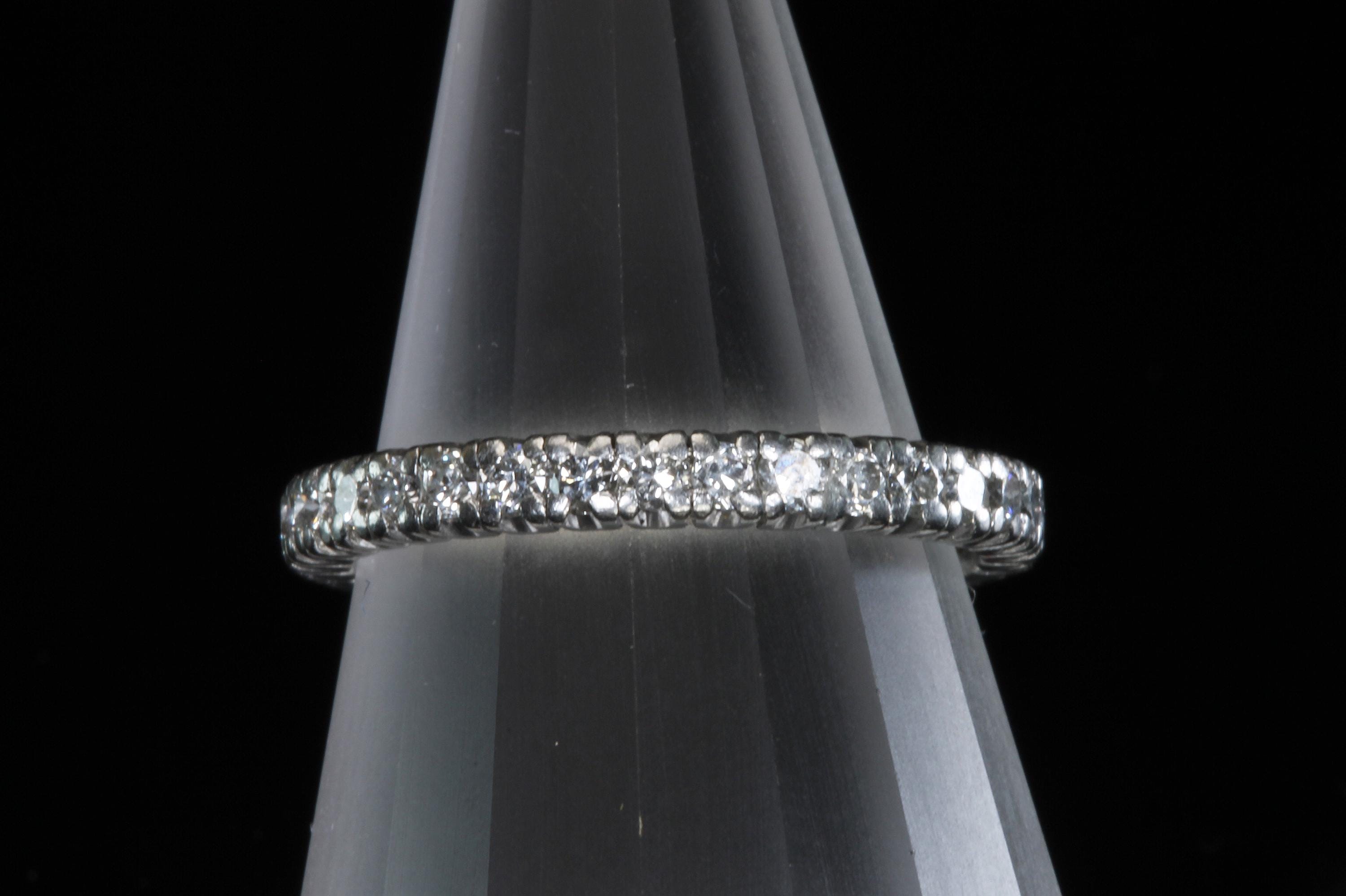 Sparkles upon sparkles only a diamond eternity band can give! This is a vintage and pre owned platinum diamond band with .50 ctw, sold as is in great ready to wear condition. Size 6.25 only. There are signs of gentle wear but being platinum there are many years left in this light bouncing beauty! No stones were removed to gauge weight.