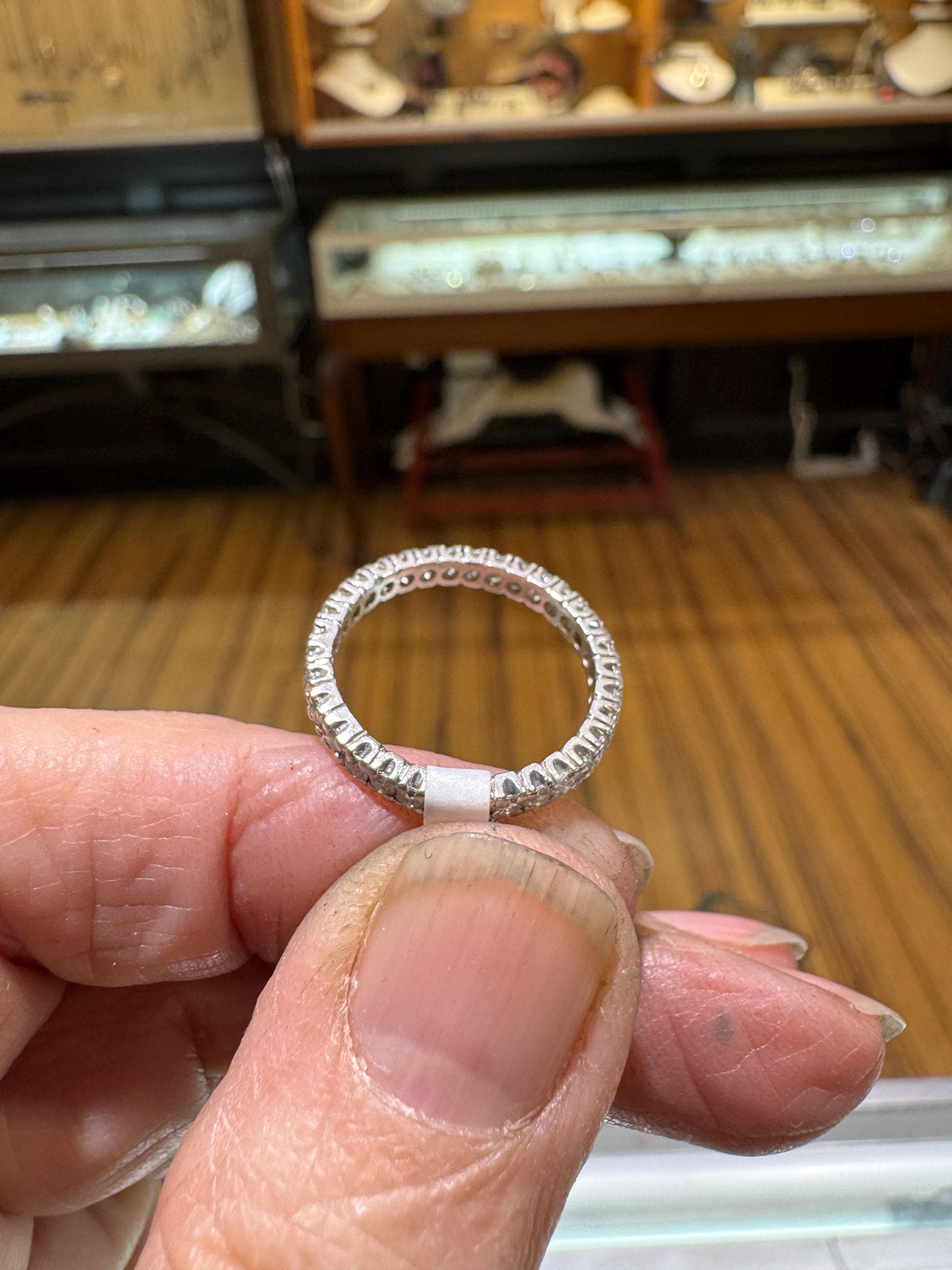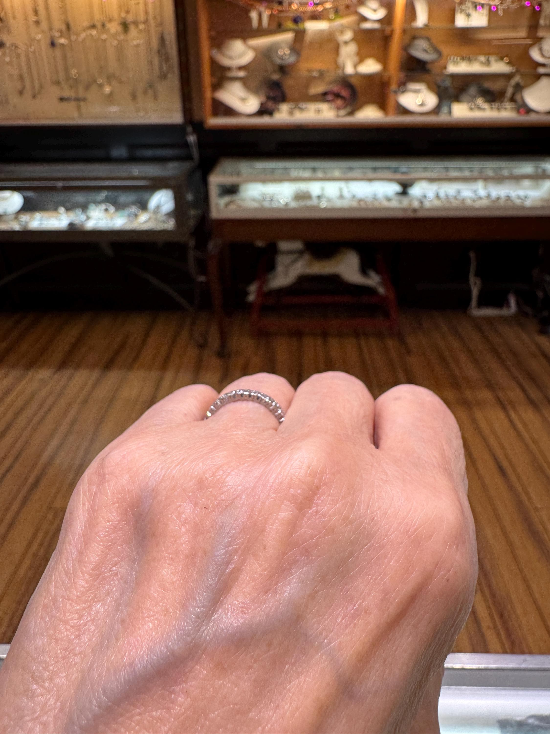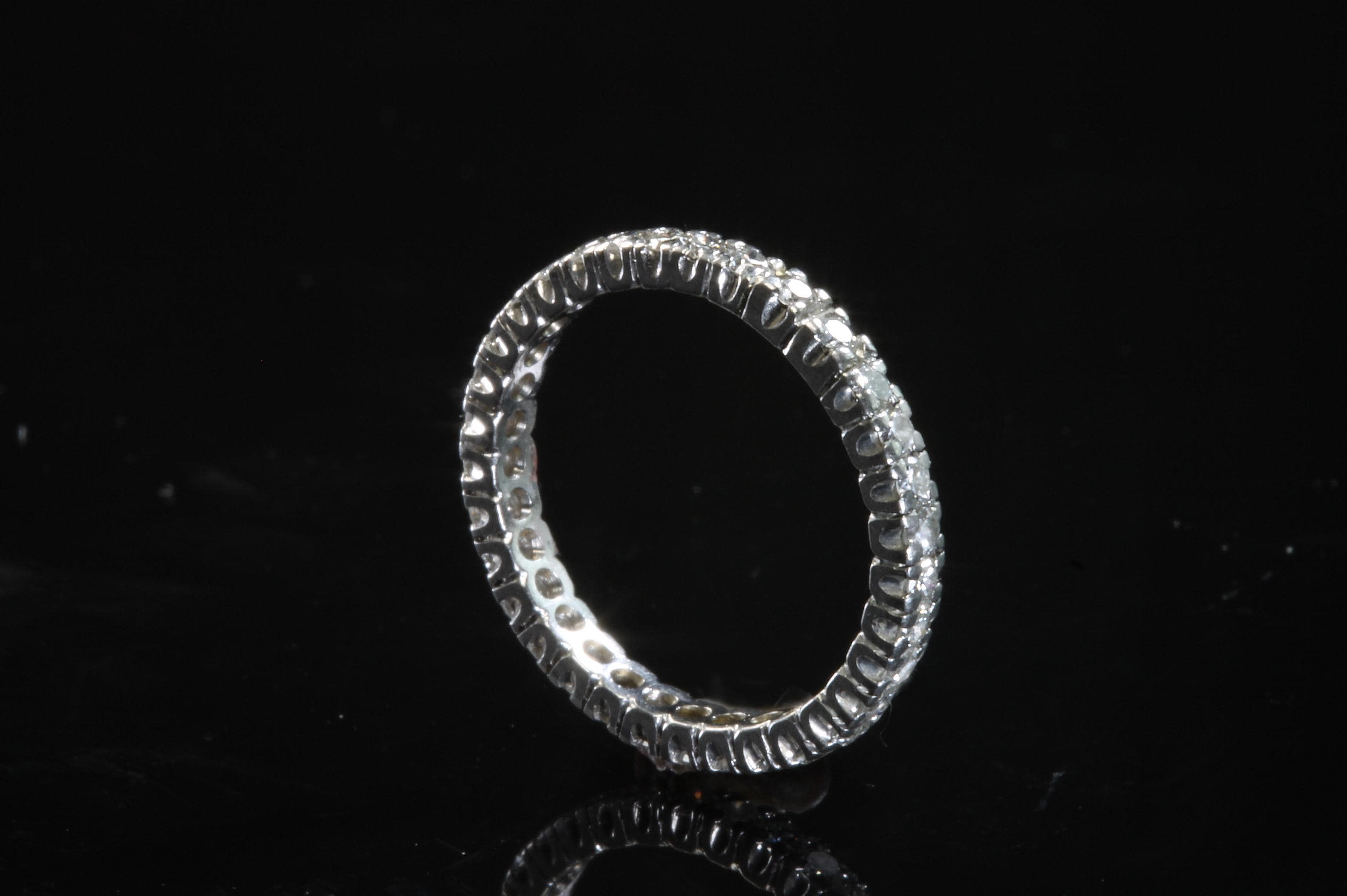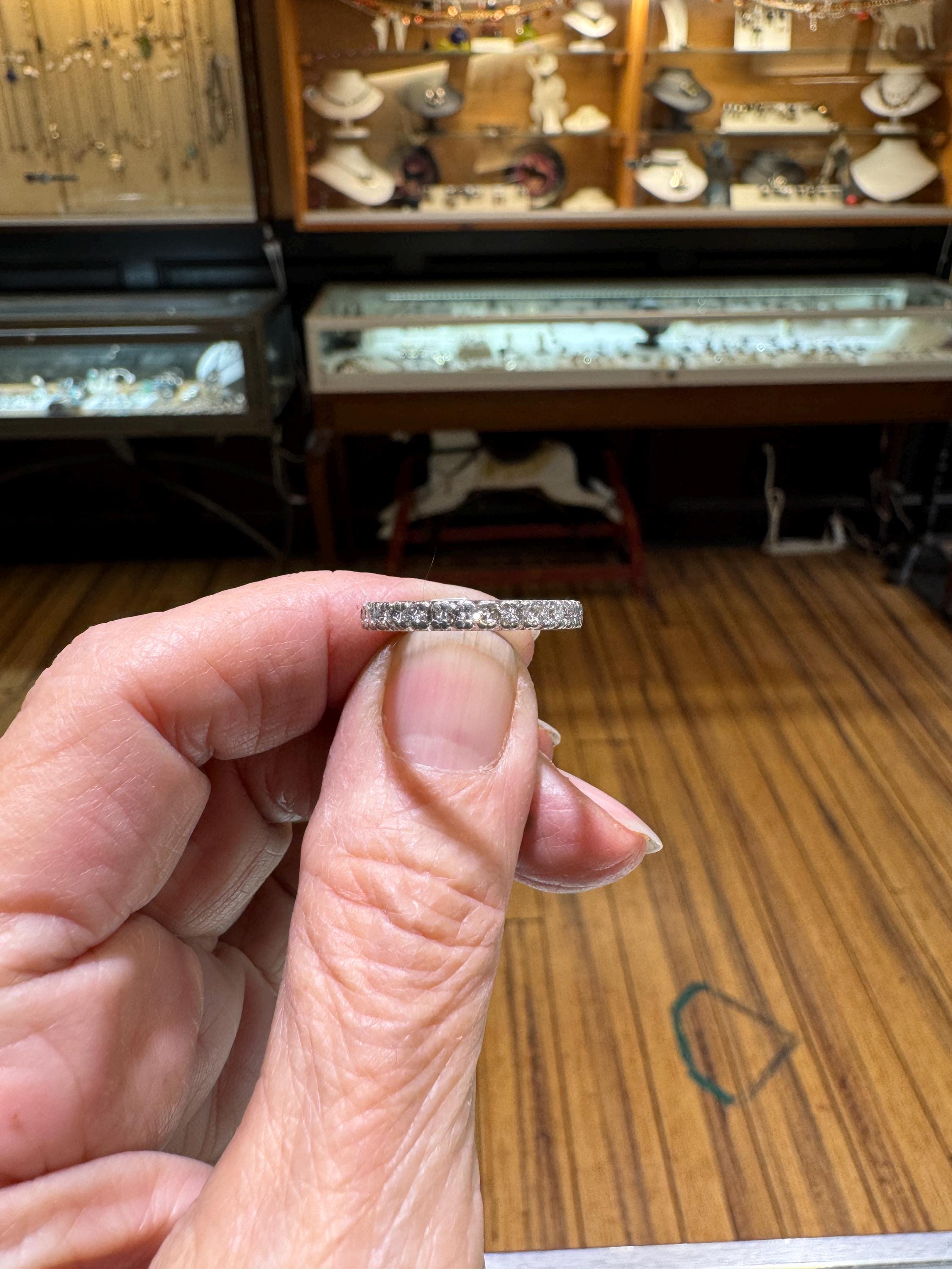 Sparkles upon sparkles only a diamond eternity band can give! This is a vintage and pre owned platinum diamond band with .50 ctw, sold as is in great ready to wear condition. Size 6.25 only. There are signs of gentle wear but being platinum there are many years left in this light bouncing beauty! No stones were removed to gauge weight.