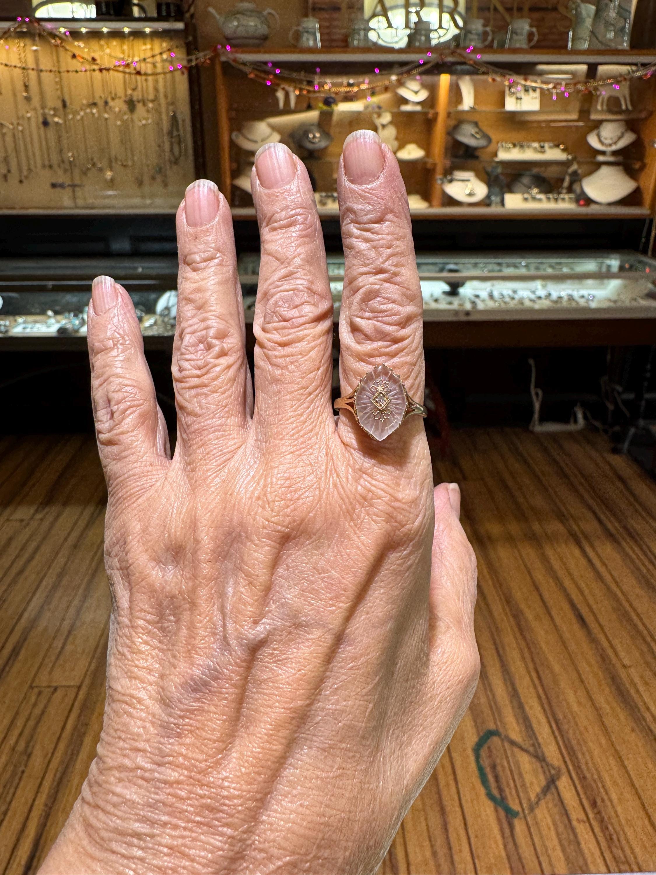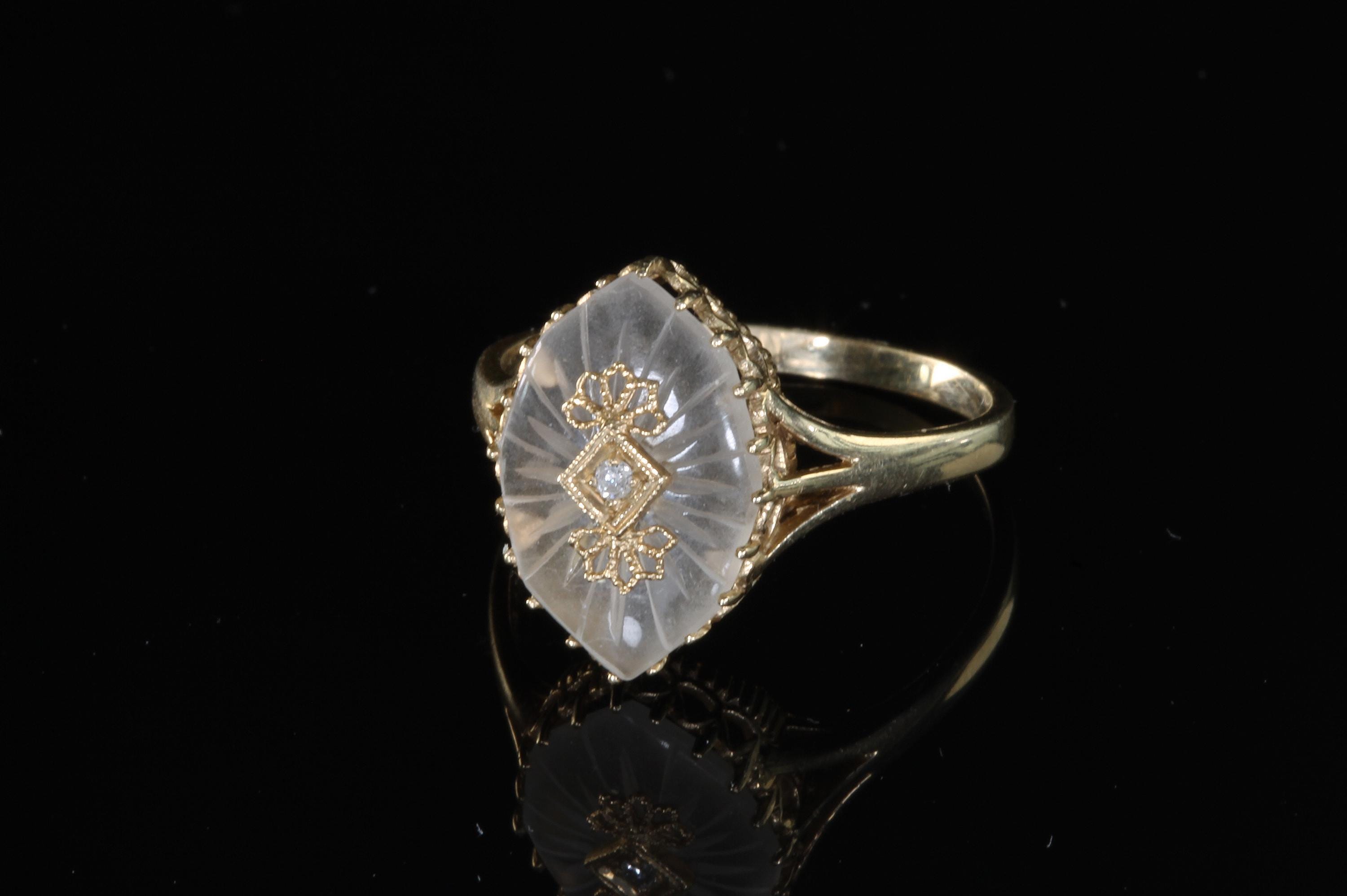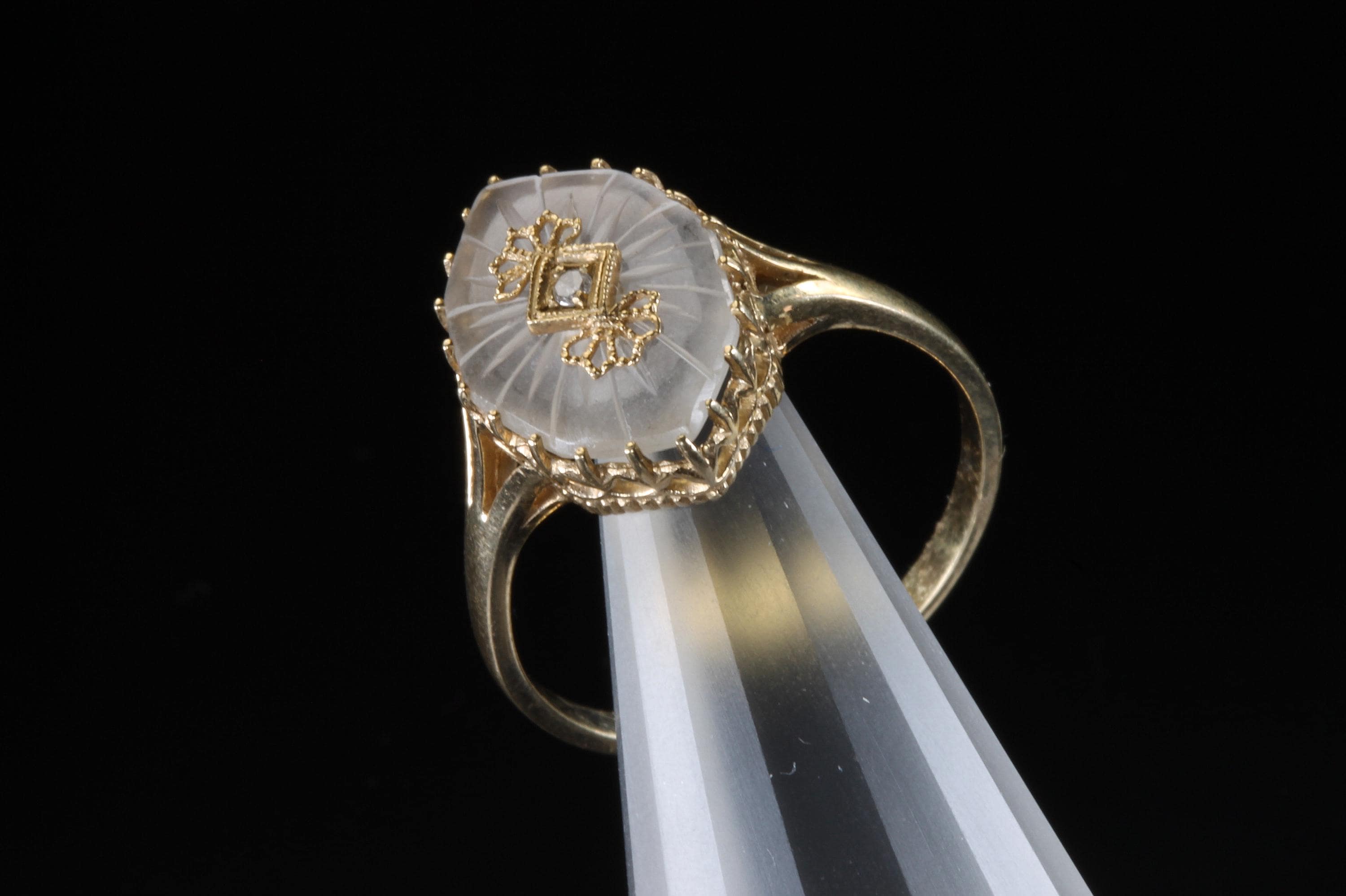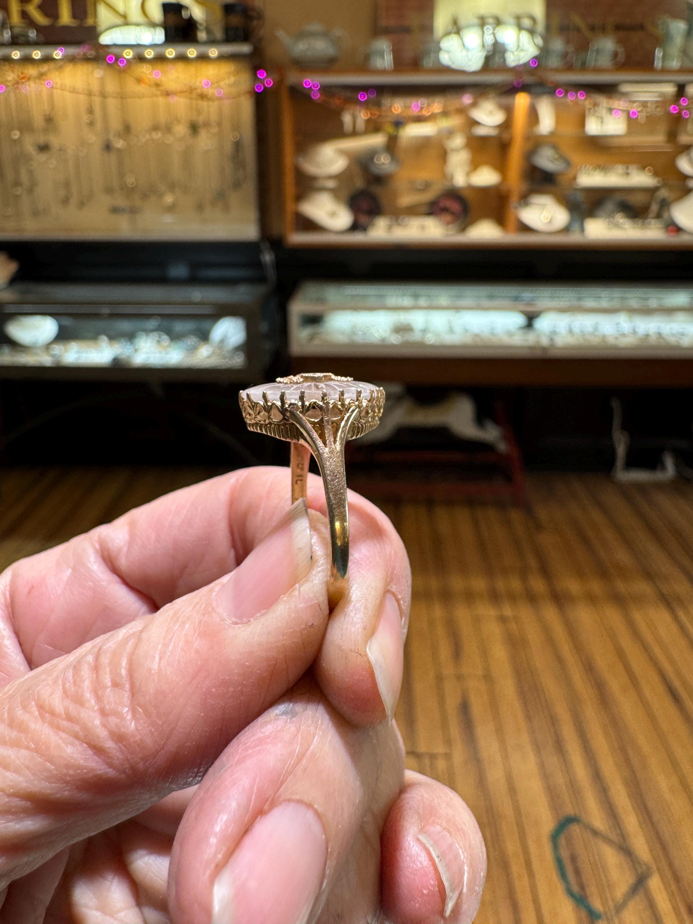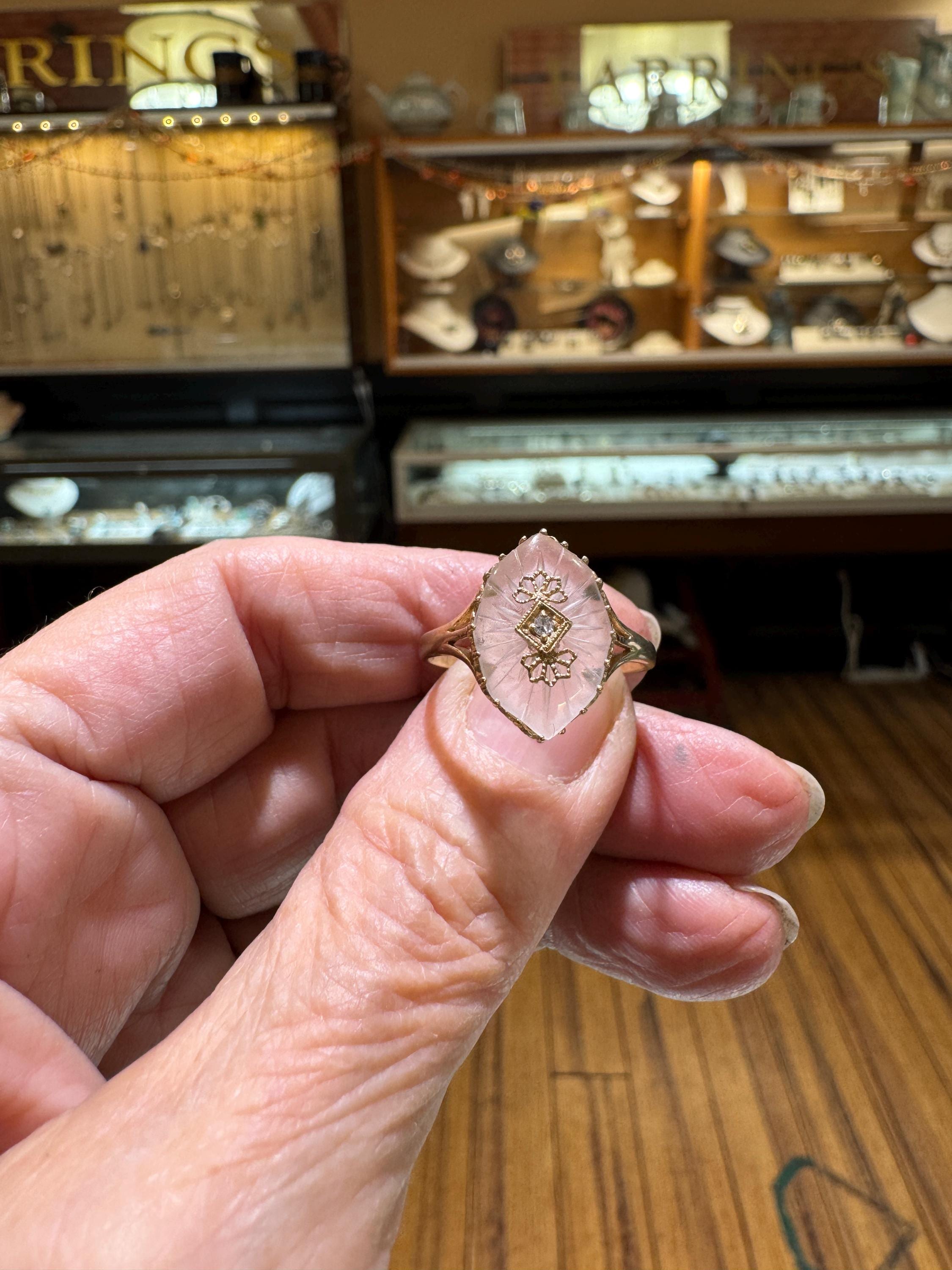 A lovely example of Art Deco style camphor glass jewelry. A 10K yellow gold ring featuring a starburst carved camphor glass stone which is set with a filigreed decorated 1.5mm diamond. A rather feminine look! This is a vintage and pre owned ring, sold as is in great ready to wear condition. Currently a size 9.5 we will size this ring up to a size 10.5 free of charge. If you need this ring to be larger than 10.5 please contact us before ordering.